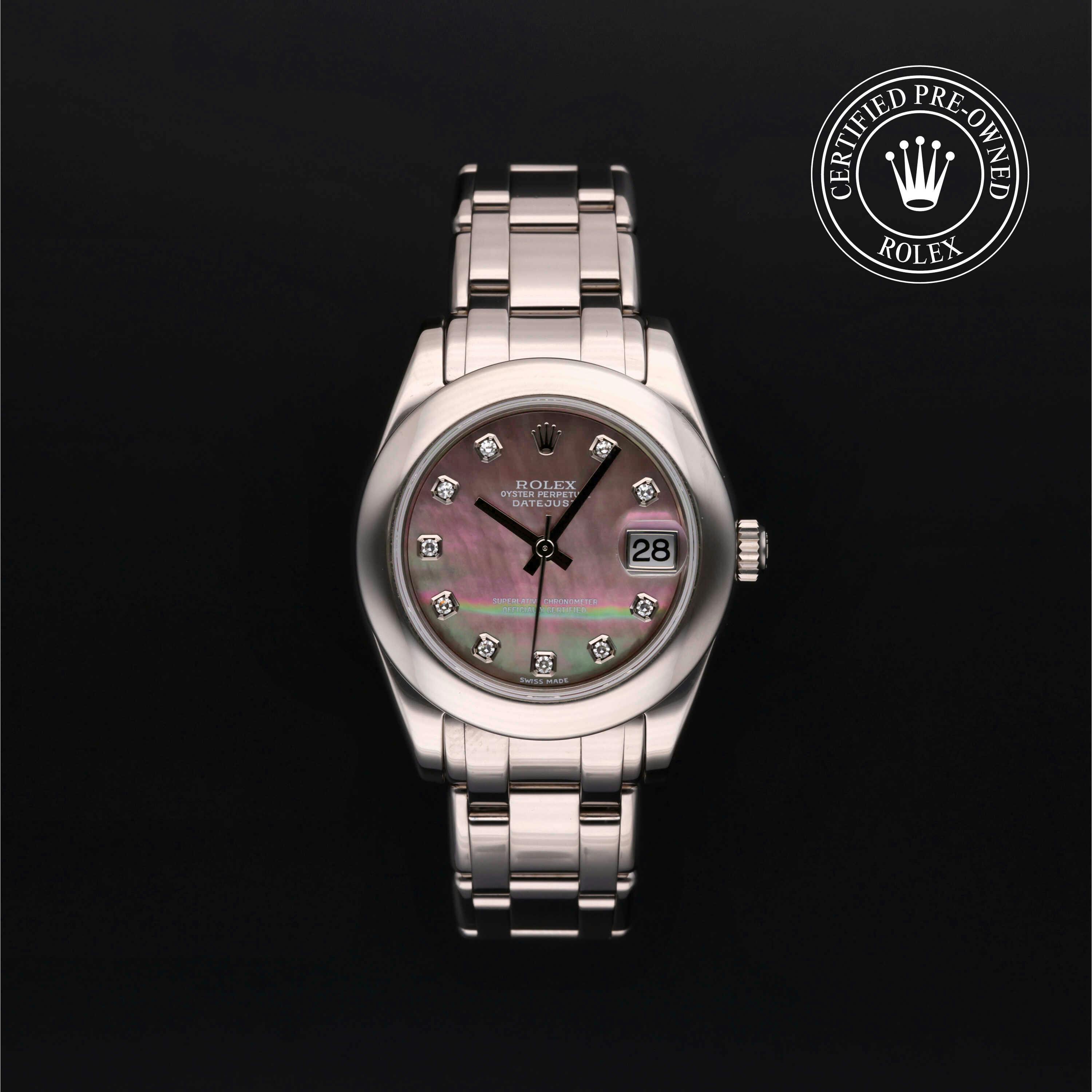 Rolex Certified Pre-Owned Datejust Pearlmaster (81209) self - winding automatic watch, features a 34mm 18k white gold case and domed bezel surrounding a black, mother of pearl diamond set dial on an 18k white gold pearlmaster bracelet. Functions include hours, minutes, seconds and date. This watch has received Rolex-authorized service and certification. It comes with the original papers, and includes a custom Rolex Certified Pre-Owned hang tag, travel pouch and RCPO international warranty card.