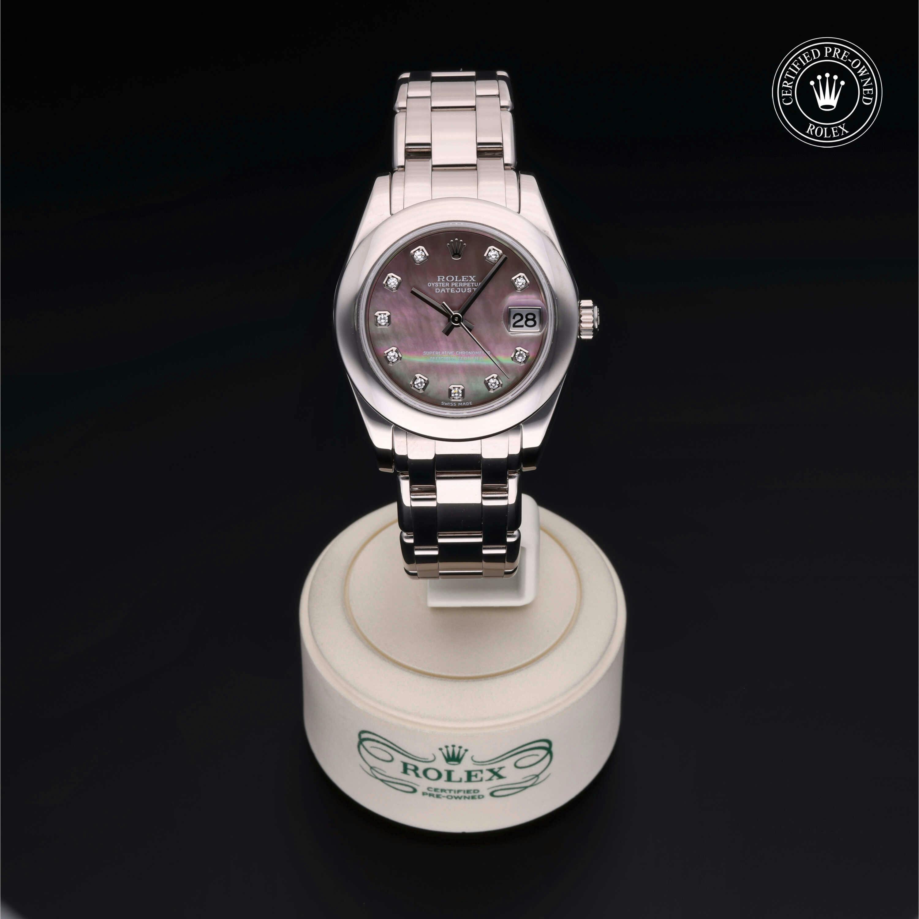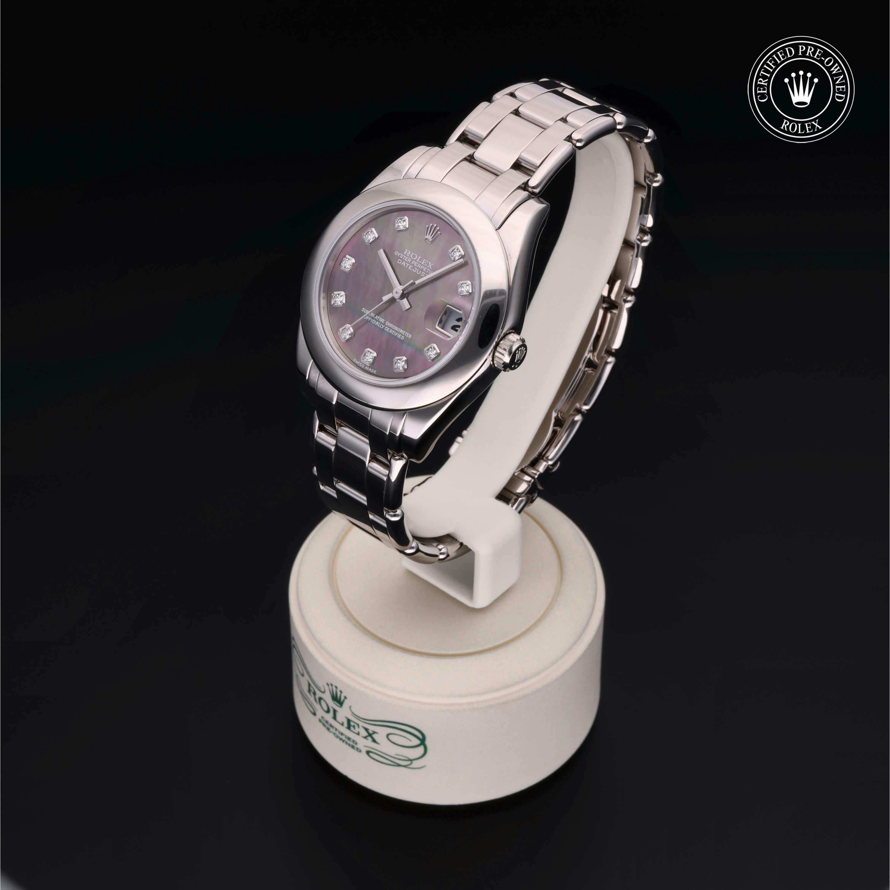 Rolex Certified Pre-Owned Datejust Pearlmaster (81209) self - winding automatic watch, features a 34mm 18k white gold case and domed bezel surrounding a black, mother of pearl diamond set dial on an 18k white gold pearlmaster bracelet. Functions include hours, minutes, seconds and date. This watch has received Rolex-authorized service and certification. It comes with the original papers, and includes a custom Rolex Certified Pre-Owned hang tag, travel pouch and RCPO international warranty card.