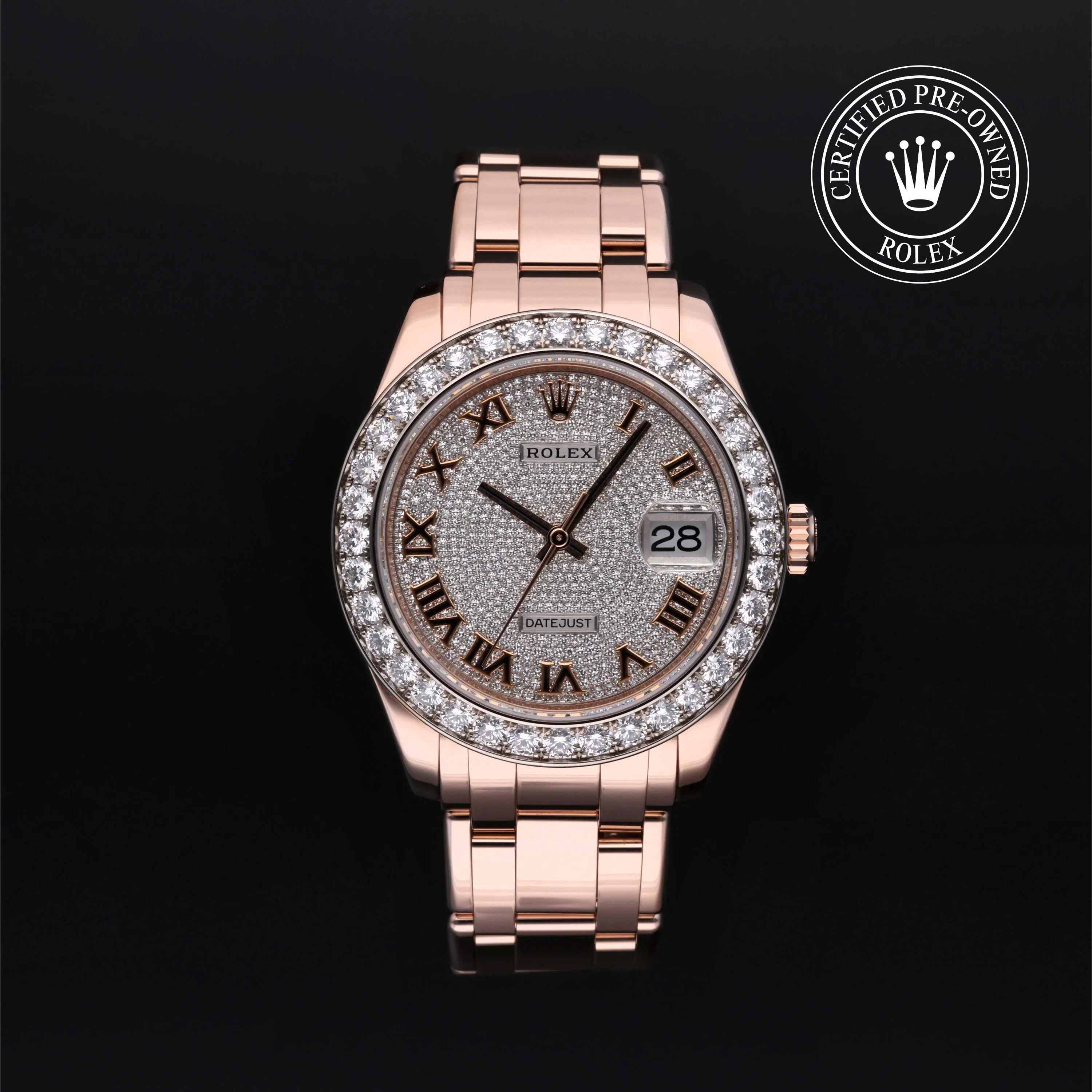 Rolex Certified Pre-Owned Datejust Pearlmaster (86285) self - winding automatic watch, features a 39mm 18k rose gold case and diamond set bezel surrounding a full pave-set diamond dial with rose gold roman hour markers. The watch is secured on an 18k rose gold Pearlmaster bracelet complete with a folding buckle. Functions include hours, minutes, seconds and date. This watch has been serviced by an authorized service center and certified by Rolex. It does not come with the original box or papers, but includes a custom Rolex Certified Pre-Owned hang tag, travel pouch and international warranty card.