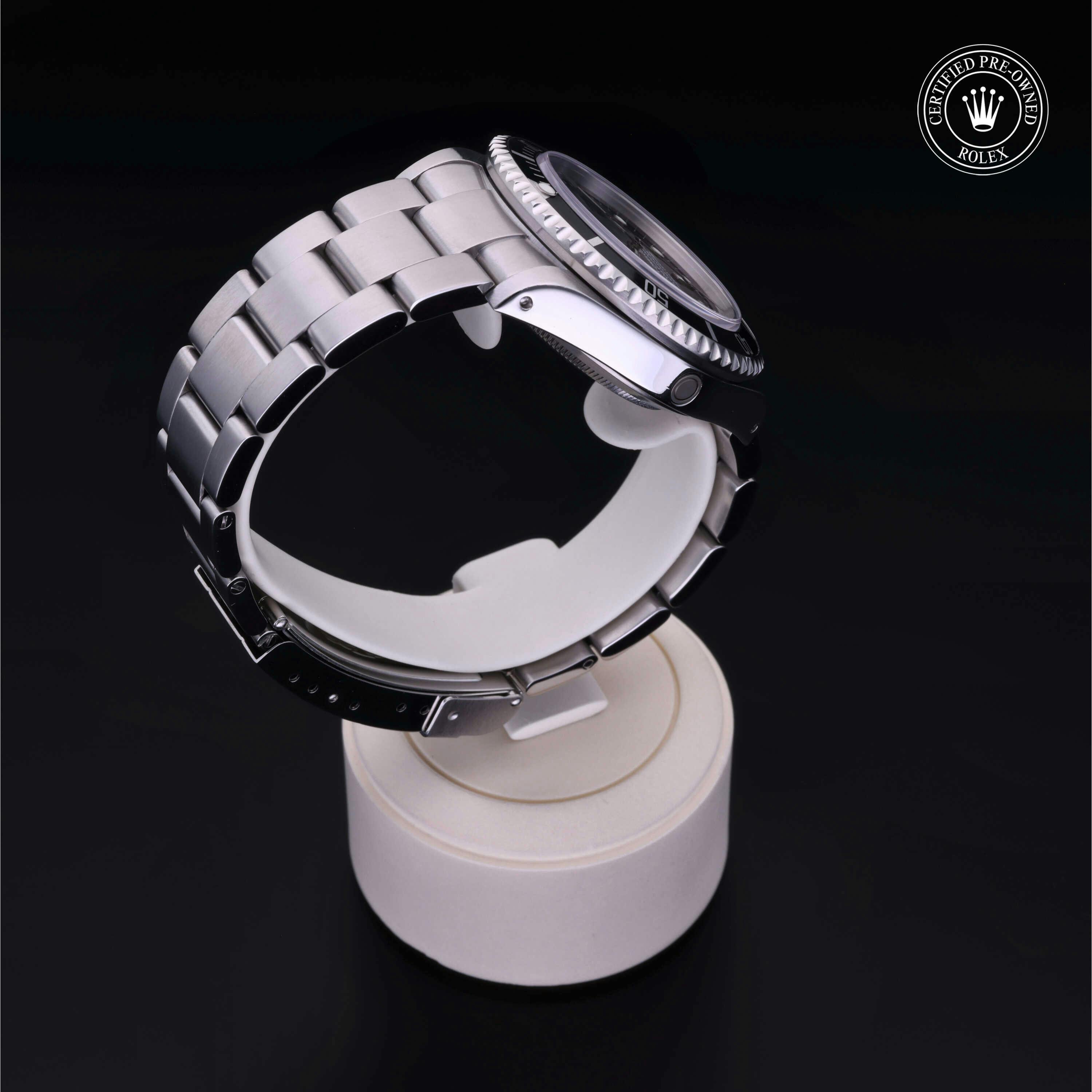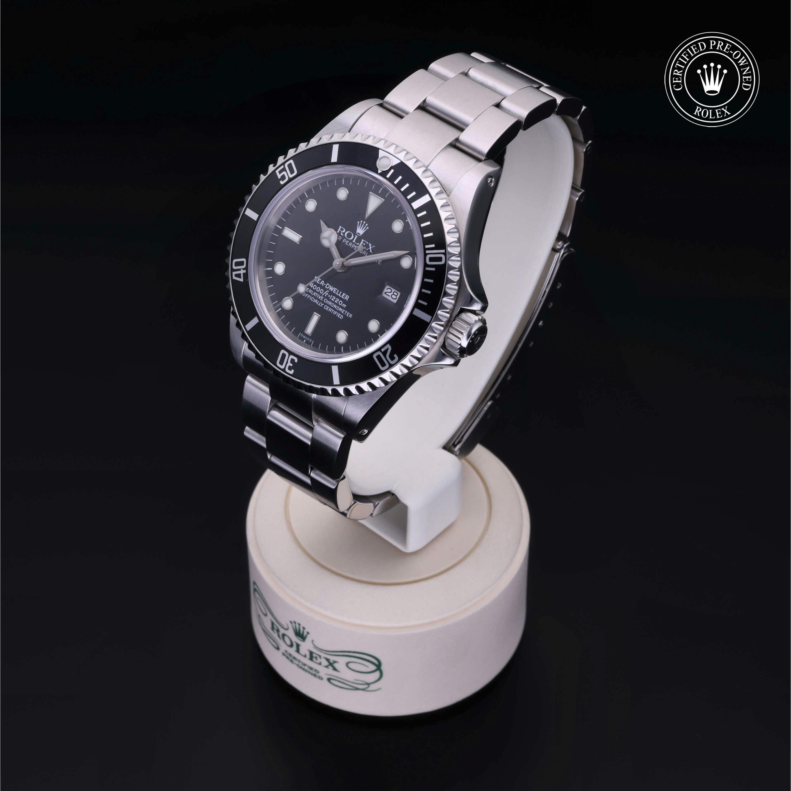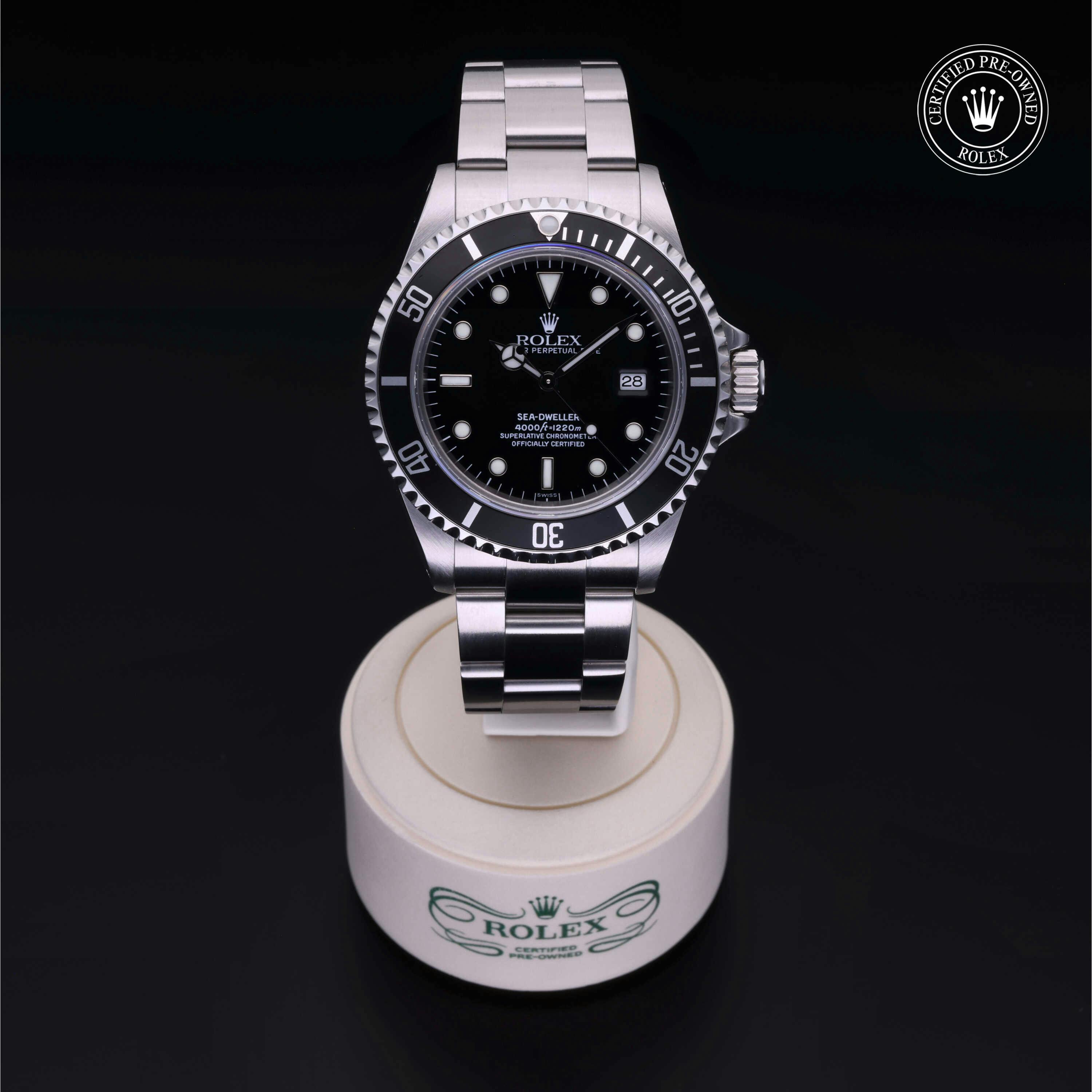 Rolex Certified Pre-Owned Sea-Dweller 4000 (16600) self - winding automatic watch, features a 40mm stainless steel case with a black aluminum bezel surrounding a black dial on a stainless steel oyster bracelet. Functions include hours, minutes, seconds and date. This watch has received Rolex-authorized service and certification. It does not come with the original box or papers, but includes a custom Rolex Certified Pre-Owned hang tag, travel pouch and RCPO international warranty card.