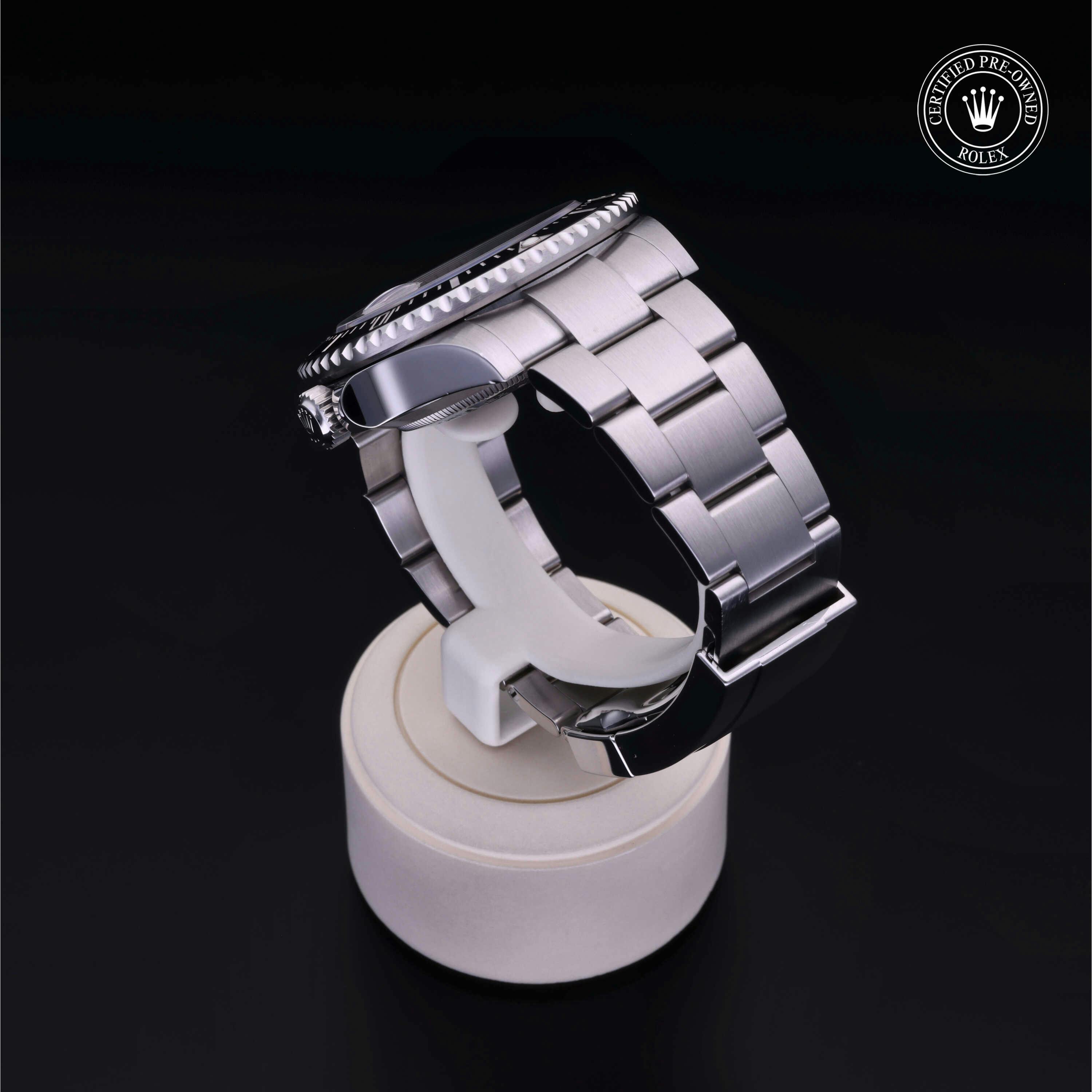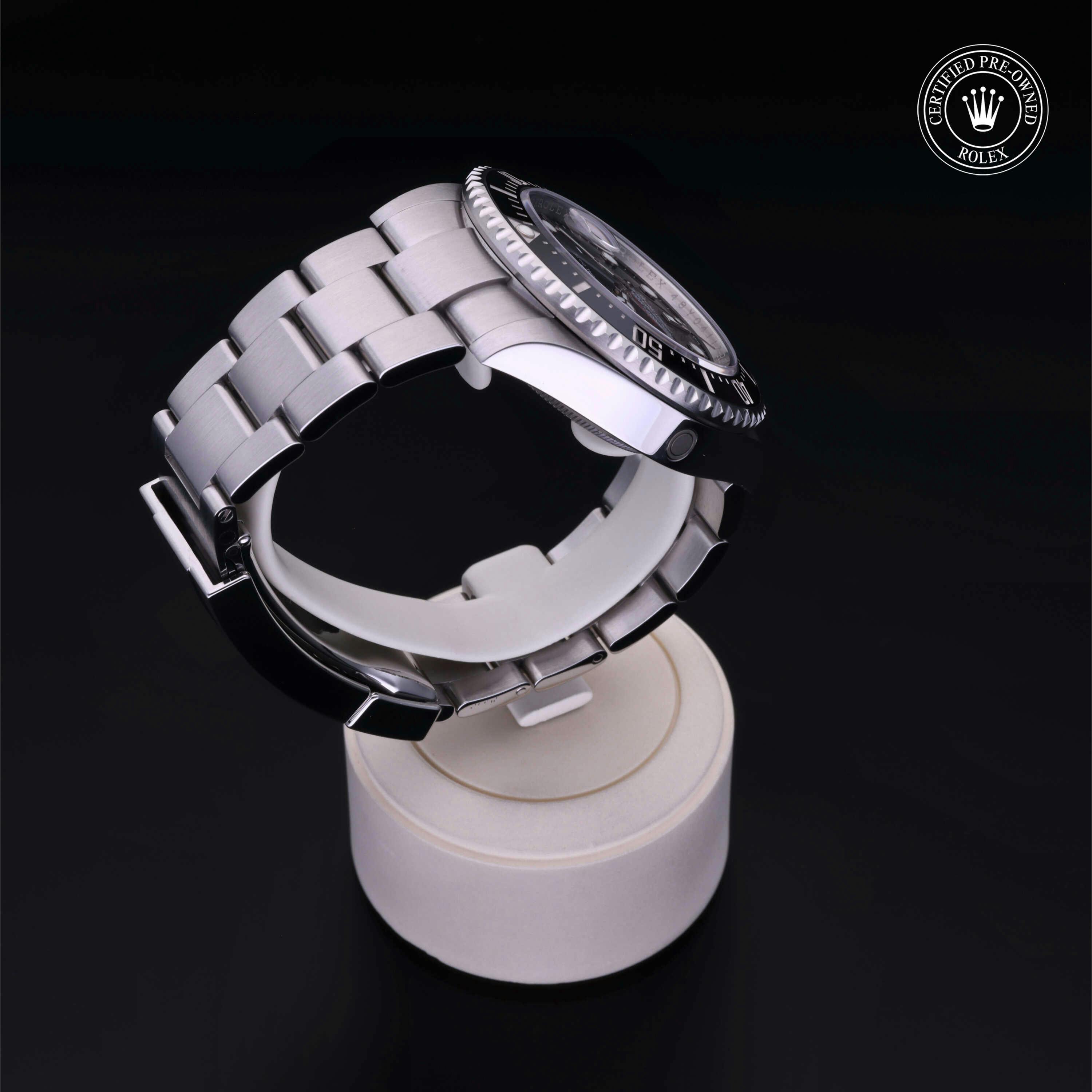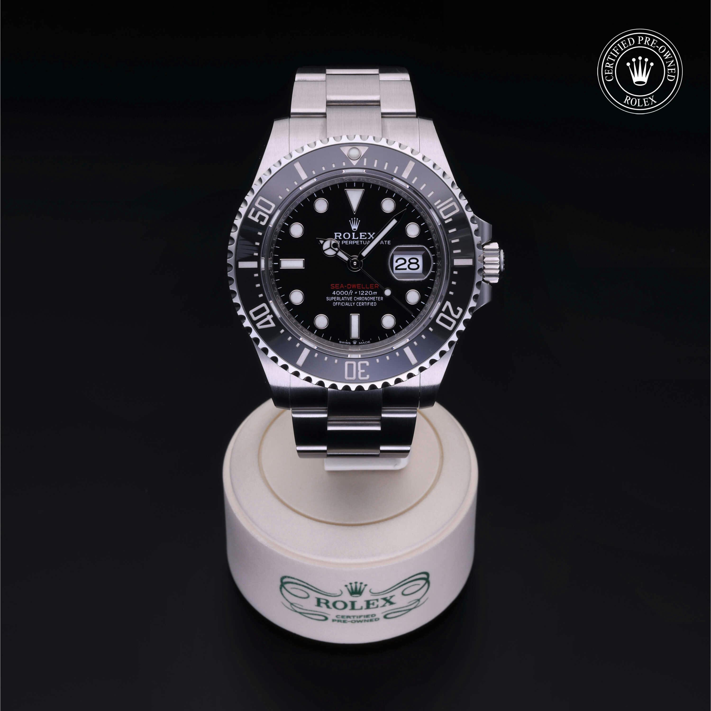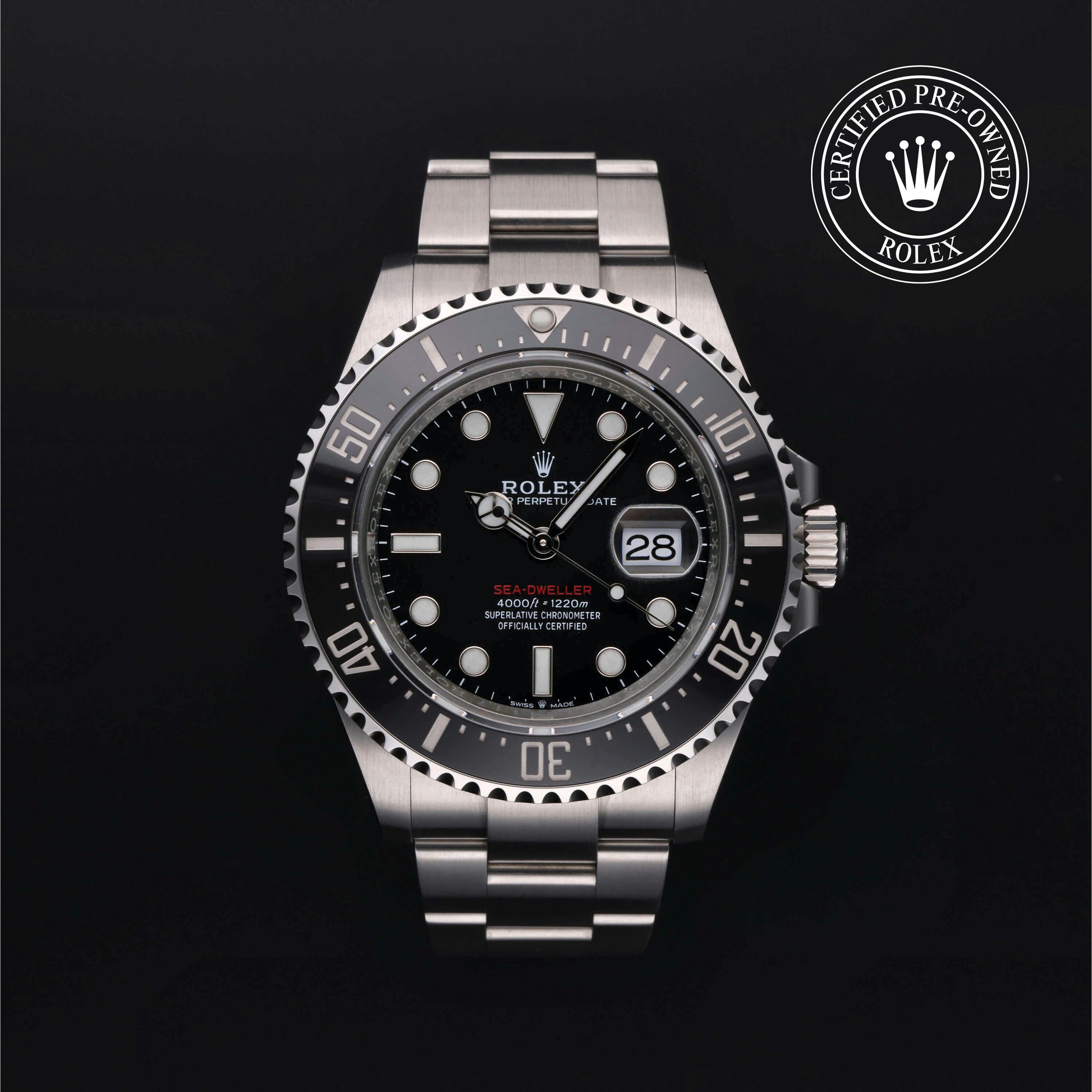 Rolex Certified Pre-Owned Sea-Dweller 4000 (126600) self - winding automatic watch, features a 43mm stainless steel case with a stainless steel and black cerachrom bezel surrounding a black dial. Watch is secured on a stainless steel oyster bracelet complete with a folding clasp. Functions include hours, minutes, seconds, date and helium release valve. This watch has been serviced by an authorized Rolex service center and certified by Rolex. It does not come with the original box or papers, but includes a custom Rolex Certified Pre-Owned hang tag, travel pouch and international warranty card.