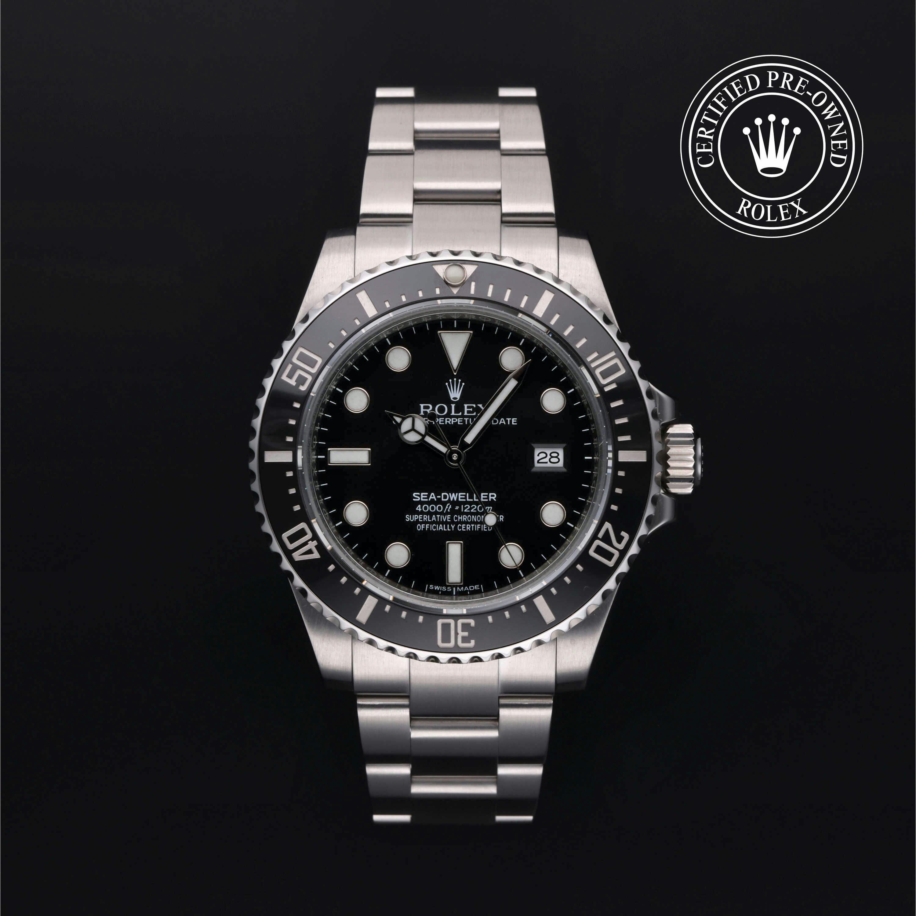 Rolex Certified Pre-Owned Sea-Dweller 4000 (116600) self - winding automatic watch, features a 40mm stainless steel case with a black cerachrom bezel surrounding a black dial on a stainless steel Oyster bracelet. Functions include hours, minutes, seconds and date. This watch has received Rolex-authorized service and certification. It does not come with the original box or papers, but includes a custom Rolex Certified Pre-Owned hang tag, travel pouch and RCPO international warranty card.