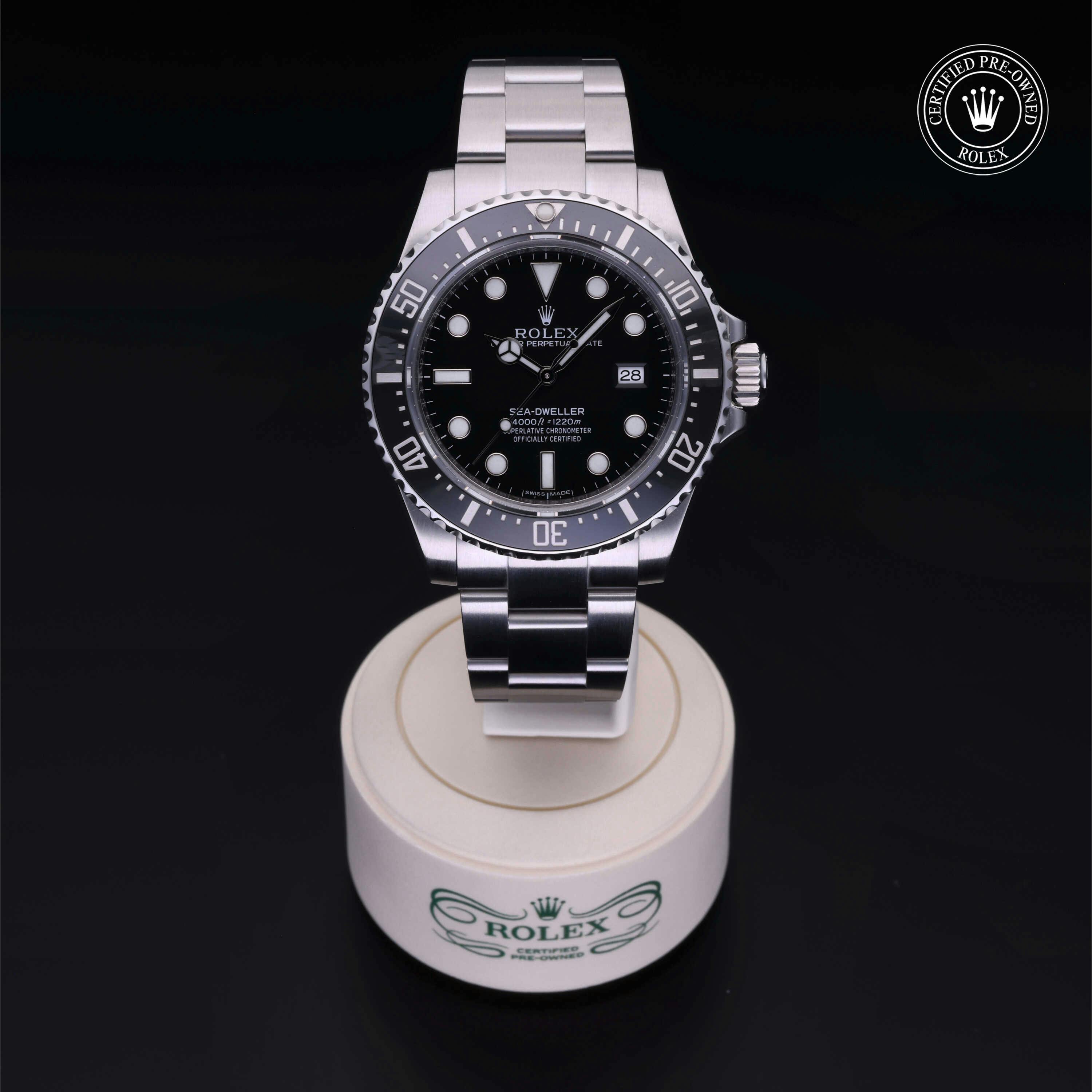 Rolex Certified Pre-Owned Sea-Dweller 4000 (116600) self - winding automatic watch, features a 40mm stainless steel case with a black cerachrom bezel surrounding a black dial on a stainless steel Oyster bracelet. Functions include hours, minutes, seconds and date. This watch has received Rolex-authorized service and certification. It does not come with the original box or papers, but includes a custom Rolex Certified Pre-Owned hang tag, travel pouch and RCPO international warranty card.