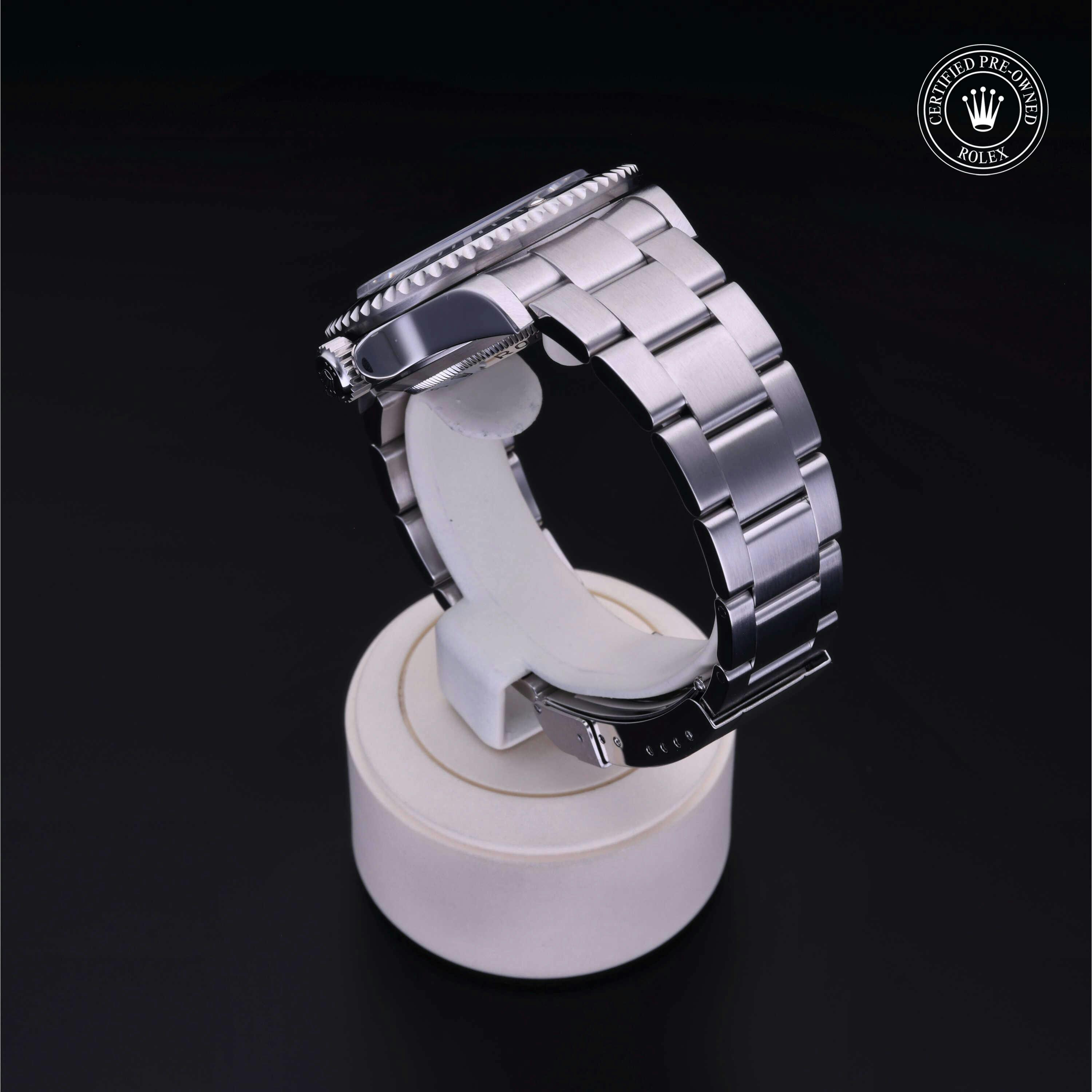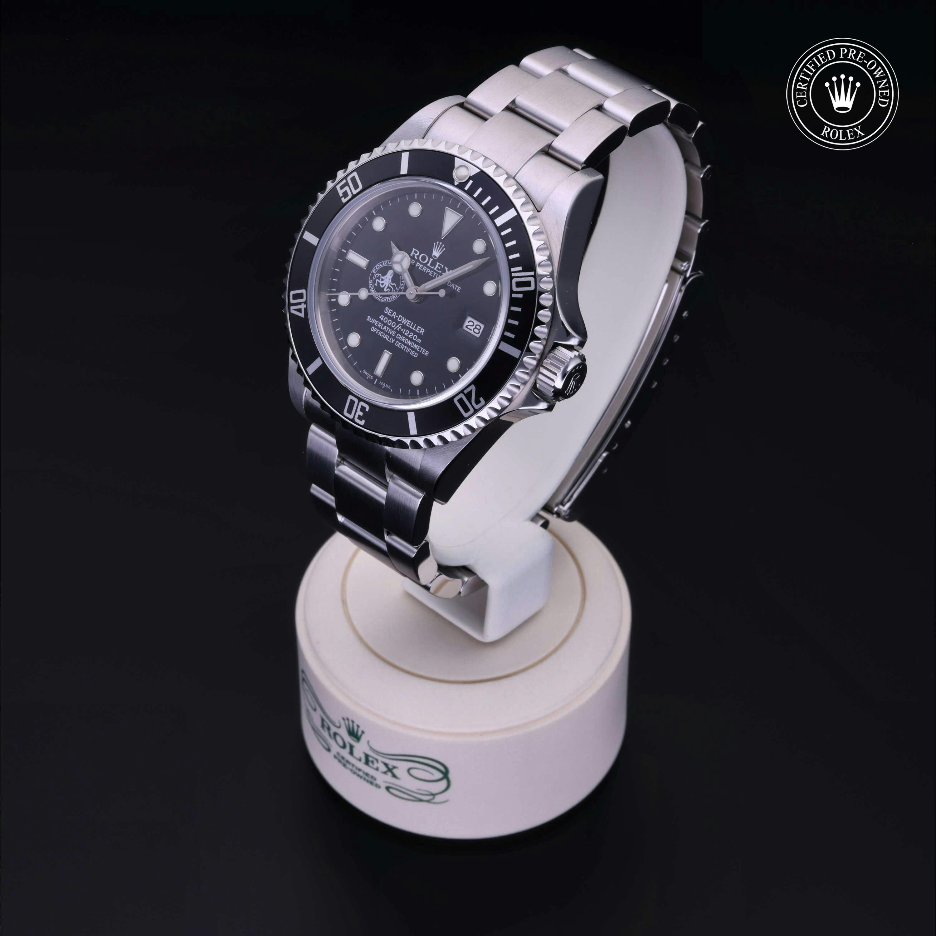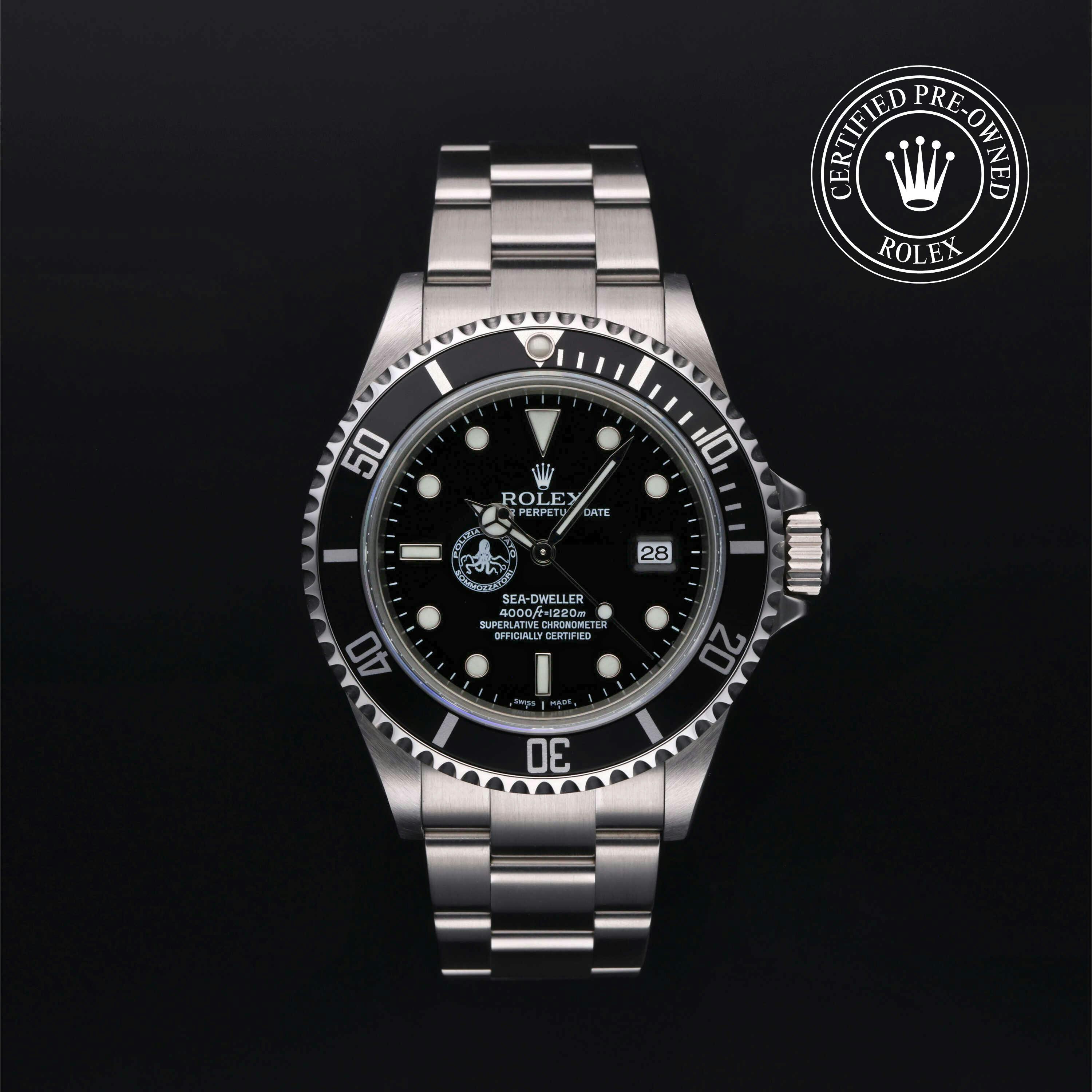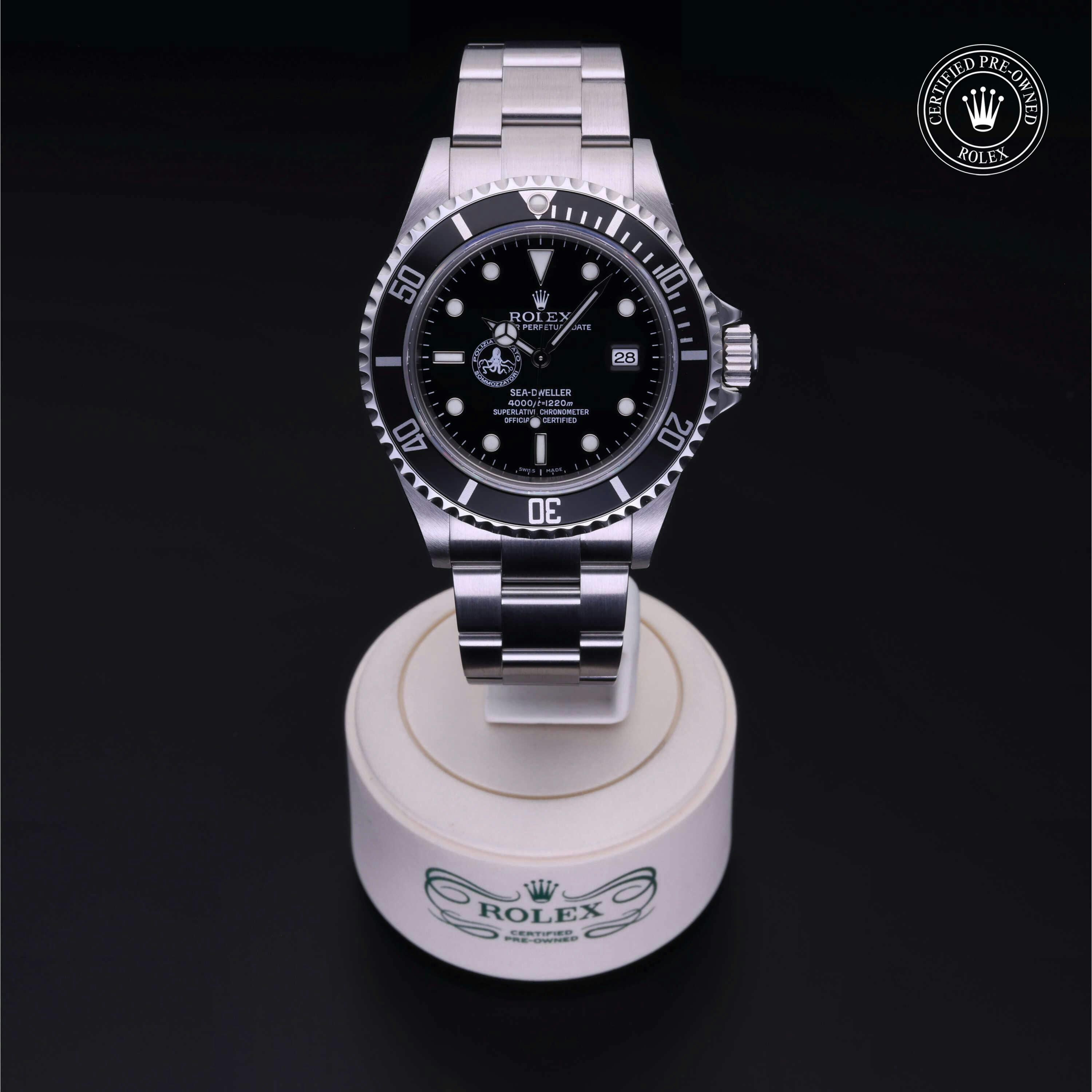 Rolex Certified Pre-Owned Sea-Dweller 4000 (16600) self - winding automatic watch, features a 40mm stainless steel case and rotating bezel with a black aluminum insert surrounding a black dial on a stainless steel oyster bracelet. Functions include hours, minutes, seconds and date. This watch has received Rolex-authorized service and certification. It comes with the original box and papers, and includes a custom Rolex Certified Pre-Owned hang tag, travel pouch and RCPO international warranty card.
