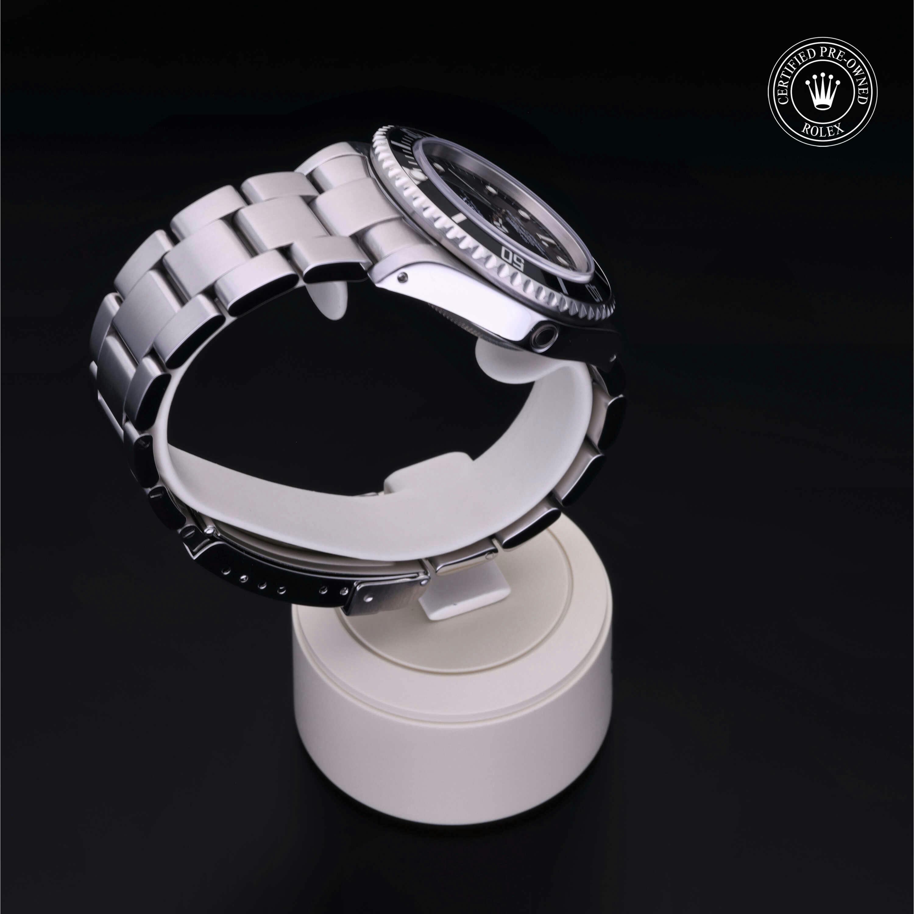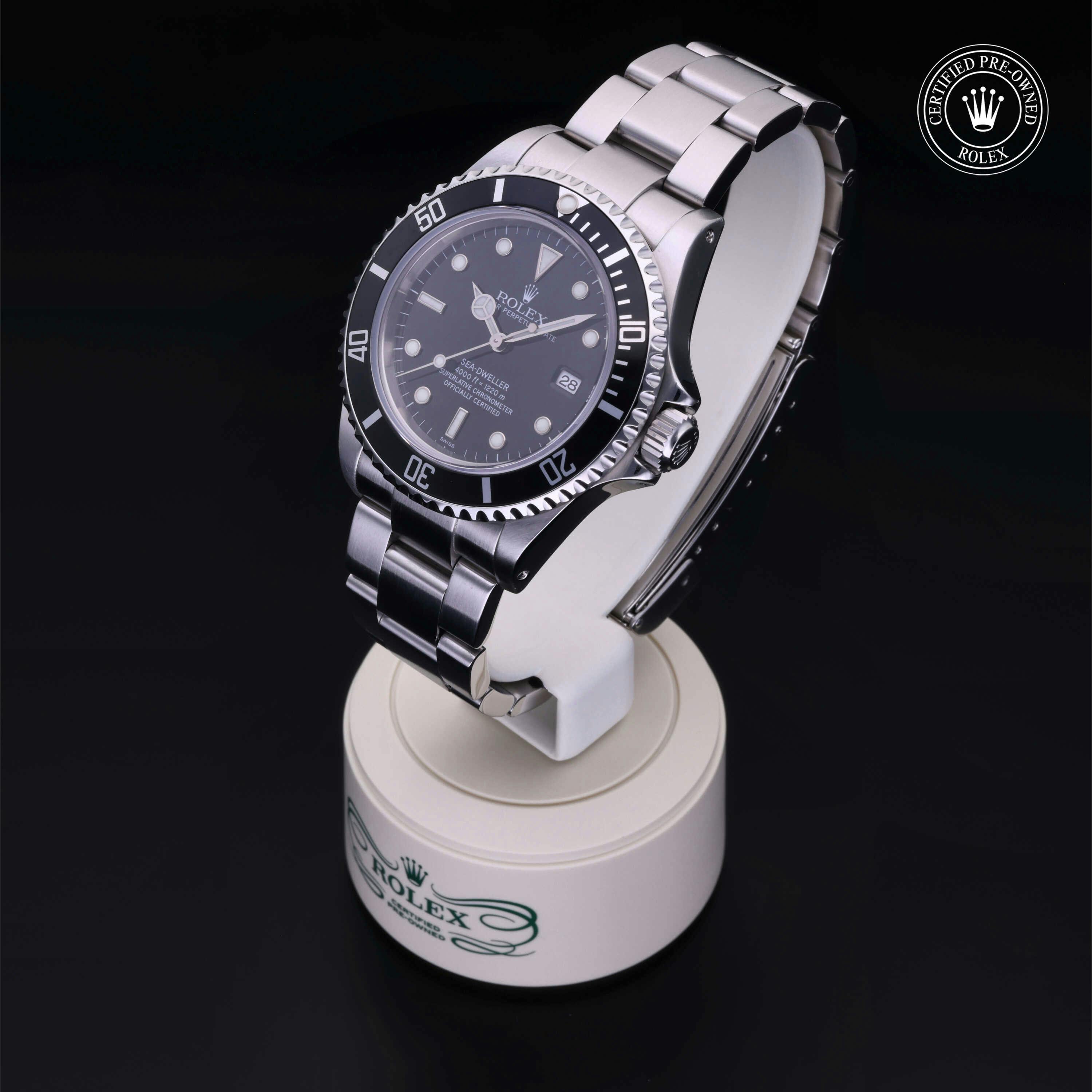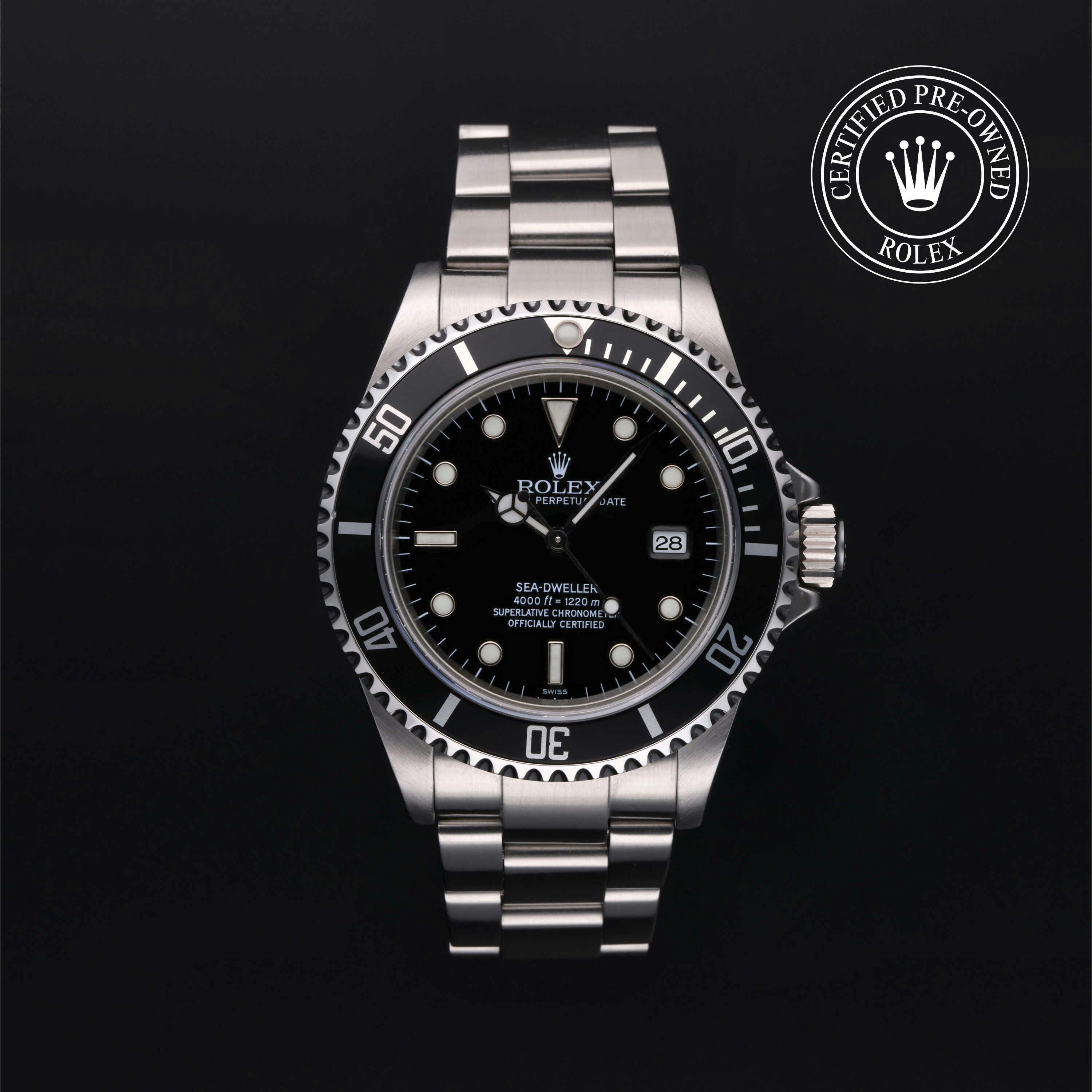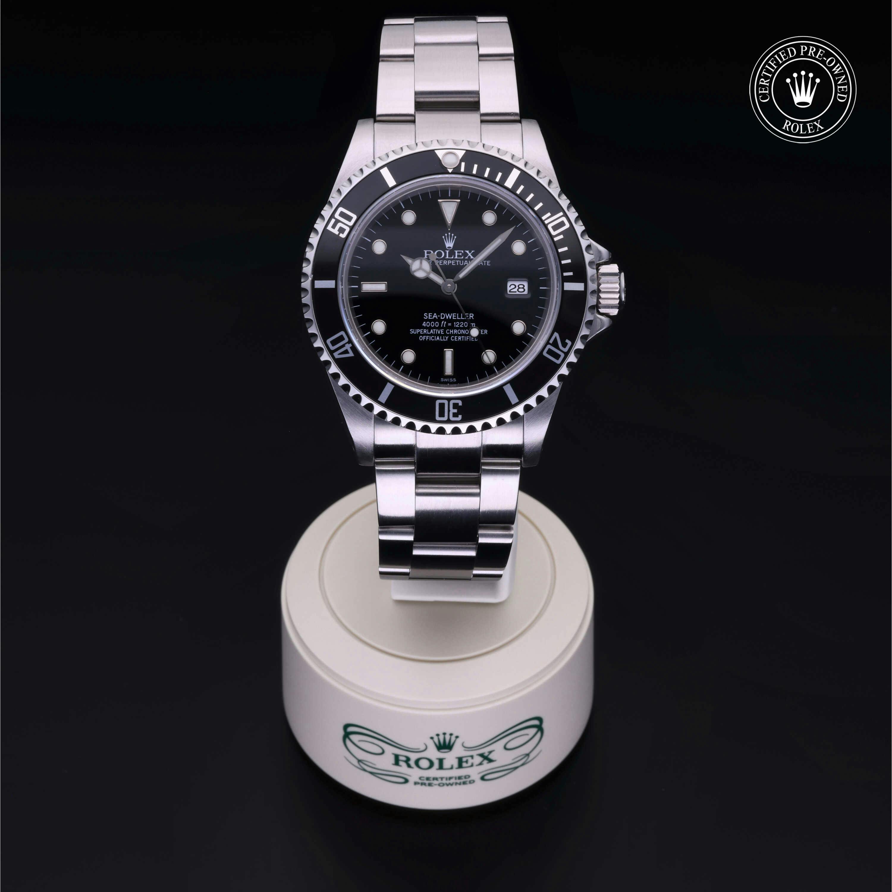 Rolex Certified Pre-Owned Sea-Dweller 4000 (16600) self - winding automatic watch, features a 40mm stainless steel case with a stainless steel and black aluminium bezel surrounding a black dial. Watch is secured on a stainless steel Oyster bracelet complete with a folding clasp. Functions include hours, minutes, seconds and date. This watch has been serviced by an authorized Rolex service center and certified by Rolex. It does not come with the original box or papers, but includes a custom Rolex Certified Pre-Owned hang tag, travel pouch and international warranty card.