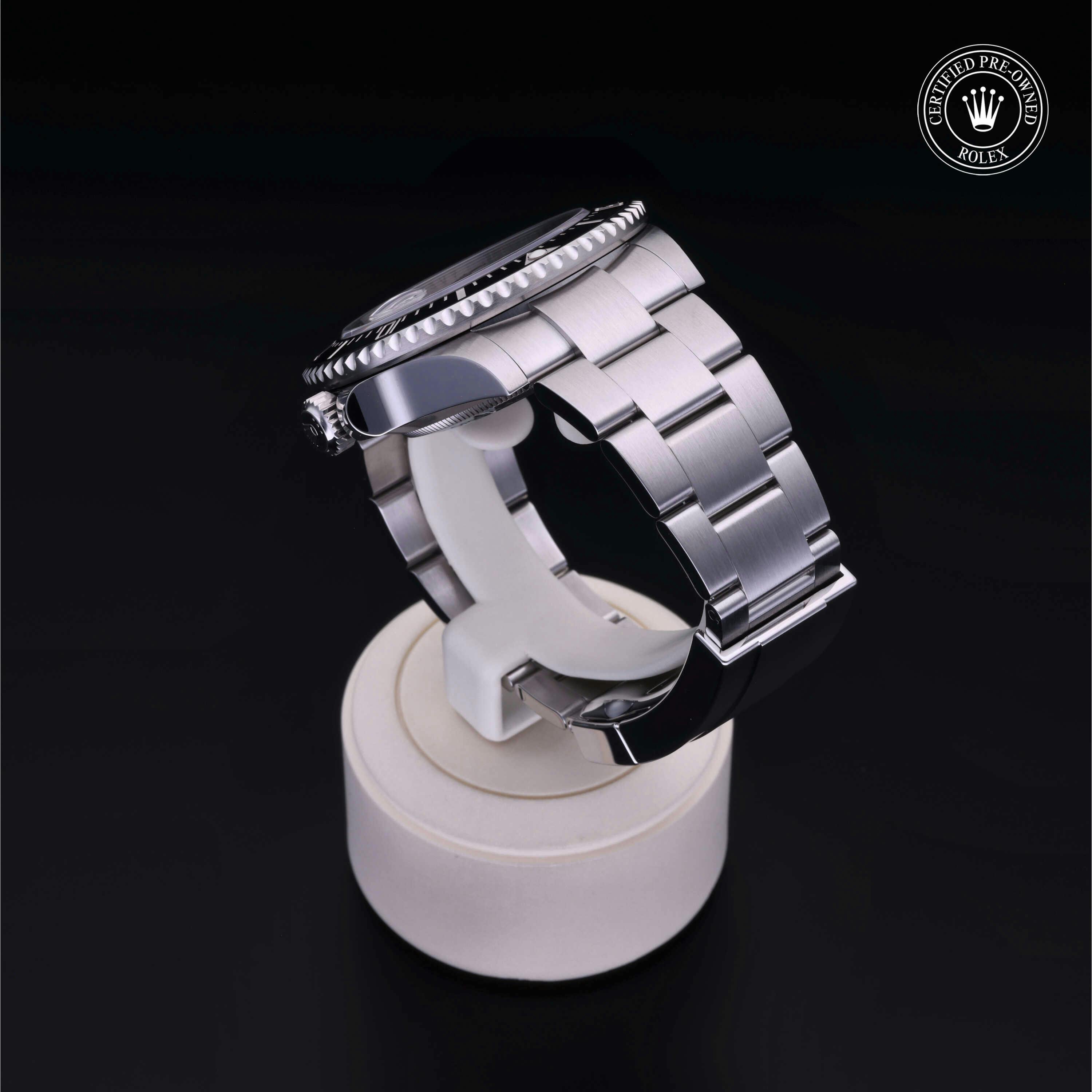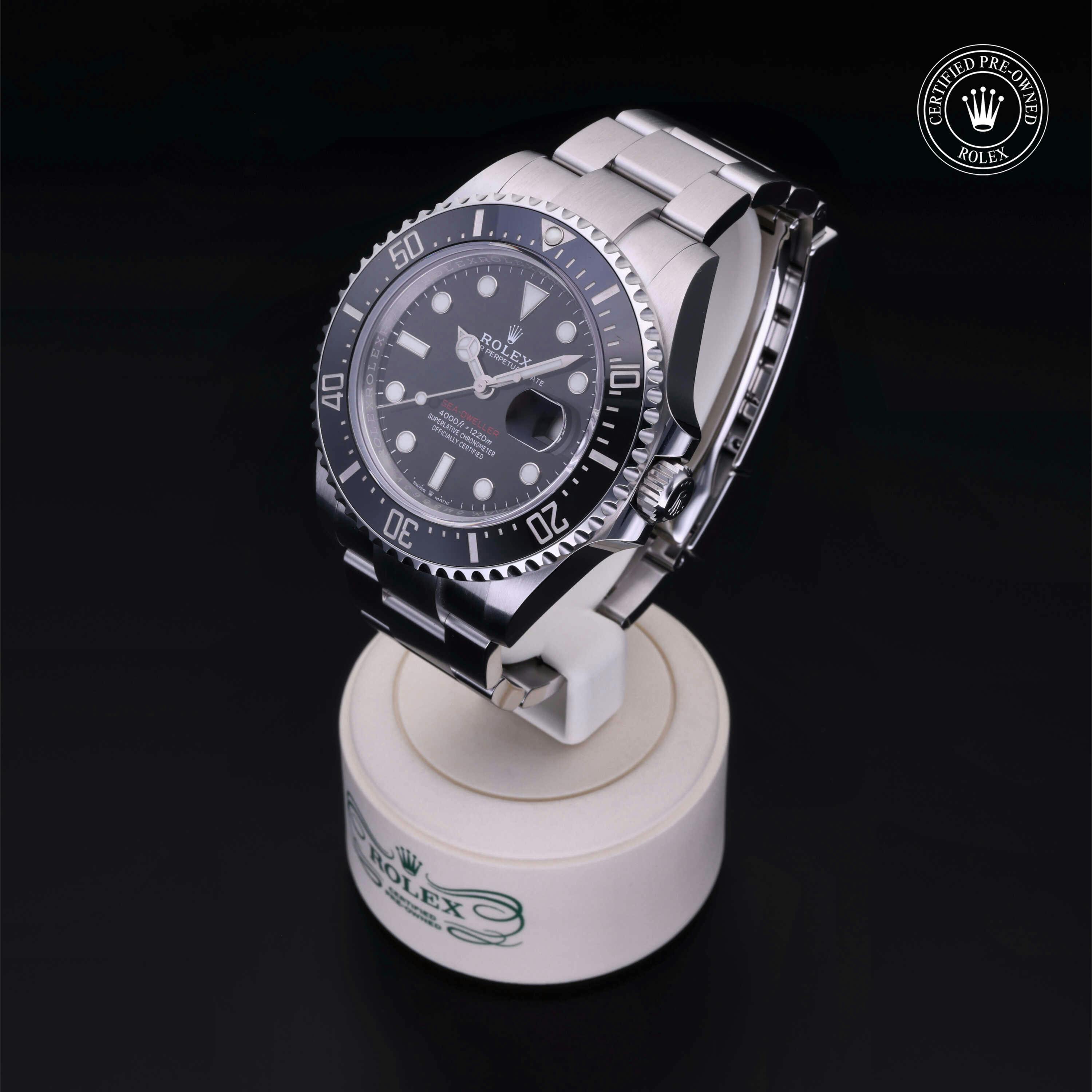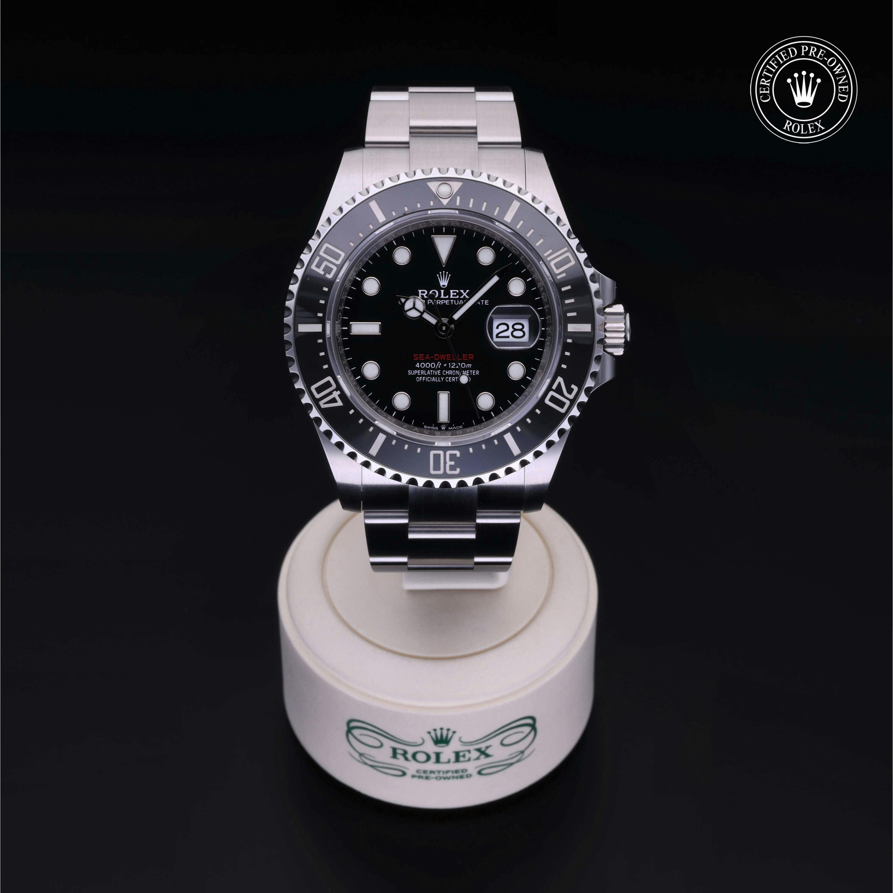 Rolex Certified Pre-Owned Sea-Dweller 4000 (126600) self - winding automatic watch, features a 43mm stainless steel case with a black cerachrom bezel surrounding a black dial on a stainless steel oyster bracelet. Functions include hours, minutes, seconds, date and helium release valve. This watch has has received Rolex-authorized service and certification. It comes with the original box and papers, and includes a custom Rolex Certified Pre-Owned hang tag, travel pouch and RCPO international warranty card.