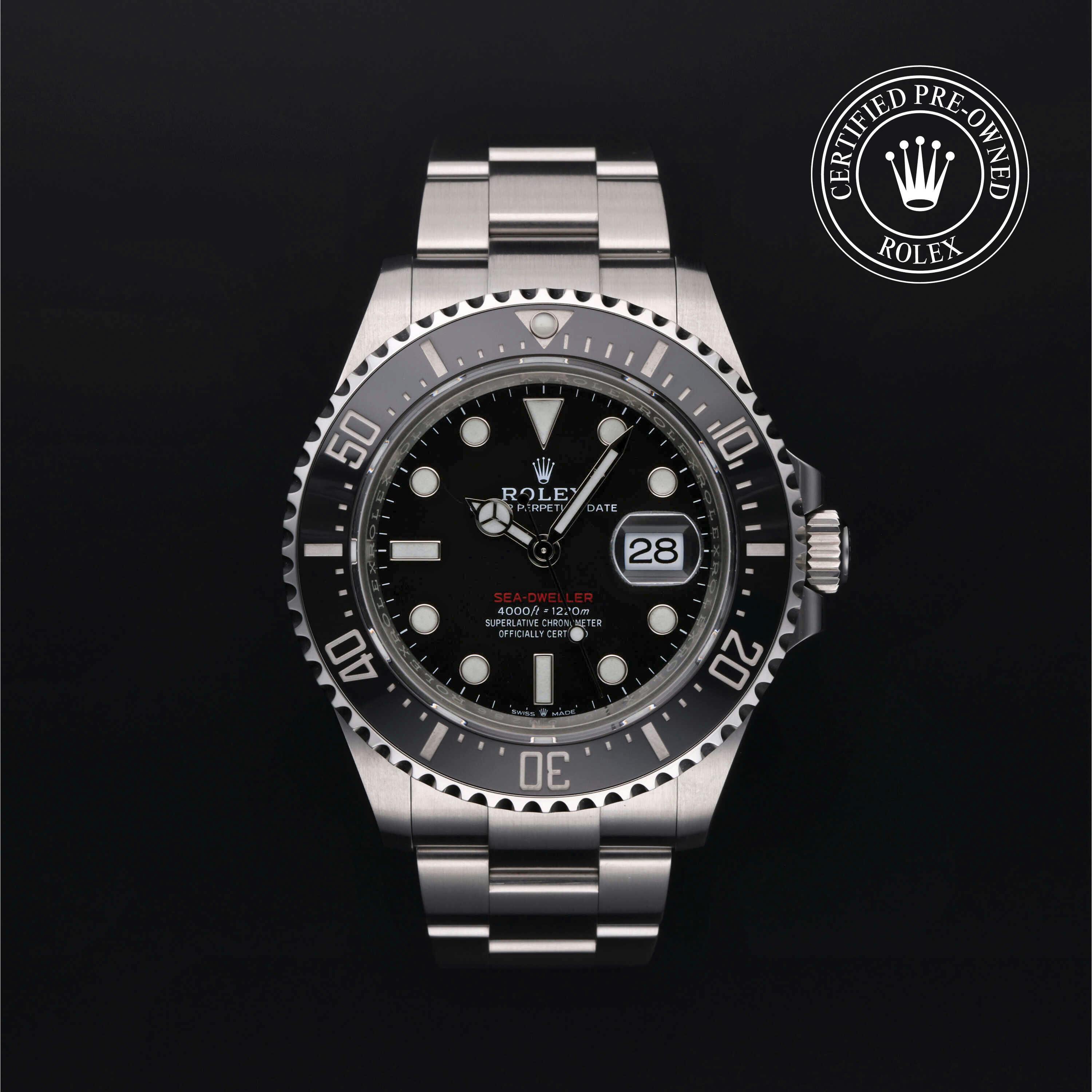 Rolex Certified Pre-Owned Sea-Dweller 4000 (126600) self - winding automatic watch, features a 43mm stainless steel case with a black cerachrom bezel surrounding a black dial on a stainless steel Oyster bracelet. Functions include hours, minutes, seconds, date and helium release valve. This watch has received Rolex-authorized service and certification. It comes with the original box and papers, and includes a custom Rolex Certified Pre-Owned hang tag, travel pouch and RCPO international warranty card.