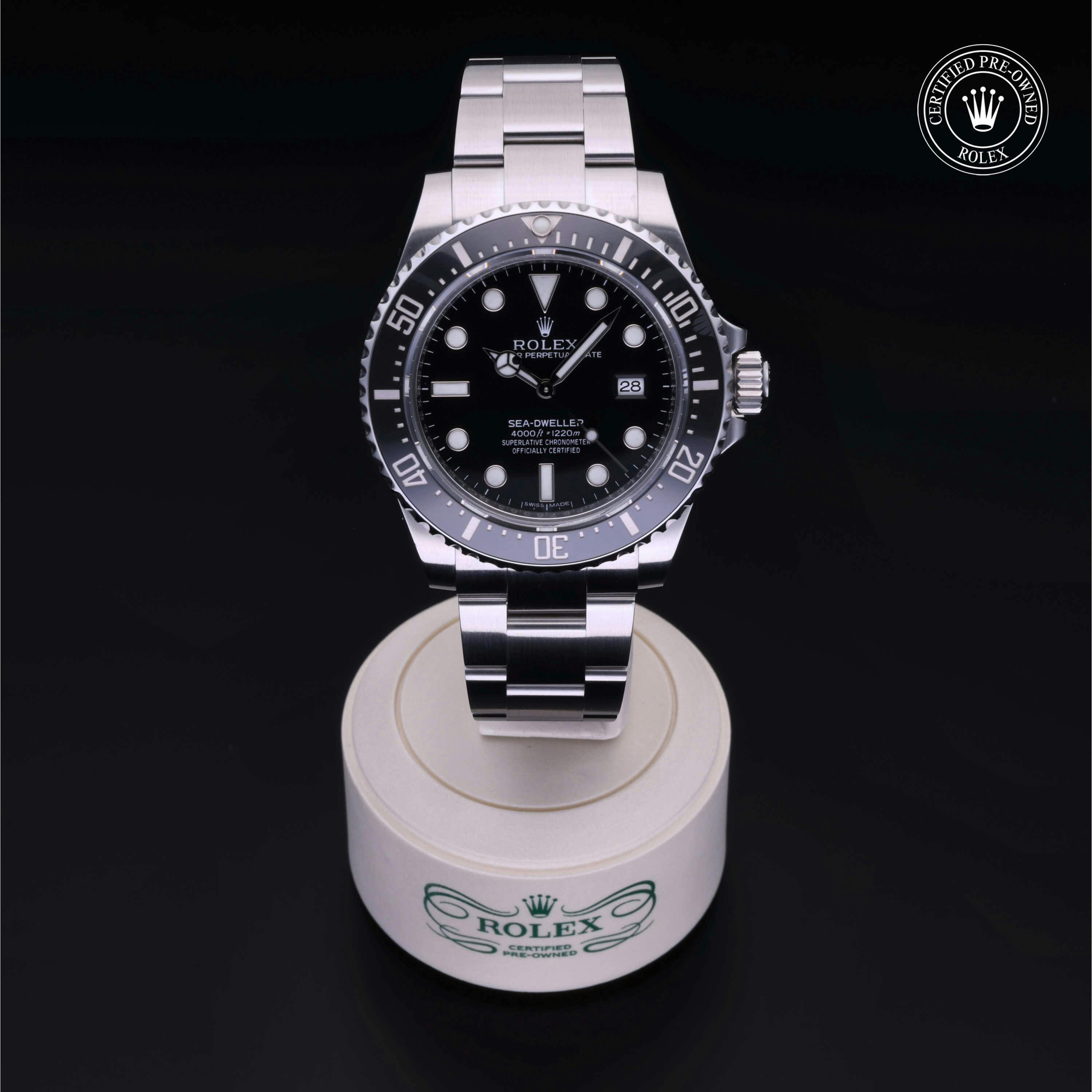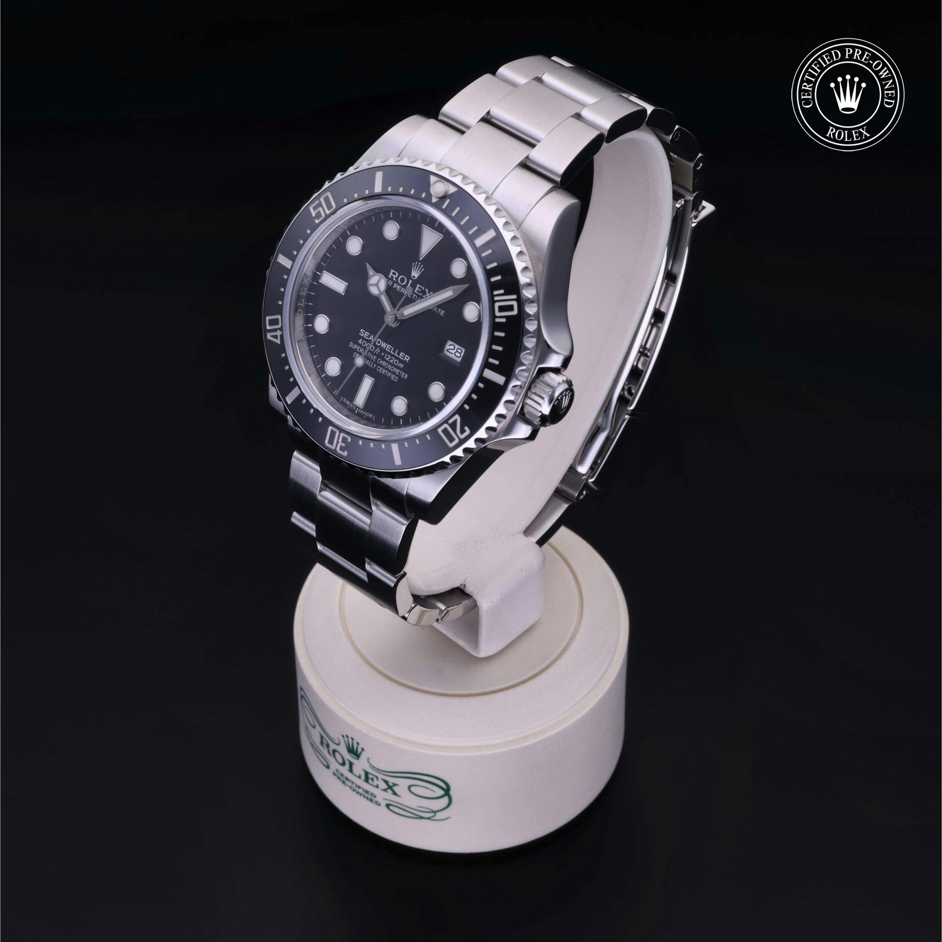 Rolex Certified Pre-Owned Sea-Dweller 4000 (116600) self - winding automatic watch, features a 40mm stainless steel case with a black cerachrom bezel surrounding a black dial on a stainless steel oyster bracelet. Functions include hours, minutes, seconds and date. This watch has received Rolex-authorized service and certification. It does not come with the original box or papers, but includes a custom Rolex Certified Pre-Owned hang tag, travel pouch and RCPO international warranty card.