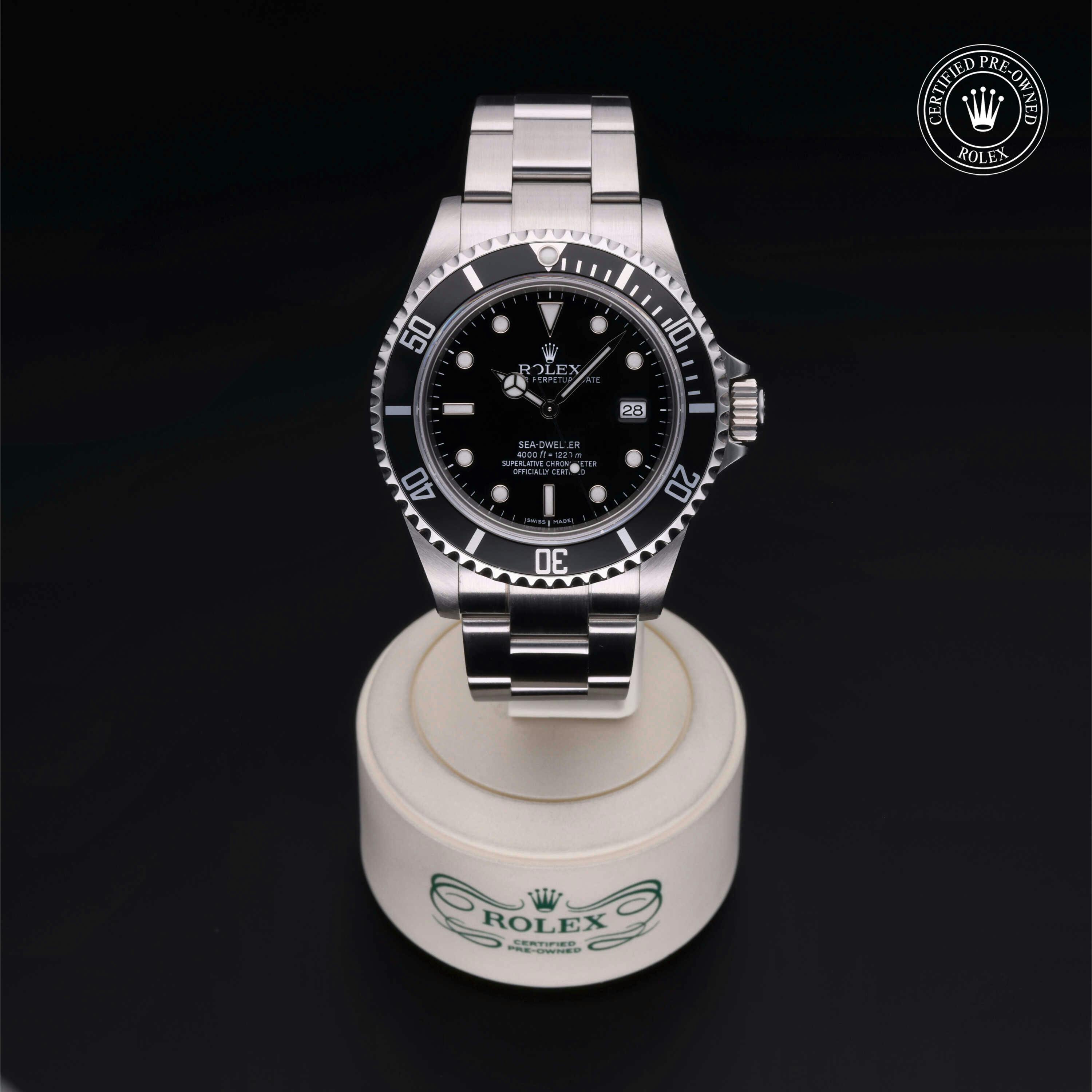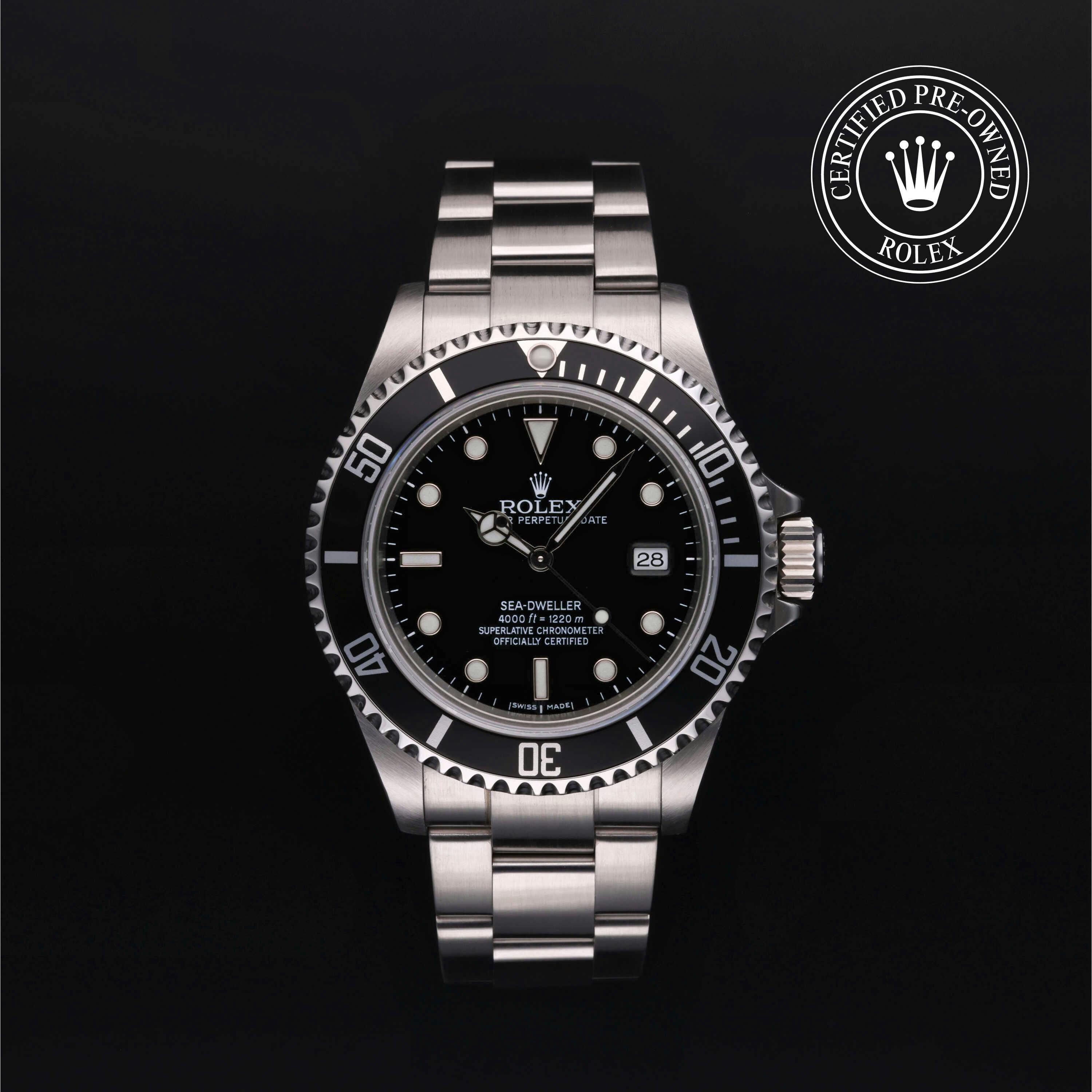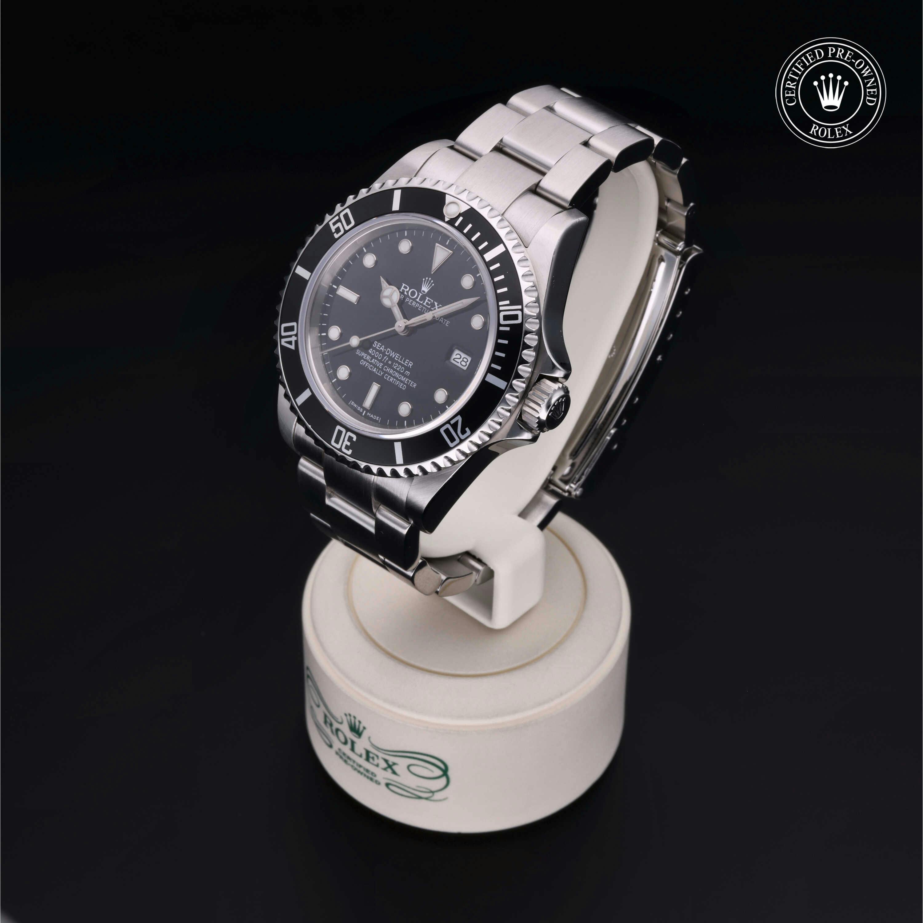 Rolex Certified Pre-Owned Sea-Dweller 4000 (16600) self - winding automatic watch, features a 40mm stainless steel case with a black aluminum bezel insert surrounding a black dial on a stainless steel oyster bracelet. Functions include hours, minutes, seconds and date. This watch has received Rolex-authorized service and certification. It comes with the original papers, and includes a custom Rolex Certified Pre-Owned hang tag, travel pouch and RCPO international warranty card.