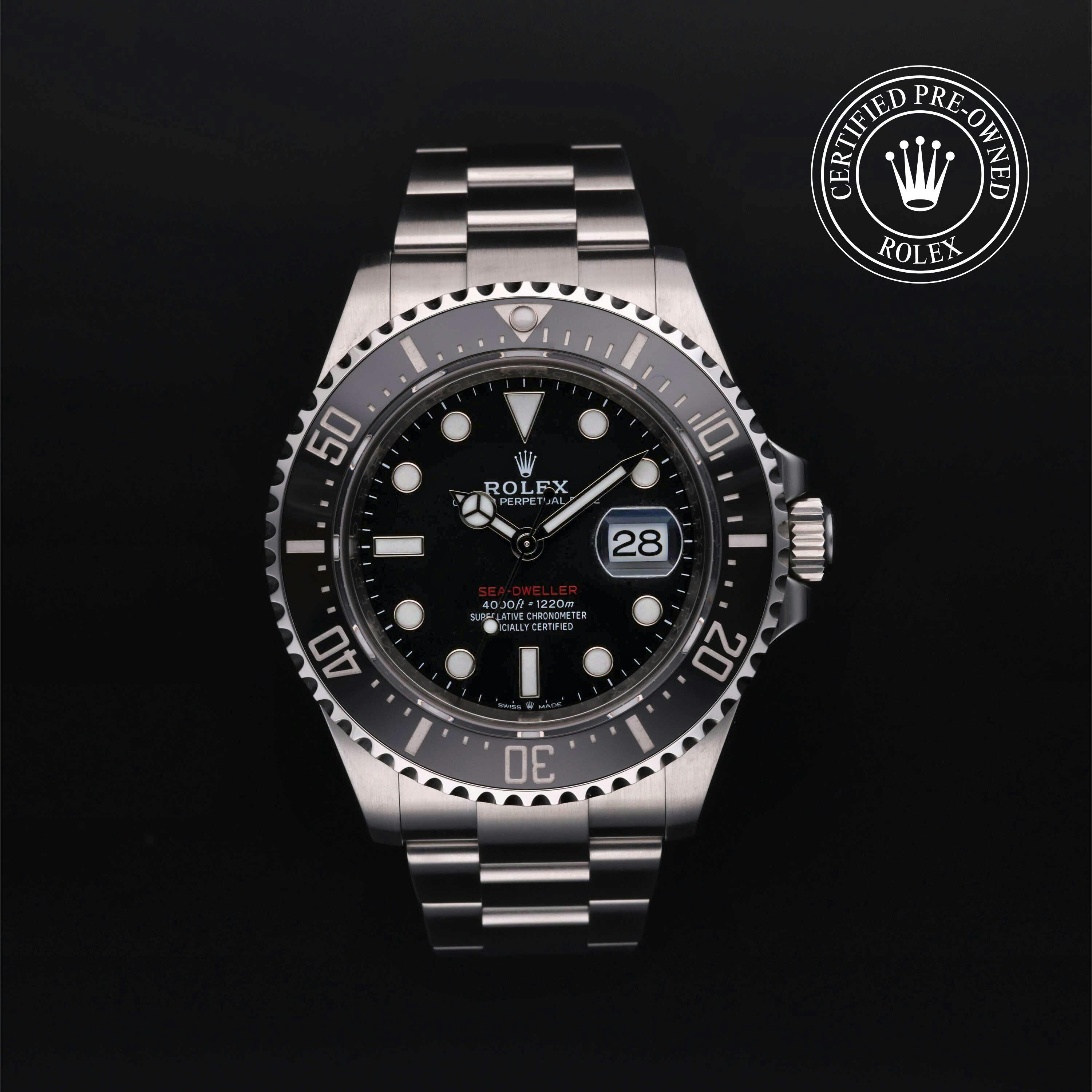 Rolex Certified Pre-Owned Sea-Dweller 4000 (126600) self - winding automatic watch, features a 43mm stainless steel case with a black cerachrom bezel insert surrounding a black dial on a stainless steel oyster bracelet. Functions include hours, minutes, seconds and date. This watch has received Rolex-authorized service and certification. It comes with the original box and papers, and includes a custom Rolex Certified Pre-Owned hang tag, travel pouch and RCPO international warranty card.