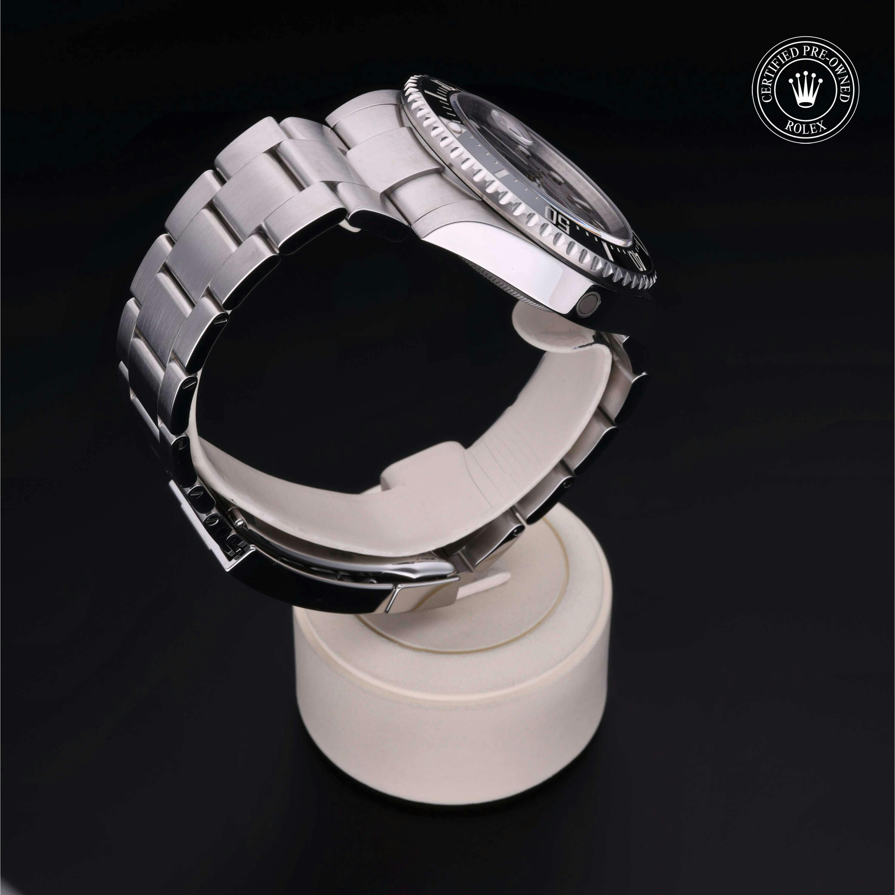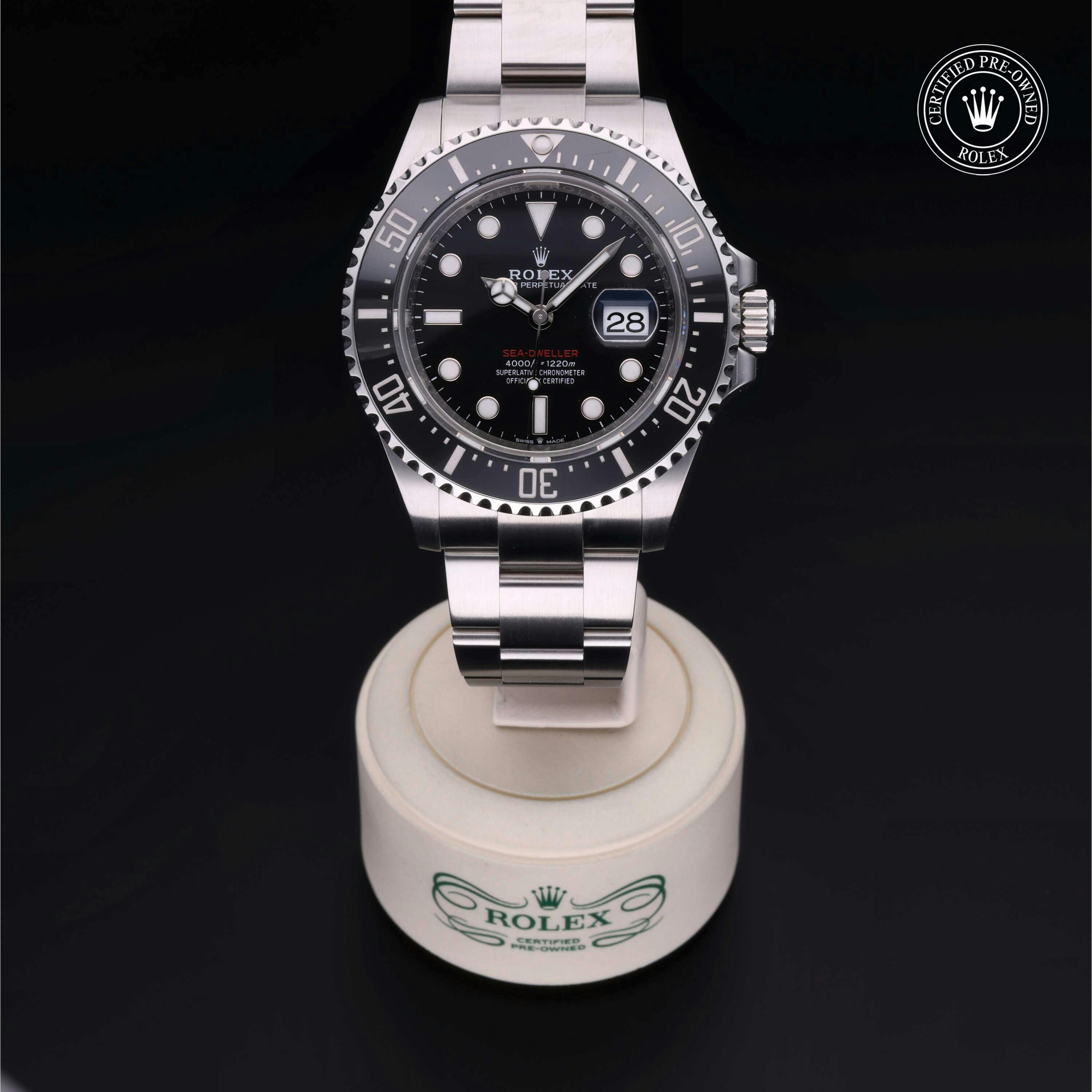 Rolex Certified Pre-Owned Sea-Dweller 4000 (126600) self - winding automatic watch, features a 43mm stainless steel case with a black cerachrom bezel insert surrounding a black dial on a stainless steel oyster bracelet. Functions include hours, minutes, seconds and date. This watch has received Rolex-authorized service and certification. It comes with the original box and papers, and includes a custom Rolex Certified Pre-Owned hang tag, travel pouch and RCPO international warranty card.