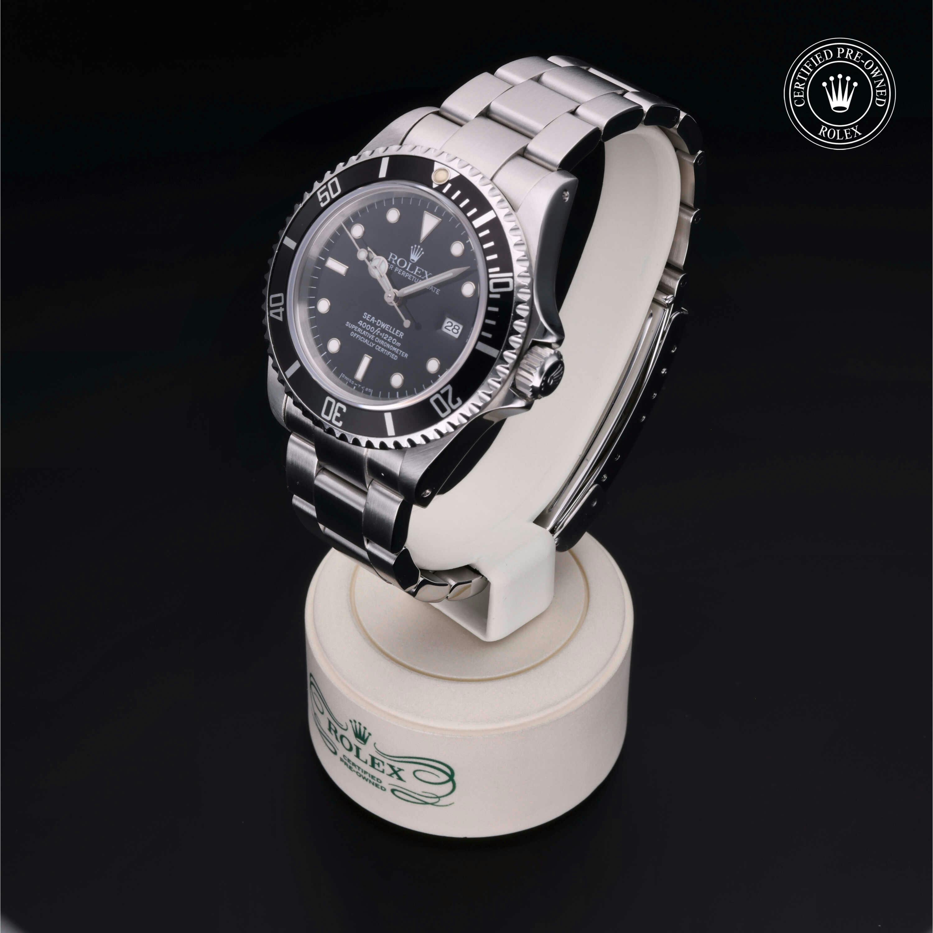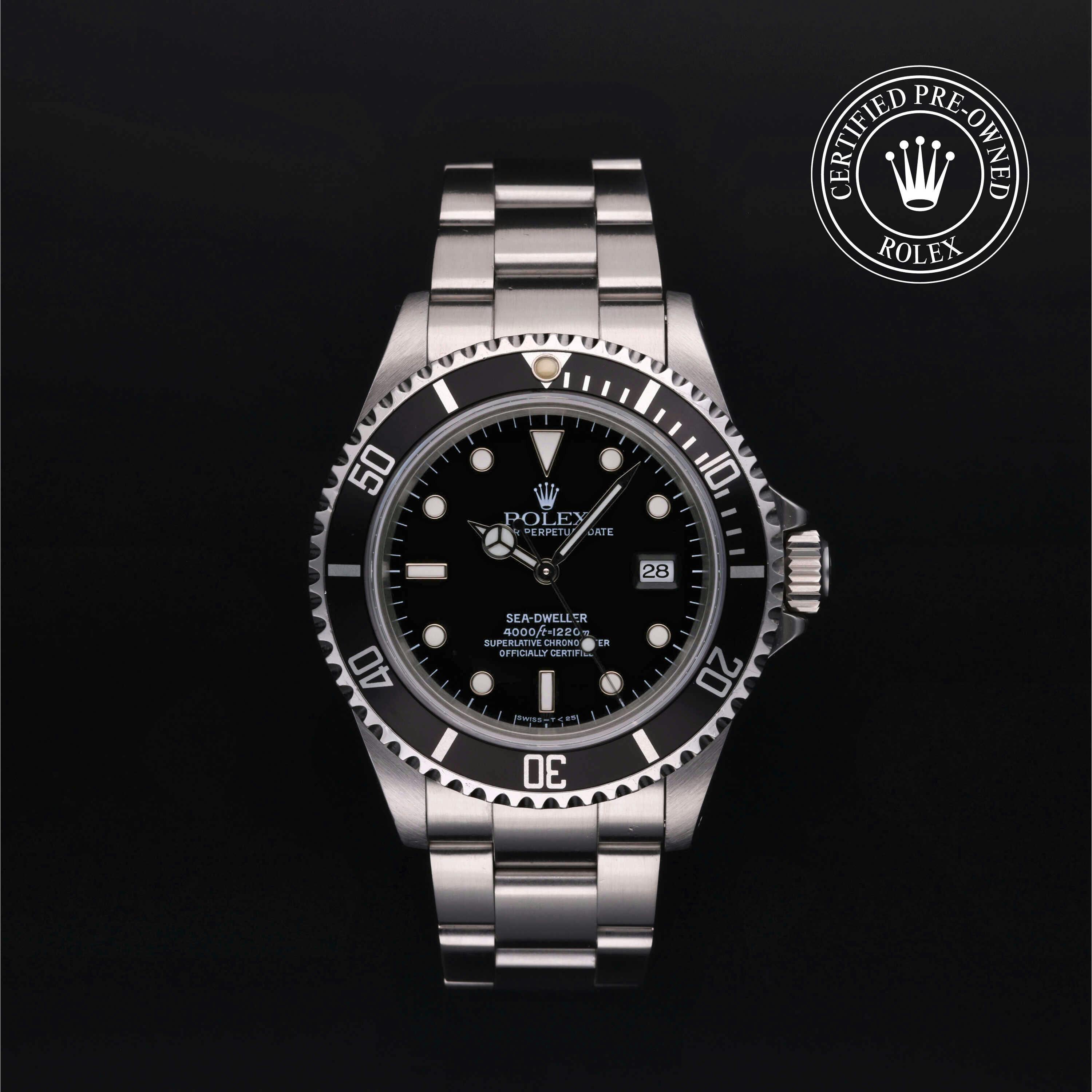 Rolex Certified Pre-Owned Sea-Dweller 4000 (16600) self - winding automatic watch, features a 40mm stainless steel case with a black aluminum bezel insert surrounding a black dial on a stainless steel oyster bracelet. Functions include hours, minutes, seconds and date. This watch has received Rolex-authorized service and certification. It does not come with the original box or papers, but includes a custom Rolex Certified Pre-Owned hang tag, travel pouch and RCPO international warranty card.