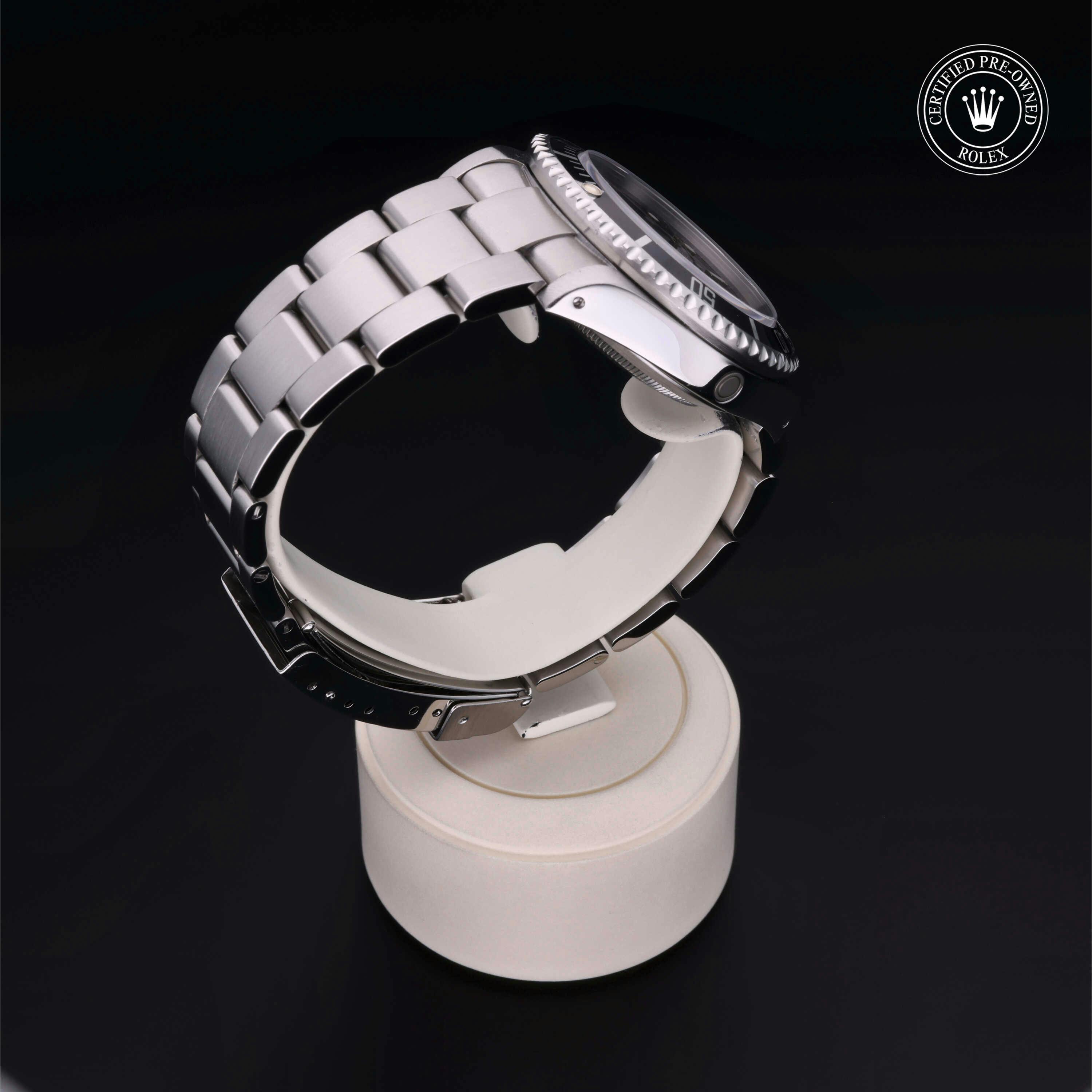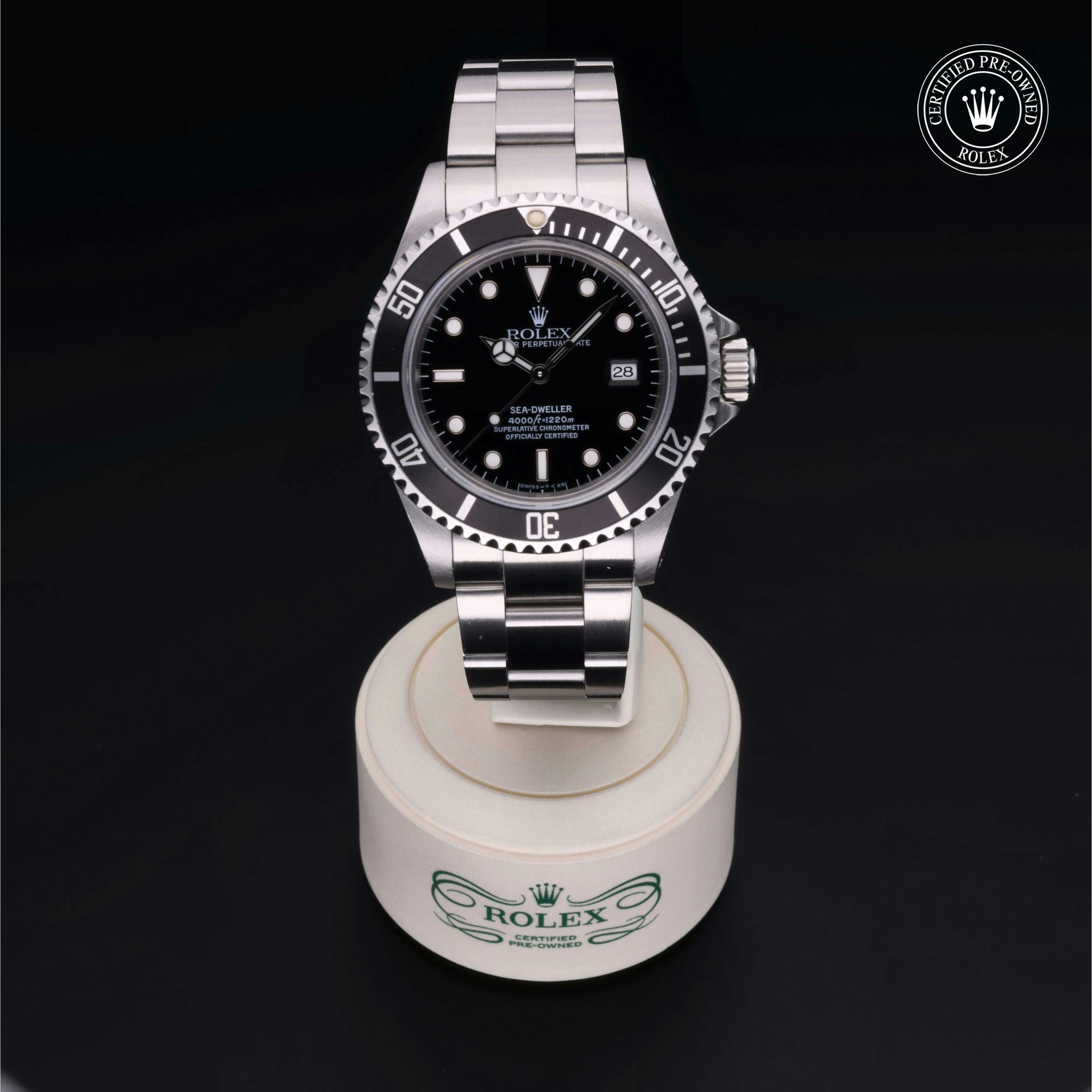 Rolex Certified Pre-Owned Sea-Dweller 4000 (16600) self - winding automatic watch, features a 40mm stainless steel case with a black aluminum bezel insert surrounding a black dial on a stainless steel oyster bracelet. Functions include hours, minutes, seconds and date. This watch has received Rolex-authorized service and certification. It does not come with the original box or papers, but includes a custom Rolex Certified Pre-Owned hang tag, travel pouch and RCPO international warranty card.