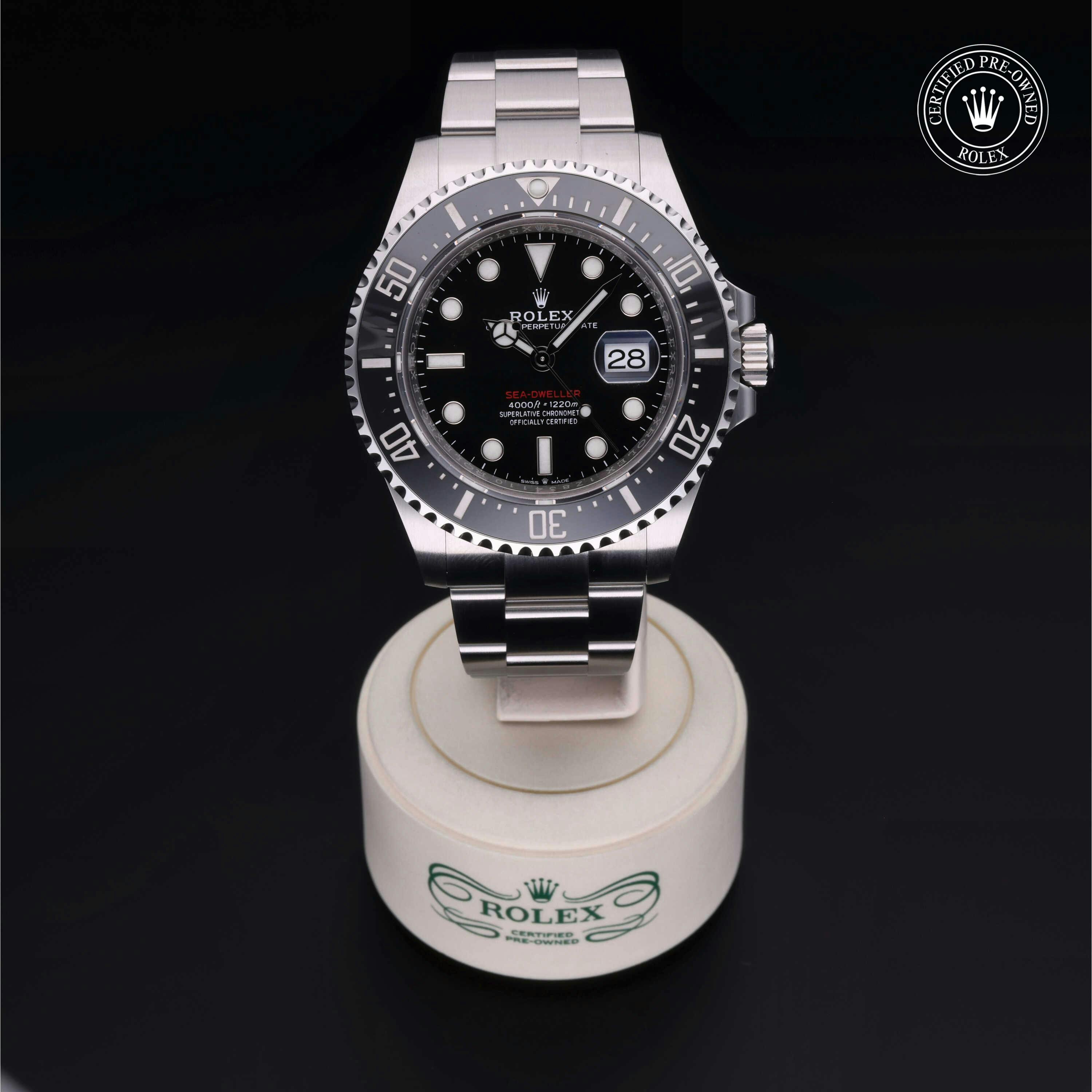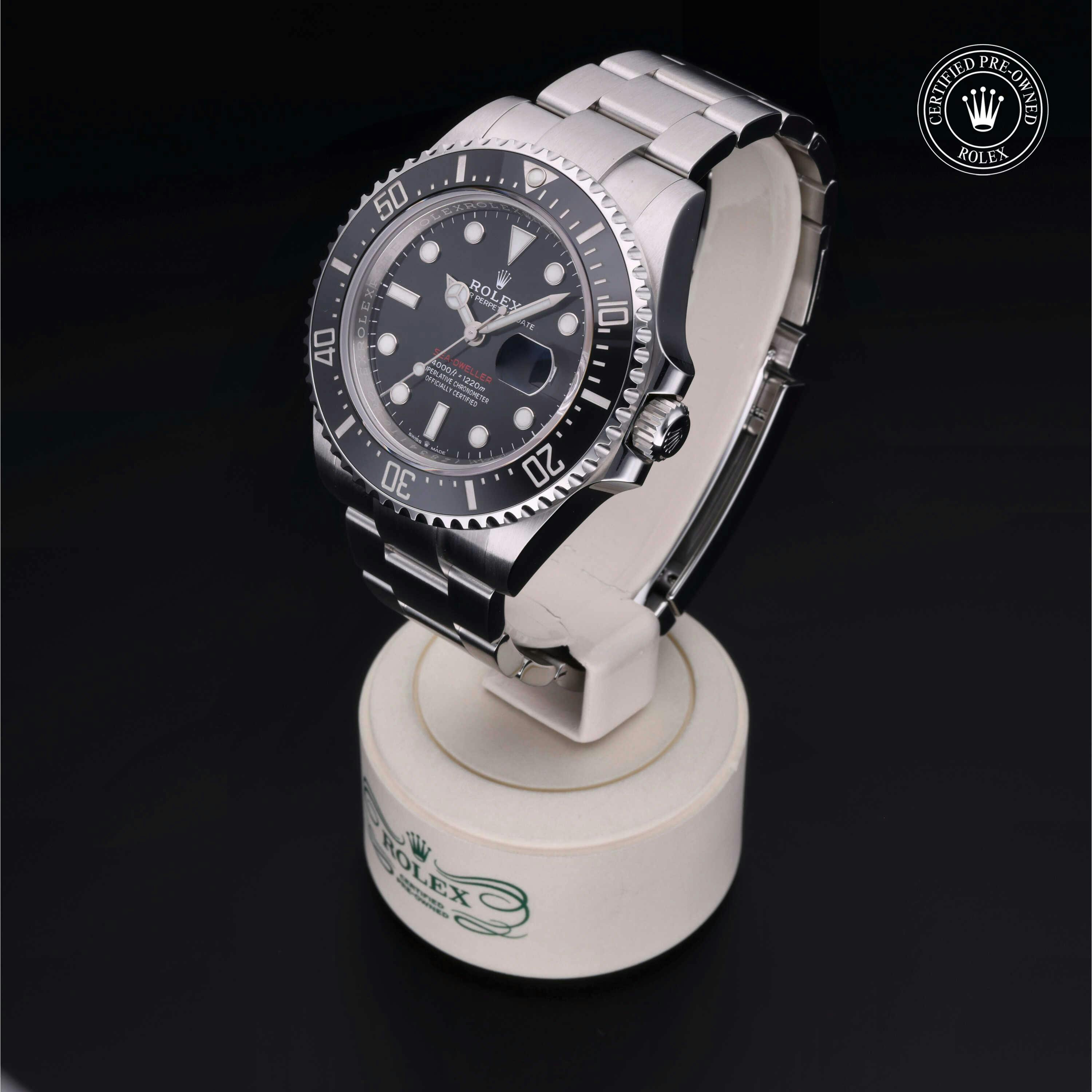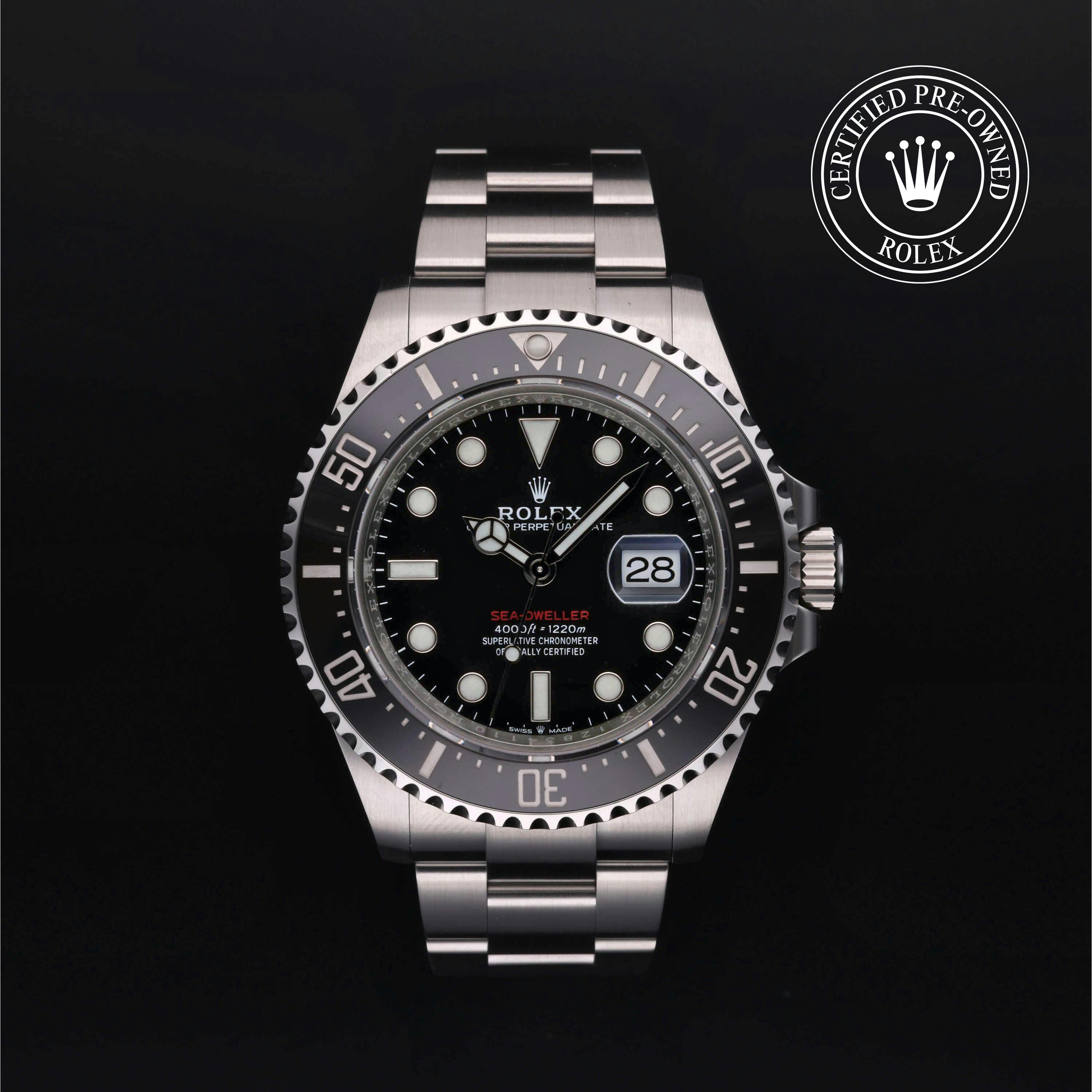 Rolex Certified Pre-Owned Sea-Dweller 4000 (126600) self - winding automatic watch, features a 43mm stainless steel case with a stainless steel and black cerachrom bezel surrounding a black dial. The watch is secured on a stainless steel Oyster bracelet complete with a folding buckle. Functions include hours, minutes, seconds, date and helium release valve. This watch has been serviced by an authorized service center and certified by Rolex. It comes with the original box and papers as well as a custom Rolex Certified Pre-Owned hang tag, travel pouch and international warranty card.