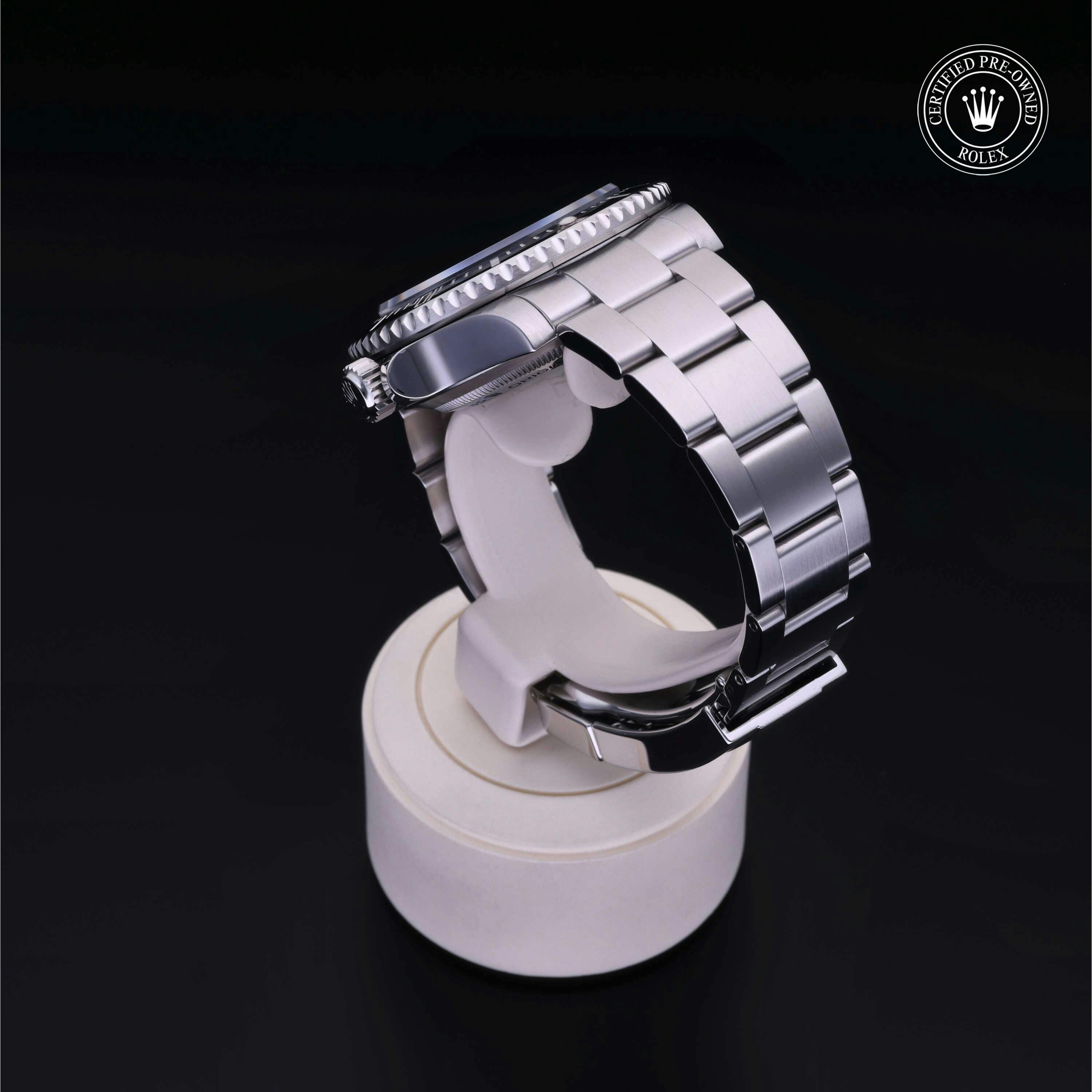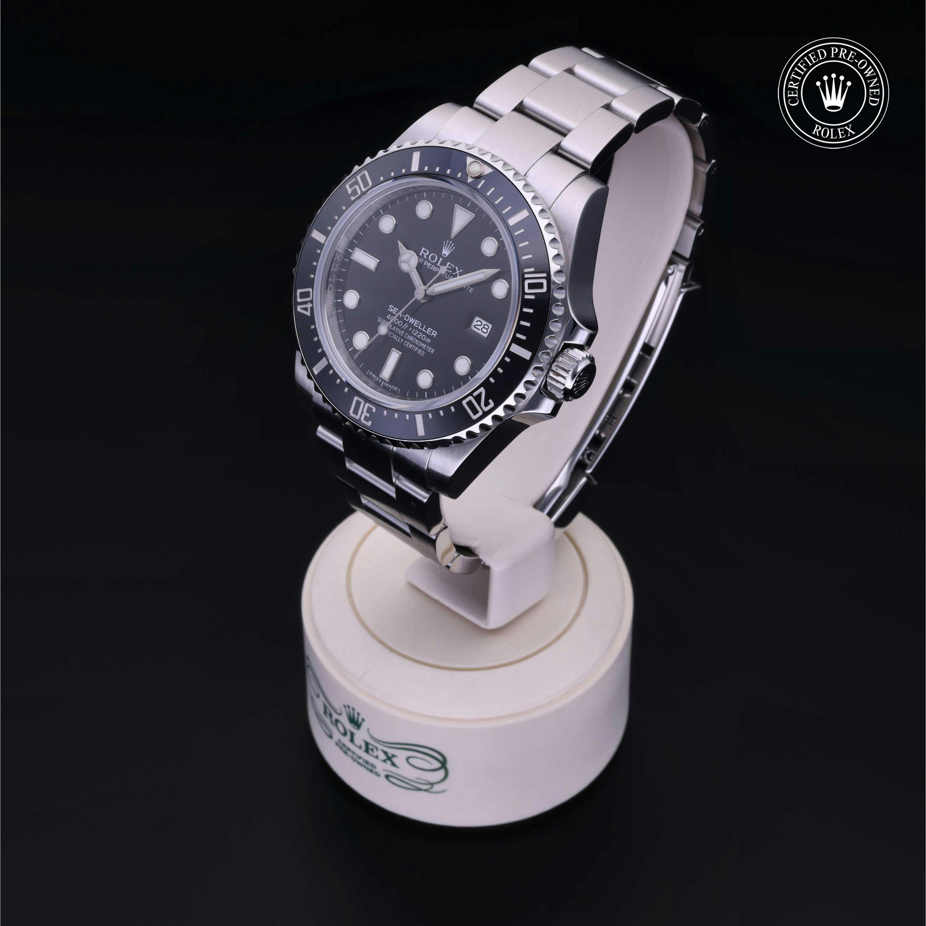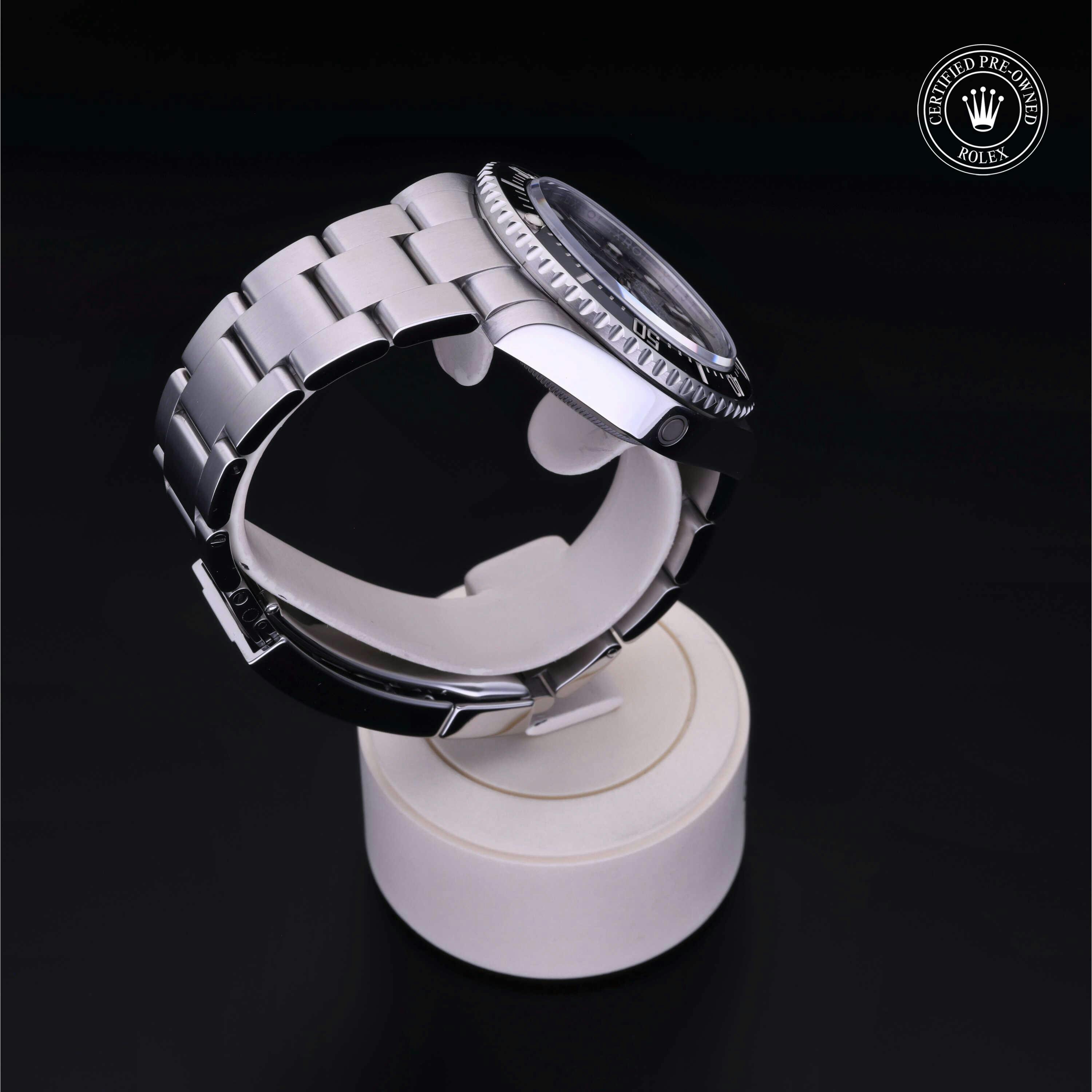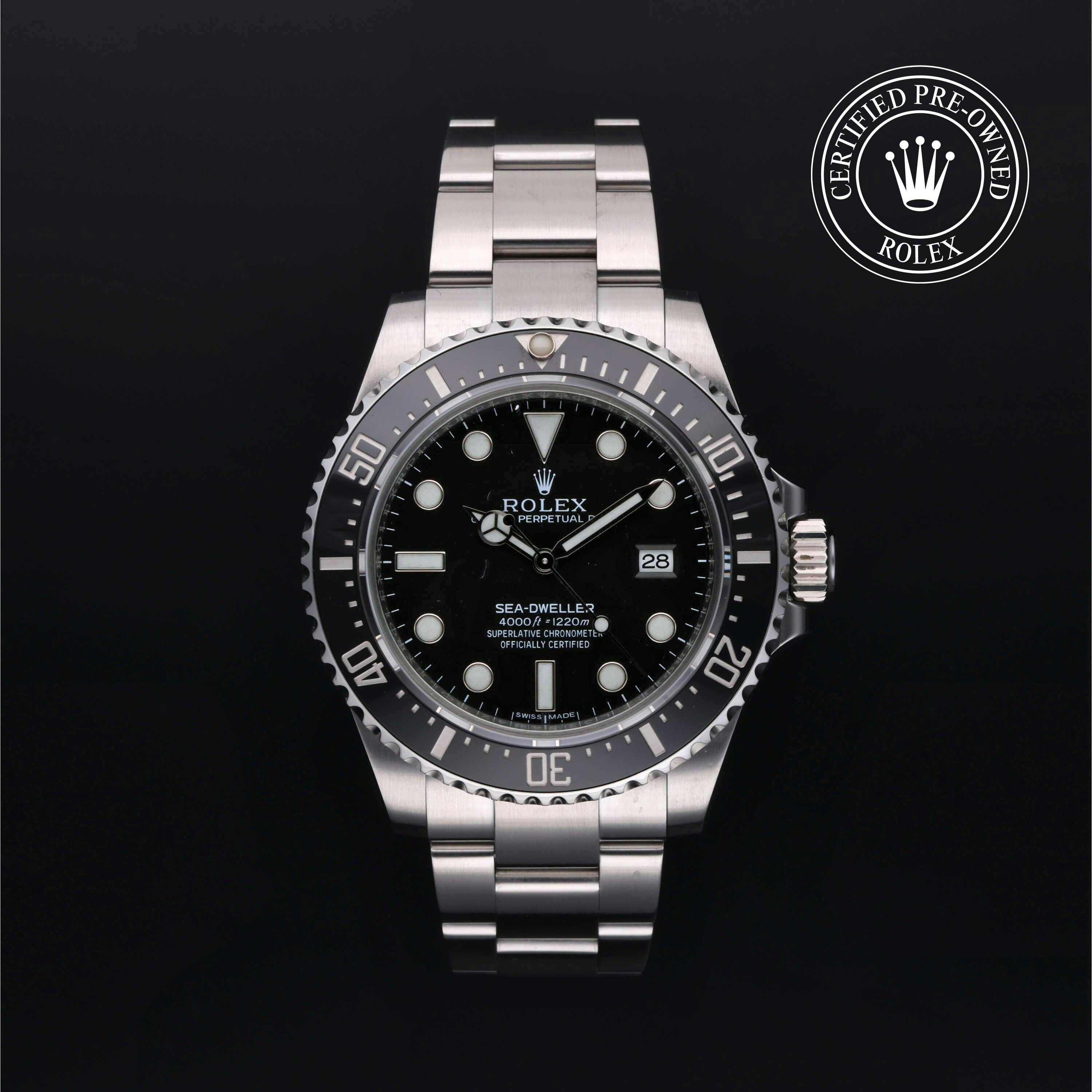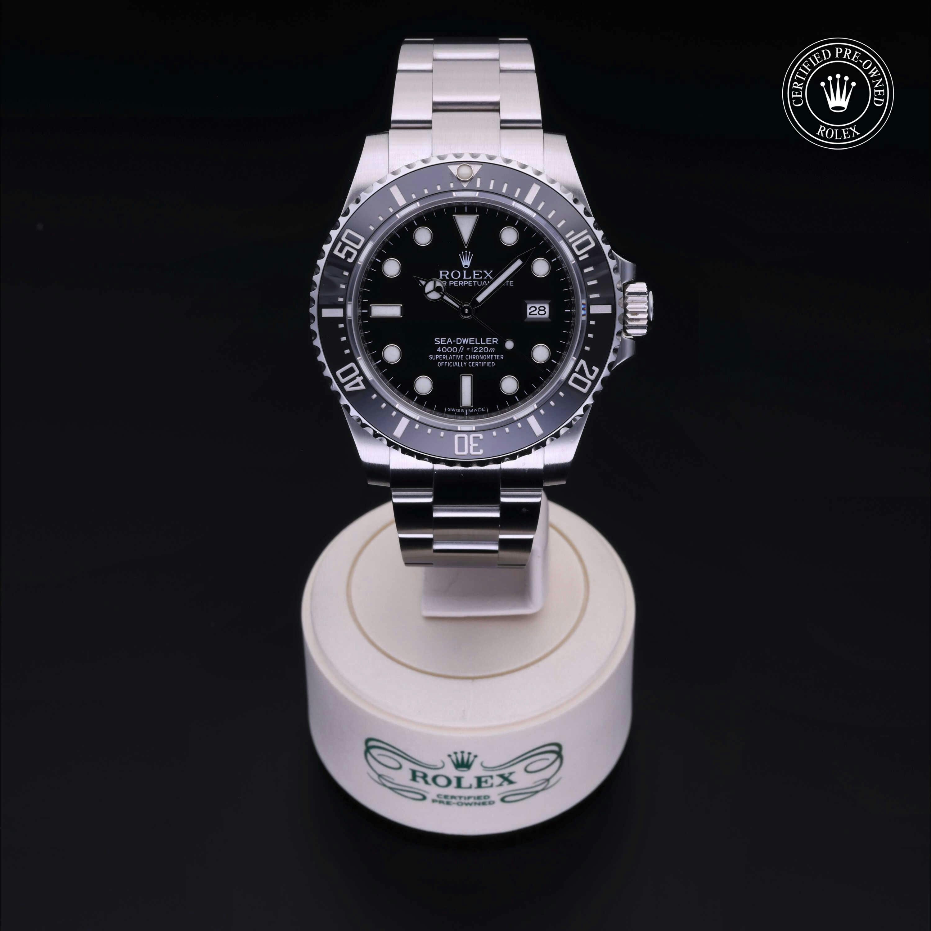 Rolex Certified Pre-Owned Sea-Dweller 4000 (116600) self - winding automatic watch, features a 40mm stainless steel case with a black cerachrom bezel insert surrounding a black dial on a stainless steel oyster bracelet. Functions include hours, minutes, seconds and date. This watch has received Rolex-authorized service and certification. It does not come with the original box or papers, but includes a custom Rolex Certified Pre-Owned hang tag, travel pouch and RCPO international warranty card.