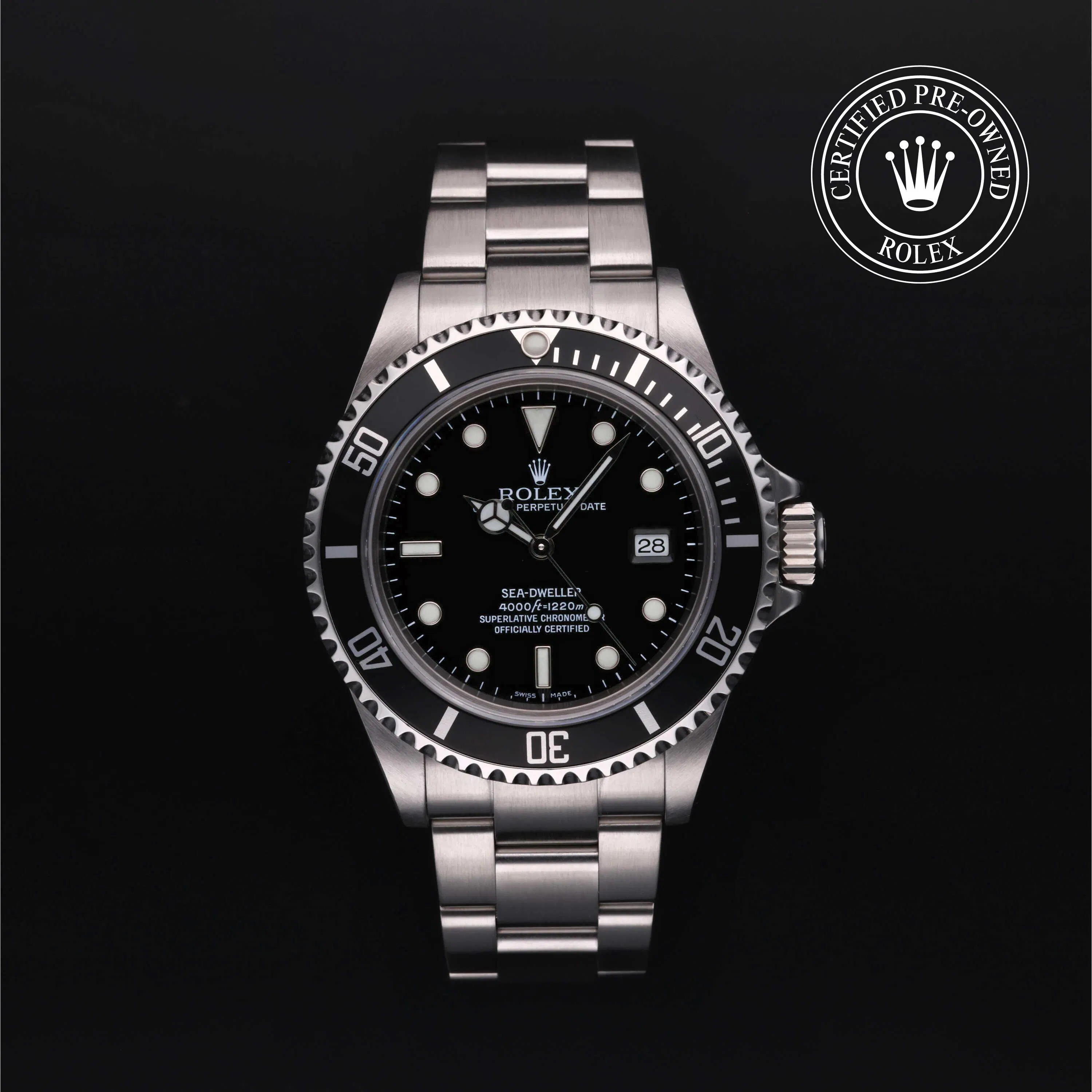 Rolex Certified Pre-Owned Sea-Dweller (16600) self - winding automatic watch, features a 40mm stainless steel case with a unidirectional rotating bezel fitted with a black aluminium 60-minute scale insert surrounding a black dial. The watch is secured on a stainless steel Oyster bracelet complete with a folding buckle. Functions include hours, minutes, seconds and date. This watch has been serviced by an authorized service center and certified by Rolex. It does not come with the original box or papers, but includes a custom Rolex Certified Pre-Owned hang tag, travel pouch and international warranty card.