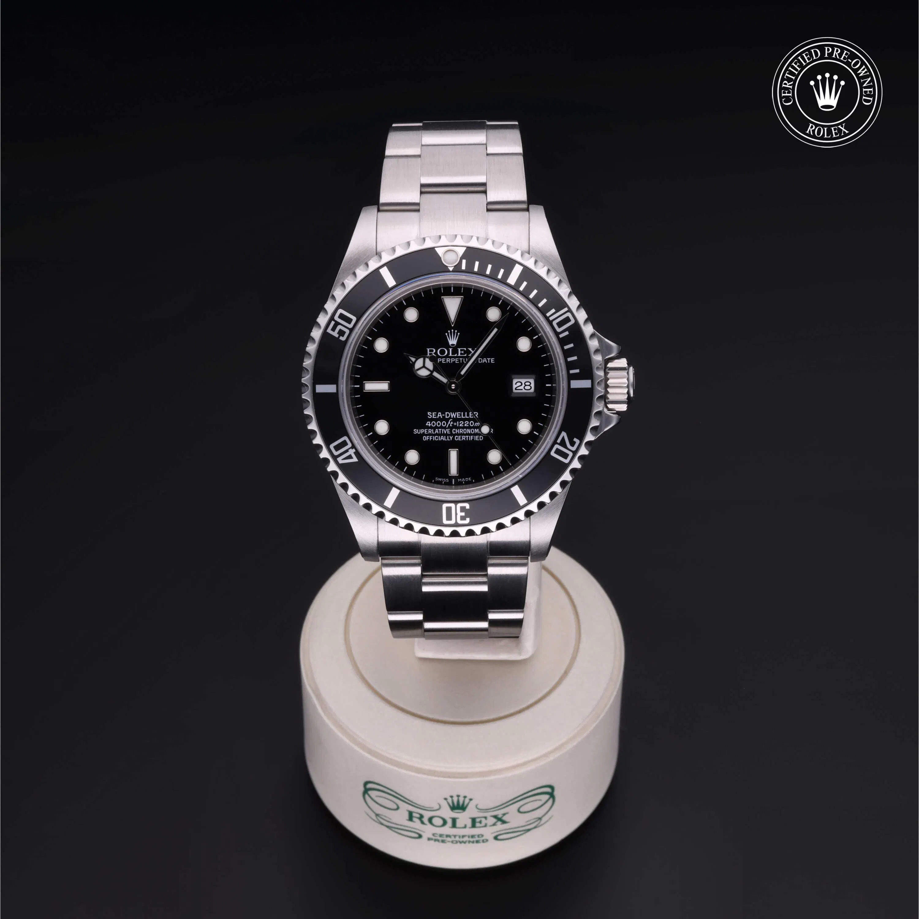 Rolex Certified Pre-Owned Sea-Dweller (16600) self - winding automatic watch, features a 40mm stainless steel case with a unidirectional rotating bezel fitted with a black aluminium 60-minute scale insert surrounding a black dial. The watch is secured on a stainless steel Oyster bracelet complete with a folding buckle. Functions include hours, minutes, seconds and date. This watch has been serviced by an authorized service center and certified by Rolex. It does not come with the original box or papers, but includes a custom Rolex Certified Pre-Owned hang tag, travel pouch and international warranty card.