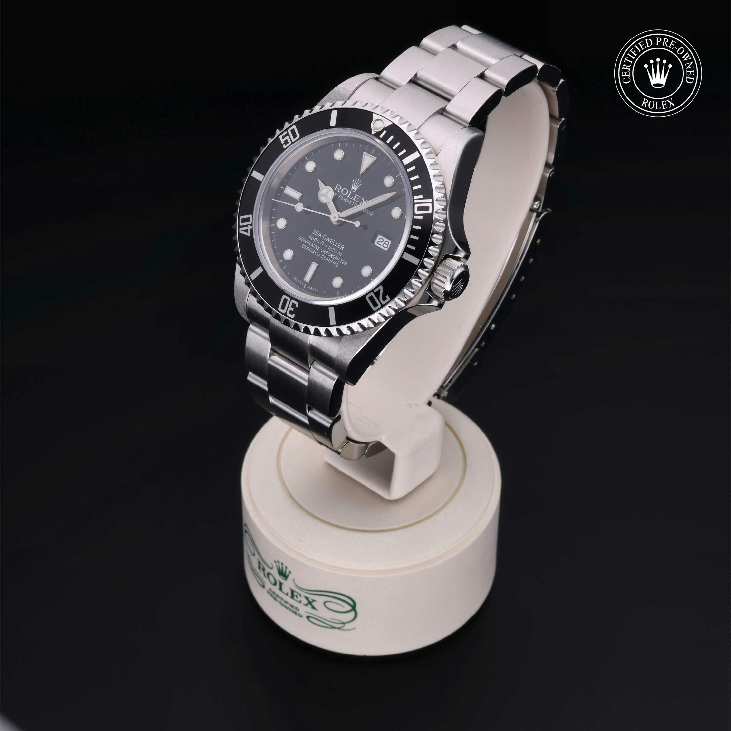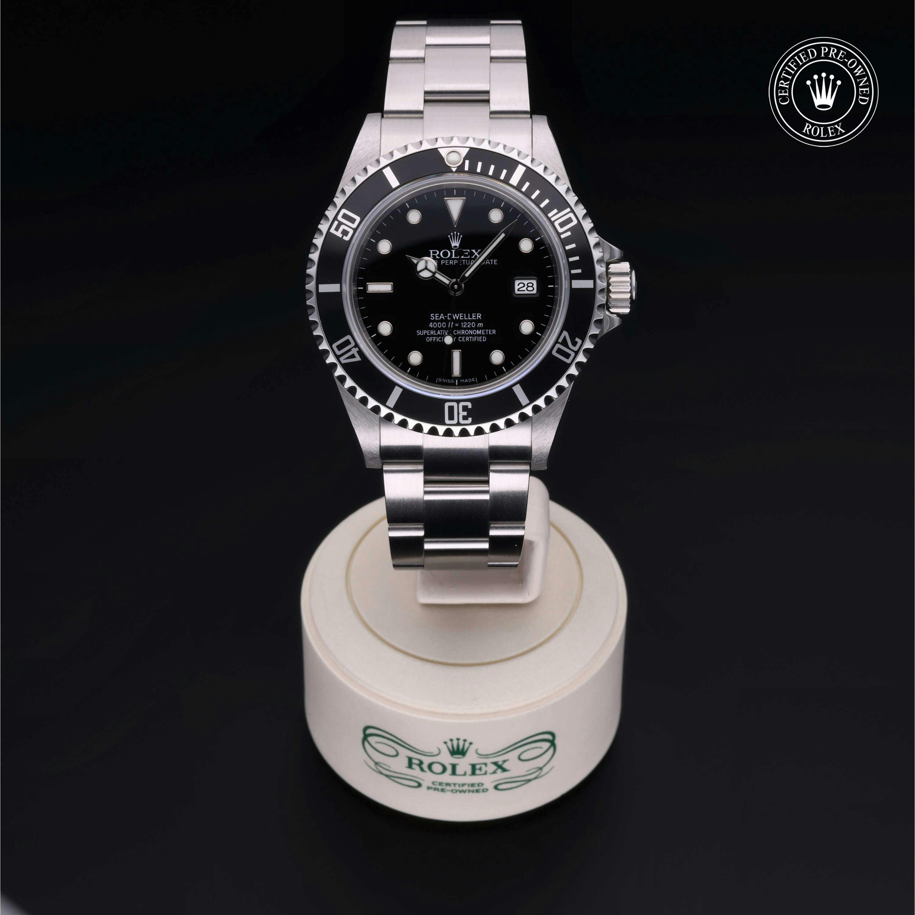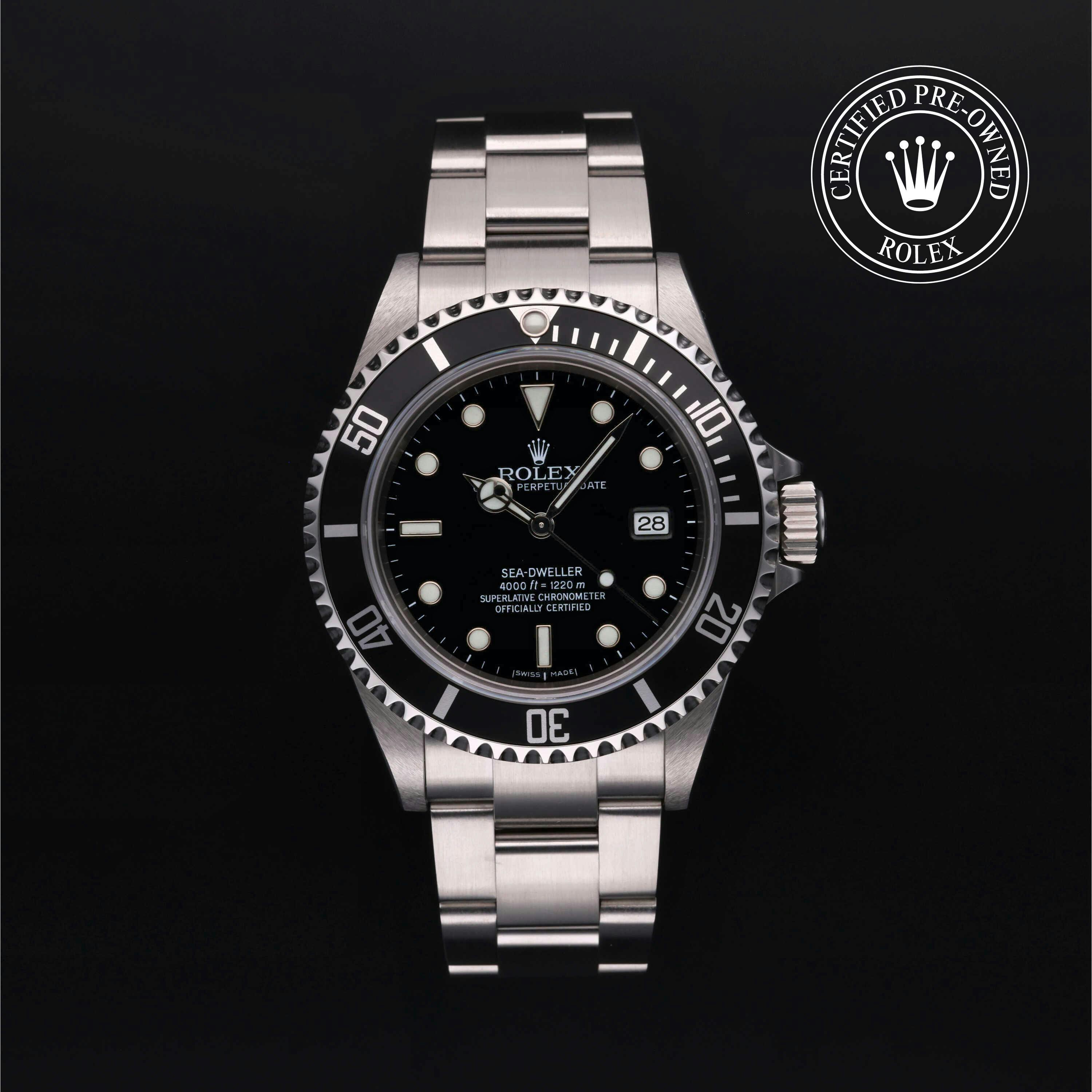Rolex Certified Pre-Owned Oyster Perpetual Sea-Dweller (16600) self - winding automatic watch, features a 40mm stainless steel case with a stainless steel and black aluminium insert surrounding a black dial. The watch is secured on a stainless steel Oyster bracelet complete with a folding buckle. Functions include hours, minutes, seconds and date. This watch has been serviced by an authorized service center and certified by Rolex. It comes with the original box and papers as well as a custom Rolex Certified Pre-Owned hang tag, travel pouch and international warranty card.