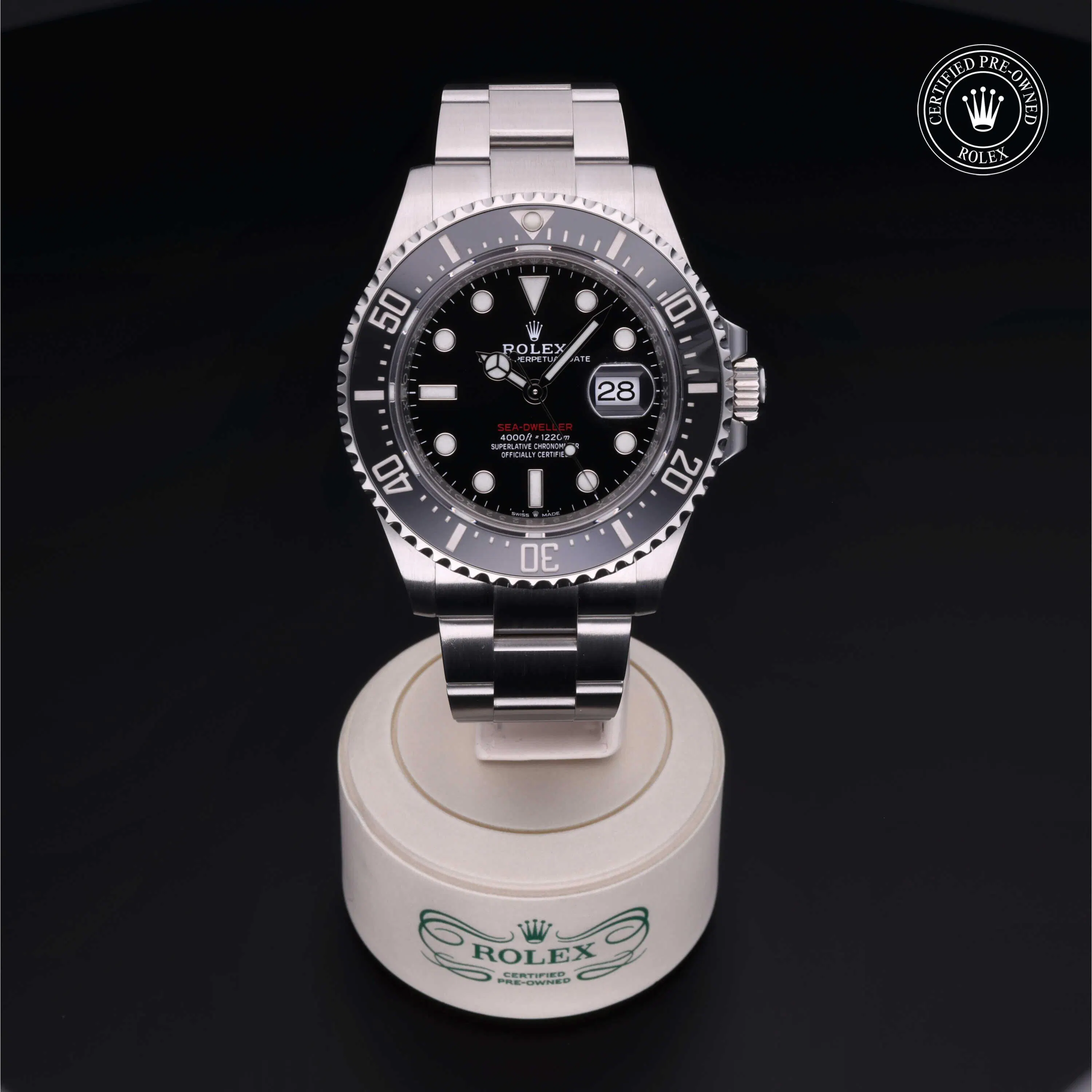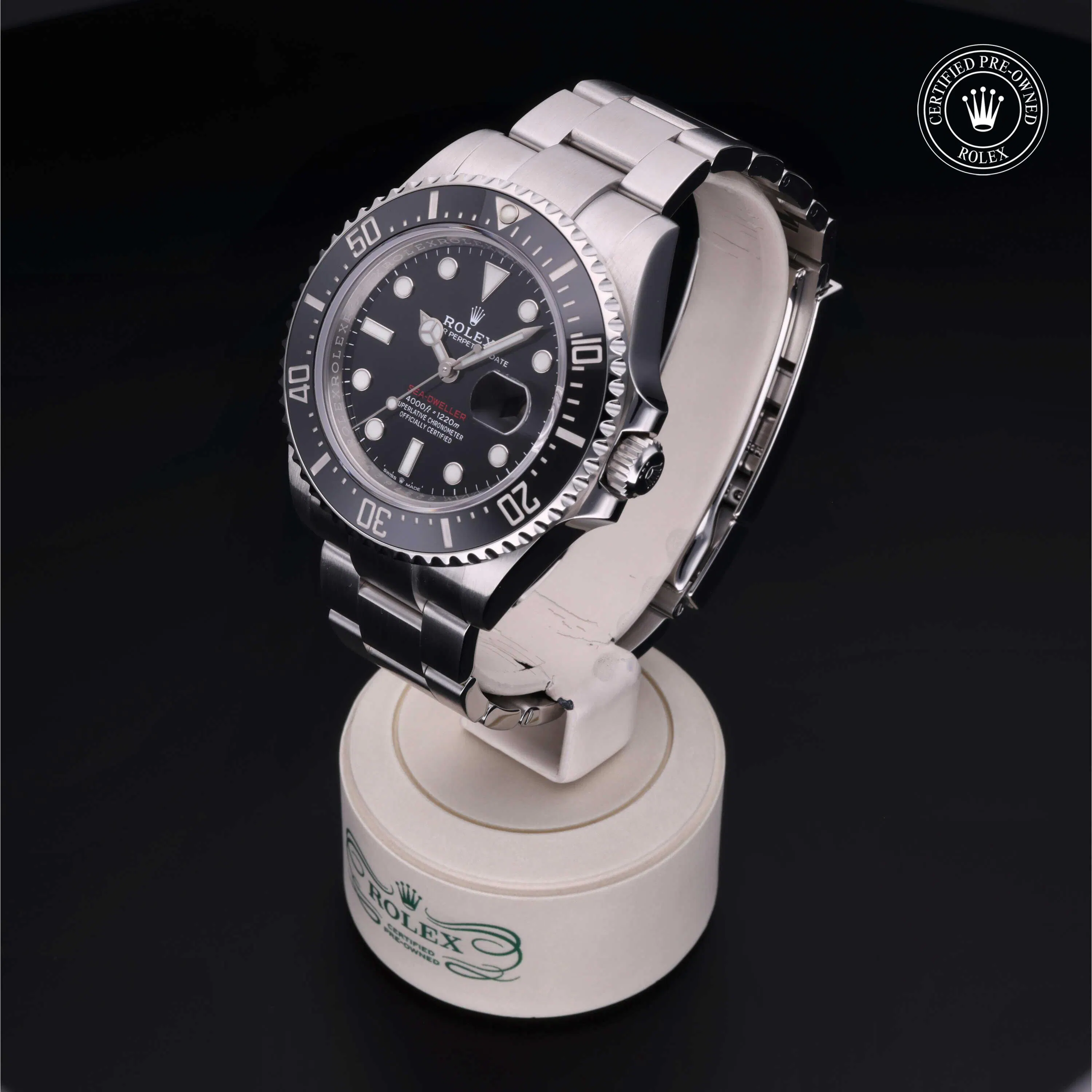 Rolex Certified Pre-Owned Sea-Dweller 4000 (126600) self - winding automatic watch, features a 43mm stainless steel case and unidirectional rotating bezel with a black cerachrom insert surrounding a black dial on a stainless steel oyster bracelet. Functions include hours, minutes, seconds and date. This watch has received Rolex-authorized service and certification. It comes with the original box and papers, and includes a custom Rolex Certified Pre-Owned hang tag, travel pouch and RCPO international warranty card.