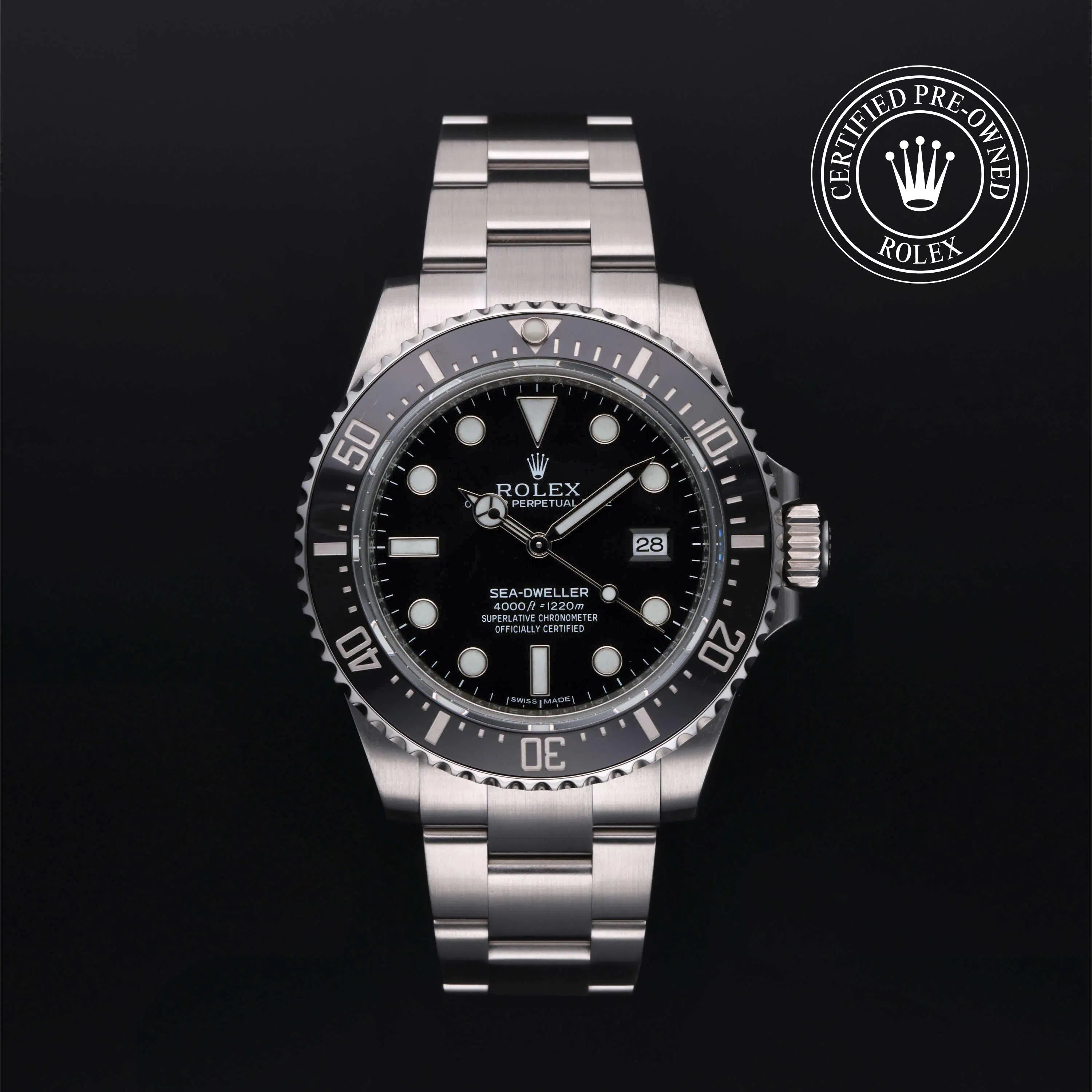 Rolex Certified Pre-Owned Sea-Dweller 4000 (116600) self - winding automatic watch, features a 40mm stainless steel case and unidirectional rotating bezel with a black cerachrom insert surrounding a black dial on a stainless steel oyster bracelet. Functions include hours, minutes, seconds and date. This watch has received Rolex-authorized service and certification. It comes with the original papers, and includes a custom Rolex Certified Pre-Owned hang tag, travel pouch and RCPO international warranty card.