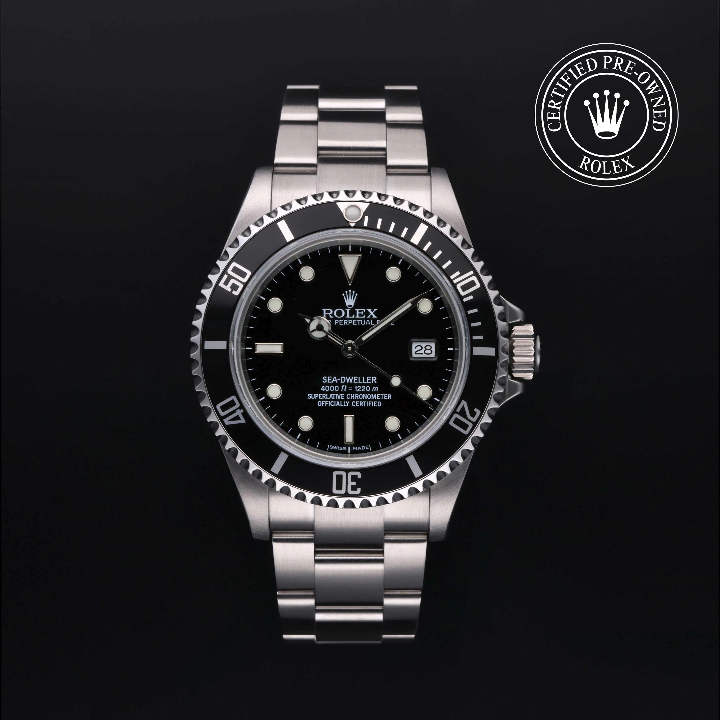 Rolex Certified Pre-Owned Sea-Dweller (16600) self - winding automatic watch, features a 40mm stainless steel case and unidirectional rotating bezel fitted with a black aluminium 60-minute scale insert surrounding a black dial. The watch is secured on a stainless steel Oyster bracelet complete with a folding buckle. Functions include hours, minutes, seconds and date. This watch has been serviced by an authorized service center and certified by Rolex. It does not come with the original box or papers, but includes a custom Rolex Certified Pre-Owned hang tag, travel pouch and international warranty card.