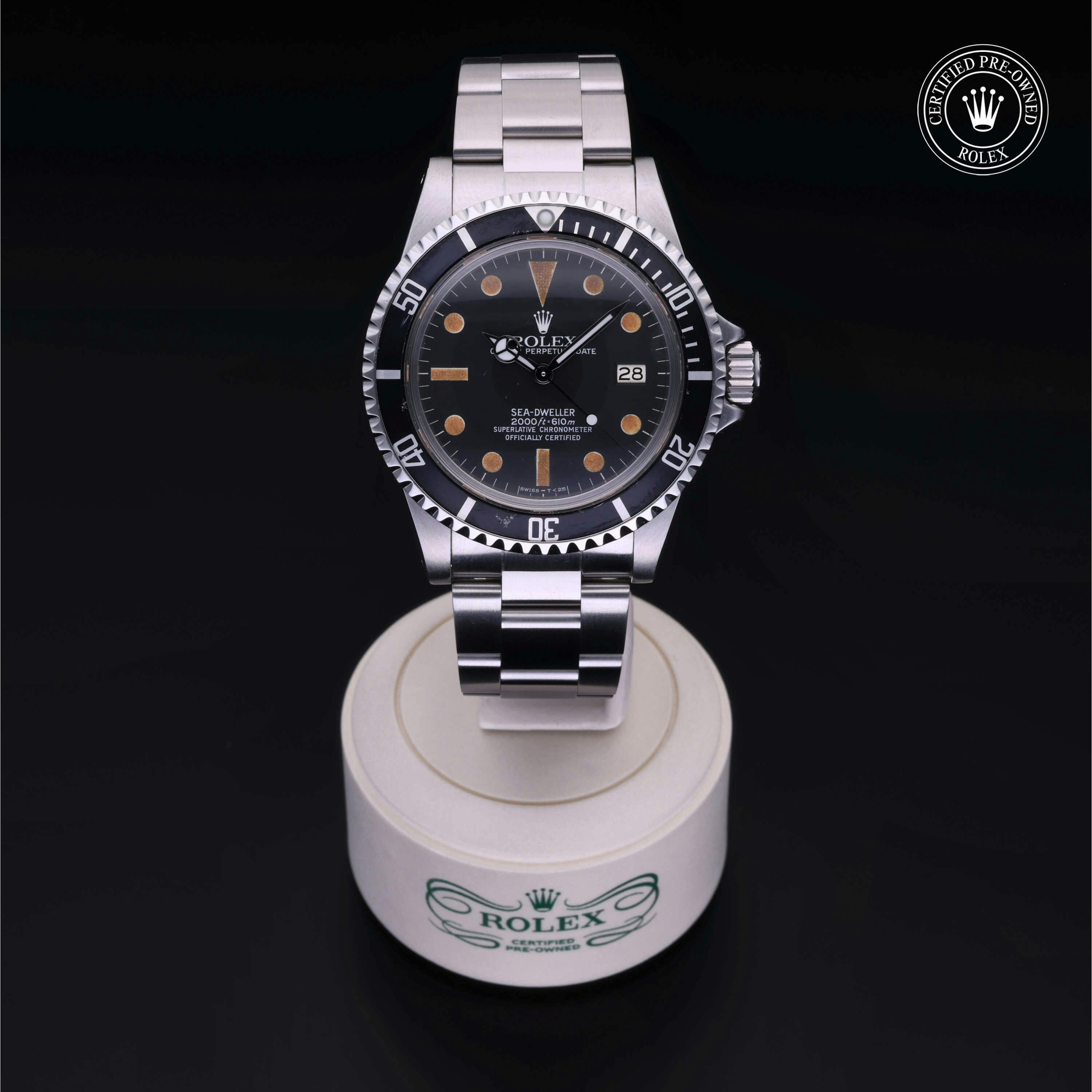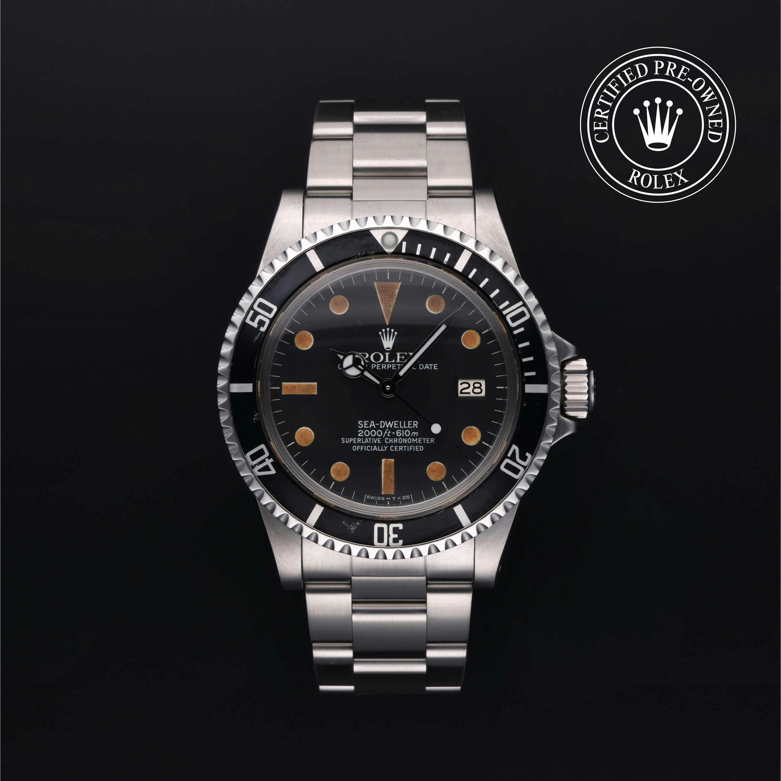 Rolex Certified Pre-Owned Rolex Vintage Sea-Dweller (1665) self - winding automatic watch, features a 40mm stainless steel case with a black aluminum bezel surrounding a black dial on a stainless steel oyster bracelet. Functions include hours, minutes, seconds and date. This watch has received Rolex-authorized service and certification. It does not come with the original box or papers, but includes a custom Rolex Certified Pre-Owned hang tag, travel pouch and RCPO international warranty card.
