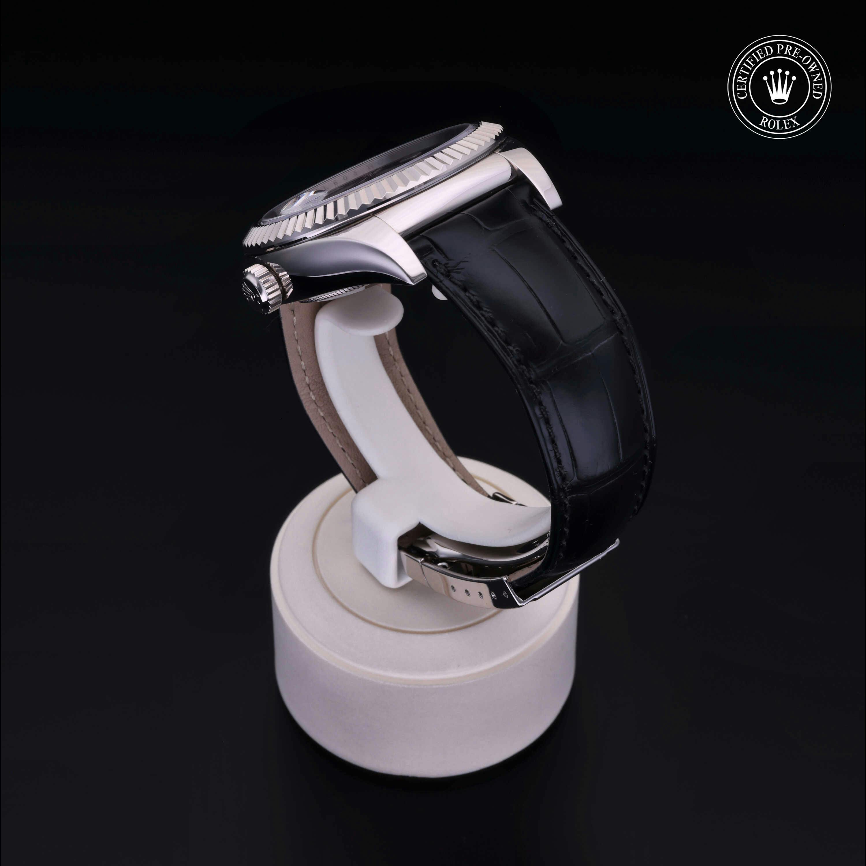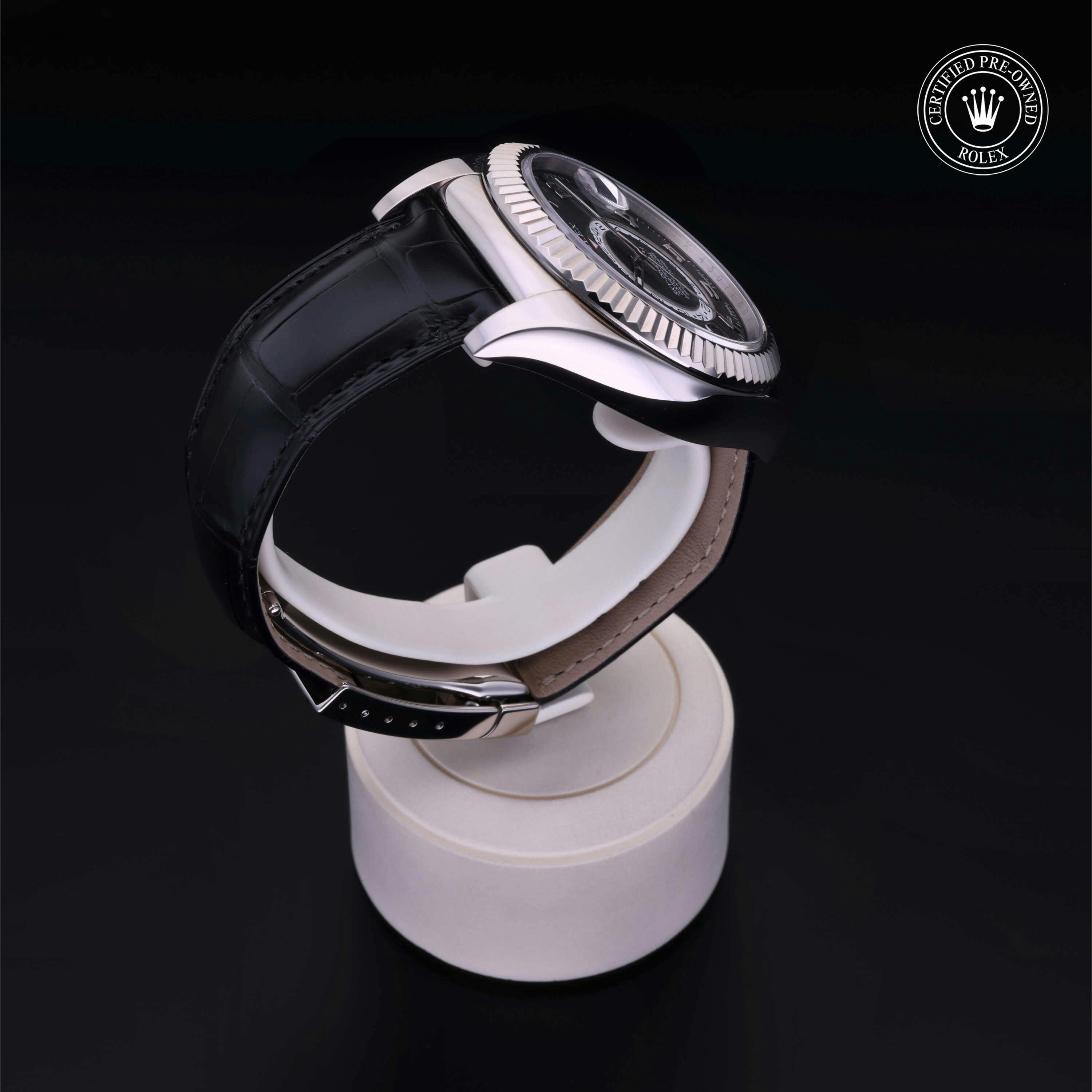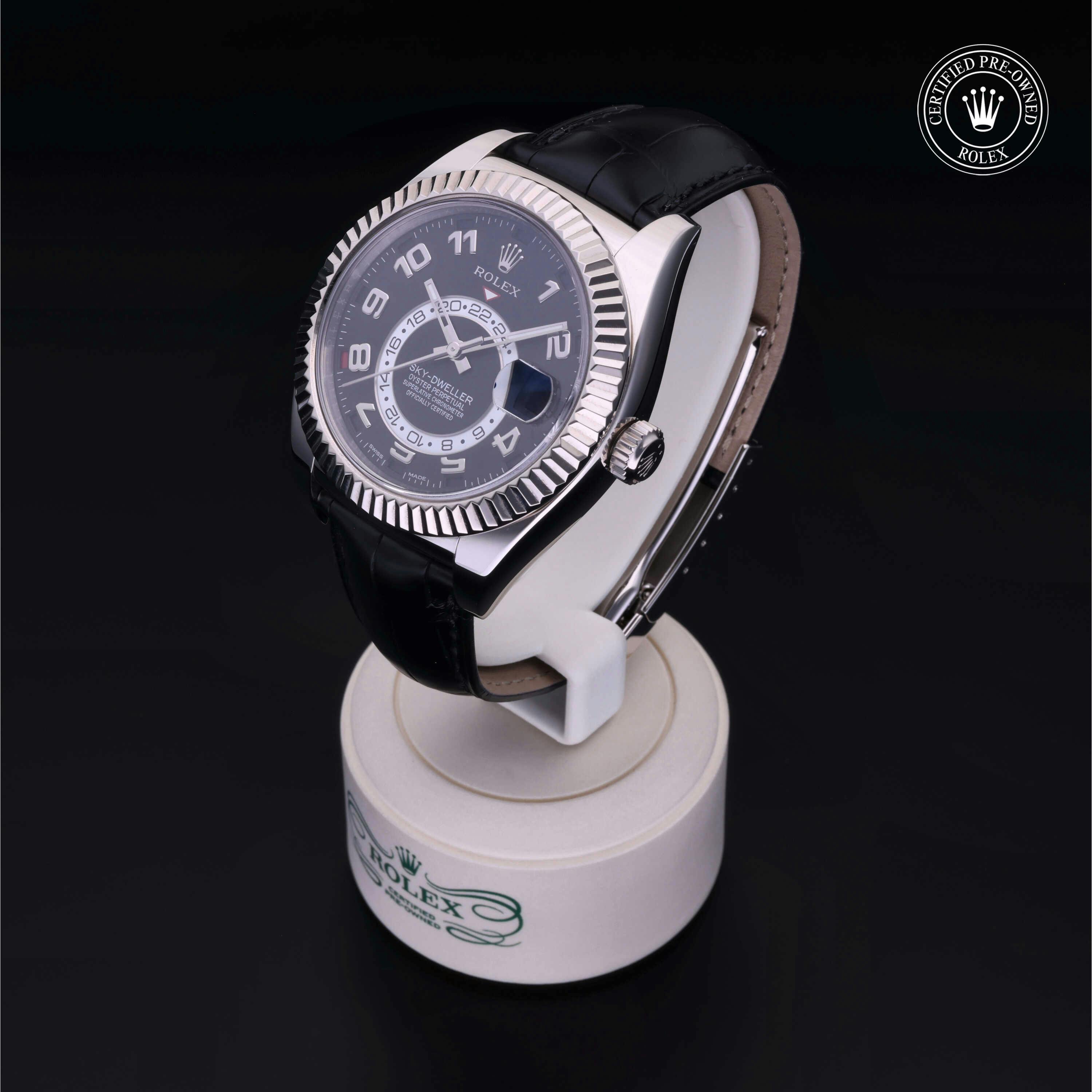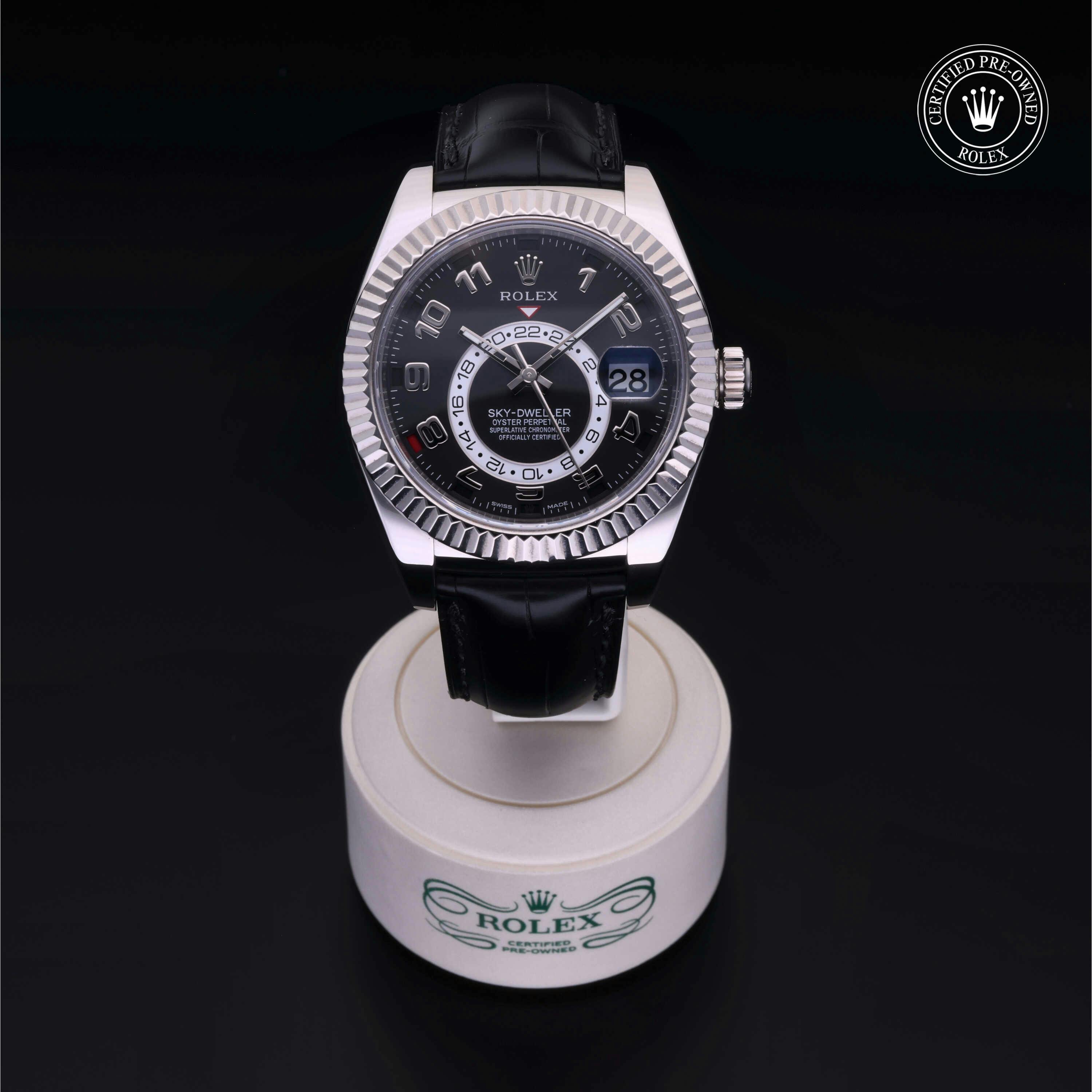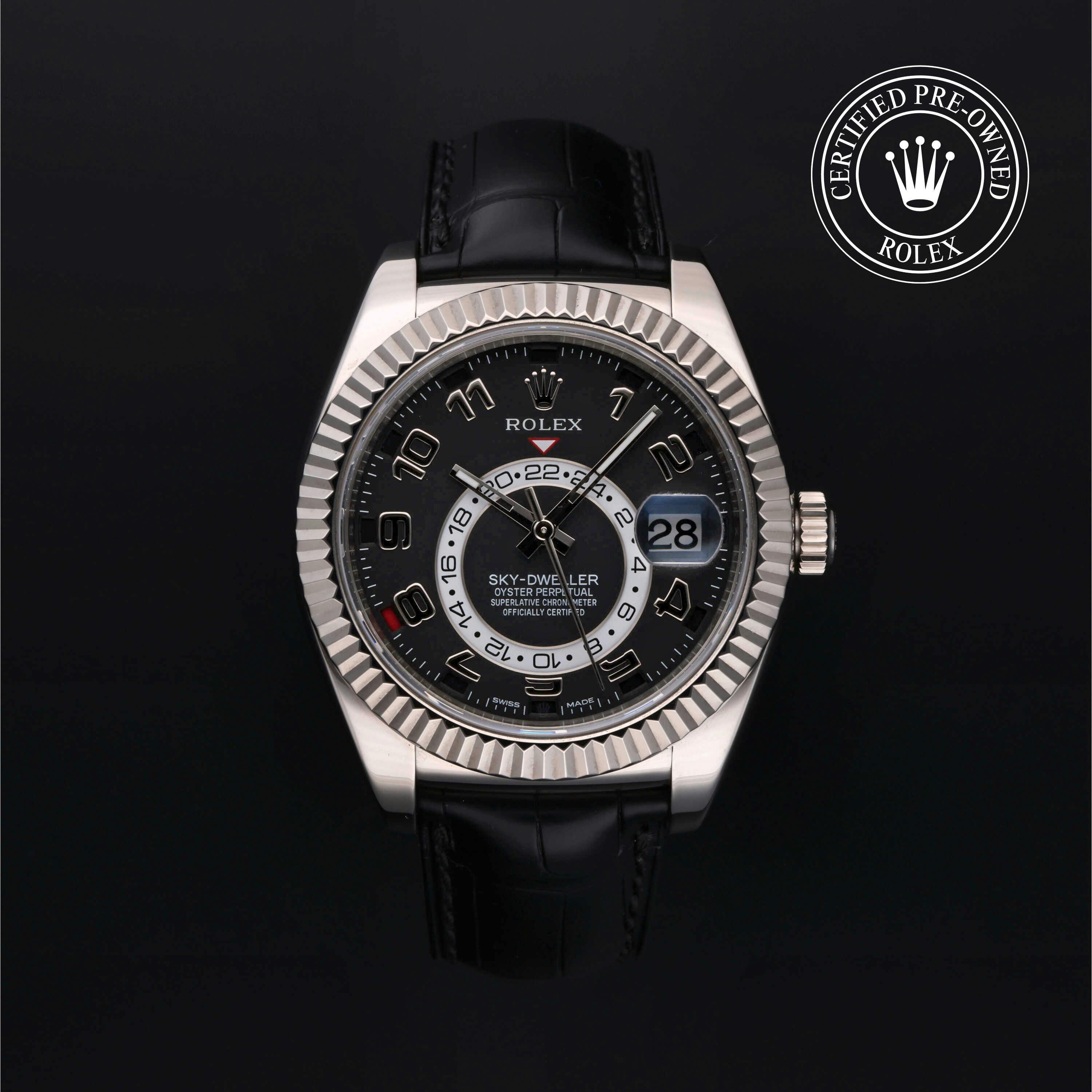 Rolex Certified Pre-Owned Sky-Dweller (326139) self-winding automatic watch, features a 42mm 18k white gold case and fluted bezel surrounding a black dial on a black alligator strap with an 18k white gold deployant buckle. Functions include hours, minutes, seconds, date, annual calendar and month. This watch has received Rolex-authorized service and certification. It comes with the original papers, and includes a custom Rolex Certified Pre-Owned hang tag, travel pouch and RCPO international warranty card.