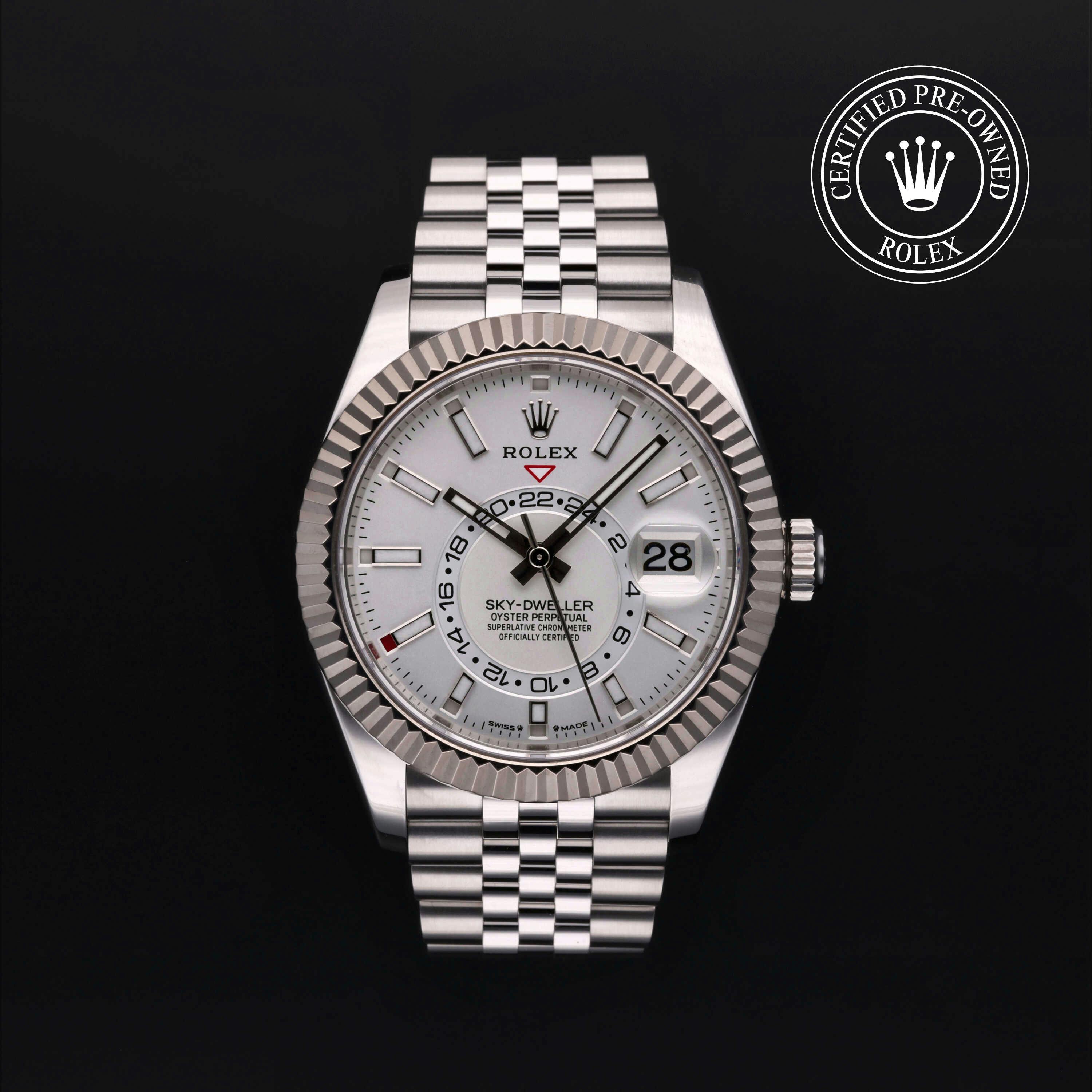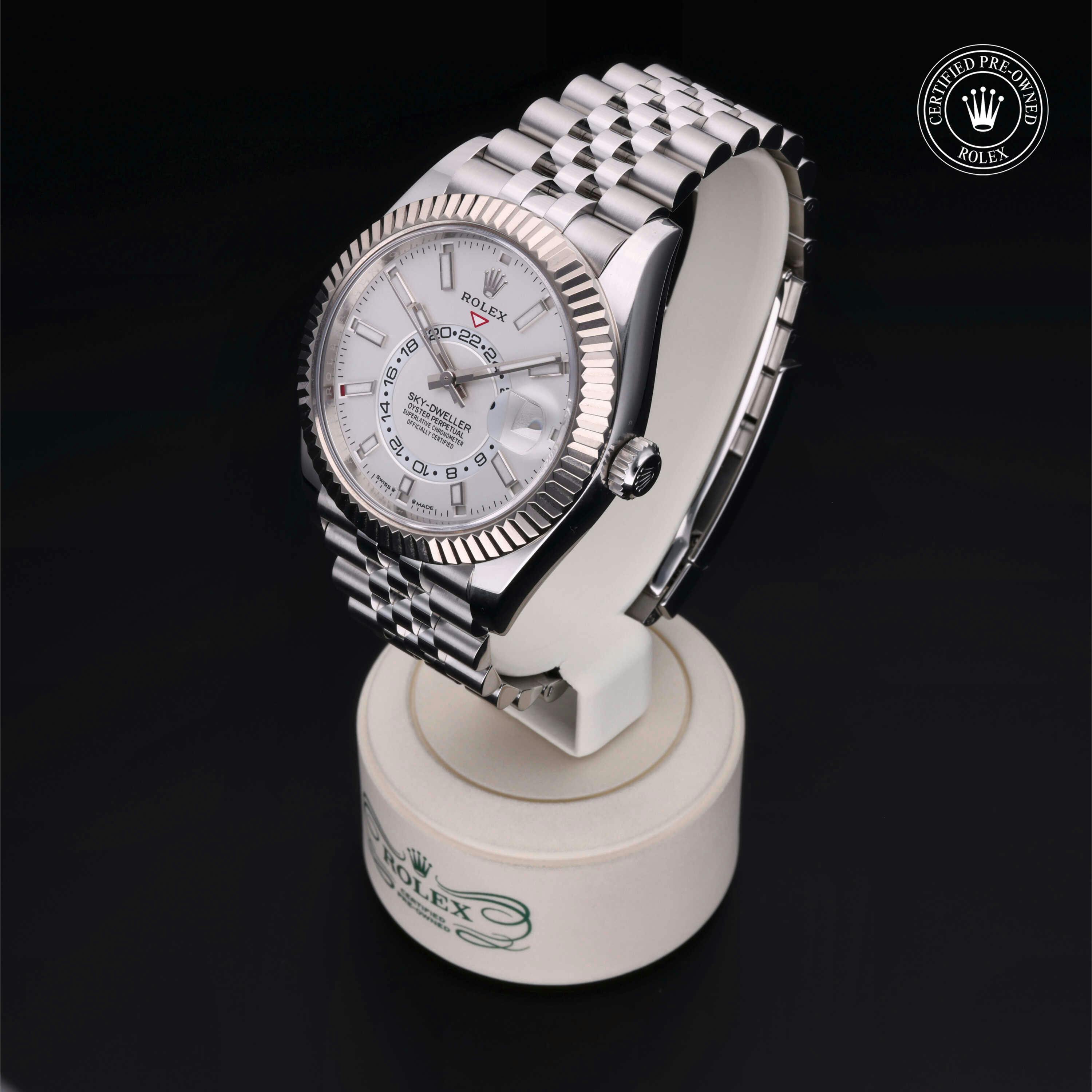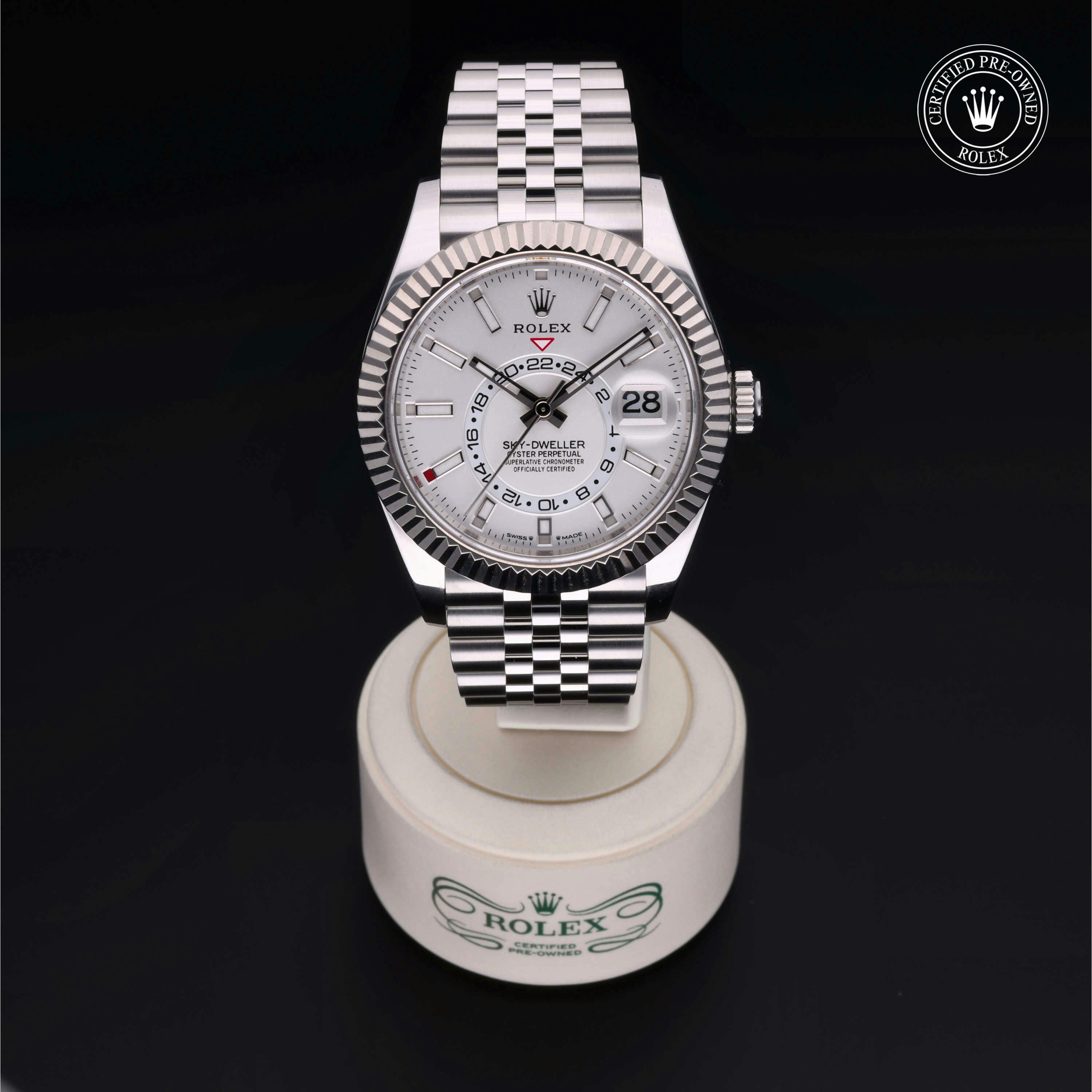 Rolex Certified Pre-Owned Sky-Dweller (336934) self - winding automatic watch, features a 42mm stainless steel case with an 18k white gold fluted bezel surrounding an intense white dial on a stainless steel jubilee bracelet. Functions include hours, minutes, seconds, date, annual calendar, gmt/world time and month. This watch has received Rolex-authorized service and certification. It comes with the original box and papers, and includes a custom Rolex Certified Pre-Owned hang tag, travel pouch and RCPO international warranty card.