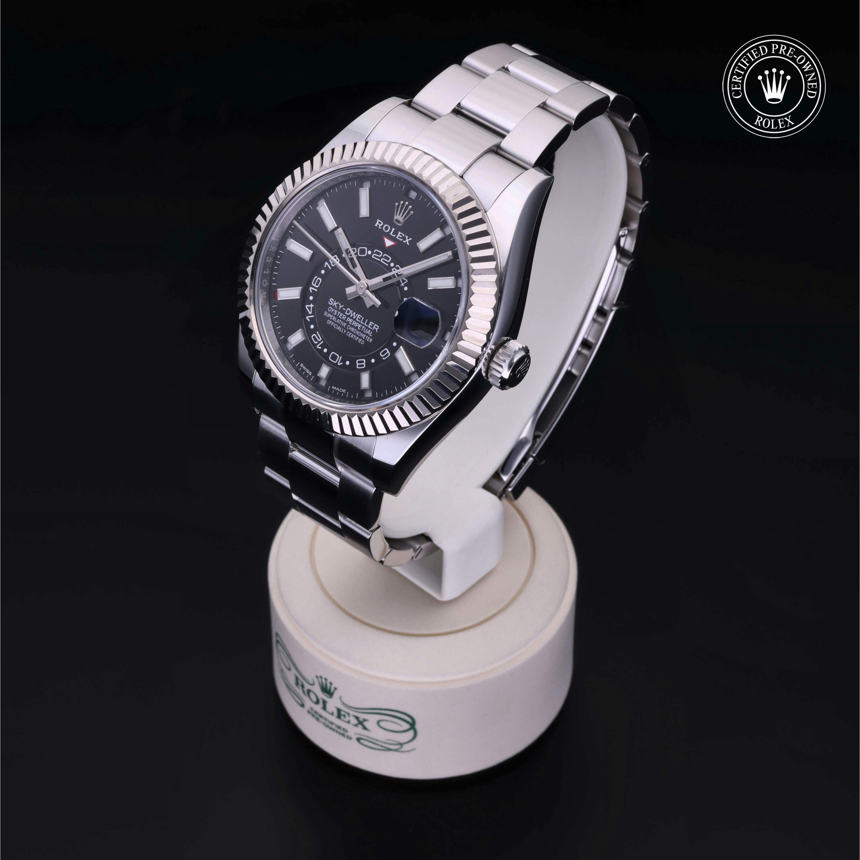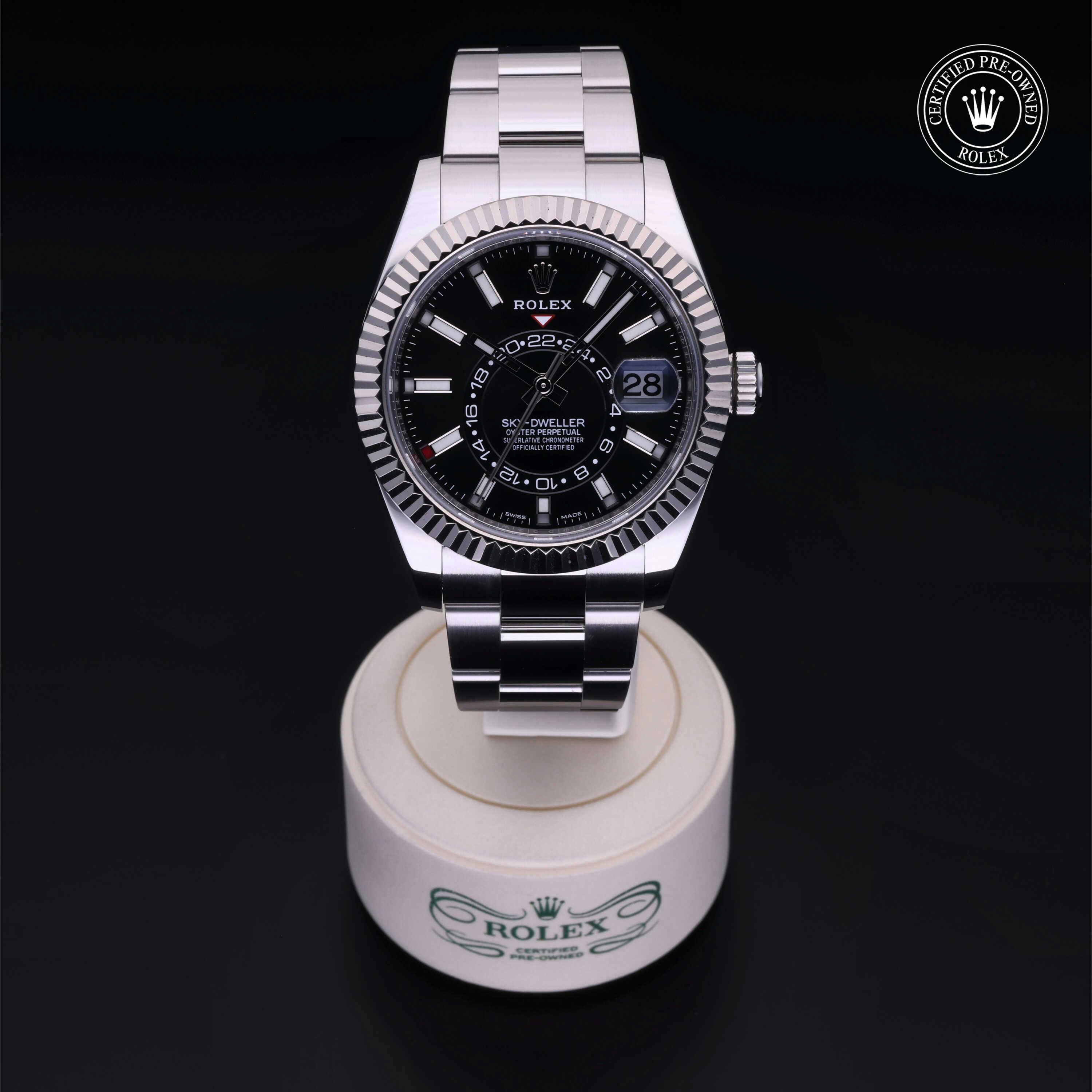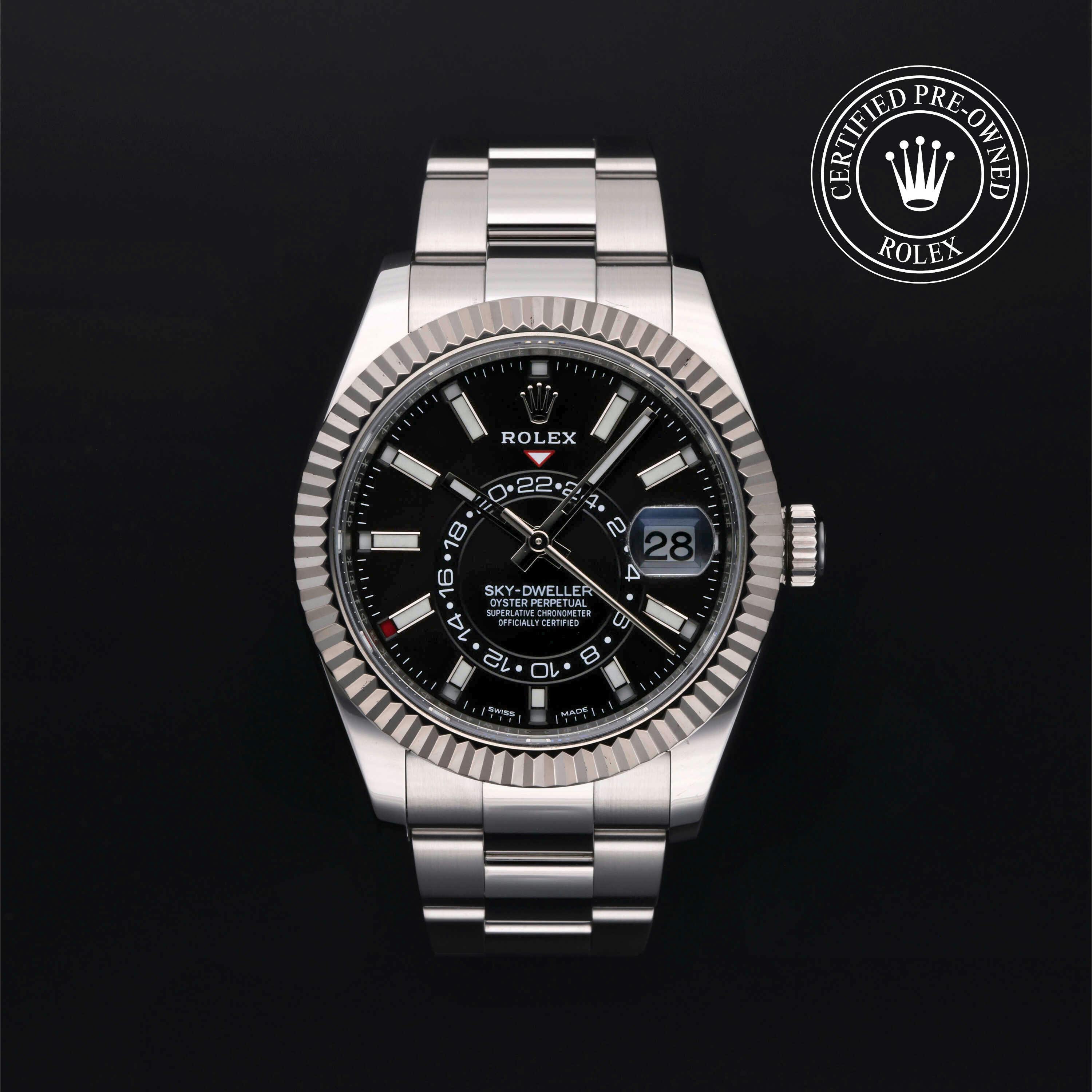 Rolex Certified Pre-Owned Sky-Dweller (326934) self - winding automatic watch, features a 42mm stainless steel case with an 18k white gold fluted bezel surrounding a black dial on a stainless steel oyster bracelet. Functions include hours, minutes, seconds, date, 24-hour indicator, annual calendar, gmt/world time and month. This watch has received Rolex-authorized service and certification. It comes with the original box and papers, and includes a custom Rolex Certified Pre-Owned hang tag, travel pouch and RCPO international warranty card.