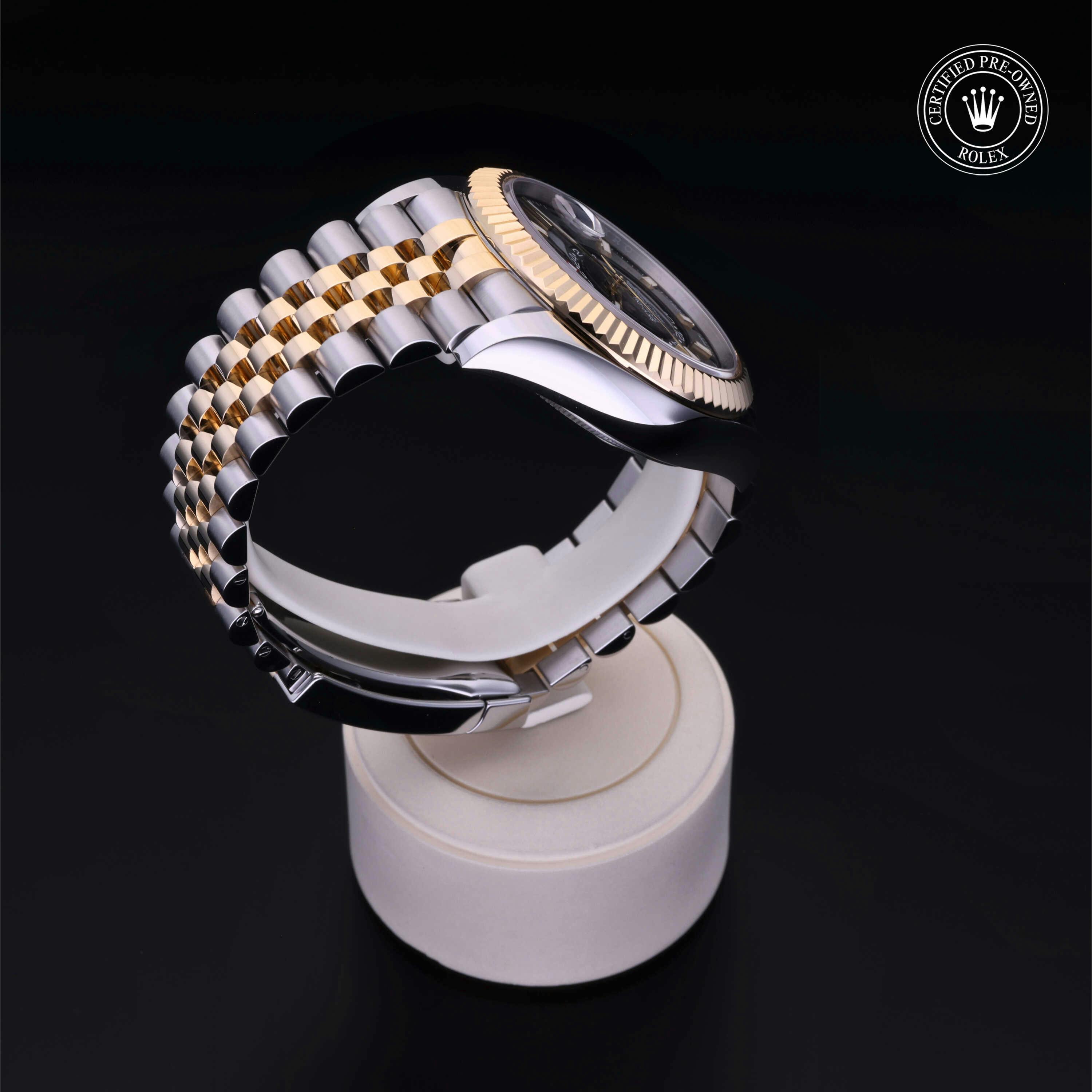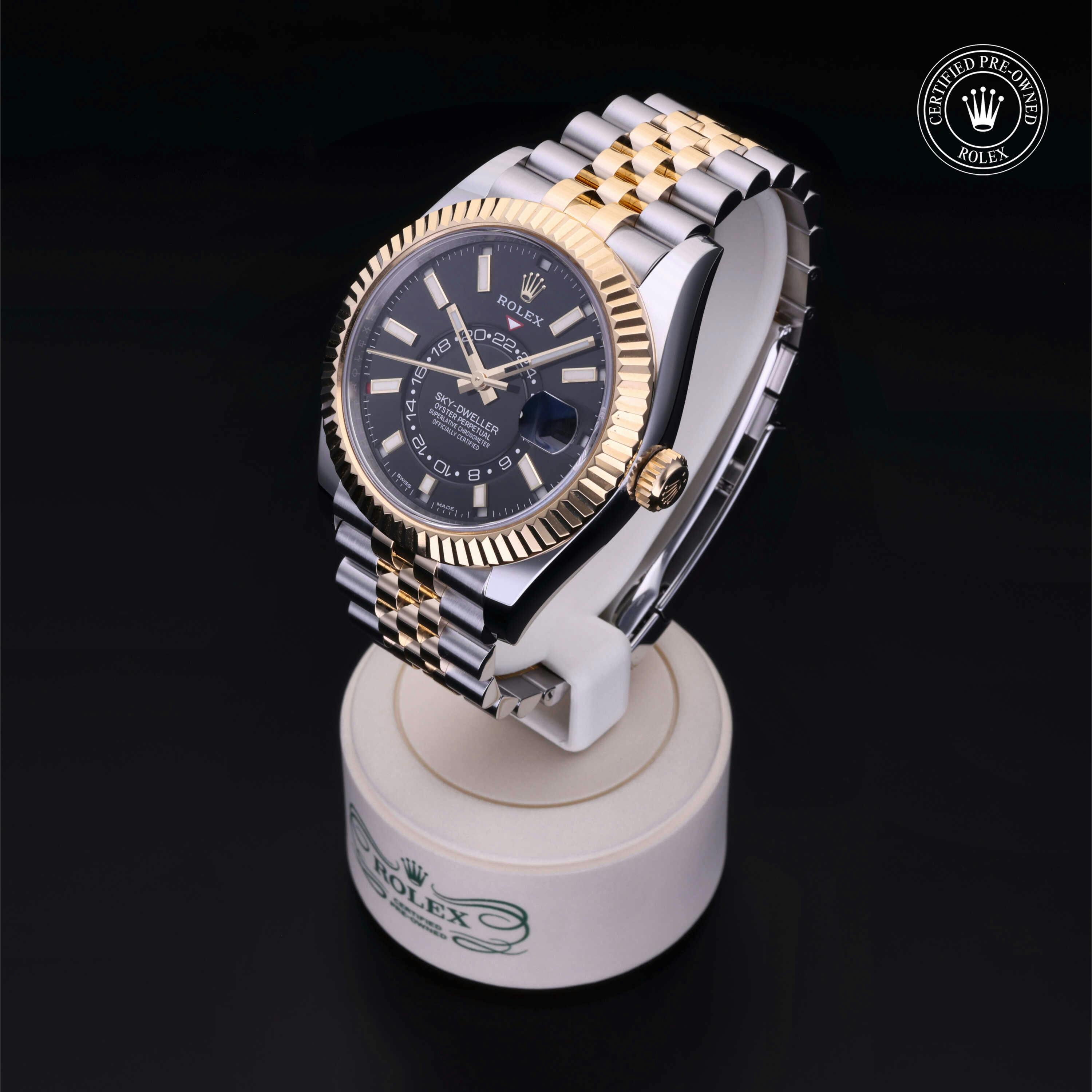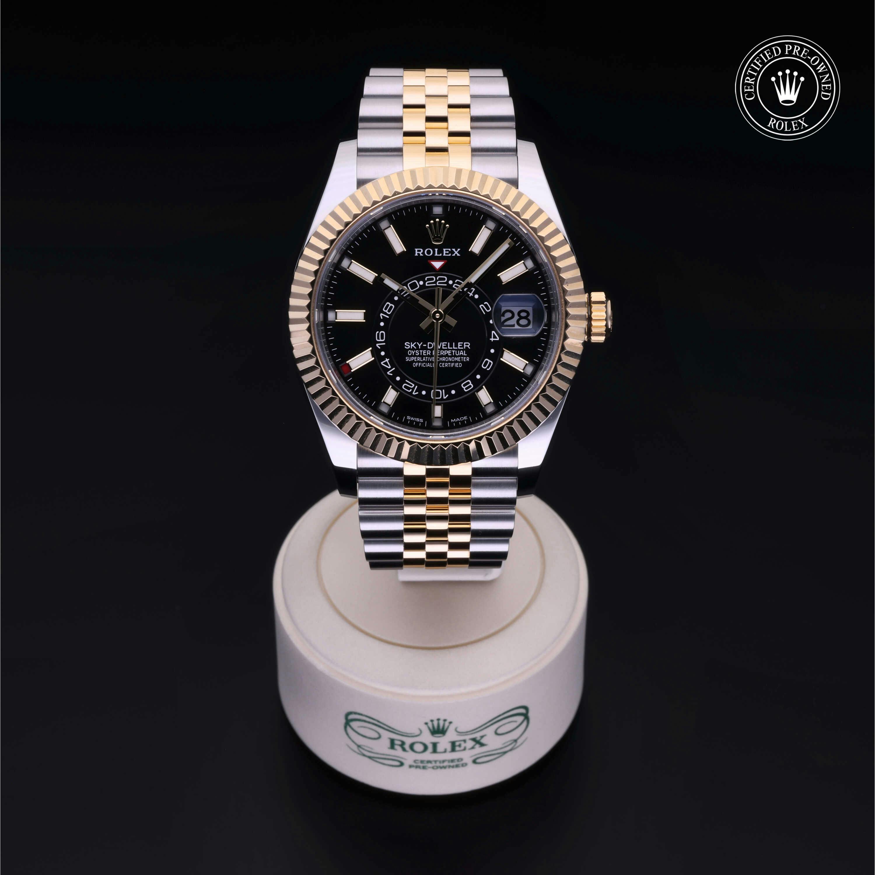 Rolex Certified Pre-Owned Sky-Dweller (326933) self - winding automatic watch, features a 42mm stainless steel case and an 18k yellow gold fluted bezel surrounding a black index dial. Watch is secured on a stainless steel and 18k yellow gold Jubilee bracelet complete with a folding buckle. Functions include hours, minutes, seconds, date, month, 24-hour indicator and annual calendar. This watch has received Rolex-authorized service and certified by Rolex. It comes with the original box and papers, and includes a custom Rolex Certified Pre-Owned hang tag, travel pouch and international warranty card.