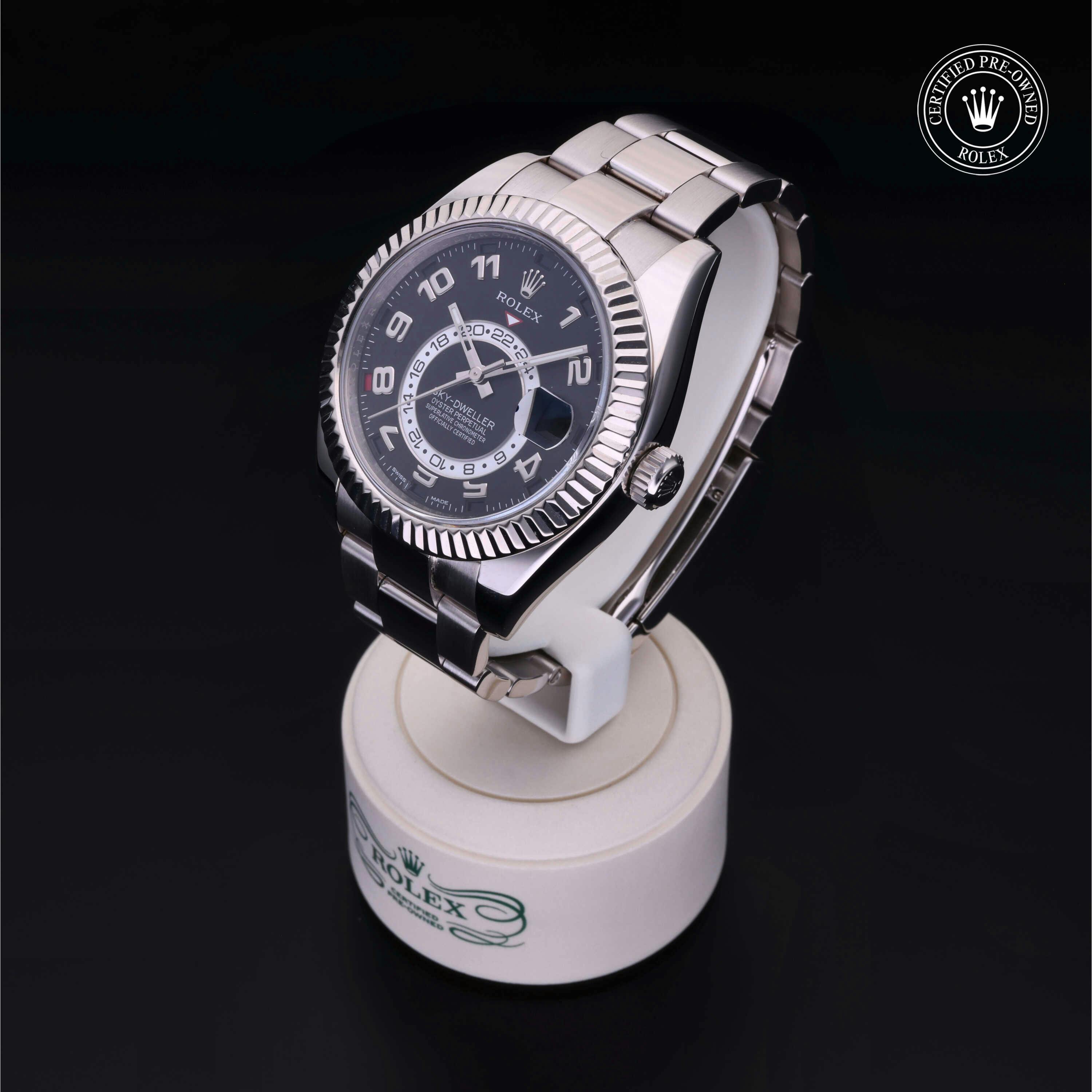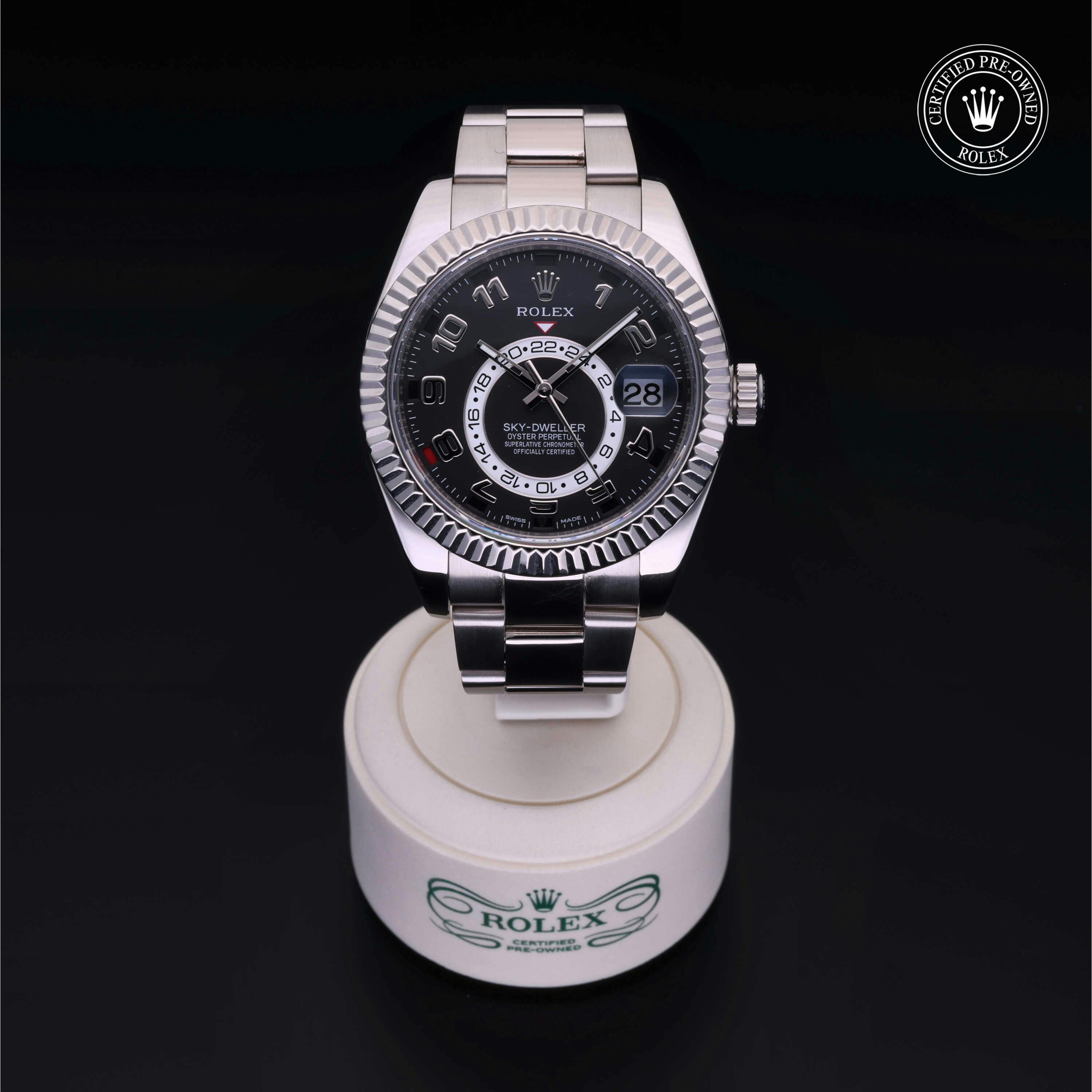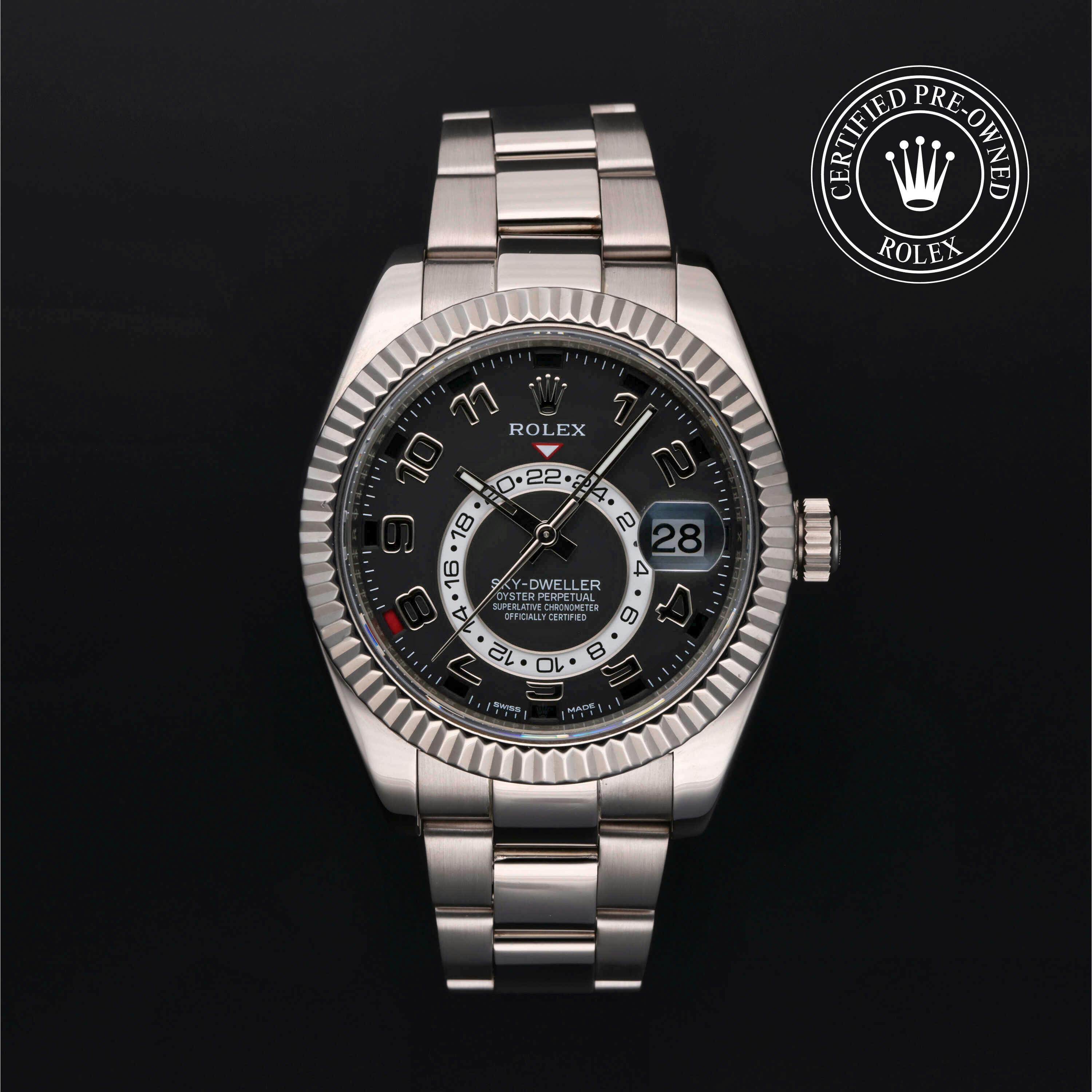 Rolex Certified Pre-Owned Sky-Dweller (326939) self - winding automatic watch, features a 42mm 18k white gold case and fluted bezel surrounding a black dial on an 18k white gold oyster bracelet. Functions include hours, minutes, seconds, date, annual calendar, gmt/world time and month. This watch has received Rolex-authorized service and certification. It does not come with the original box or papers, but includes a custom Rolex Certified Pre-Owned hang tag, travel pouch and RCPO international warranty card.