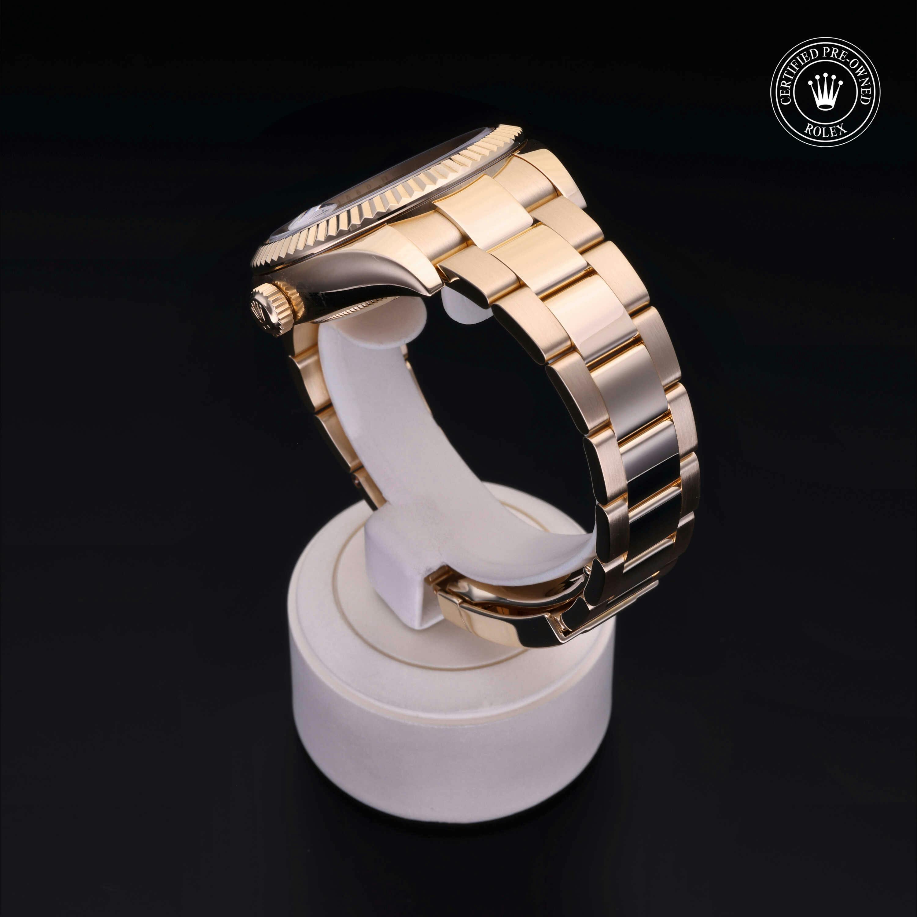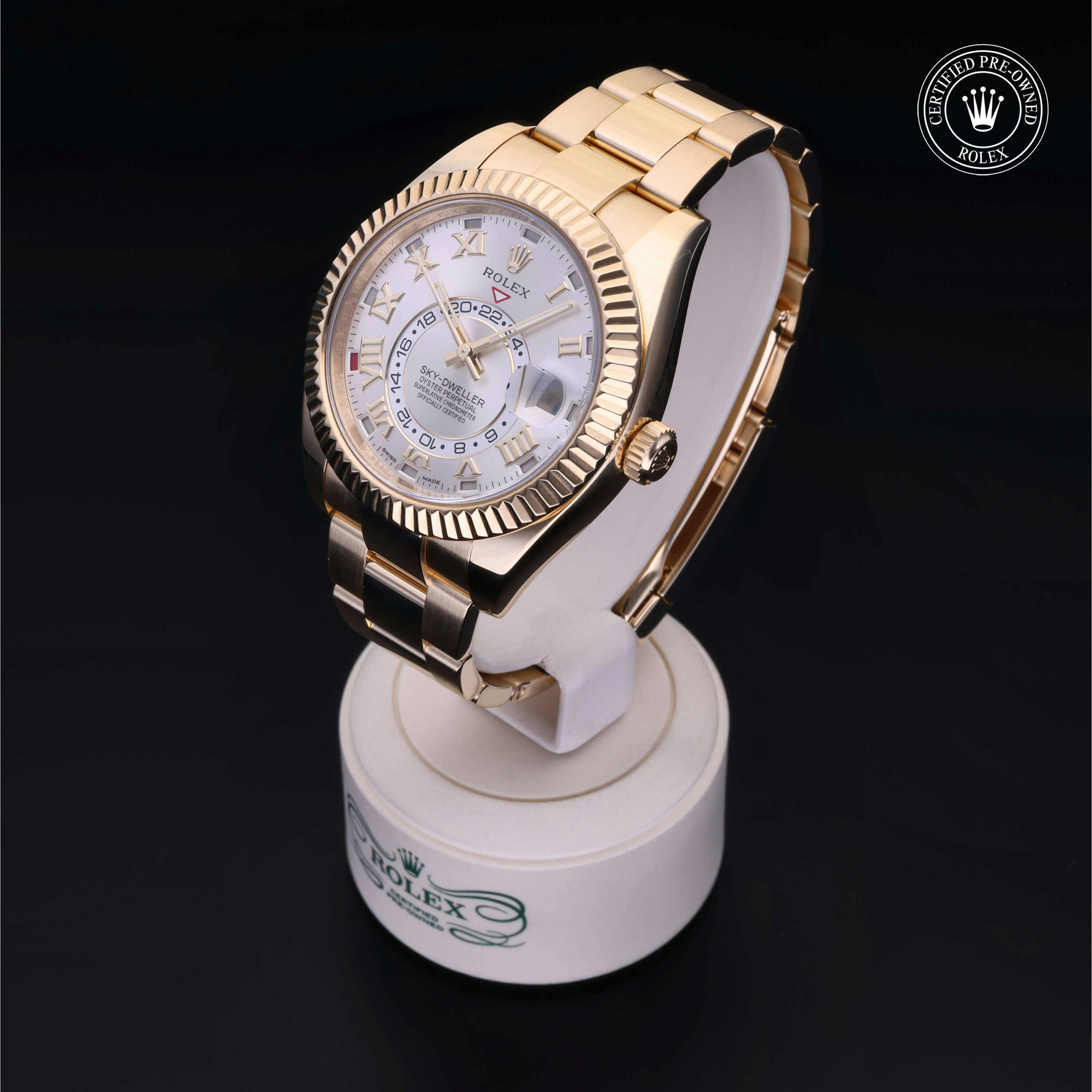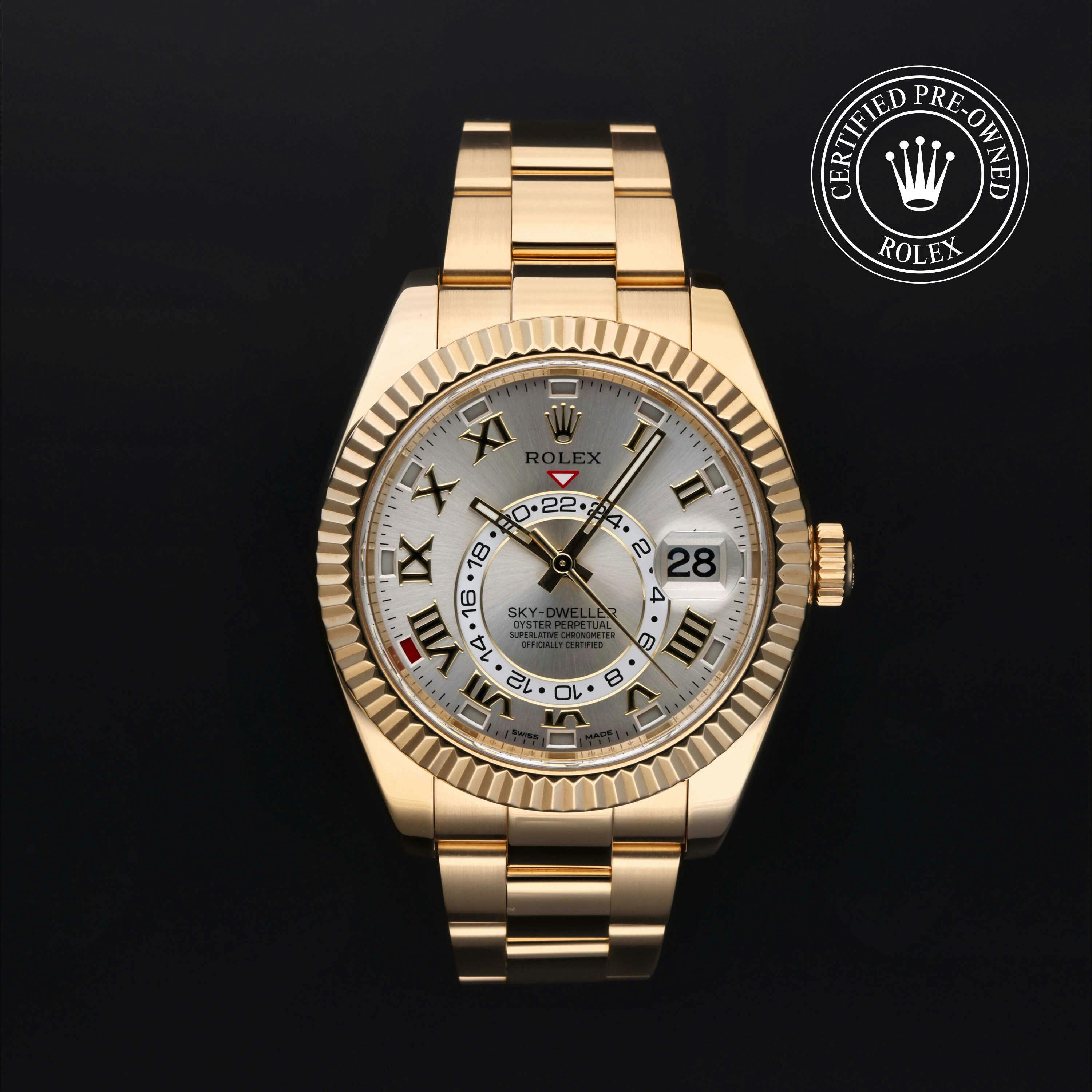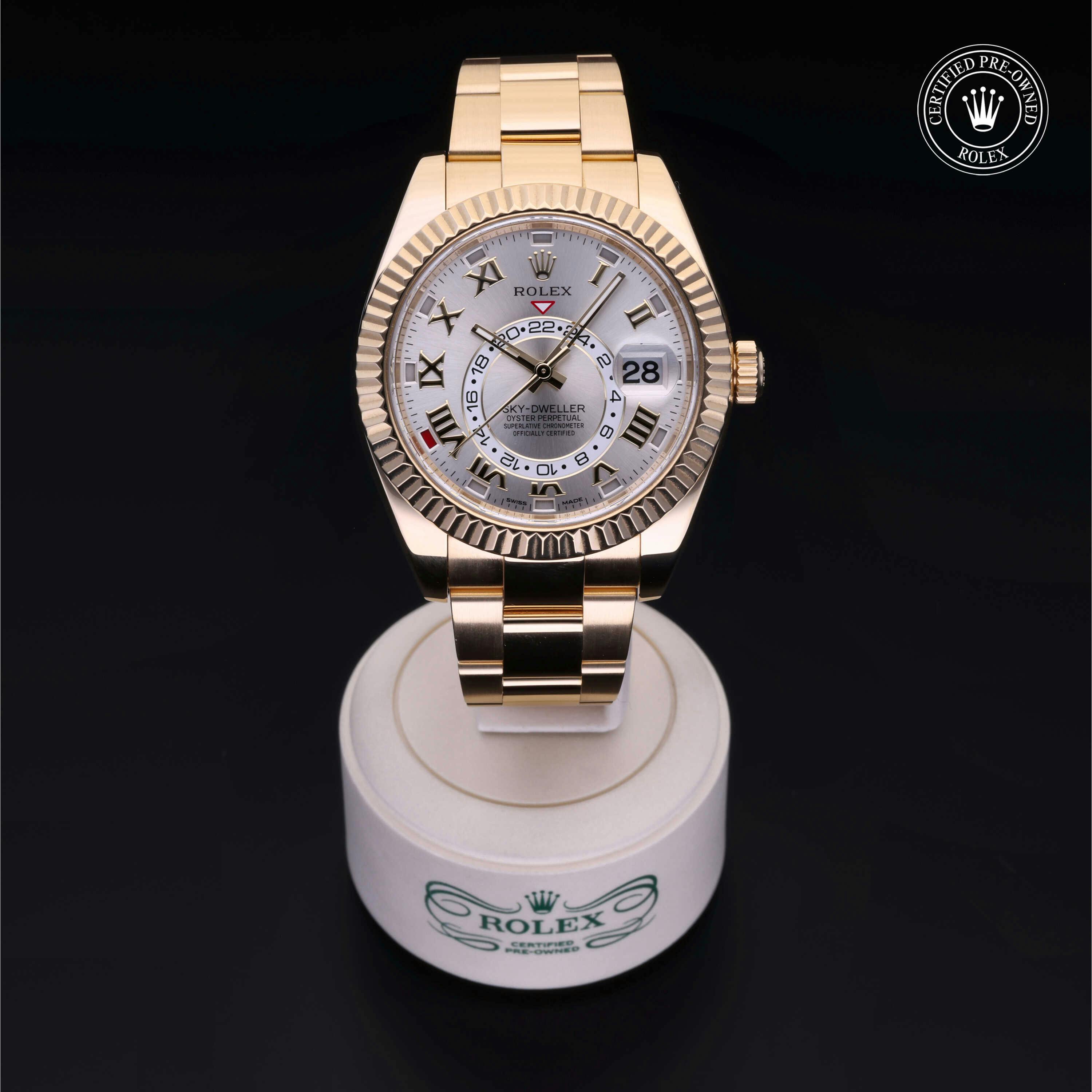 Rolex Certified Pre-Owned Sky-Dweller (326938) self - winding automatic watch, features a 42mm 18k yellow gold case and fluted bezel surrounding a silver dial on an 18k yellow gold oyster bracelet. Functions include hours, minutes, seconds, date, annual calendar and month. This watch has received Rolex-authorized service and certification. It does not come with the original box or papers, but includes a custom Rolex Certified Pre-Owned hang tag, travel pouch and RCPO international warranty card.