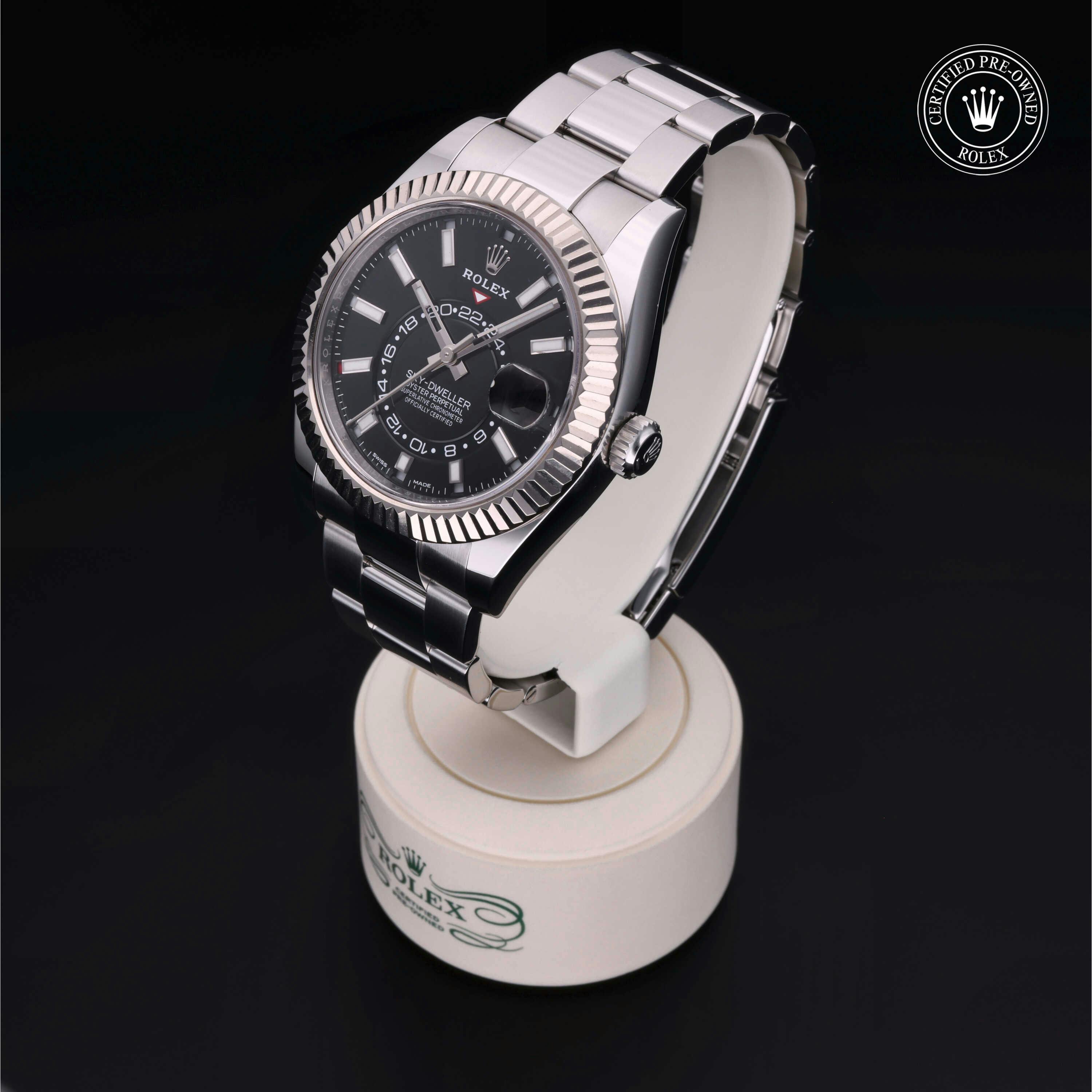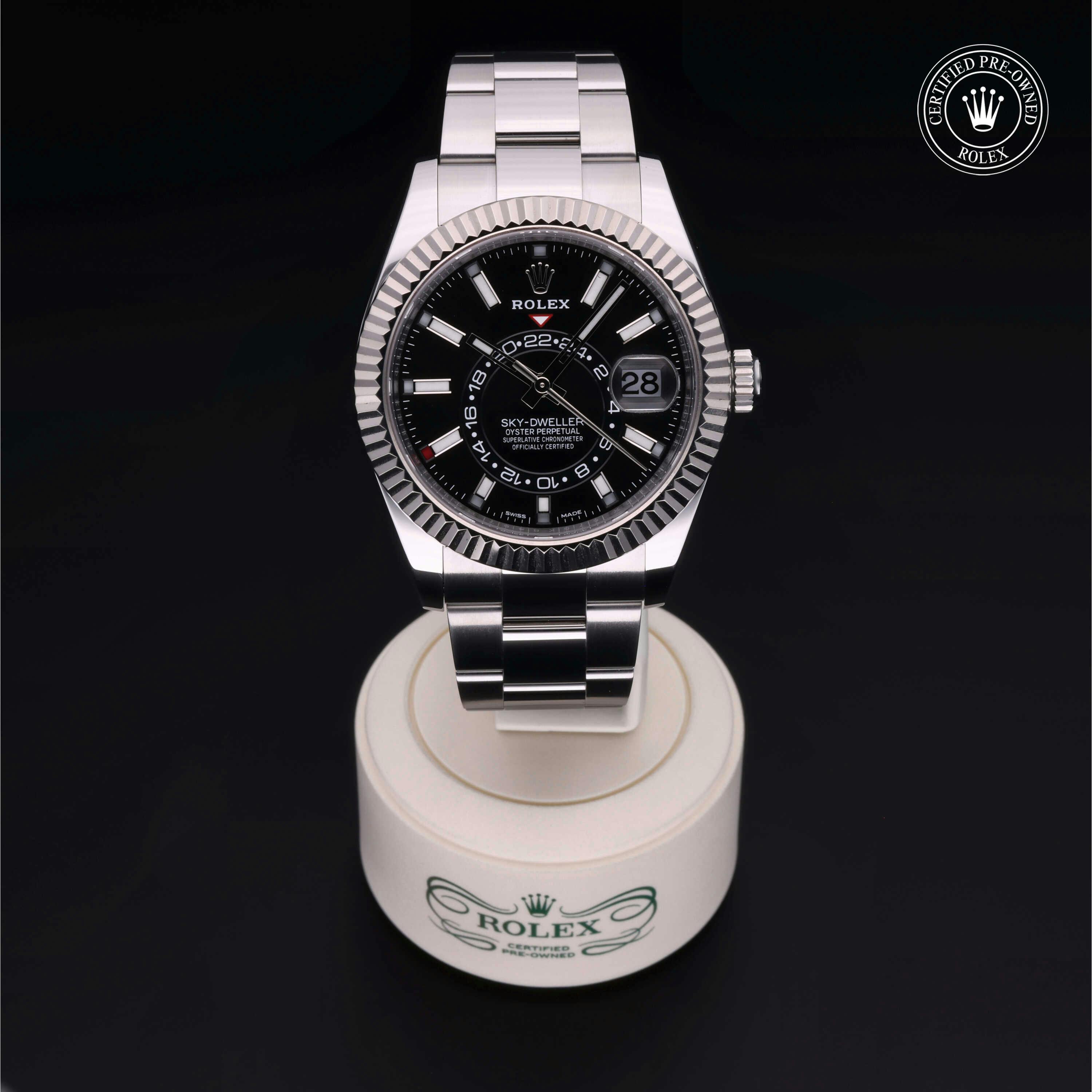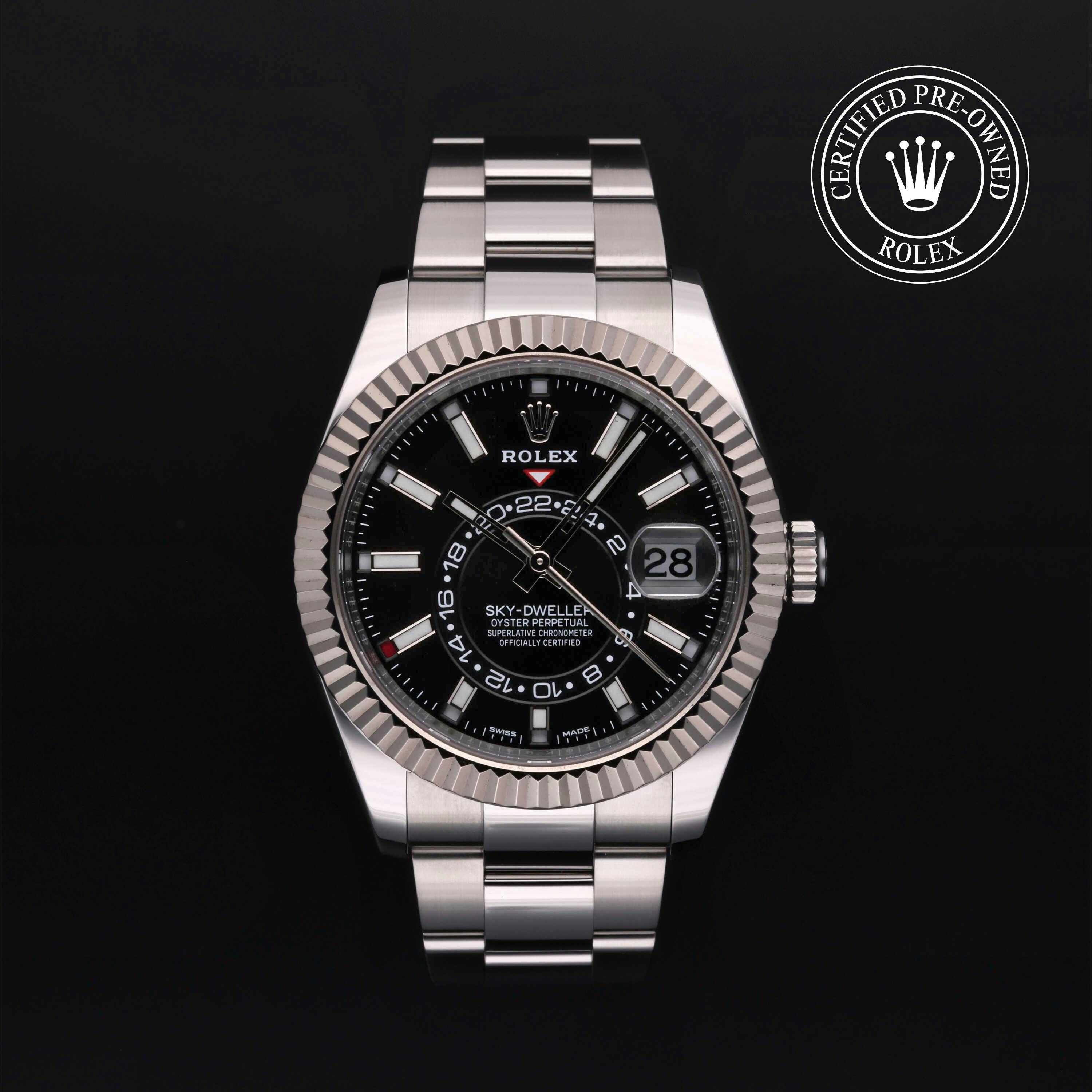 Rolex Certified Pre-Owned Sky-Dweller (326934) self - winding automatic watch, features a 42mm stainless steel case with an 18k white gold fluted bezel surrounding a black dial on a stainless steel oyster bracelet. Functions include hours, minutes, seconds, date, 24-hour indicator, annual calendar, gmt/world time and month. This watch has received Rolex-authorized service and certification. It comes with the original box and papers, and includes a custom Rolex Certified Pre-Owned hang tag, travel pouch and RCPO international warranty card.
