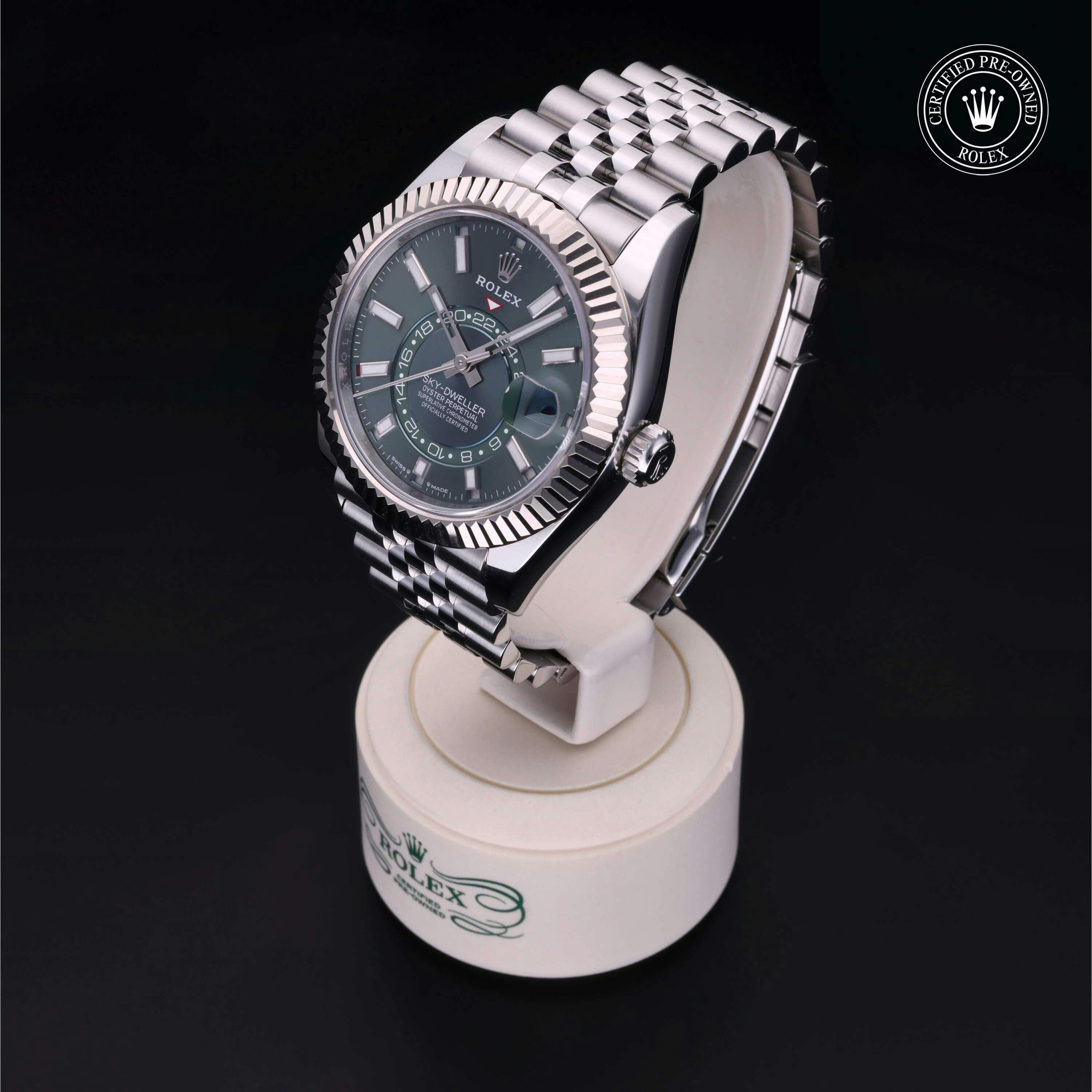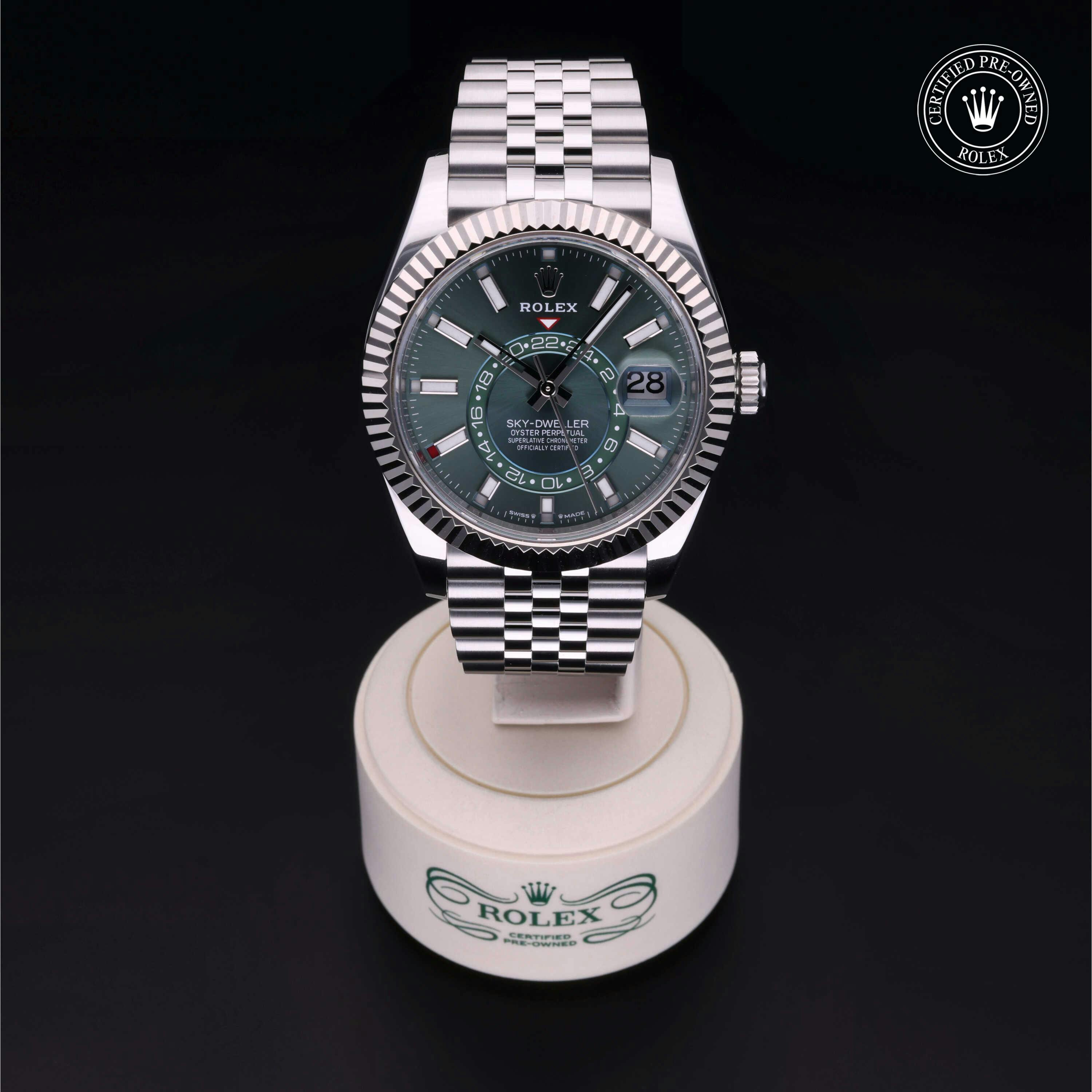 Rolex Certified Pre-Owned Sky-Dweller (336934) self - winding automatic watch, features a 42mm stainless steel case with an 18k white gold fluted bezel surrounding a mint green dial on a stainless steel jubilee bracelet. Functions include hours, minutes, seconds, date, annual calendar, gmt/world time and month. This watch has received Rolex-authorized service and certification. It comes with the original box and papers, and includes a custom Rolex Certified Pre-Owned hang tag, travel pouch and RCPO international warranty card.