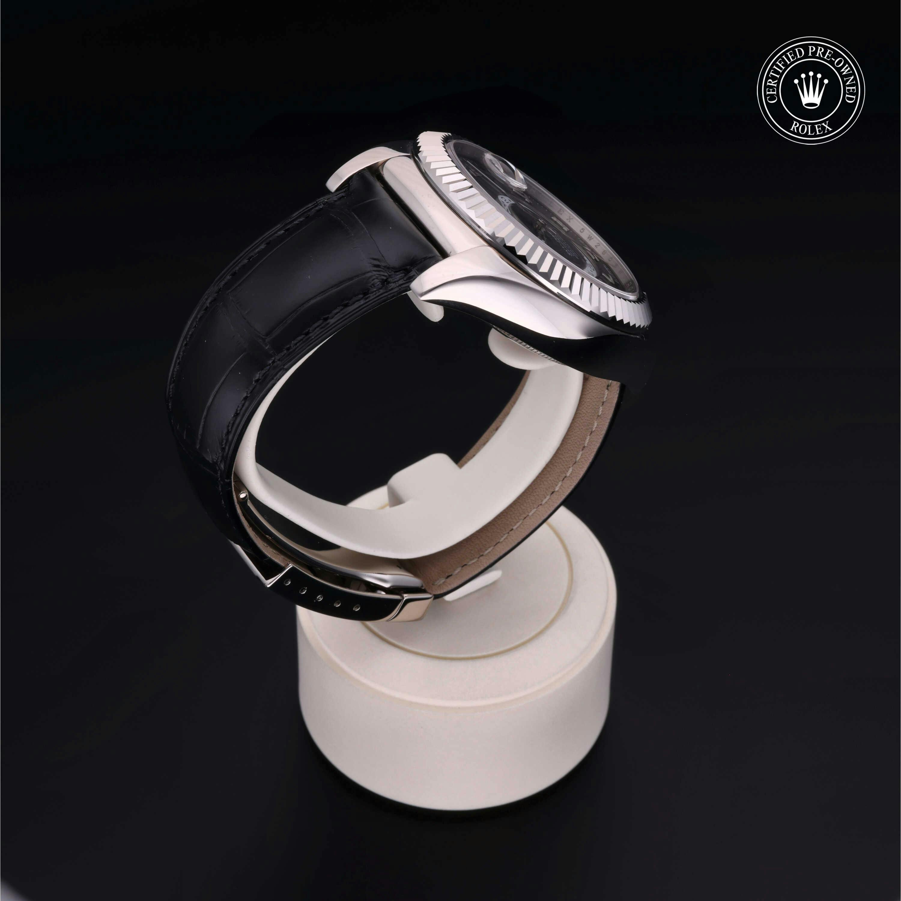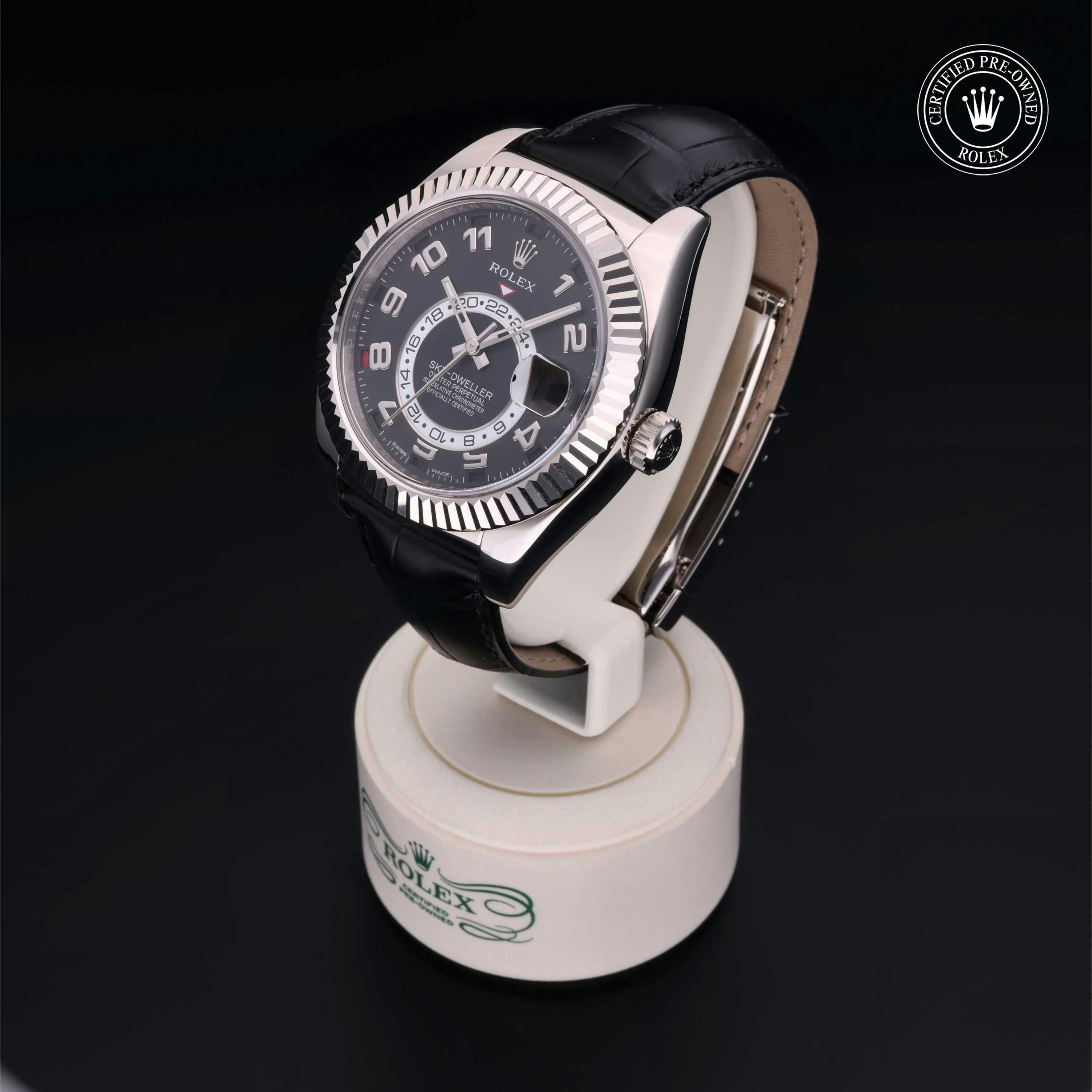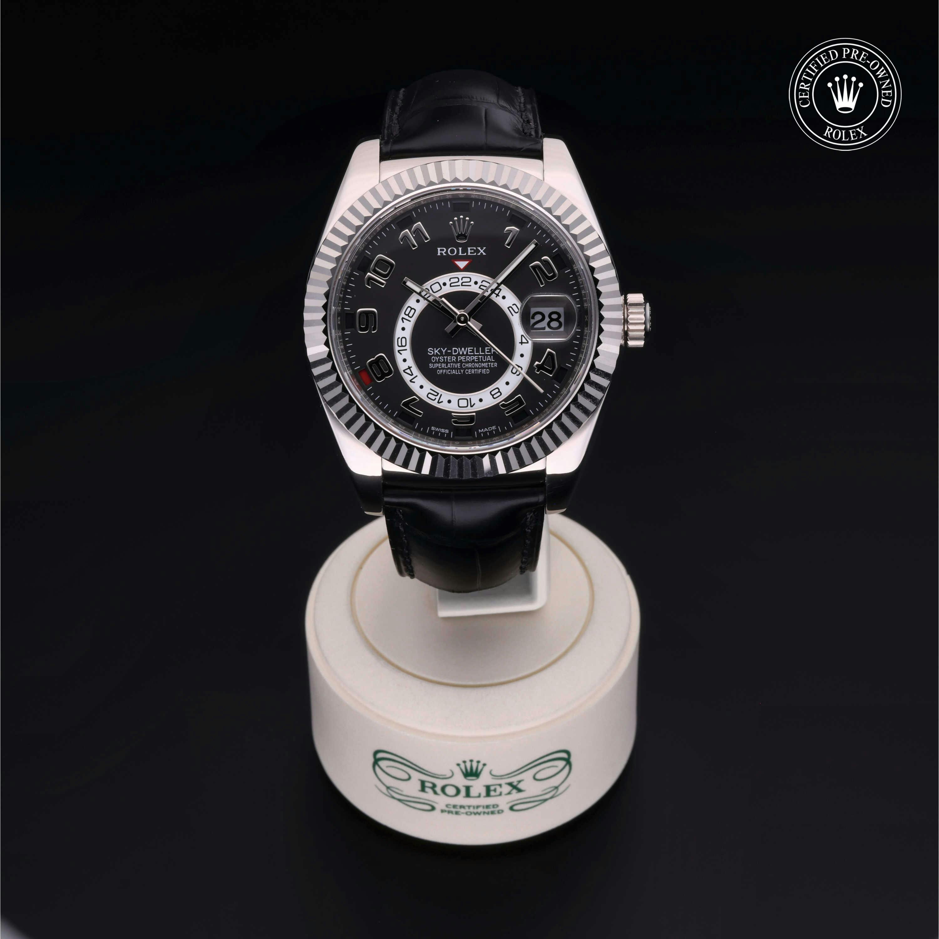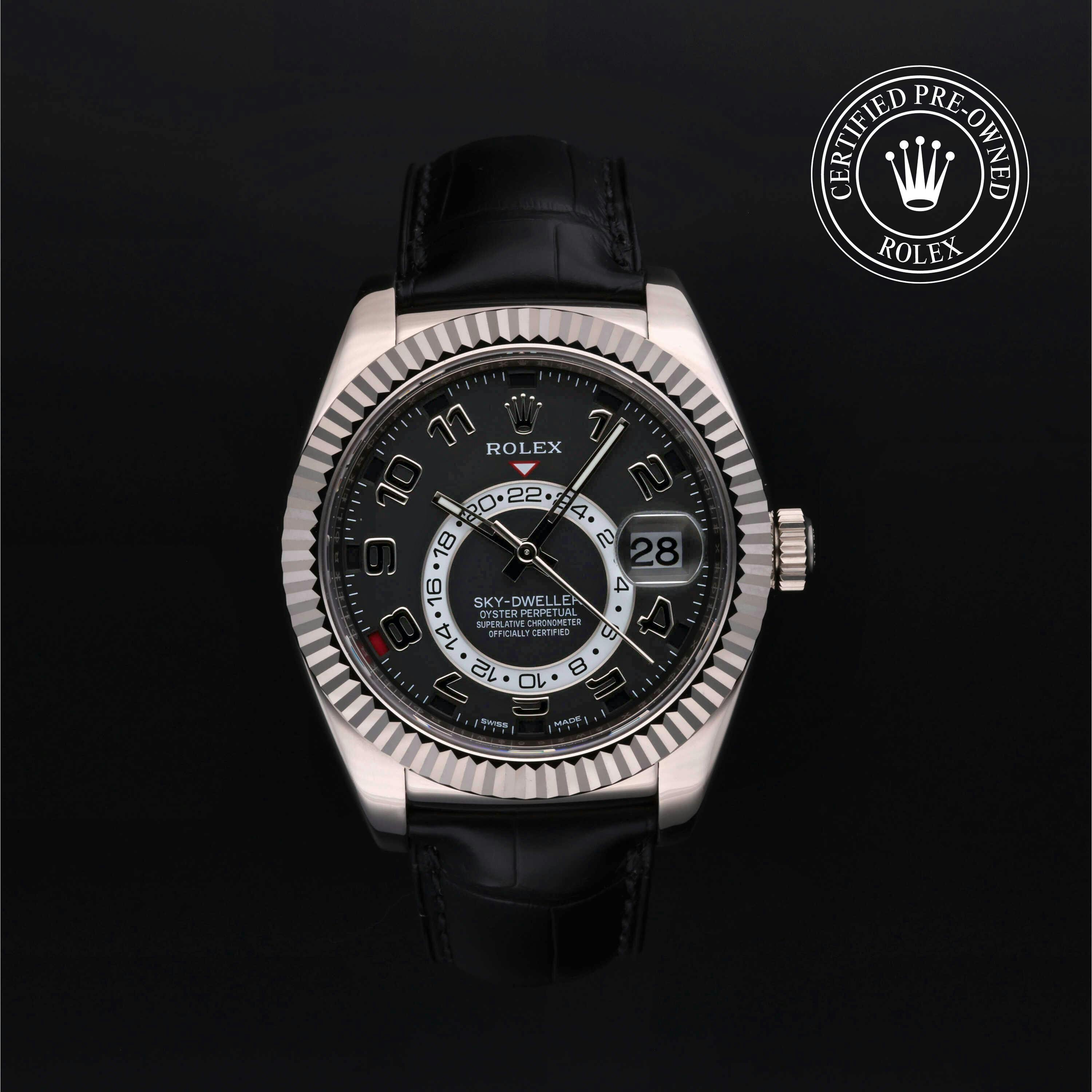 Rolex Certified Pre-Owned Sky-Dweller (326139) self - winding automatic watch, features a 42mm 18k white gold case and fluted bezel surrounding a black dial on a black alligator strap with an 18k white gold deployant buckle. Functions include hours, minutes, seconds, date, annual calendar and month. This watch has received Rolex-authorized service and certification. It does not come with the original box or papers, but includes a custom Rolex Certified Pre-Owned hang tag, travel pouch and RCPO international warranty card.