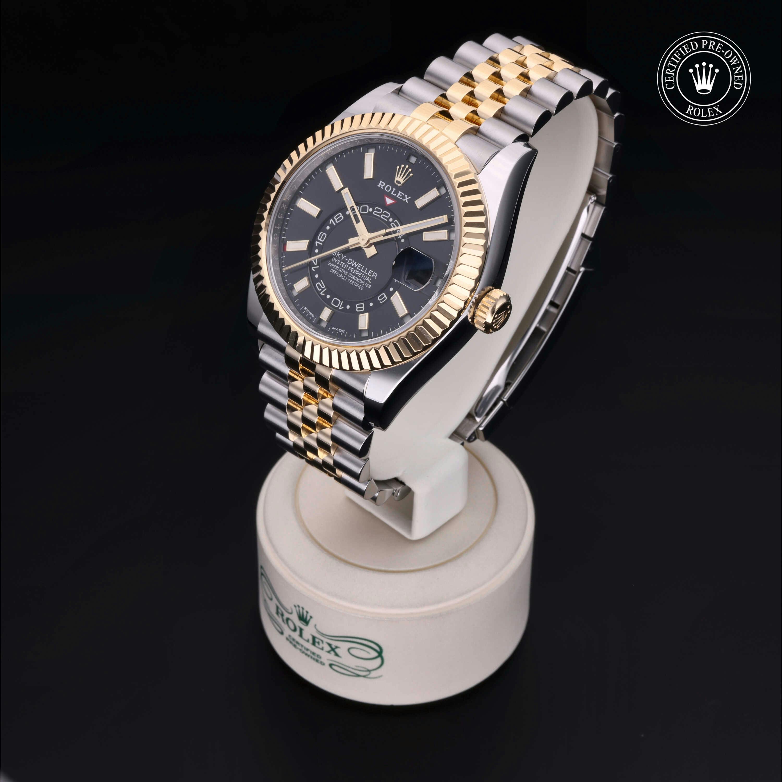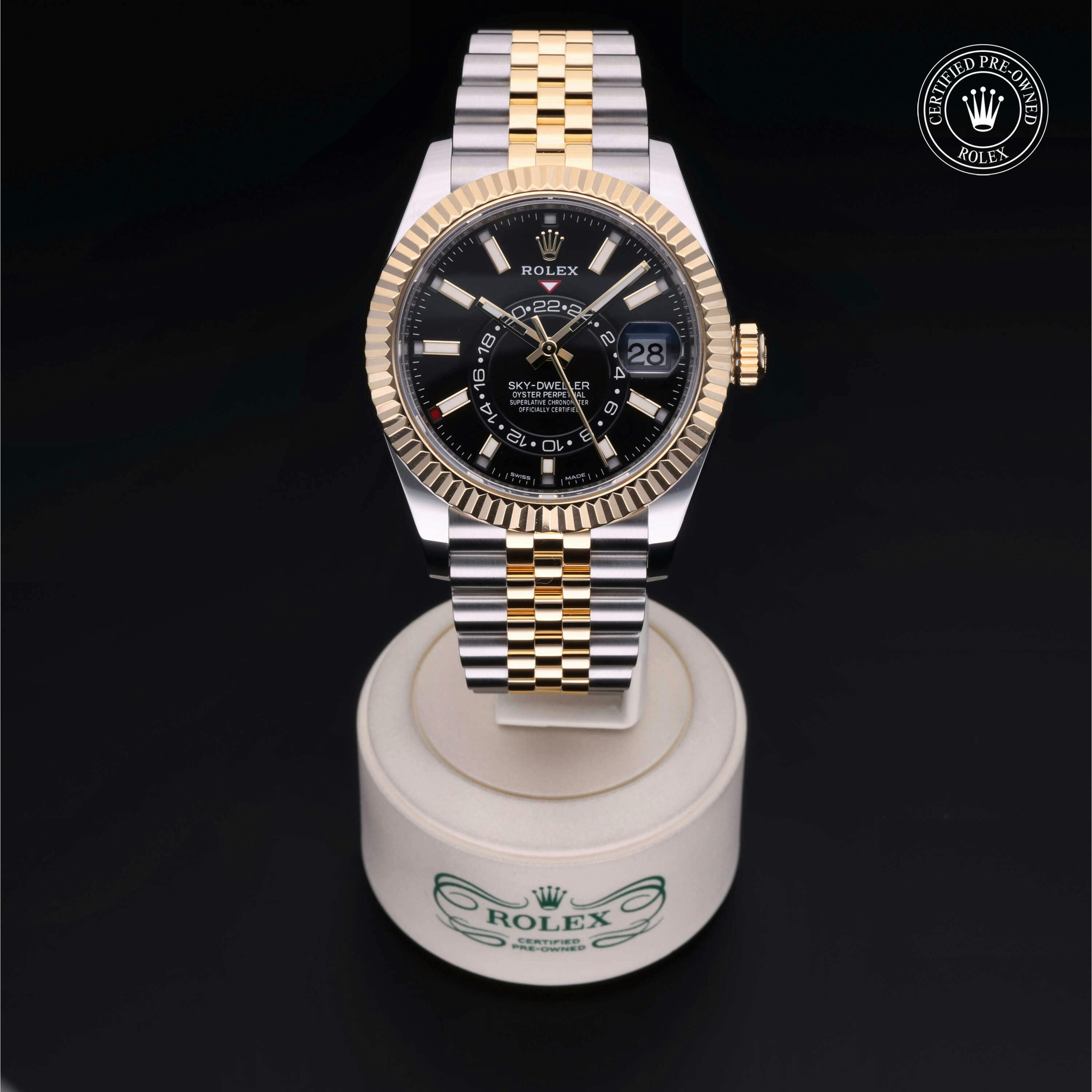 Rolex Certified Pre-Owned Sky-Dweller (326933) self - winding automatic watch, features a 42mm stainless steel case with an 18k yellow gold fluted bezel surrounding a black index dial. The watch is secured on a stainless steel and 18k yellow gold Jubilee bracelet complete with a folding buckle. Functions include hours, minutes, seconds, date, month, 24-hour indicator, annual calendar and gmt/world time. This watch has been serviced by an authorized service center and certified by Rolex. It comes with the original papers and includes a custom Rolex Certified Pre-Owned hang tag, travel pouch and international warranty card.