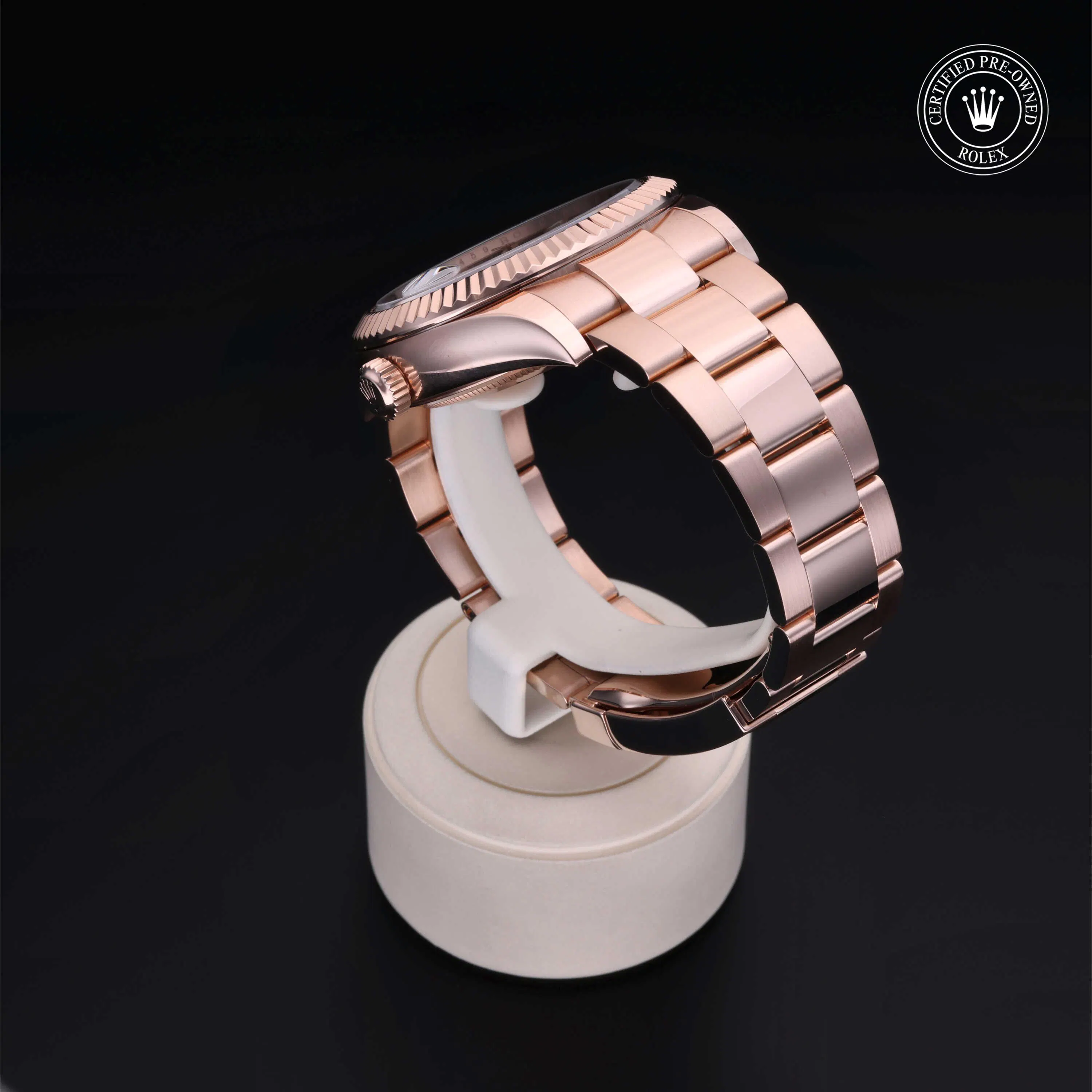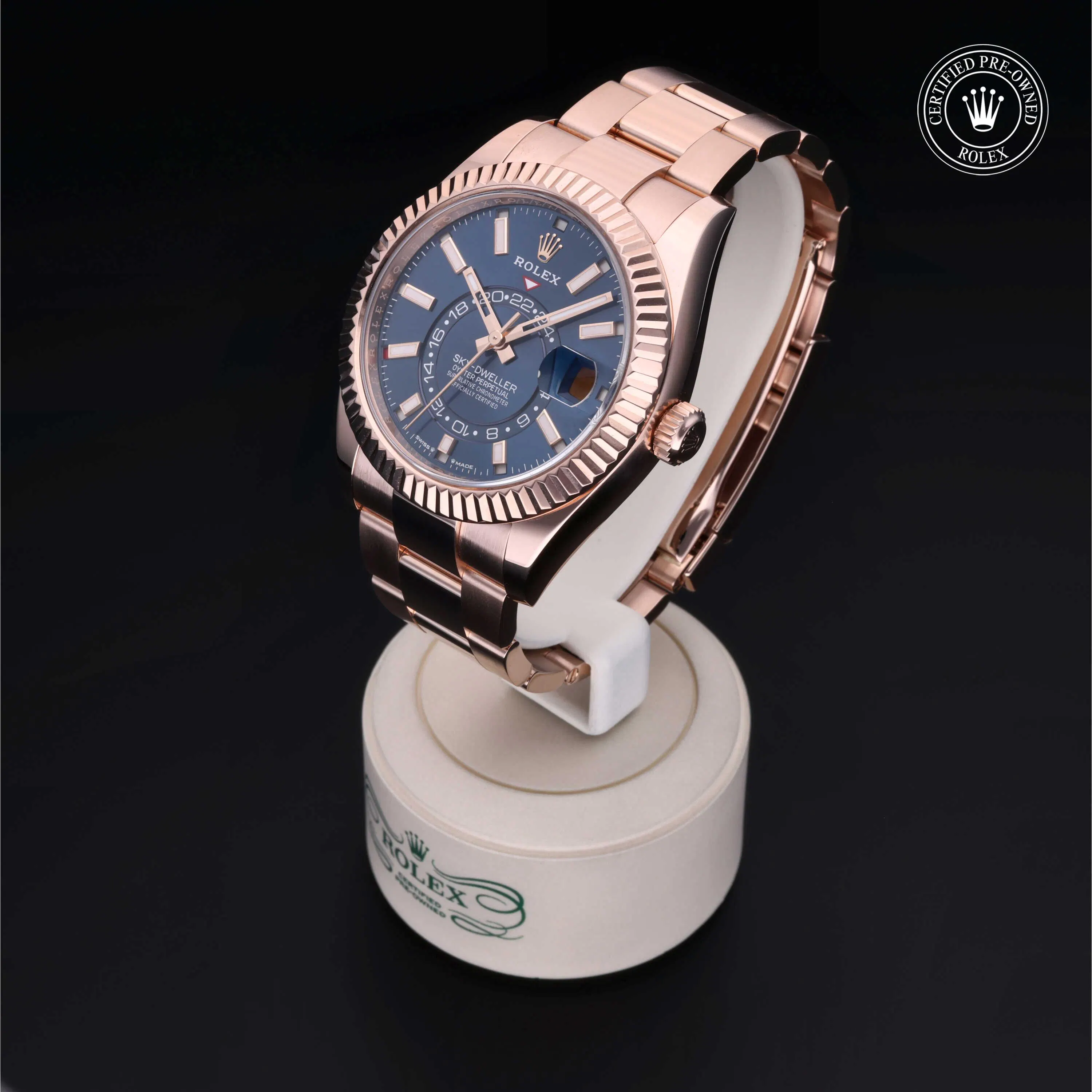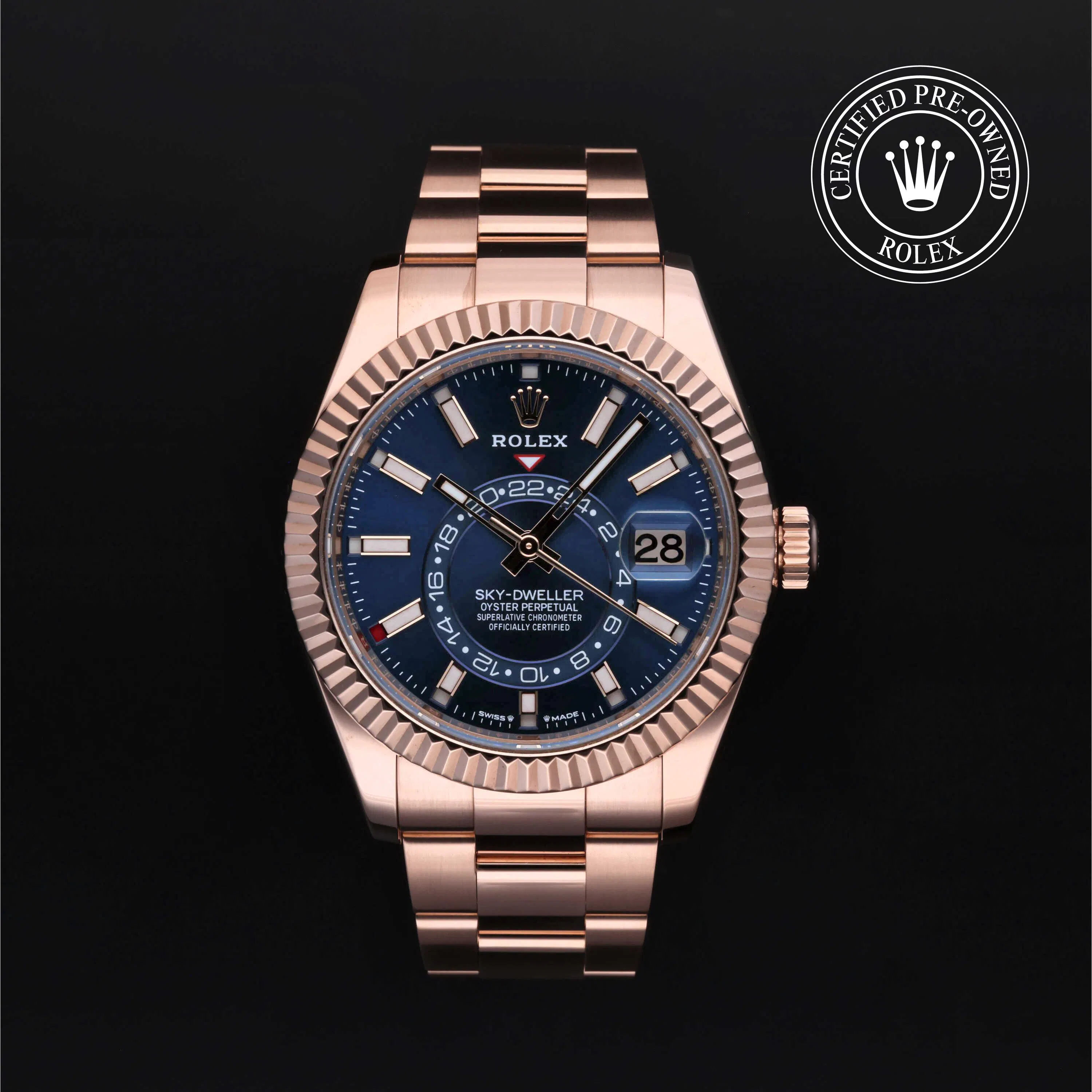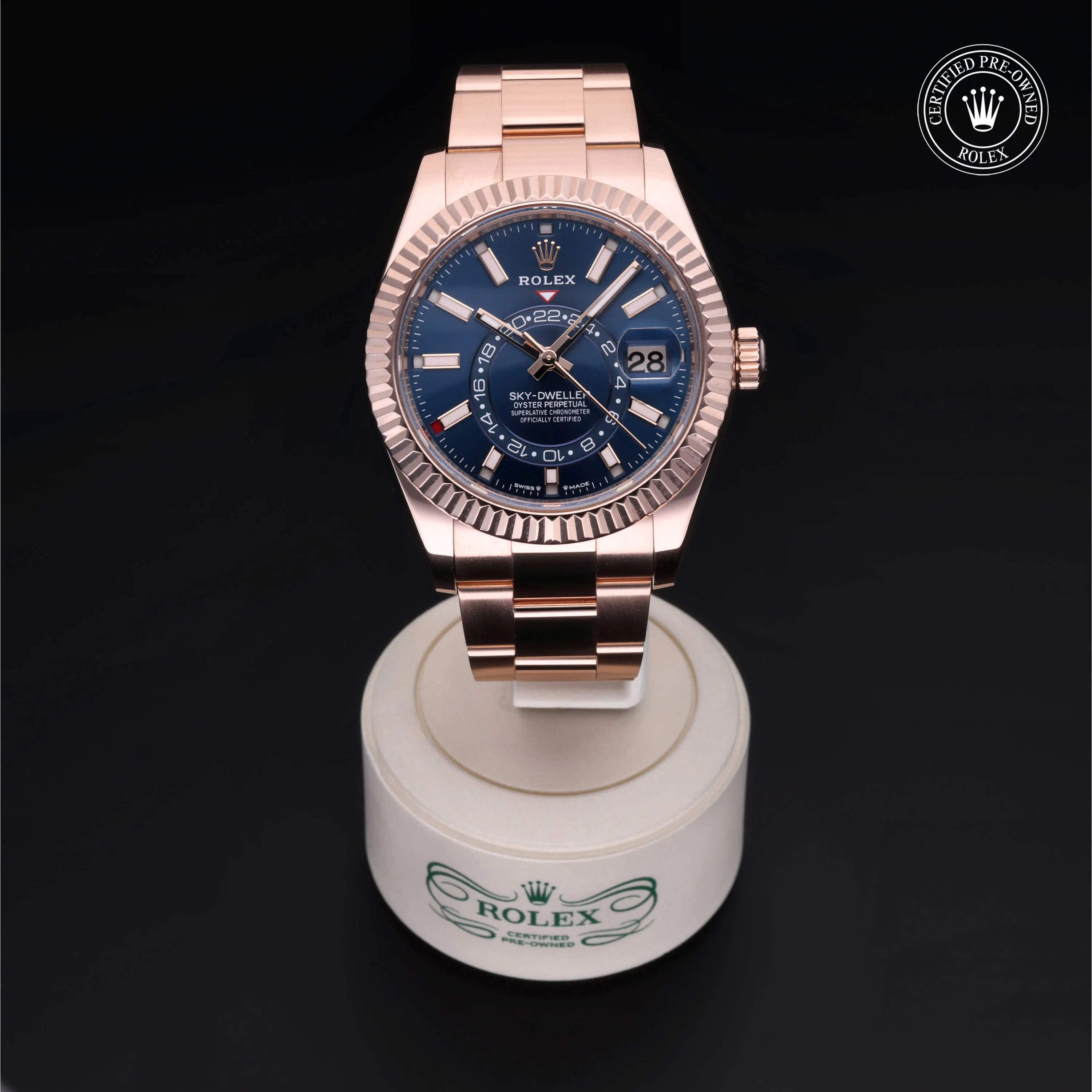 Rolex Certified Pre-Owned Sky-Dweller (336935) self - winding automatic watch, features a 42mm 18k rose gold case and fluted bezel surrounding a blue, green dial on an 18k rose gold oyster bracelet. Functions include hours, minutes, seconds, date, annual calendar, gmt/world time and month. This watch has received Rolex-authorized service and certification. It does not come with the original box or papers, but includes a custom Rolex Certified Pre-Owned hang tag, travel pouch and RCPO international warranty card.