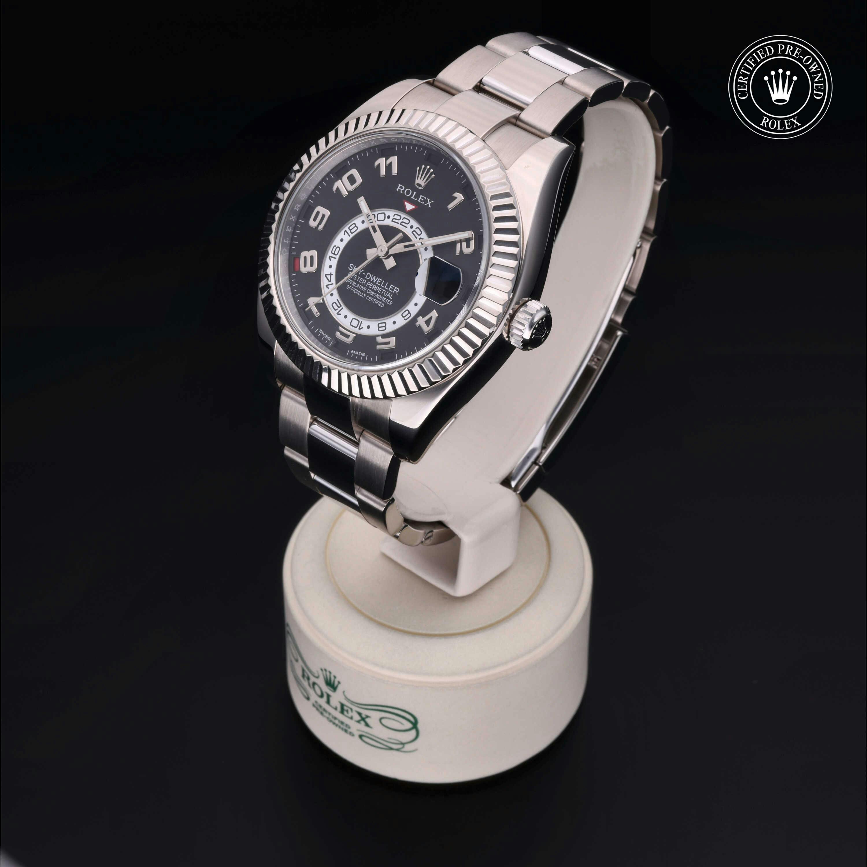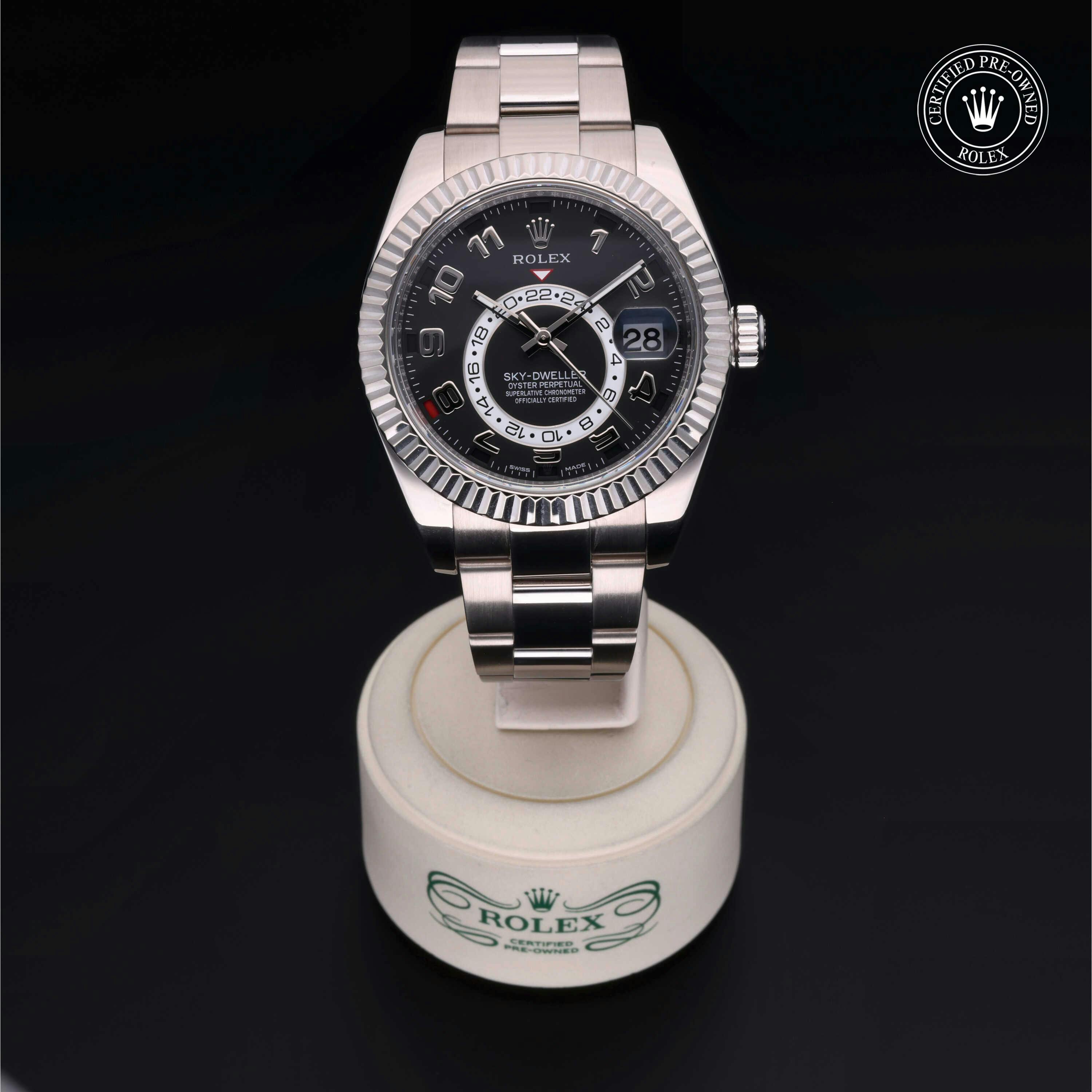 Rolex Certified Pre-Owned Sky-Dweller (326939) self - winding automatic watch, features a 42mm 18k white gold case and fluted bezel surrounding a black dial on an 18k white gold oyster bracelet. Functions include hours, minutes, seconds, date, annual calendar, gmt/world time and month. This watch has received Rolex-authorized service and certification. It comes with the original papers, and includes a custom Rolex Certified Pre-Owned hang tag, travel pouch and RCPO international warranty card.