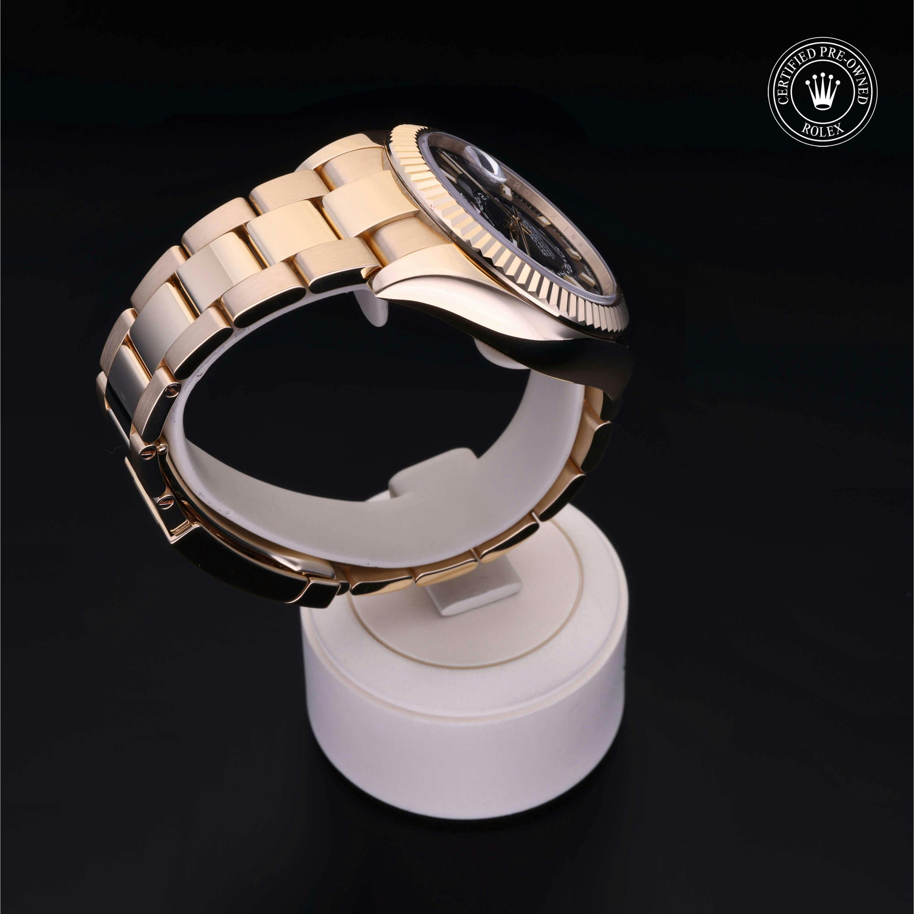 Rolex Certified Pre-Owned Sky-Dweller (326938) self - winding automatic watch, features a 42mm 18k yellow gold case and fluted bezel surrounding a bright black dial on an 18k yellow gold oyster bracelet. Functions include hours, minutes, seconds, date, annual calendar and month. This watch has received Rolex-authorized service and certification. It comes with the original papers, and includes a custom Rolex Certified Pre-Owned hang tag, travel pouch and RCPO international warranty card.