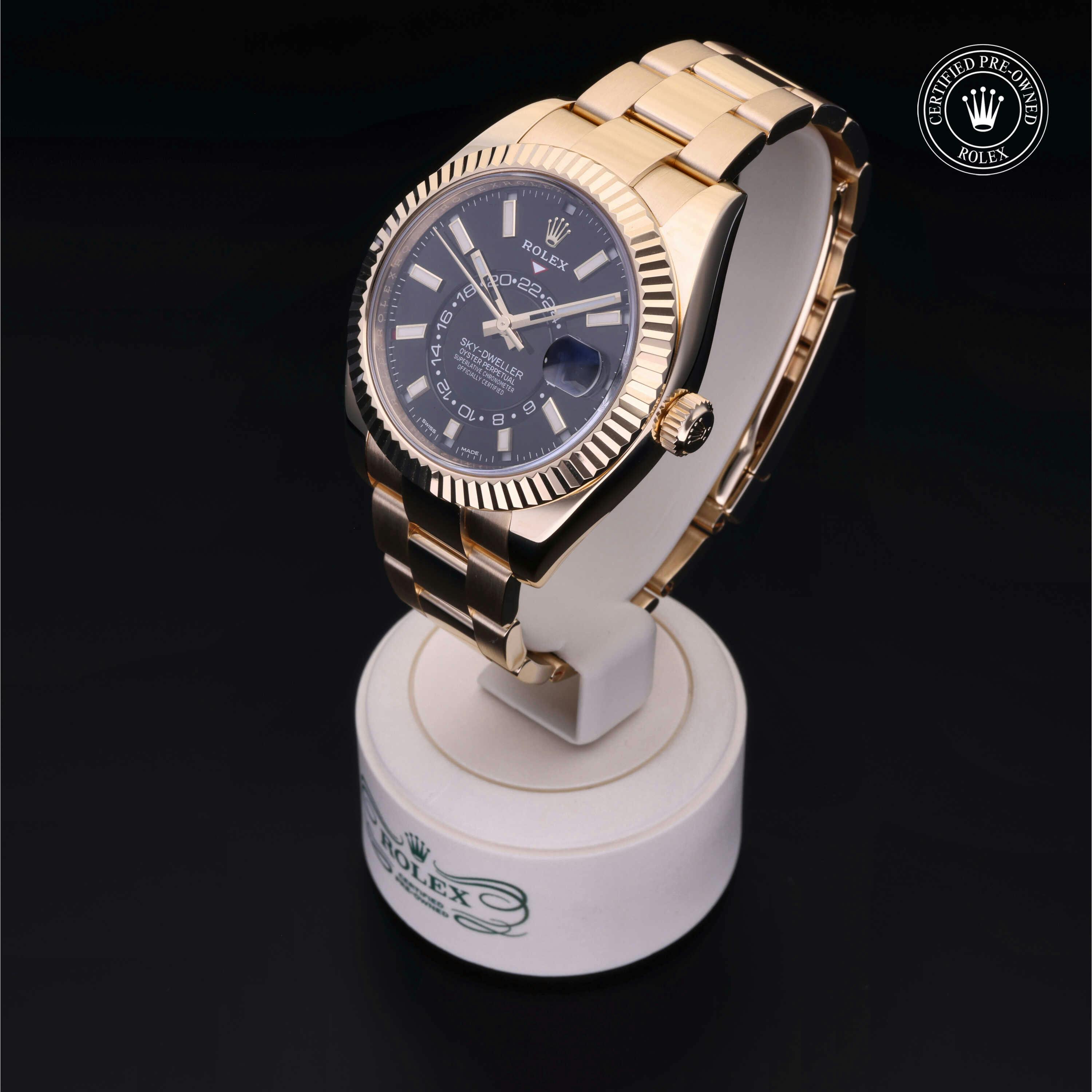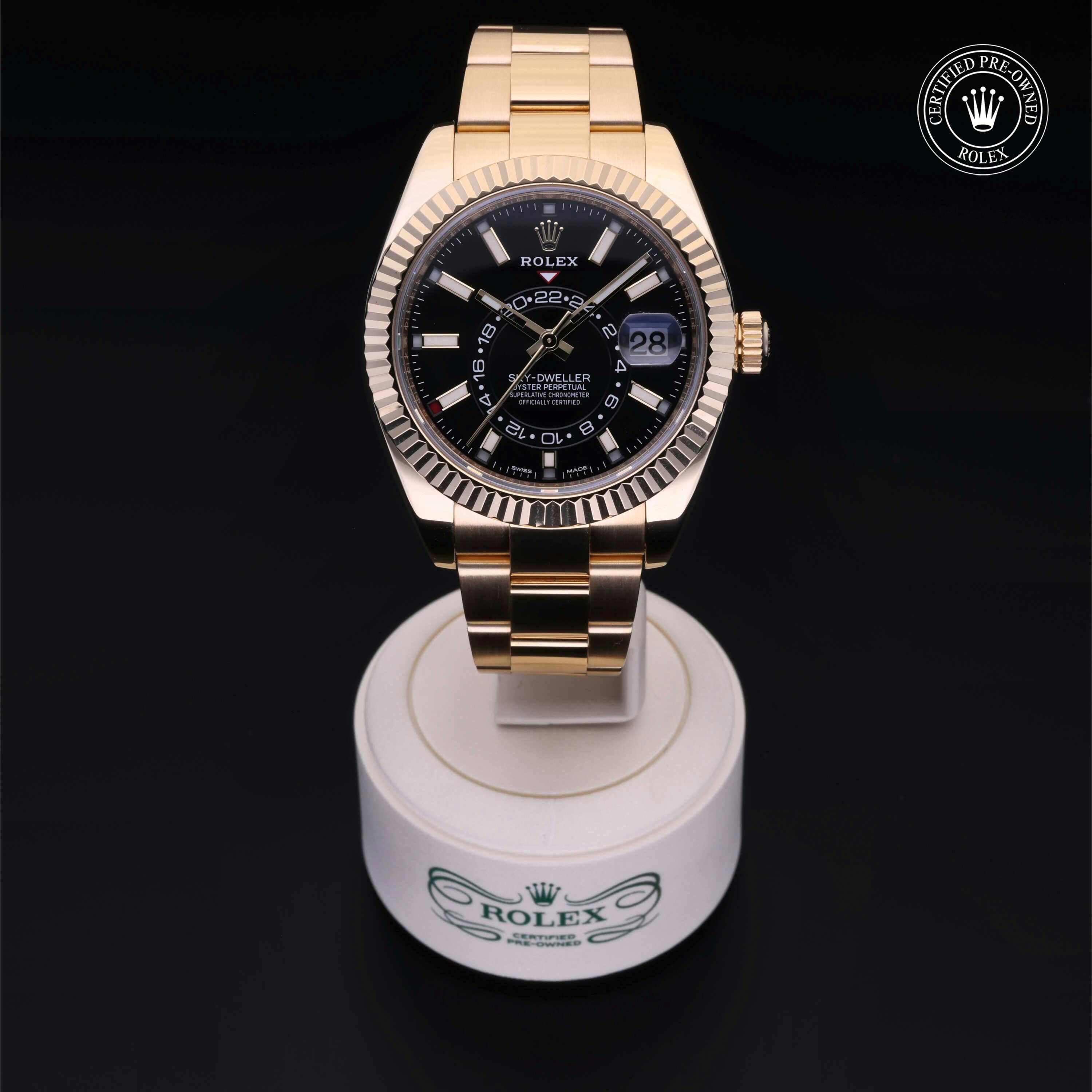 Rolex Certified Pre-Owned Sky-Dweller (326938) self - winding automatic watch, features a 42mm 18k yellow gold case and fluted bezel surrounding a bright black dial on an 18k yellow gold oyster bracelet. Functions include hours, minutes, seconds, date, annual calendar and month. This watch has received Rolex-authorized service and certification. It comes with the original papers, and includes a custom Rolex Certified Pre-Owned hang tag, travel pouch and RCPO international warranty card.