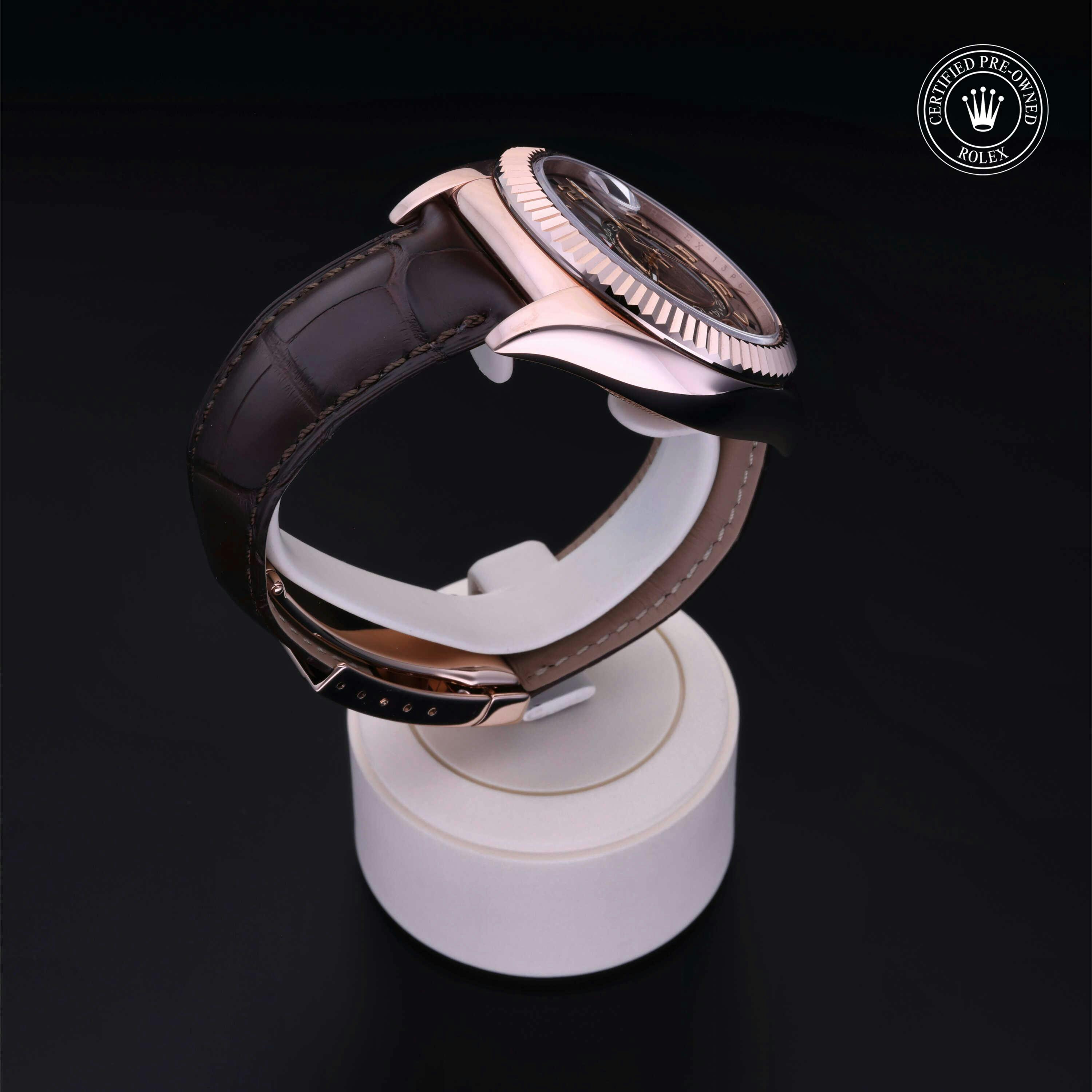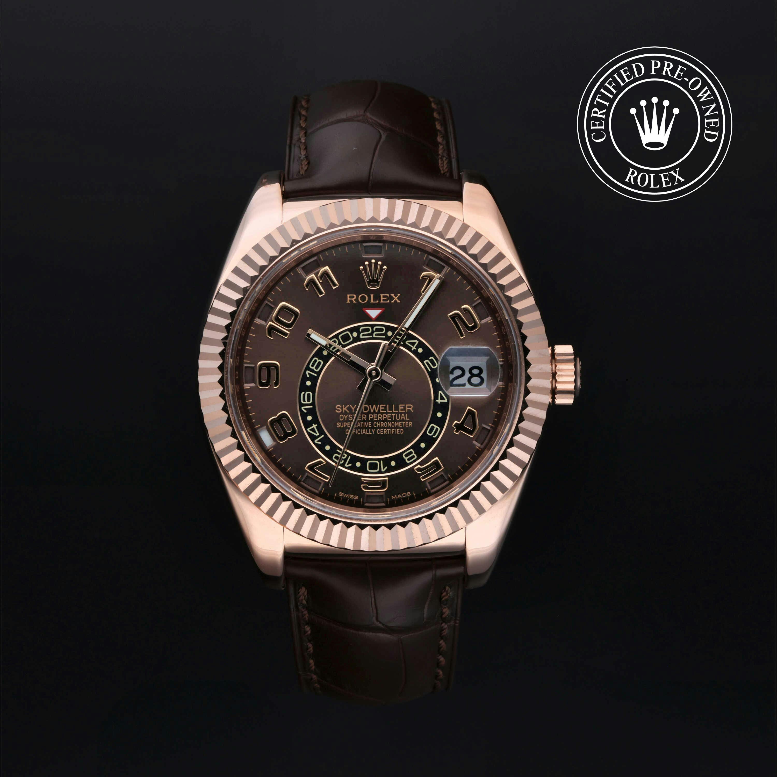 Rolex Certified Pre-Owned Sky-Dweller (326135) self - winding automatic watch, features a 42mm 18k rose gold case and fluted bezel surrounding a chocolate dial on a brown alligator strap with an 18k rose gold deployant buckle. Functions include hours, minutes, seconds, date, annual calendar and month. This watch has received Rolex-authorized service and certification. It does not come with the original box or papers, but includes a custom Rolex Certified Pre-Owned hang tag, travel pouch and RCPO international warranty card.