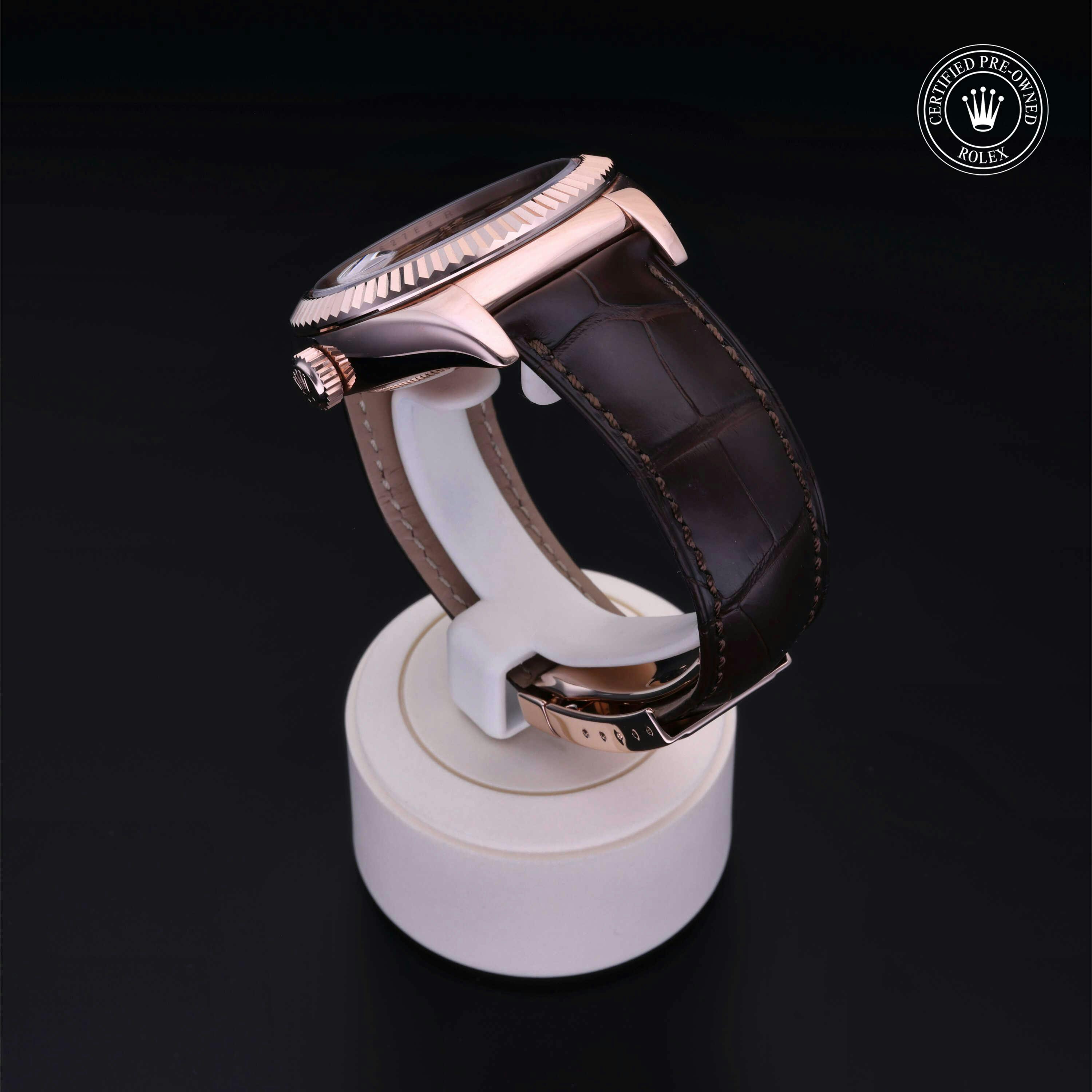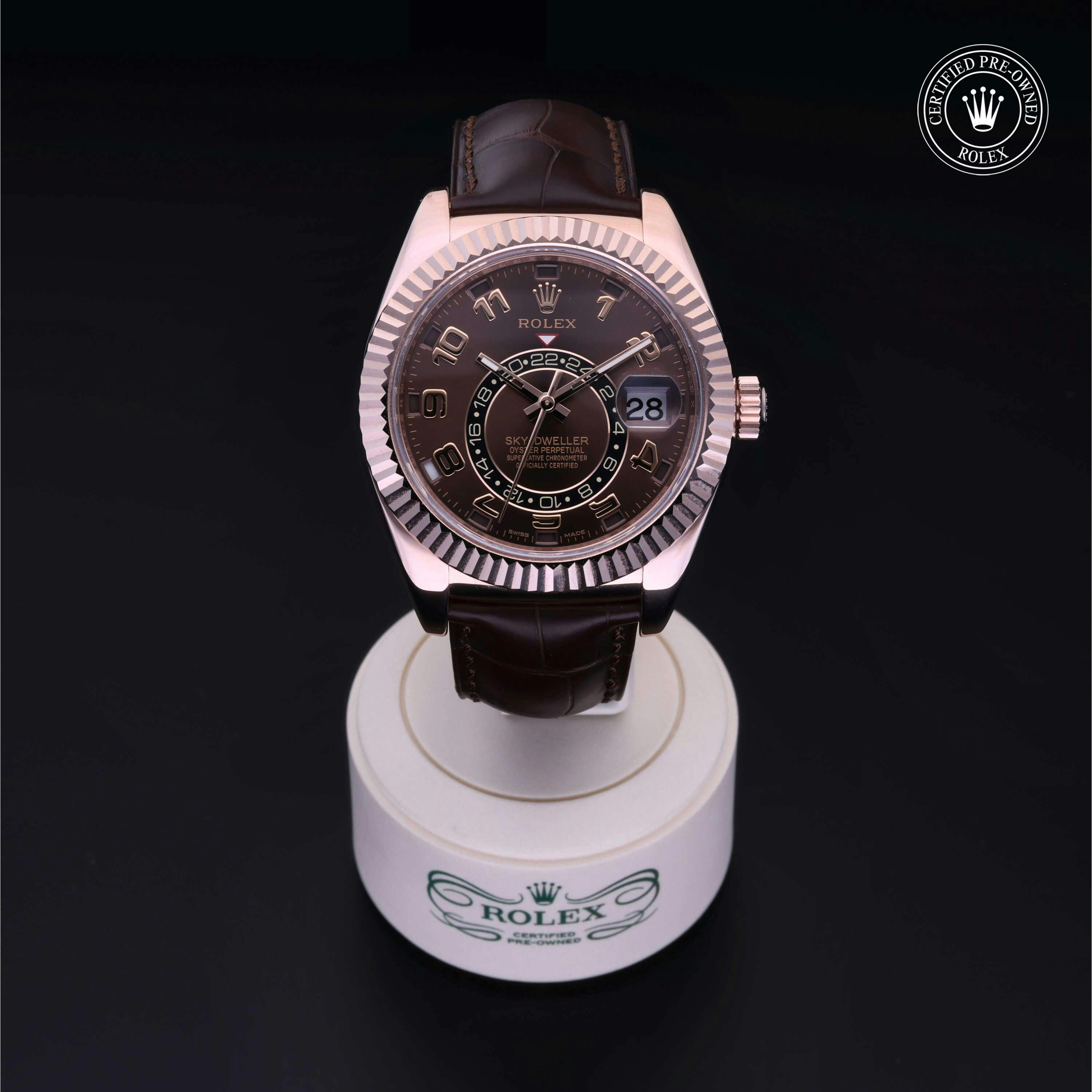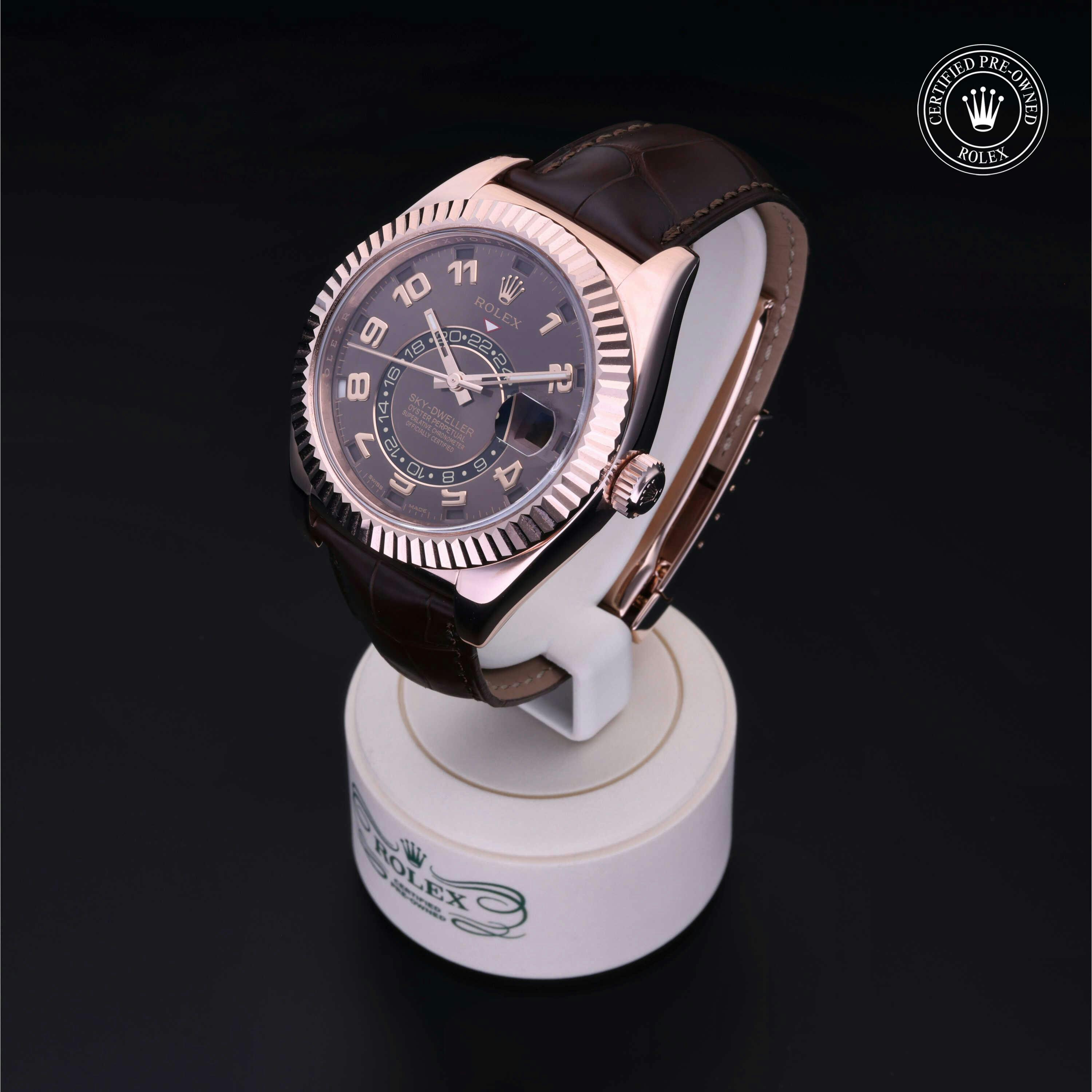 Rolex Certified Pre-Owned Sky-Dweller (326135) self - winding automatic watch, features a 42mm 18k rose gold case and fluted bezel surrounding a chocolate dial on a brown alligator strap with an 18k rose gold deployant buckle. Functions include hours, minutes, seconds, date, annual calendar and month. This watch has received Rolex-authorized service and certification. It does not come with the original box or papers, but includes a custom Rolex Certified Pre-Owned hang tag, travel pouch and RCPO international warranty card.