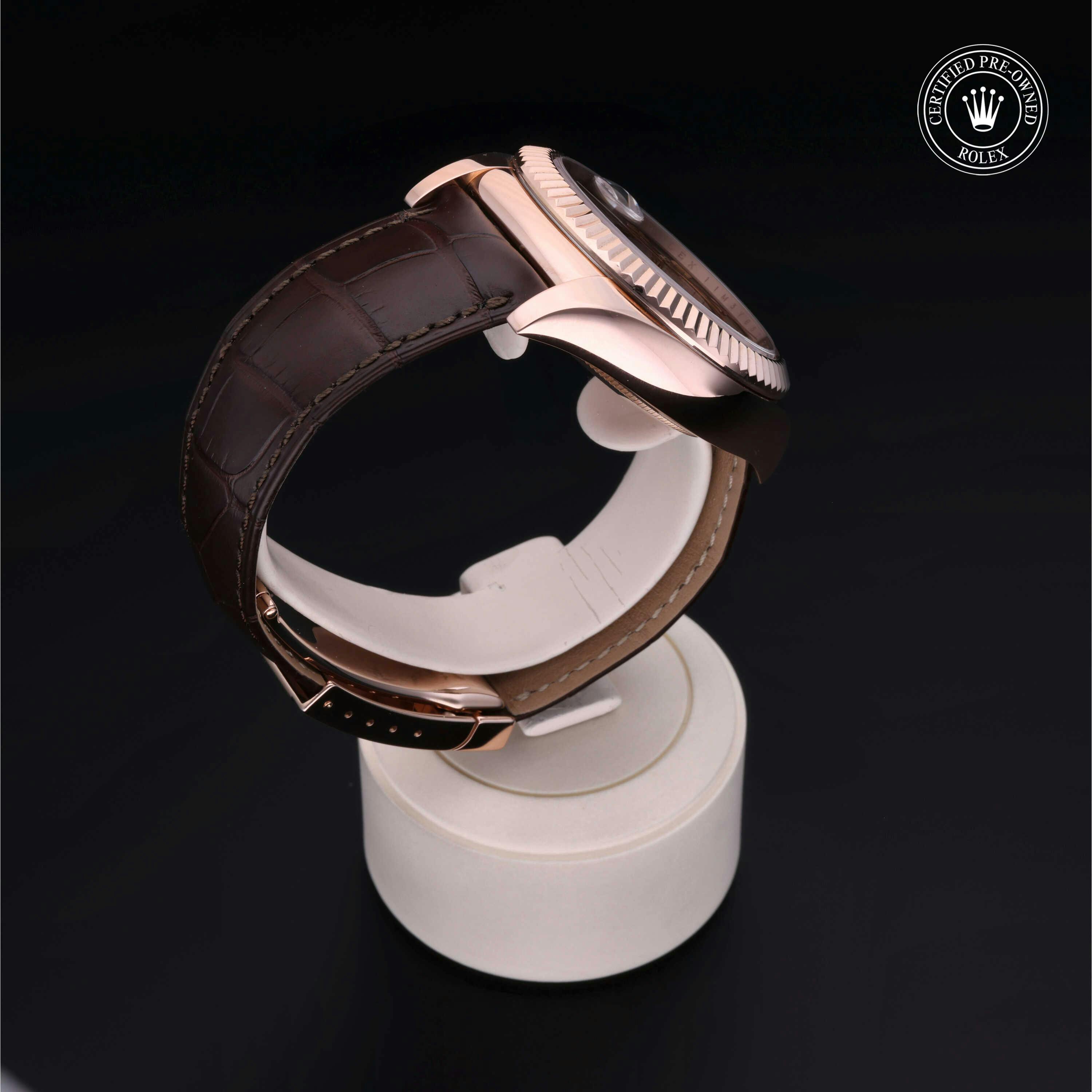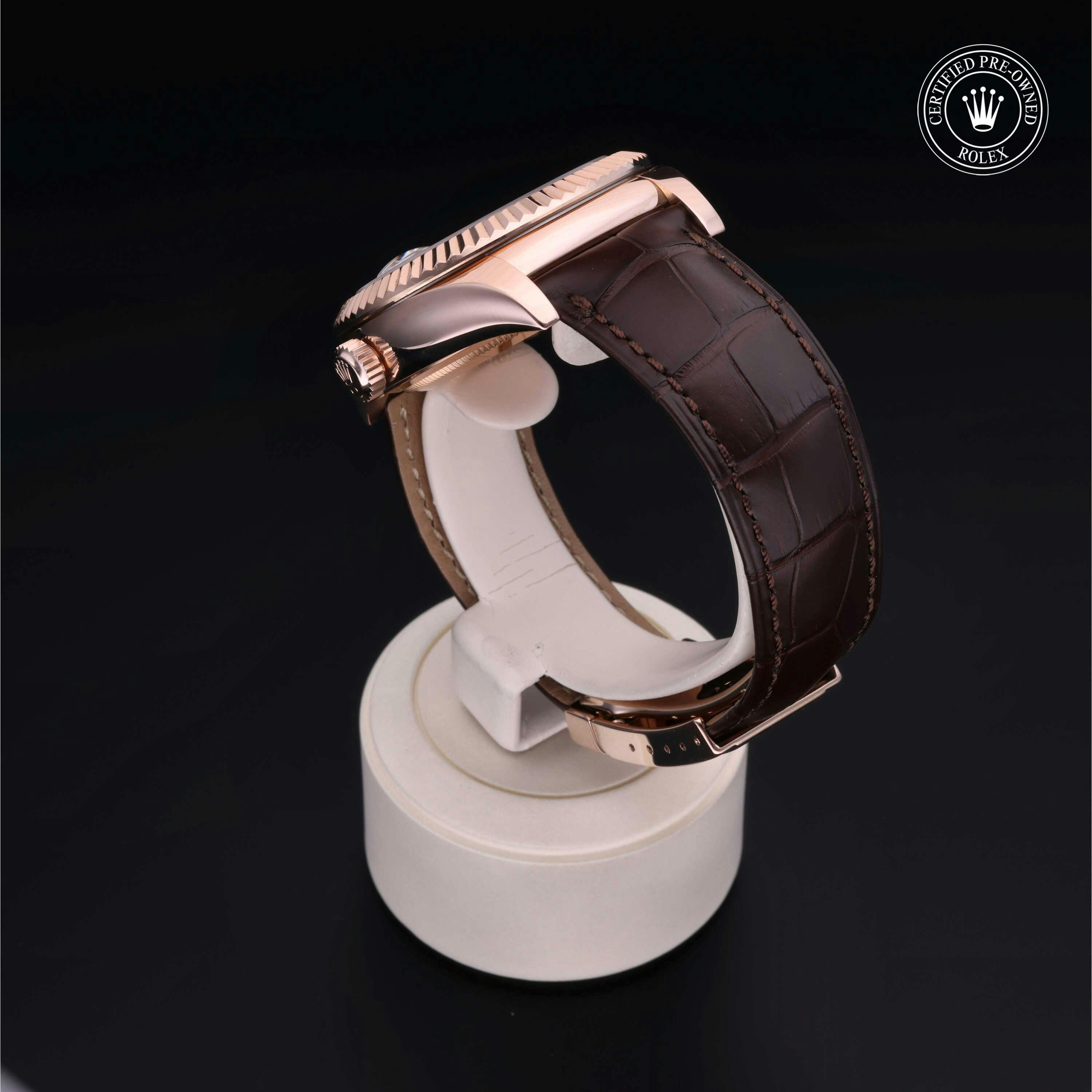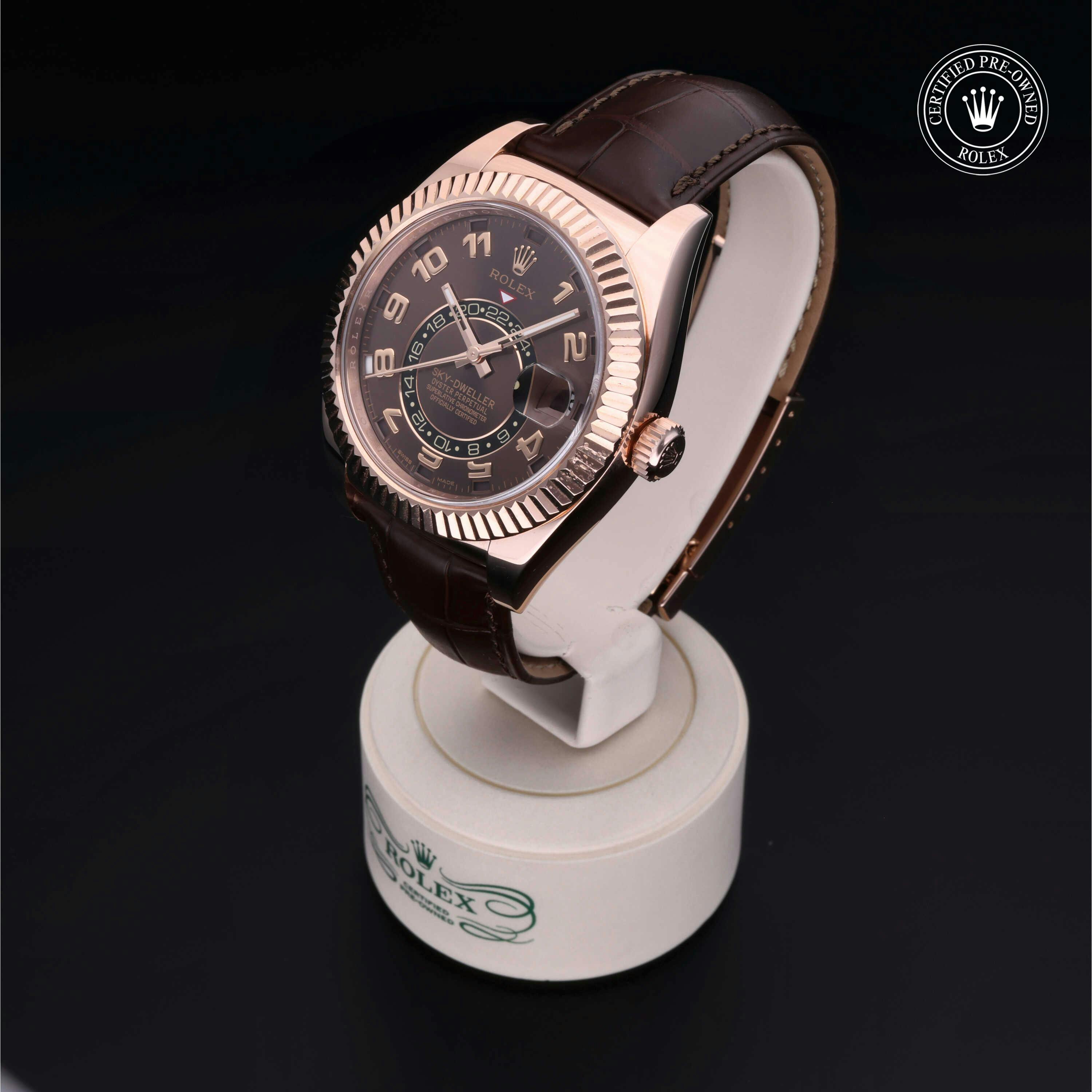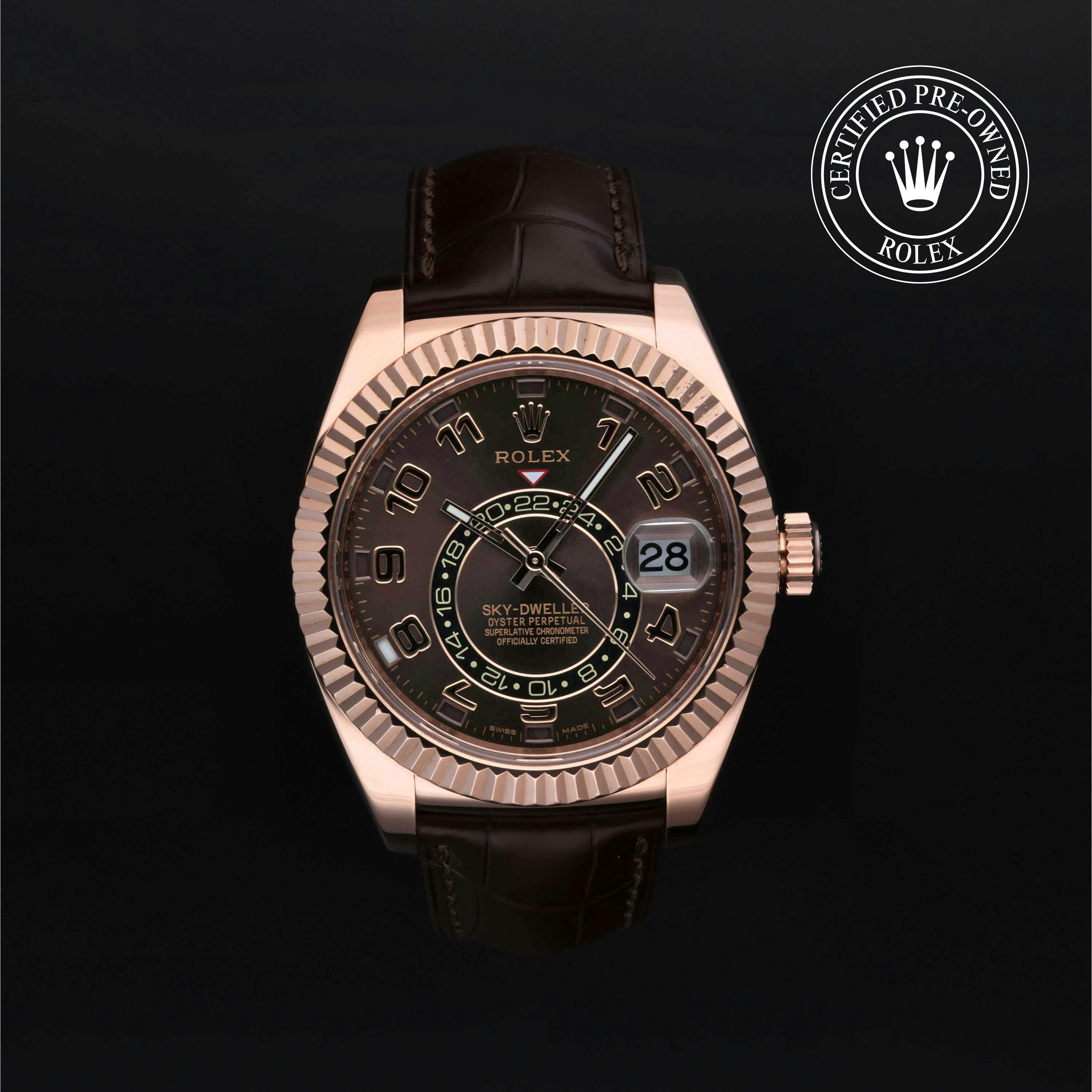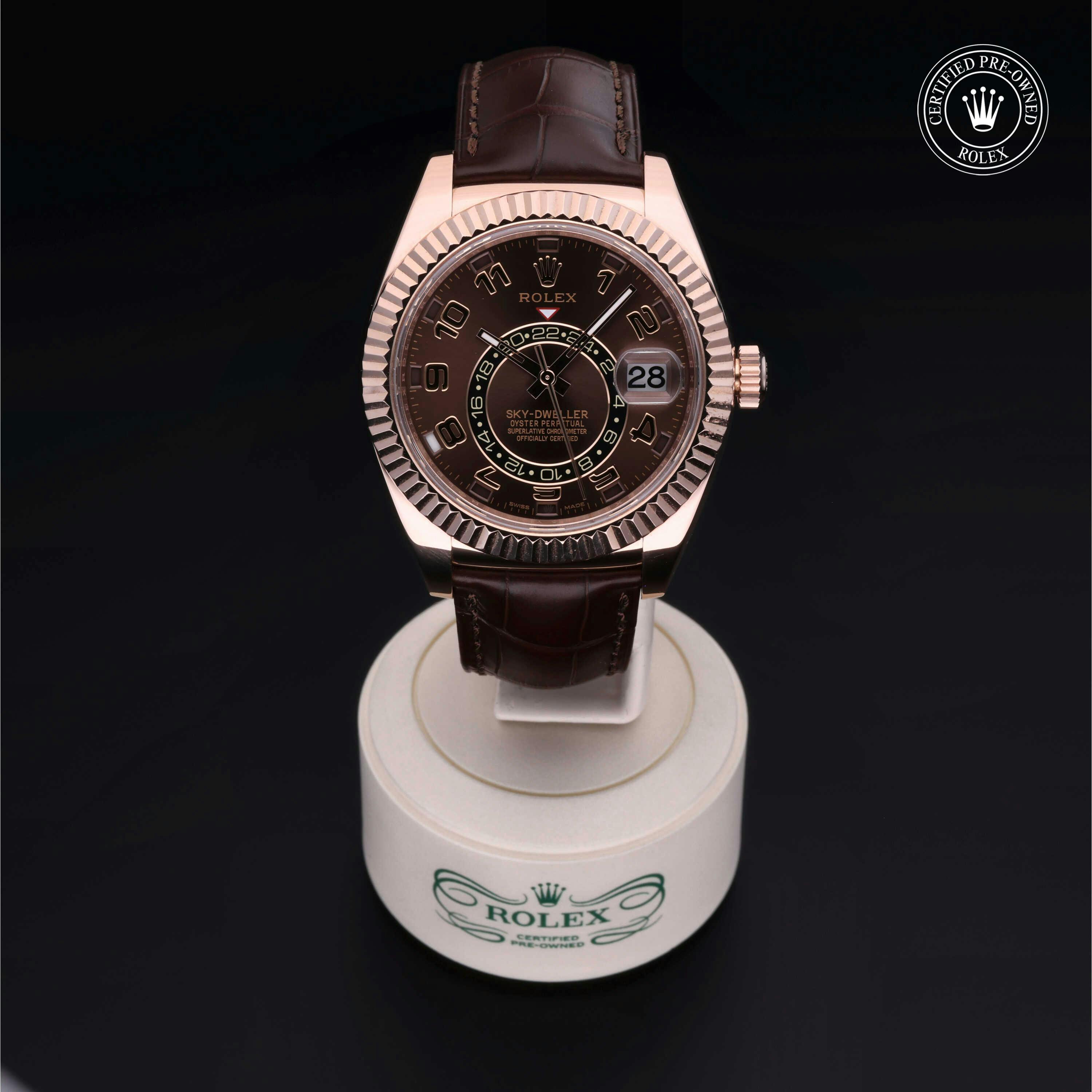 Rolex Certified Pre-Owned Sky-Dweller (326135) self - winding automatic watch, features a 42mm 18k rose gold case and fluted bezel surrounding a chocolate dial on a brown alligator strap with an 18k rose gold deployant buckle. Functions include hours, minutes, seconds, date, annual calendar and month. This watch has received Rolex-authorized service and certification. It does not come with the original box or papers, but includes a custom Rolex Certified Pre-Owned hang tag, travel pouch and RCPO international warranty card.