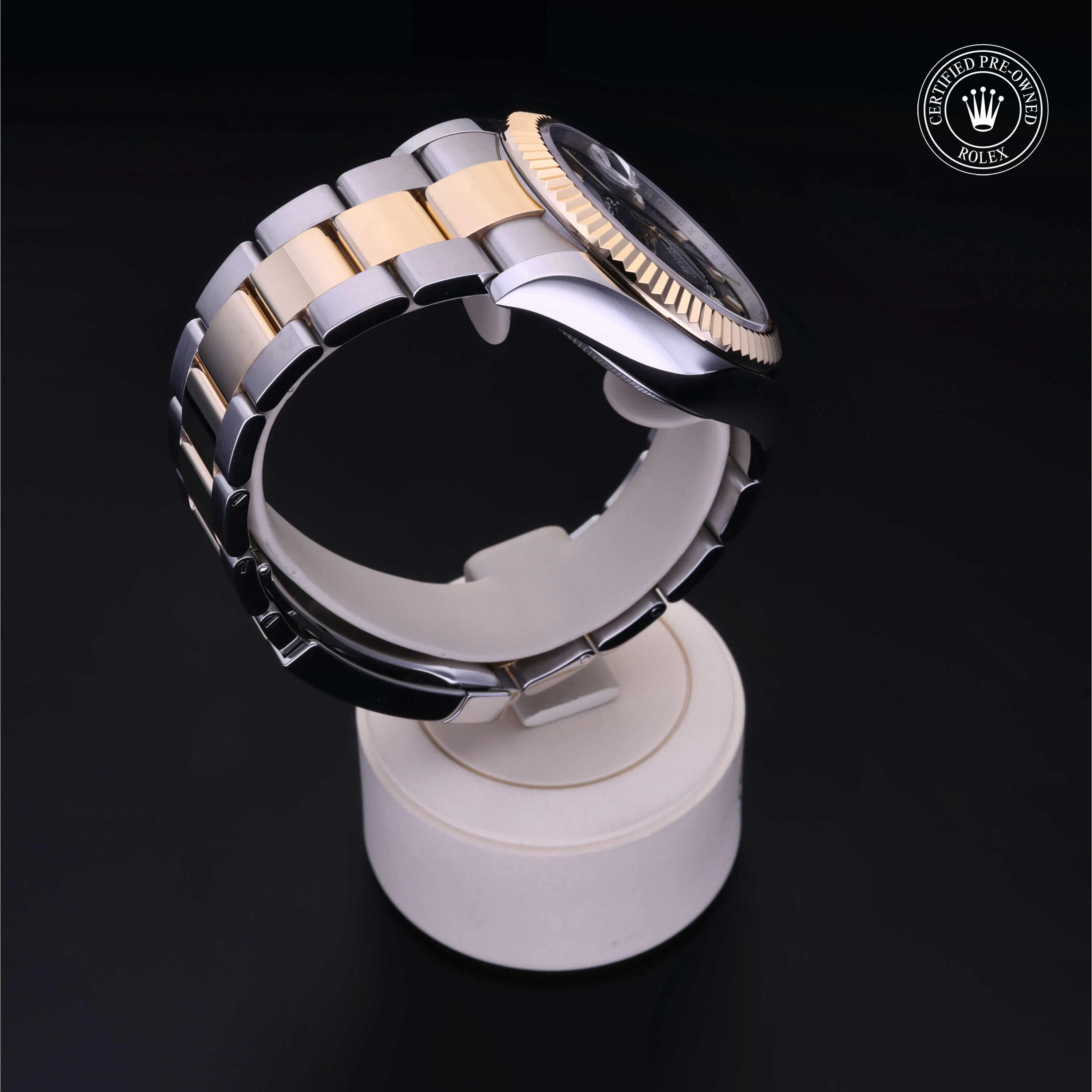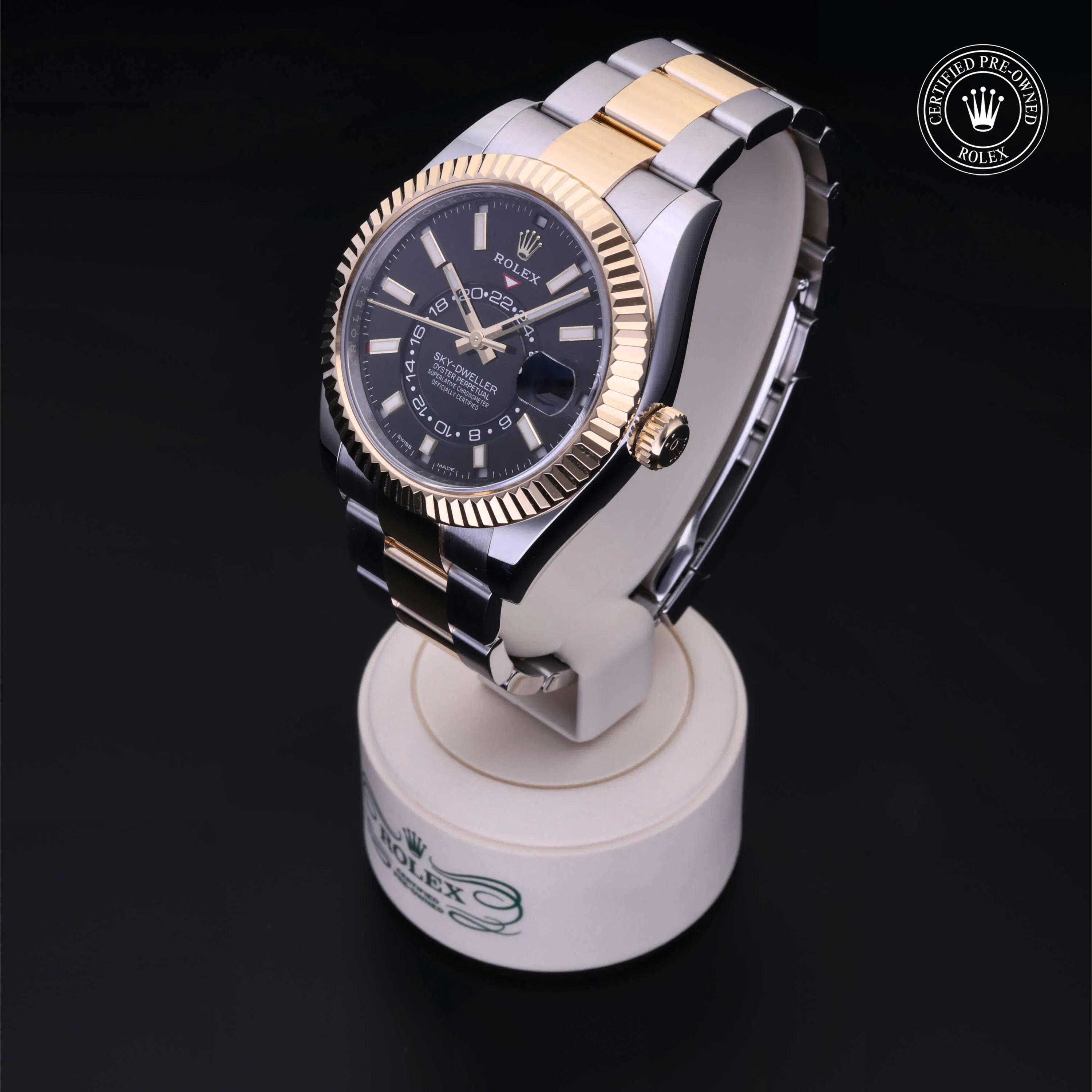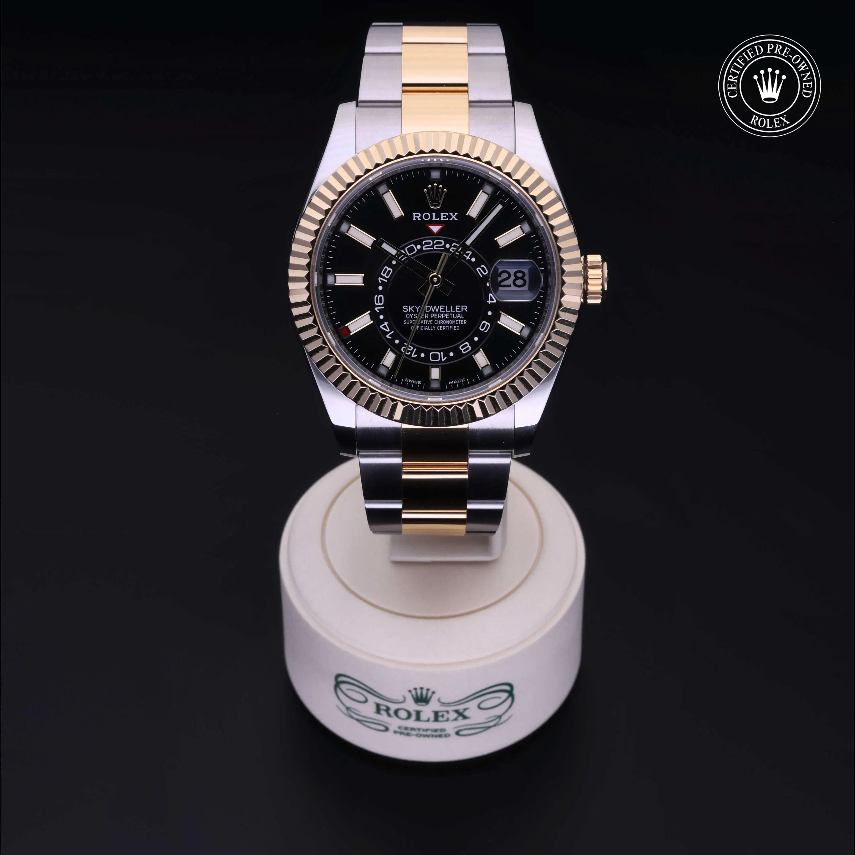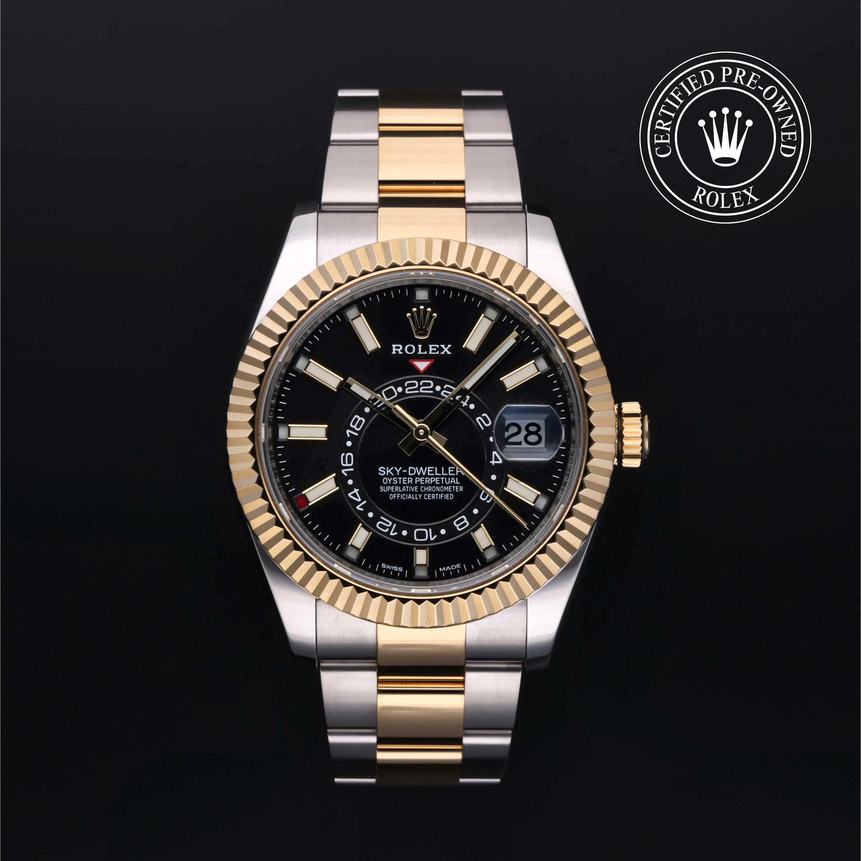 Rolex Certified Pre-Owned Sky-Dweller (326933) self - winding automatic watch, features a 42mm stainless steel case with an 18k yellow gold fluted bezel surrounding a bright black dial on a stainless steel and 18k yellow gold Oyster bracelet. Functions include hours, minutes, seconds, date, annual calendar and month. This watch has received Rolex-authorized service and certification. It comes with the original box and papers, and includes a custom Rolex Certified Pre-Owned hang tag, travel pouch and RCPO international warranty card.
