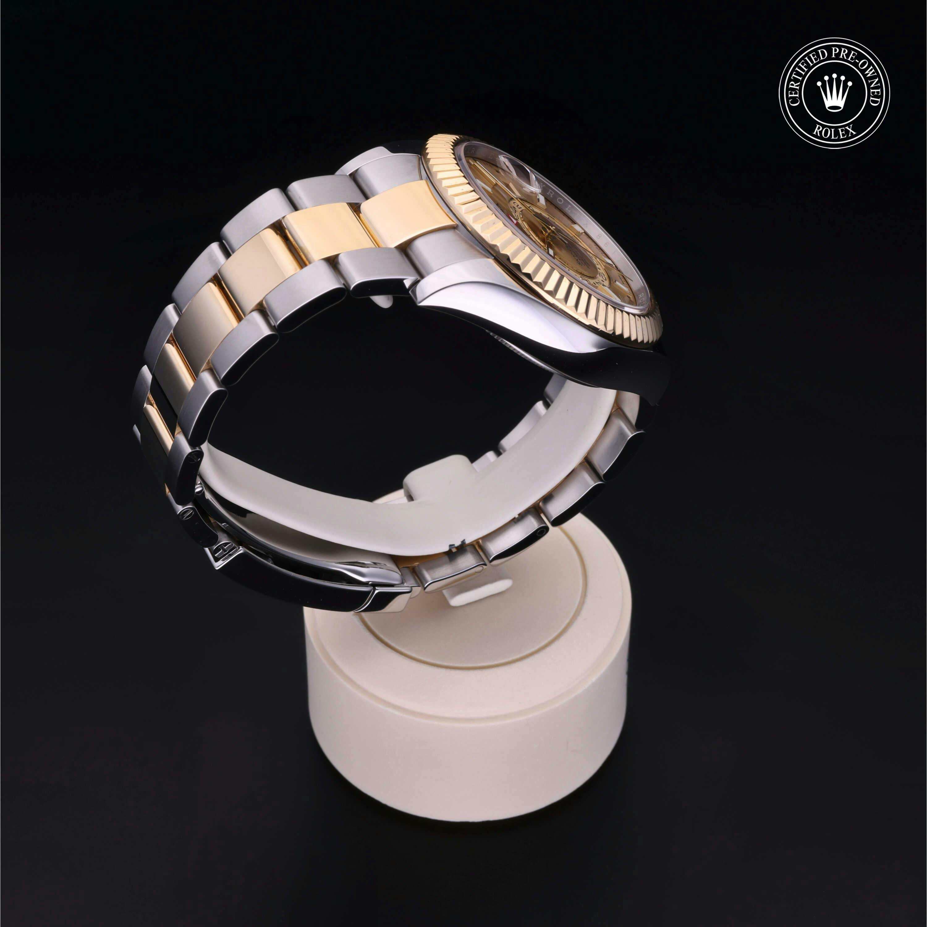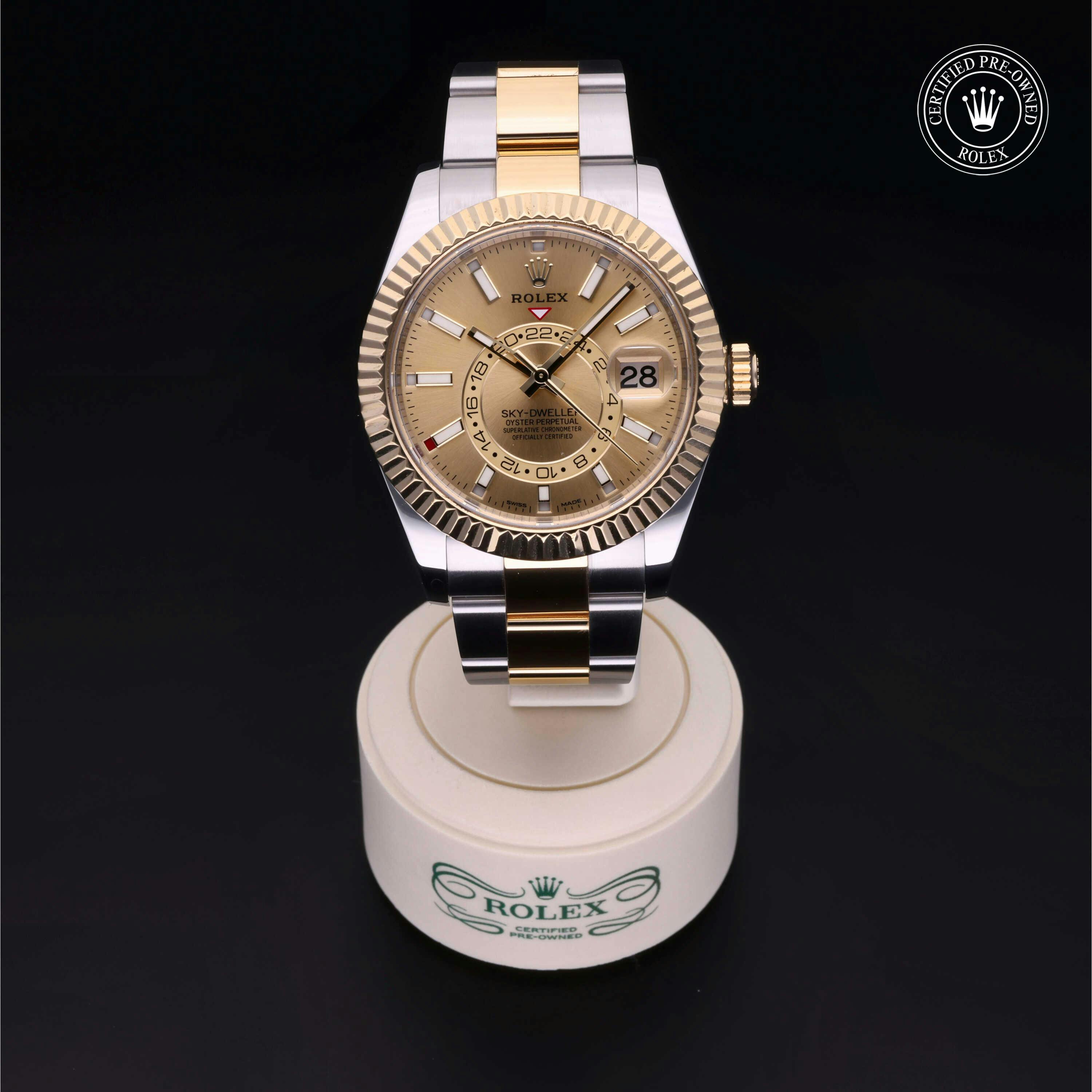 Rolex Certified Pre-Owned Sky-Dweller (326933) self - winding automatic watch, features a 42mm stainless steel case with an 18k yellow gold fluted bezel surrounding a champagne dial on a stainless steel and 18k yellow gold oyster bracelet. Functions include hours, minutes, seconds, date, annual calendar and month. This watch has received Rolex-authorized service and certification. It comes with the original papers, and includes a custom Rolex Certified Pre-Owned hang tag, travel pouch and RCPO international warranty card.