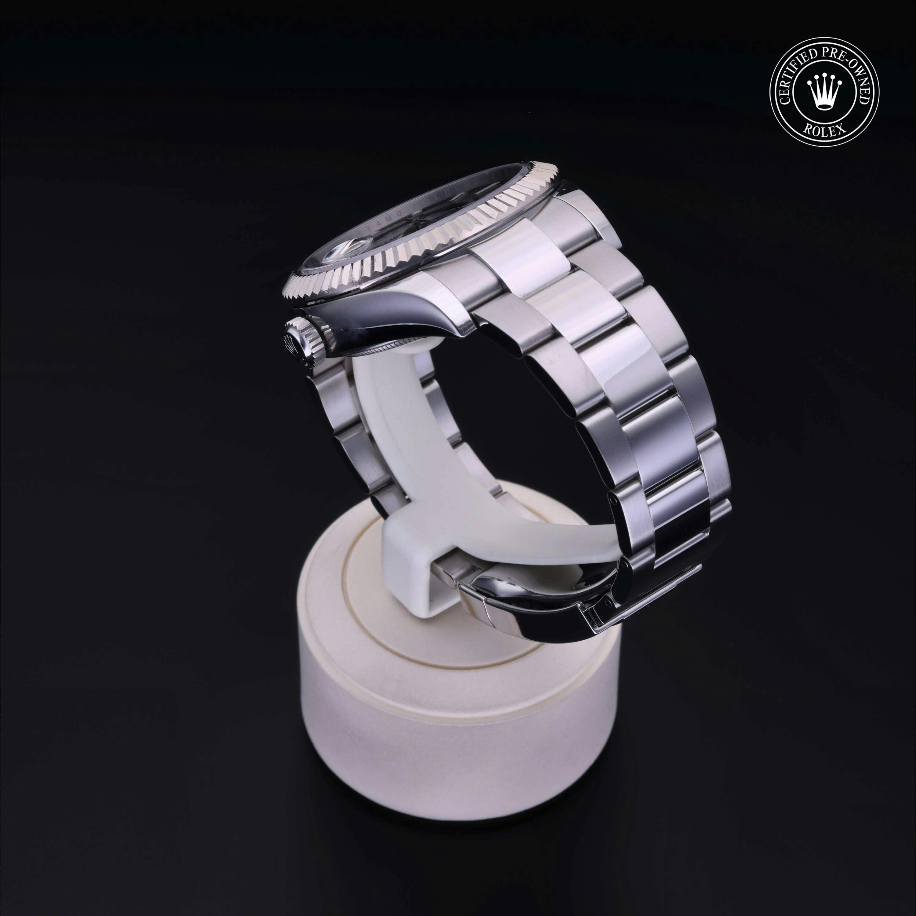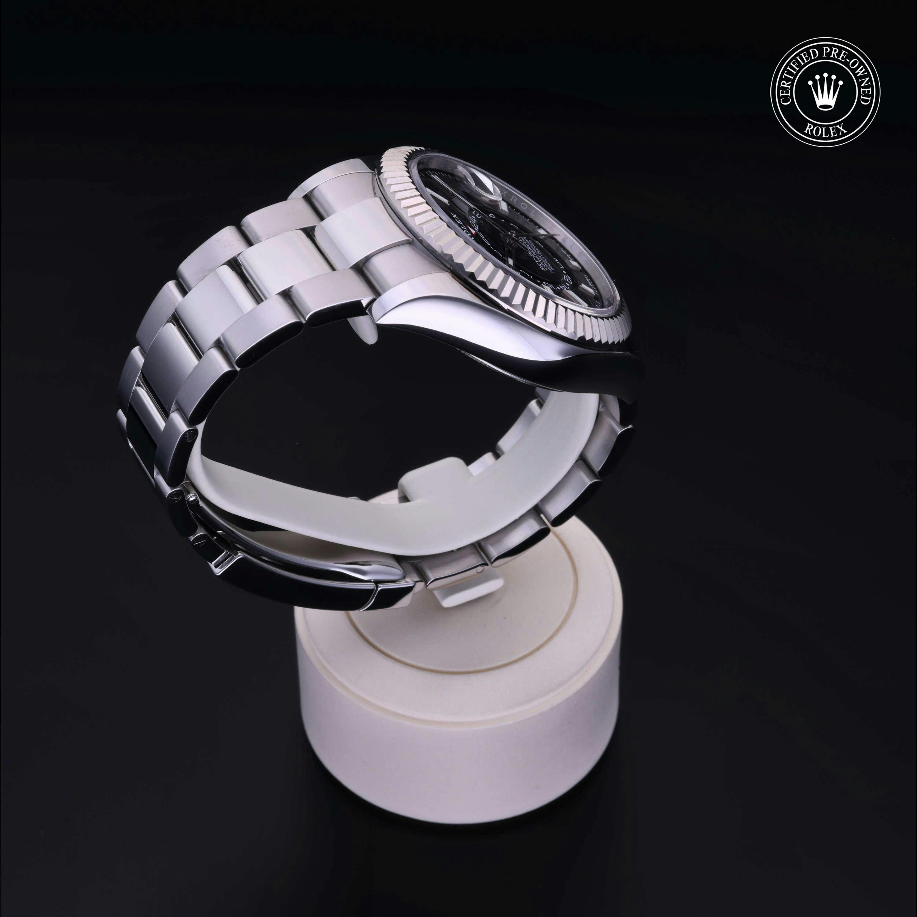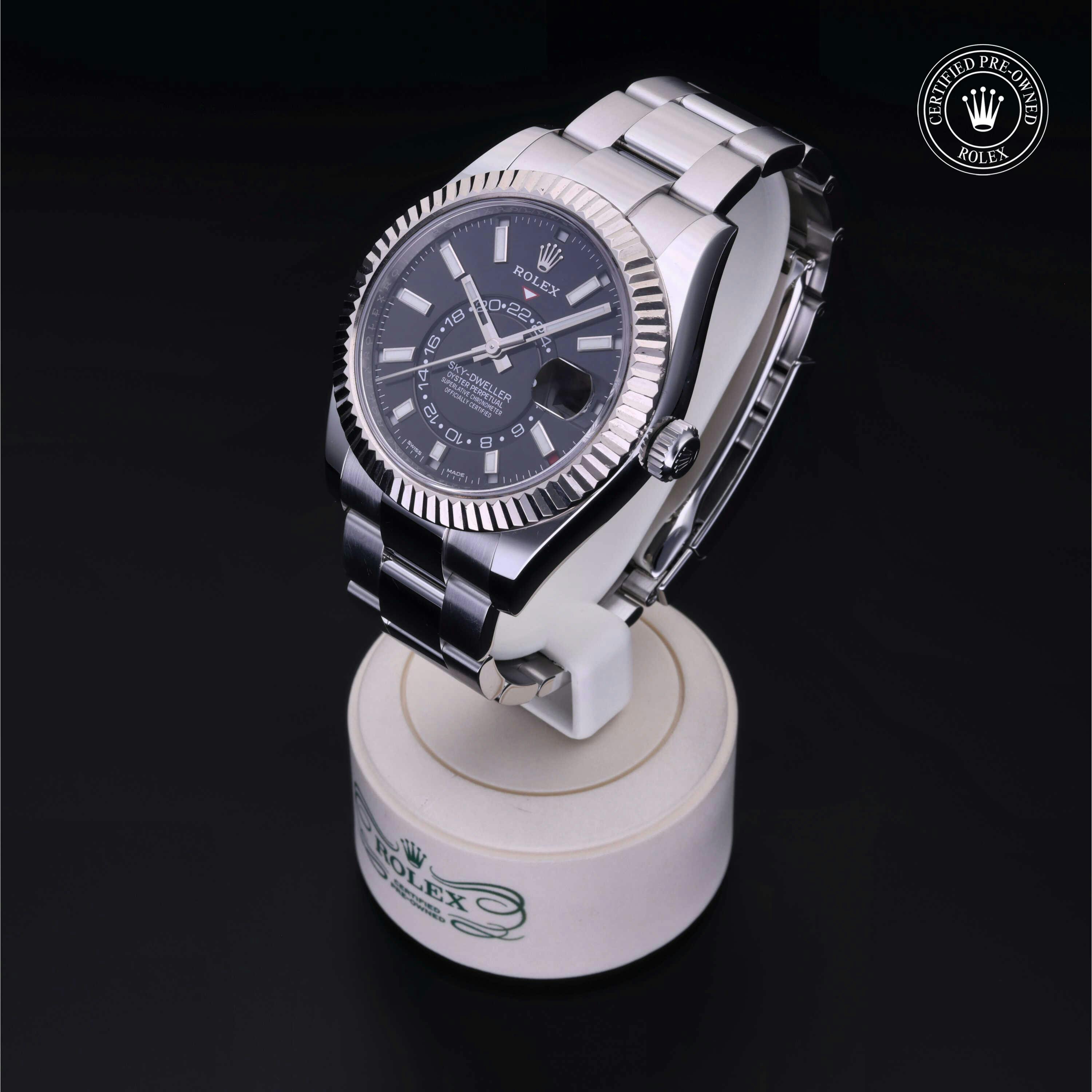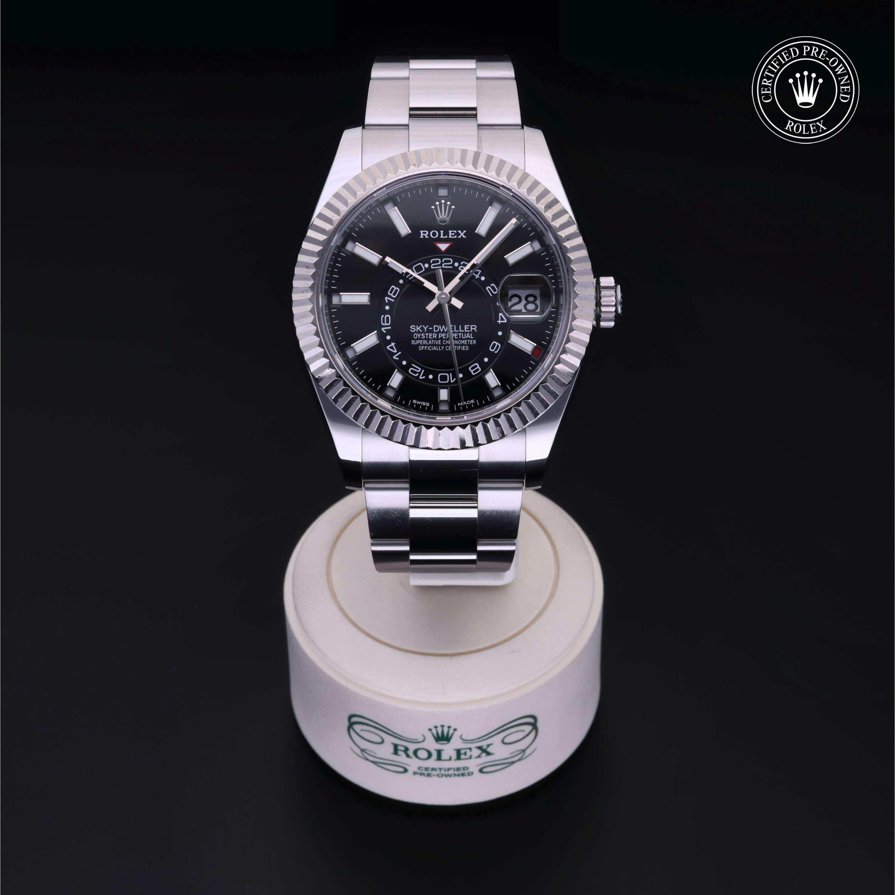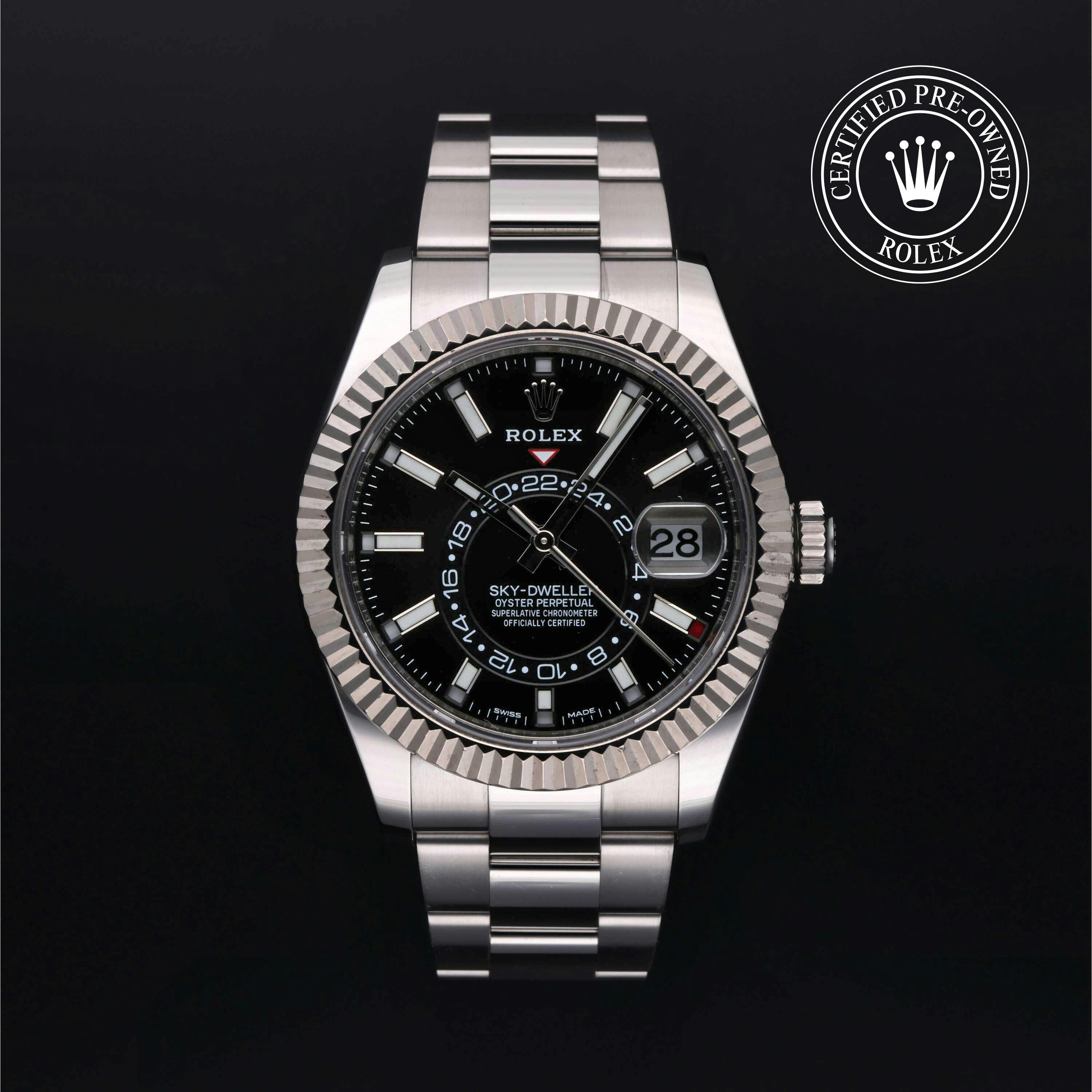 Rolex Certified Pre-Owned Sky-Dweller (326934) self - winding automatic watch, features a 42mm stainless steel case with an 18k white gold fluted bezel surrounding a black index dial. The watch is secured on a stainless steel Oyster bracelet complete with a folding buckle. Functions include hours, minutes, seconds, date, month, 24-hour indicator, annual calendar and gmt/world time. This watch has been serviced by an authorized service center and certified by Rolex. It comes with the original box and papers as well as a custom Rolex Certified Pre-Owned hang tag, travel pouch and international warranty card.