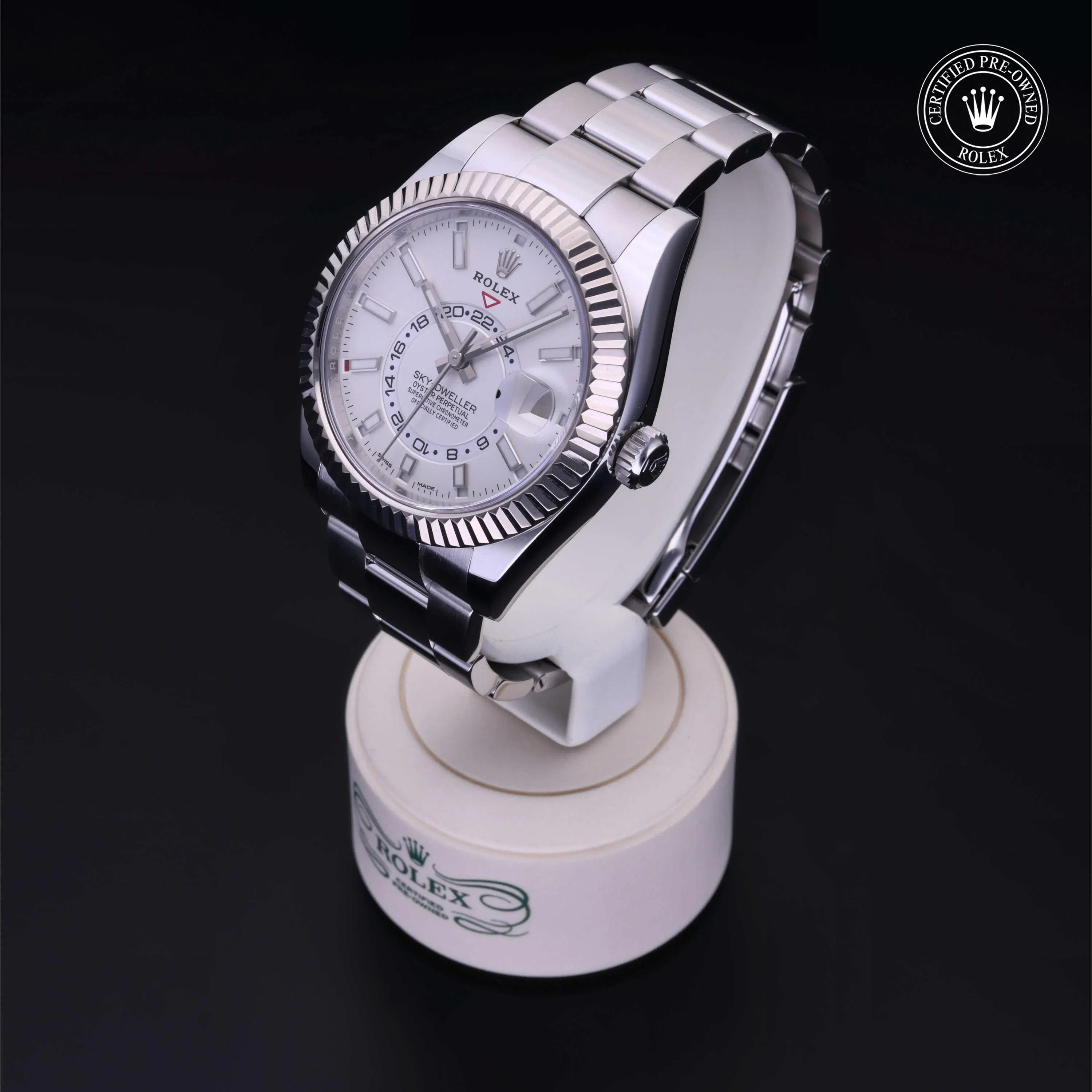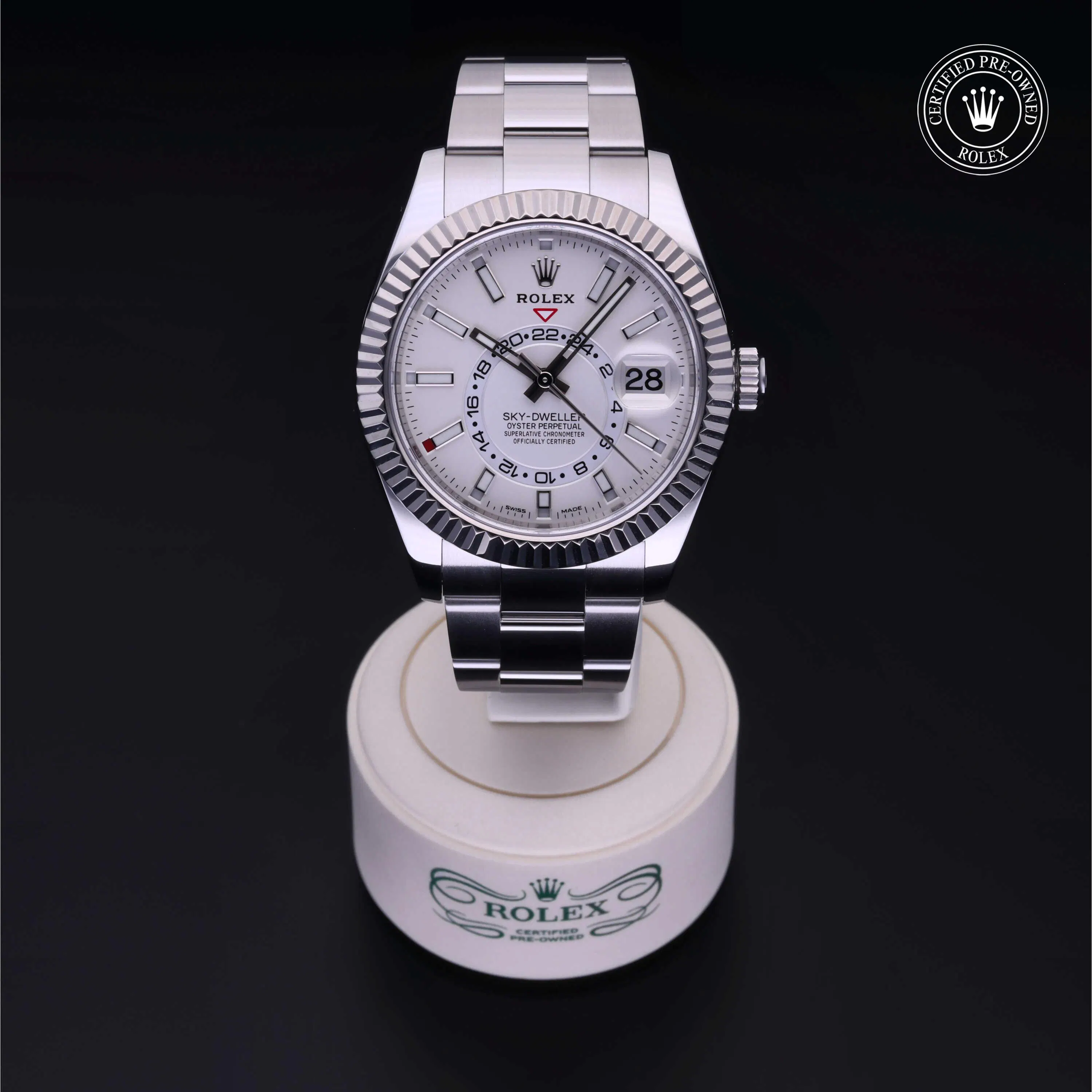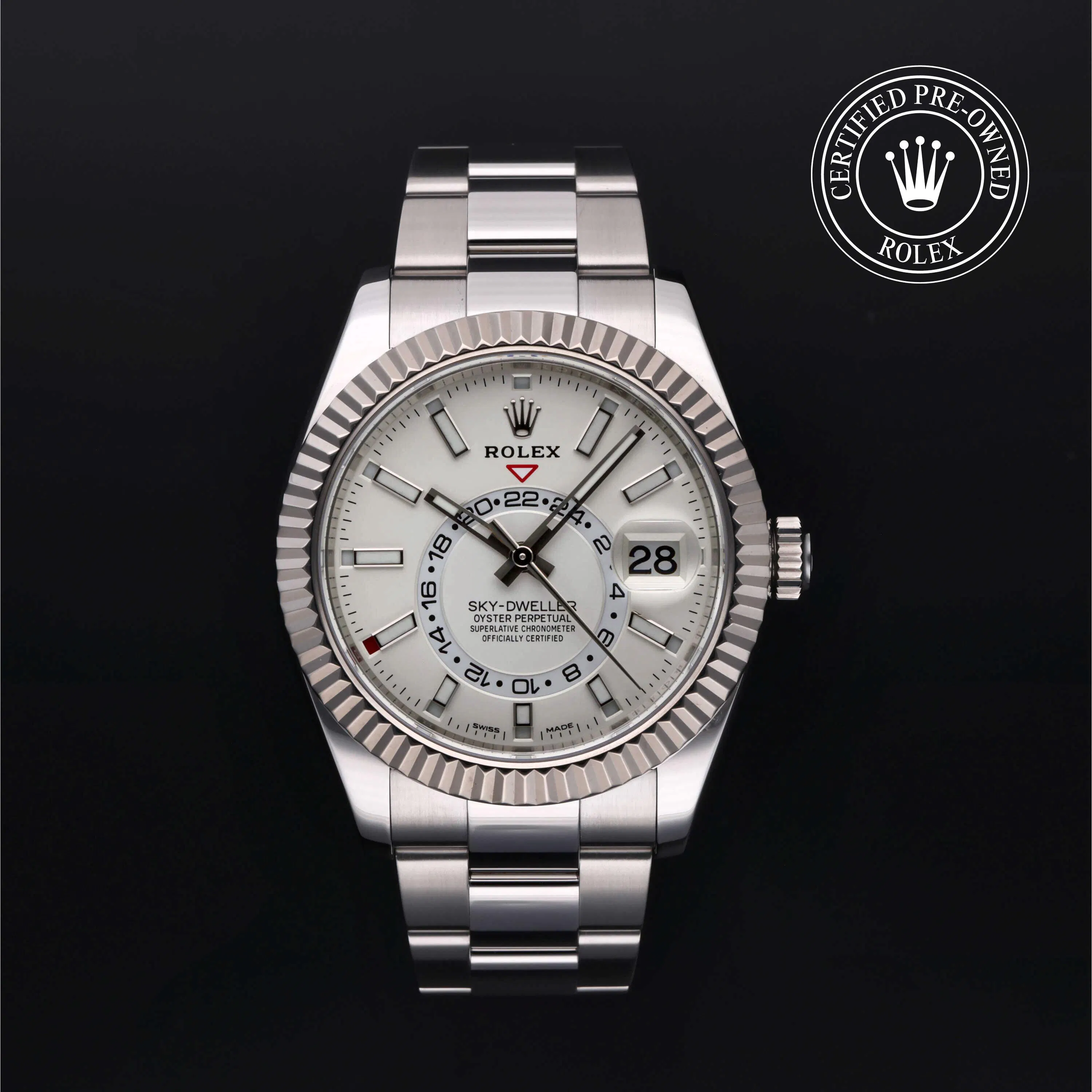 Rolex Certified Pre-Owned Sky-Dweller (326934) self - winding automatic watch, features a 42mm stainless steel case with an 18k white gold fluted bezel surrounding an intense white dial on a stainless steel oyster bracelet. Functions include hours, minutes, seconds, date, 24-hour indicator, annual calendar and month. This watch has received Rolex-authorized service and certification. It comes with the original box and papers, and includes a custom Rolex Certified Pre-Owned hang tag, travel pouch and RCPO international warranty card.