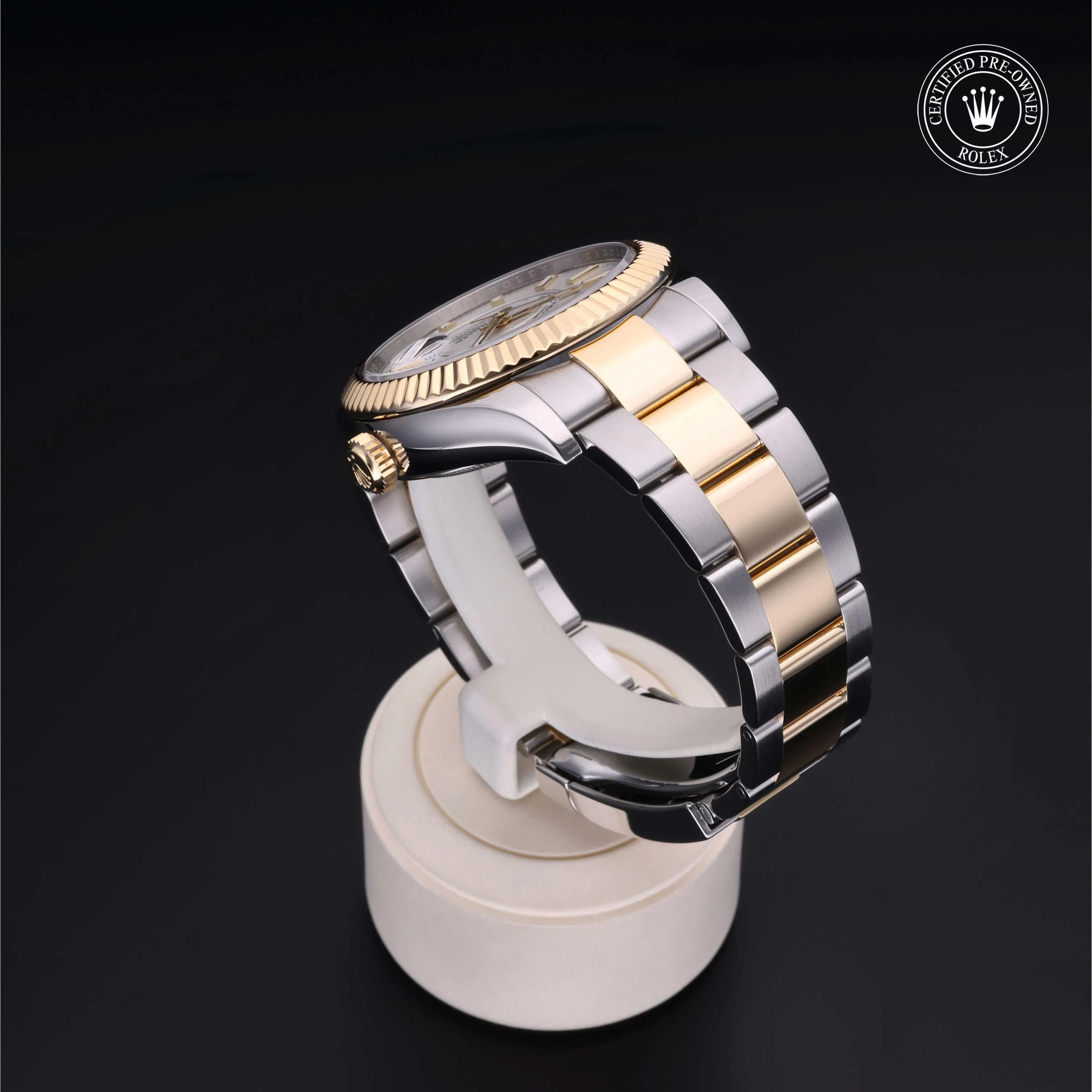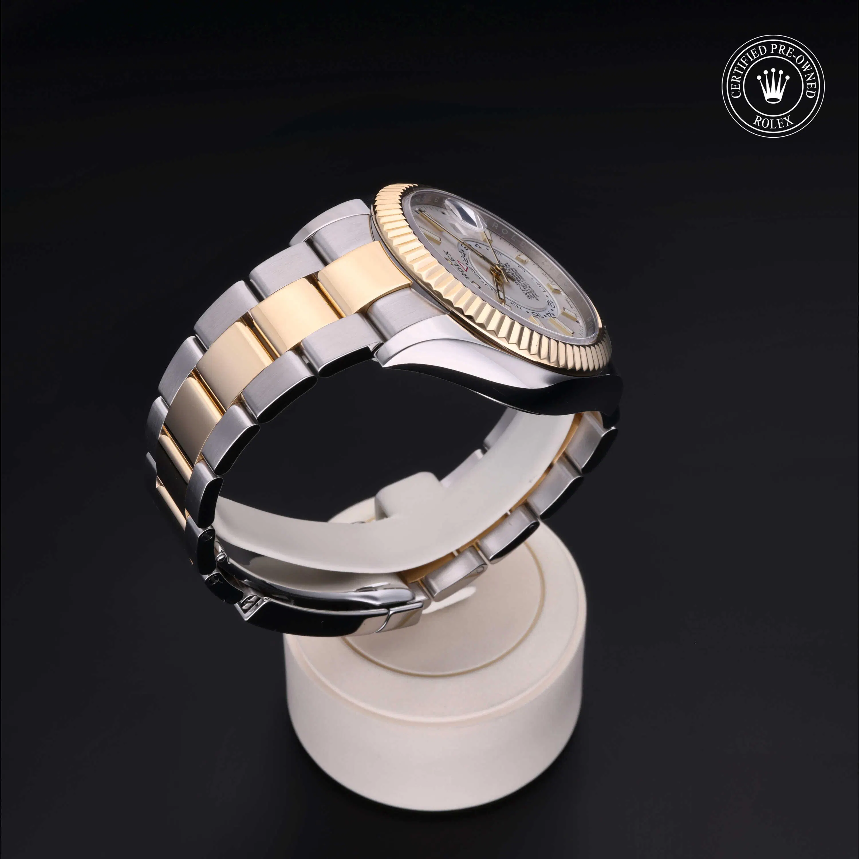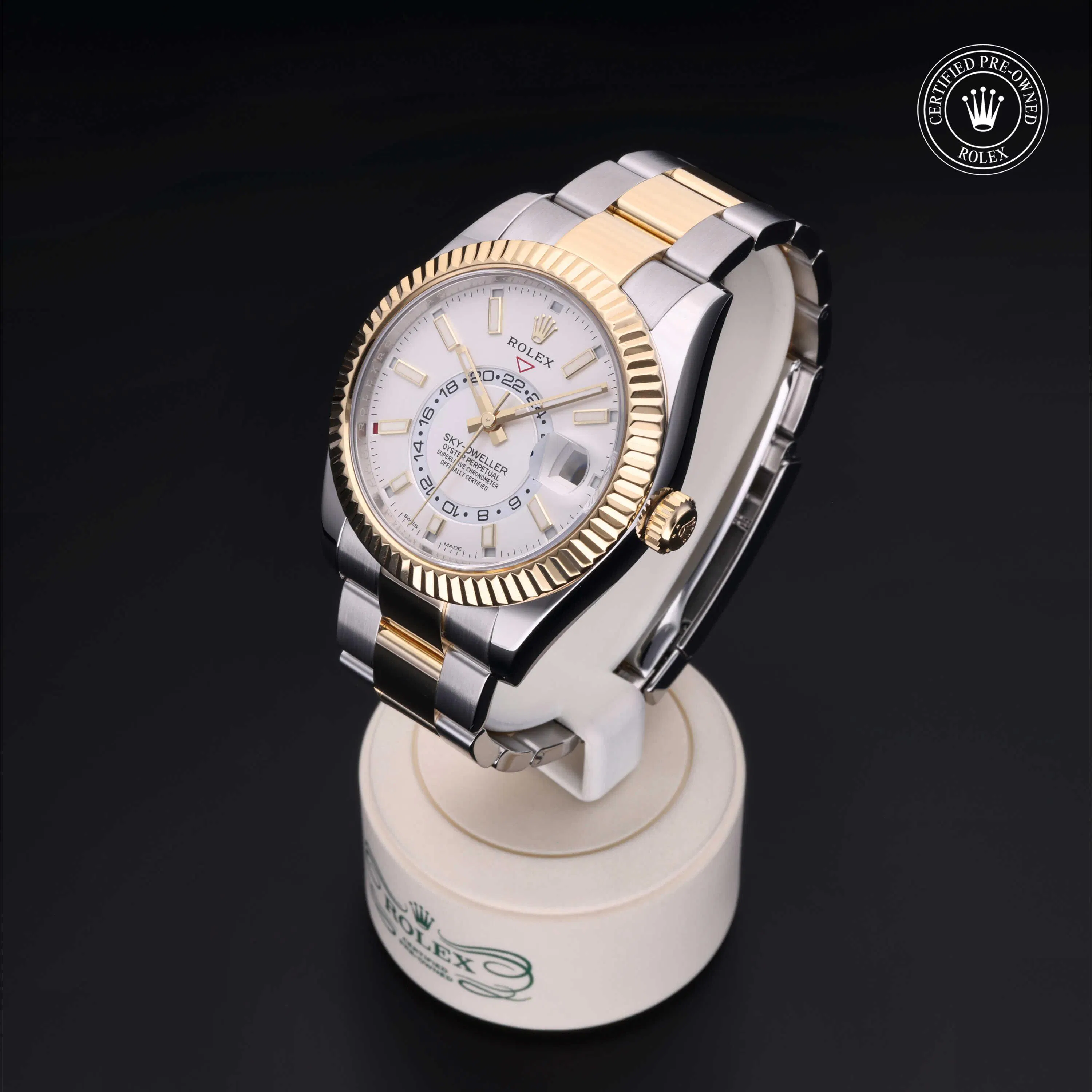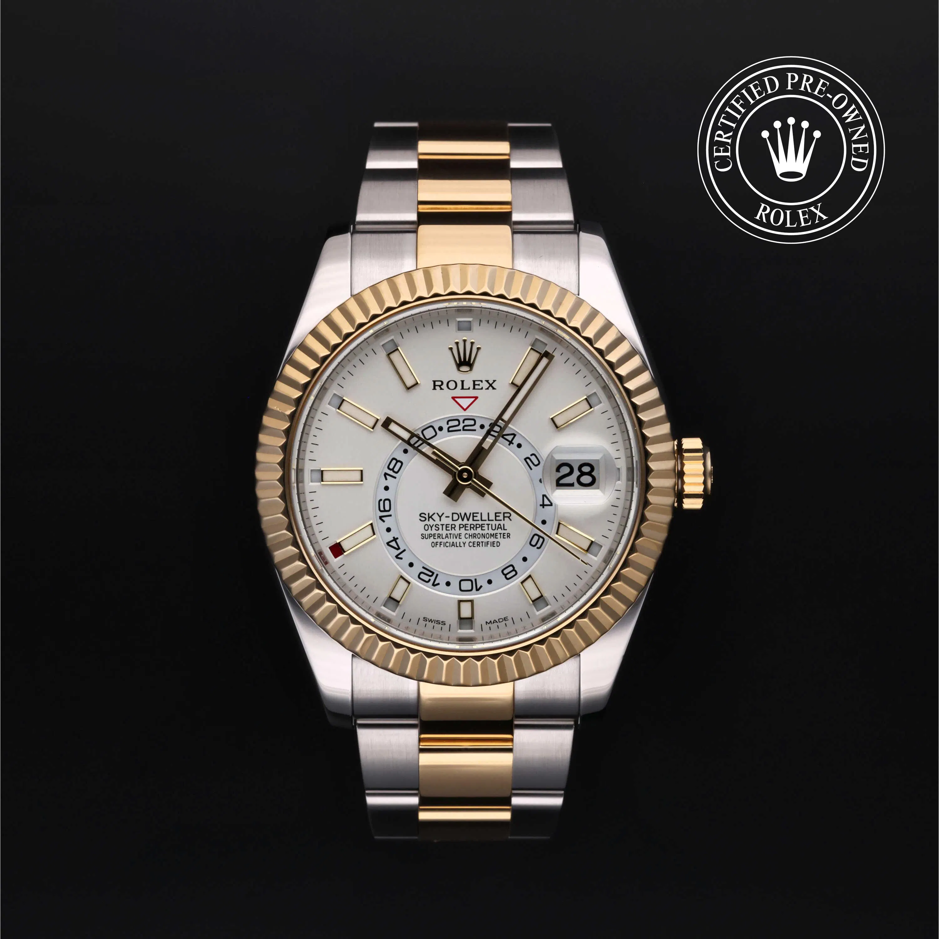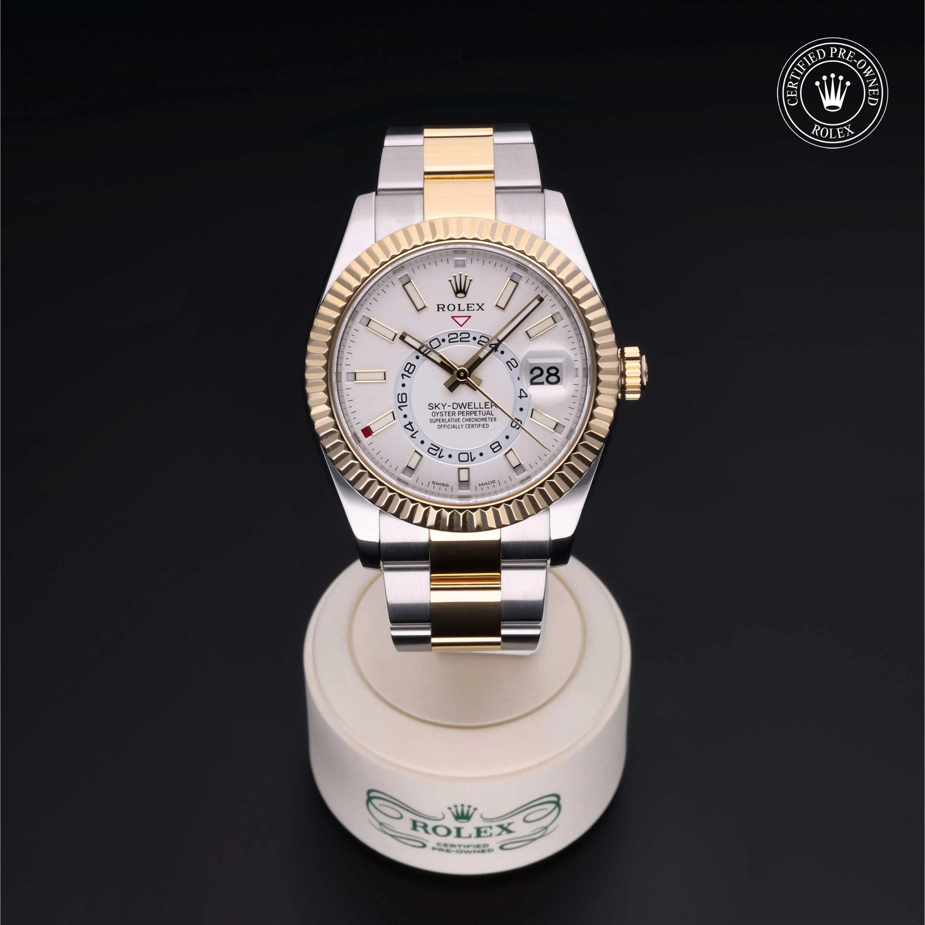 Rolex Certified Pre-Owned Sky-Dweller (326933) self - winding automatic watch, features a 42mm stainless steel case with an 18k yellow gold fluted bezel surrounding an intense white dial on a stainless steel and 18k yellow gold oyster bracelet. Functions include hours, minutes, seconds, date, annual calendar and month. This watch has received Rolex-authorized service and certification. It comes with the original papers, and includes a custom Rolex Certified Pre-Owned hang tag, travel pouch and RCPO international warranty card.