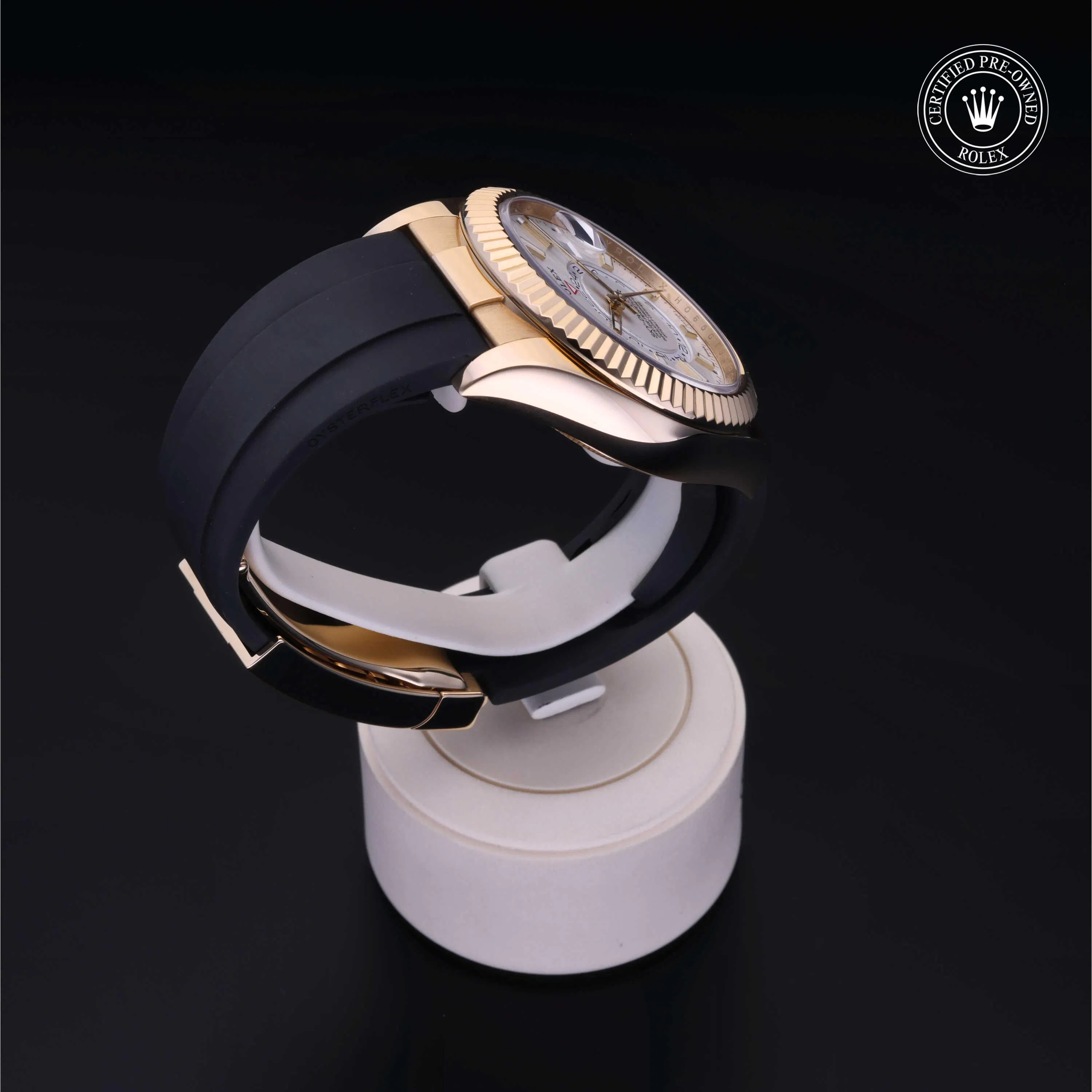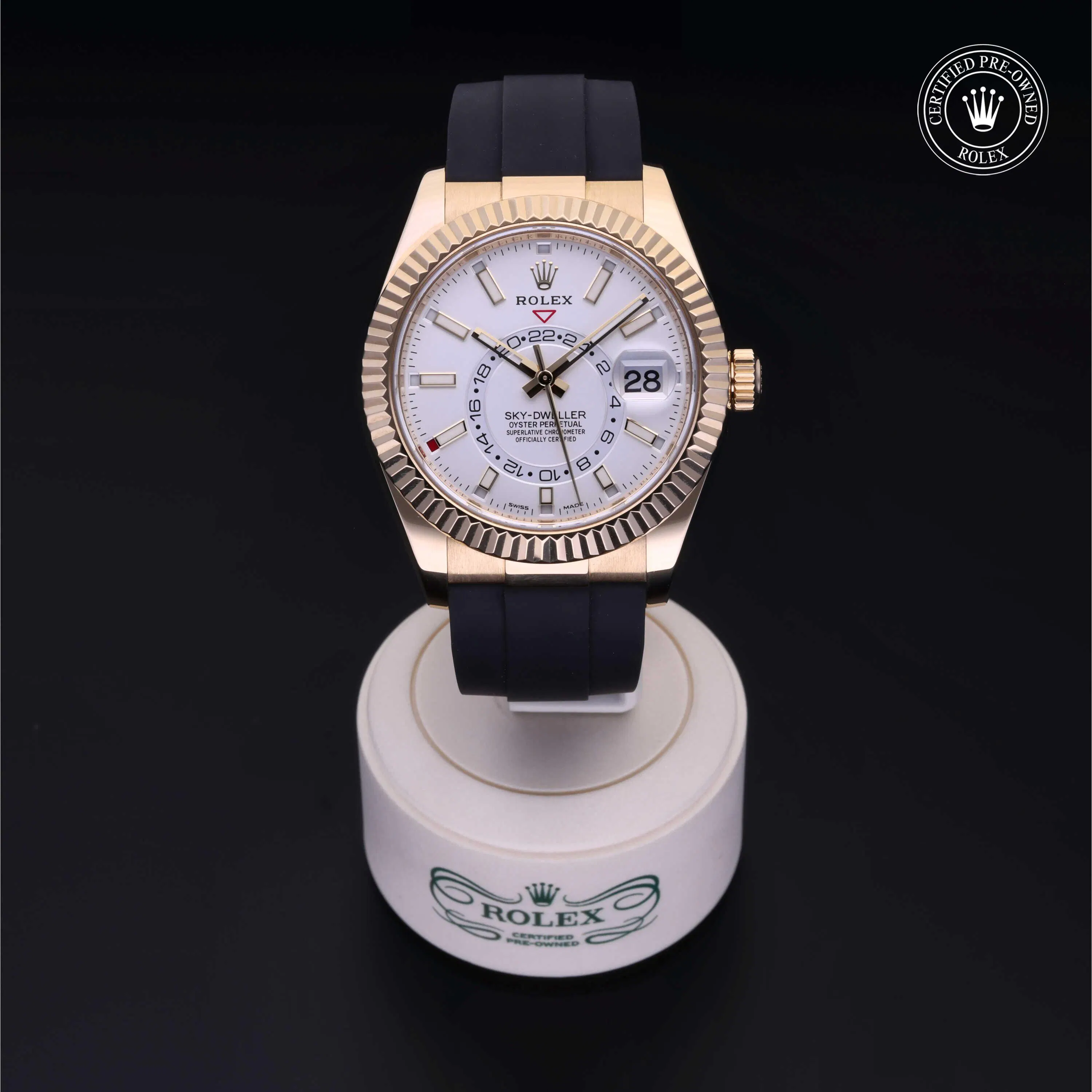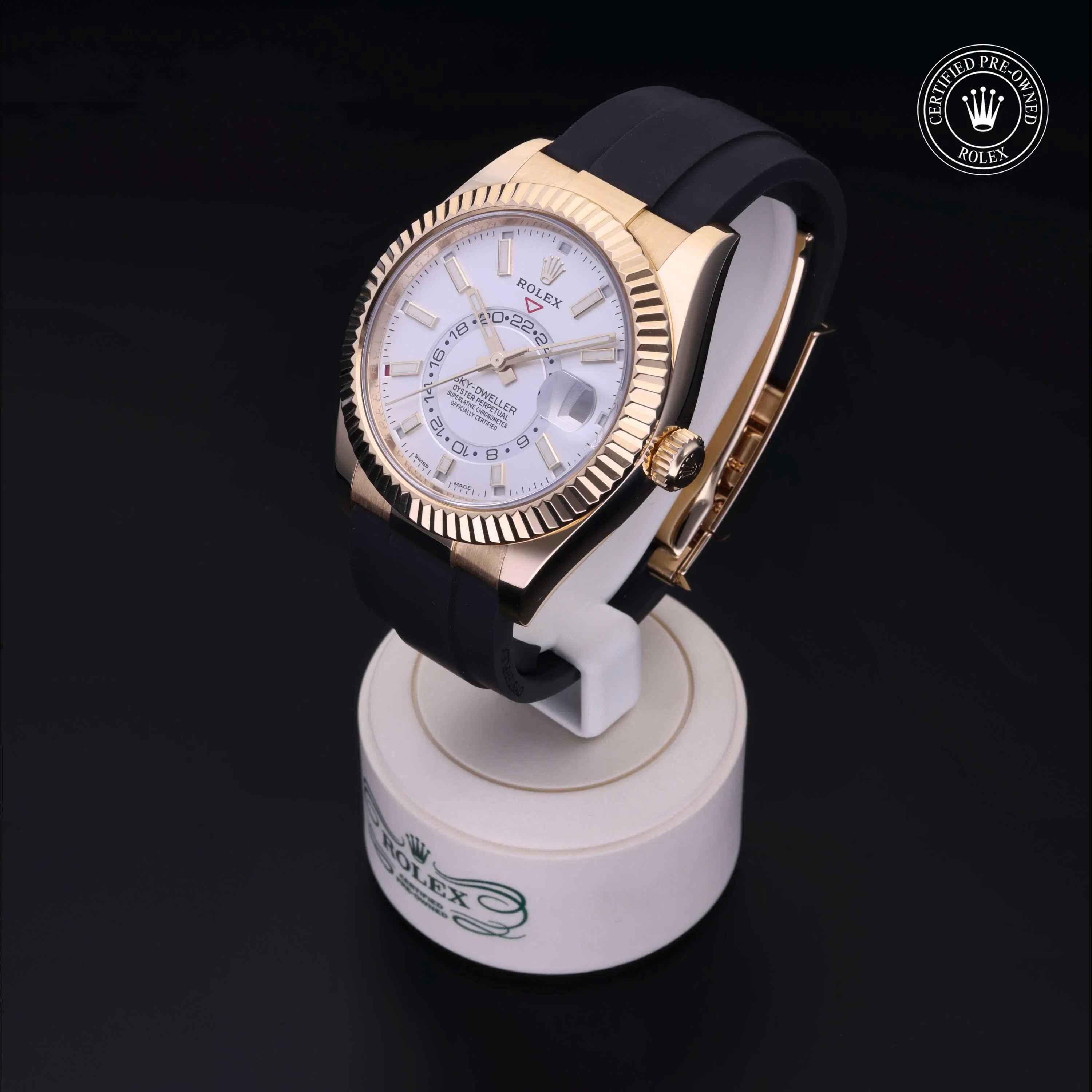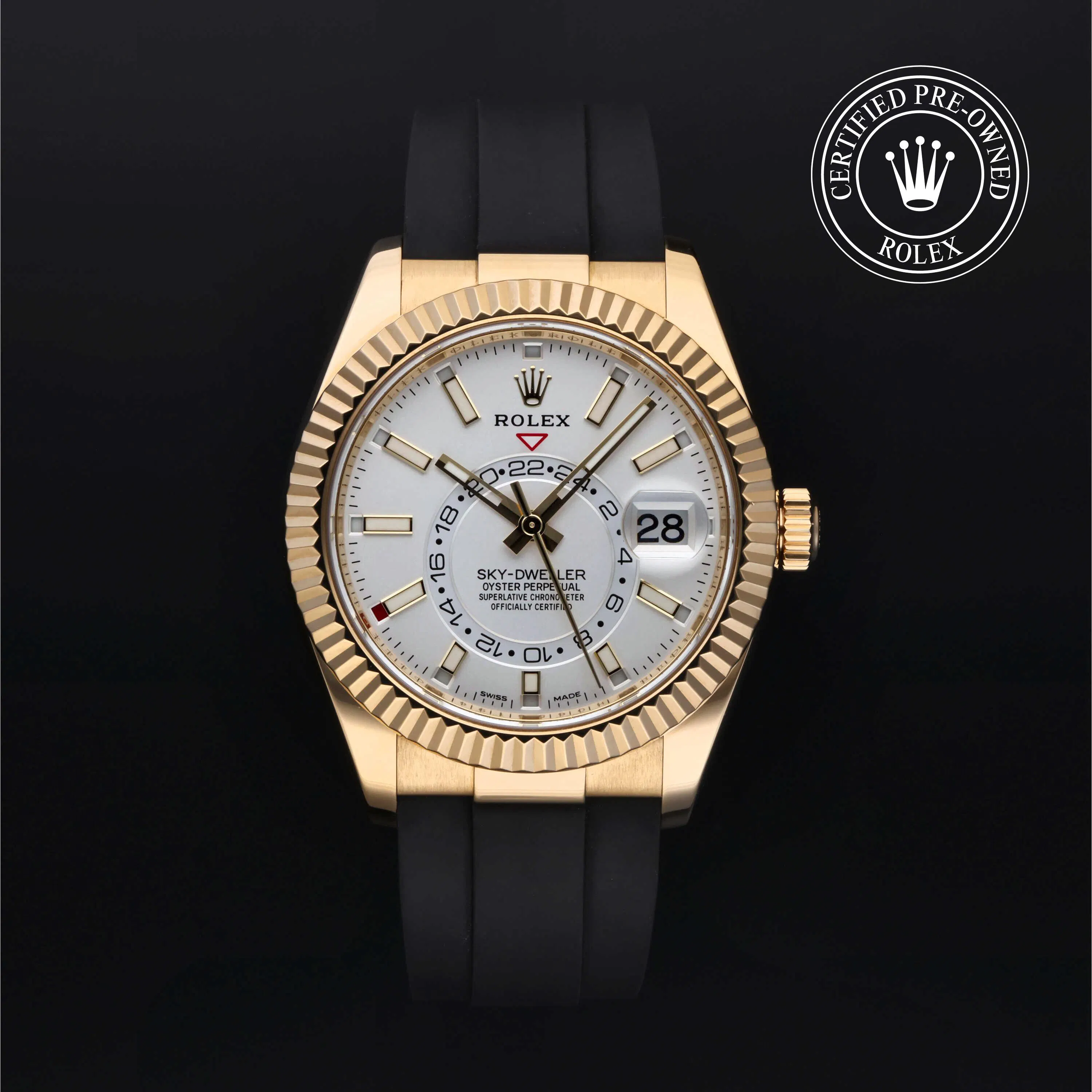 Rolex Certified Pre-Owned Sky-Dweller (326238) self - winding automatic watch, features a 42mm 18k yellow gold case and fluted bezel surrounding an intense white dial on a black oysterflex strap with an 18k yellow gold deployant buckle. Functions include hours, minutes, seconds, date, annual calendar, gmt/world time and month. This watch has received Rolex-authorized service and certification. It comes with the original papers, and includes a custom Rolex Certified Pre-Owned hang tag, travel pouch and RCPO international warranty card.