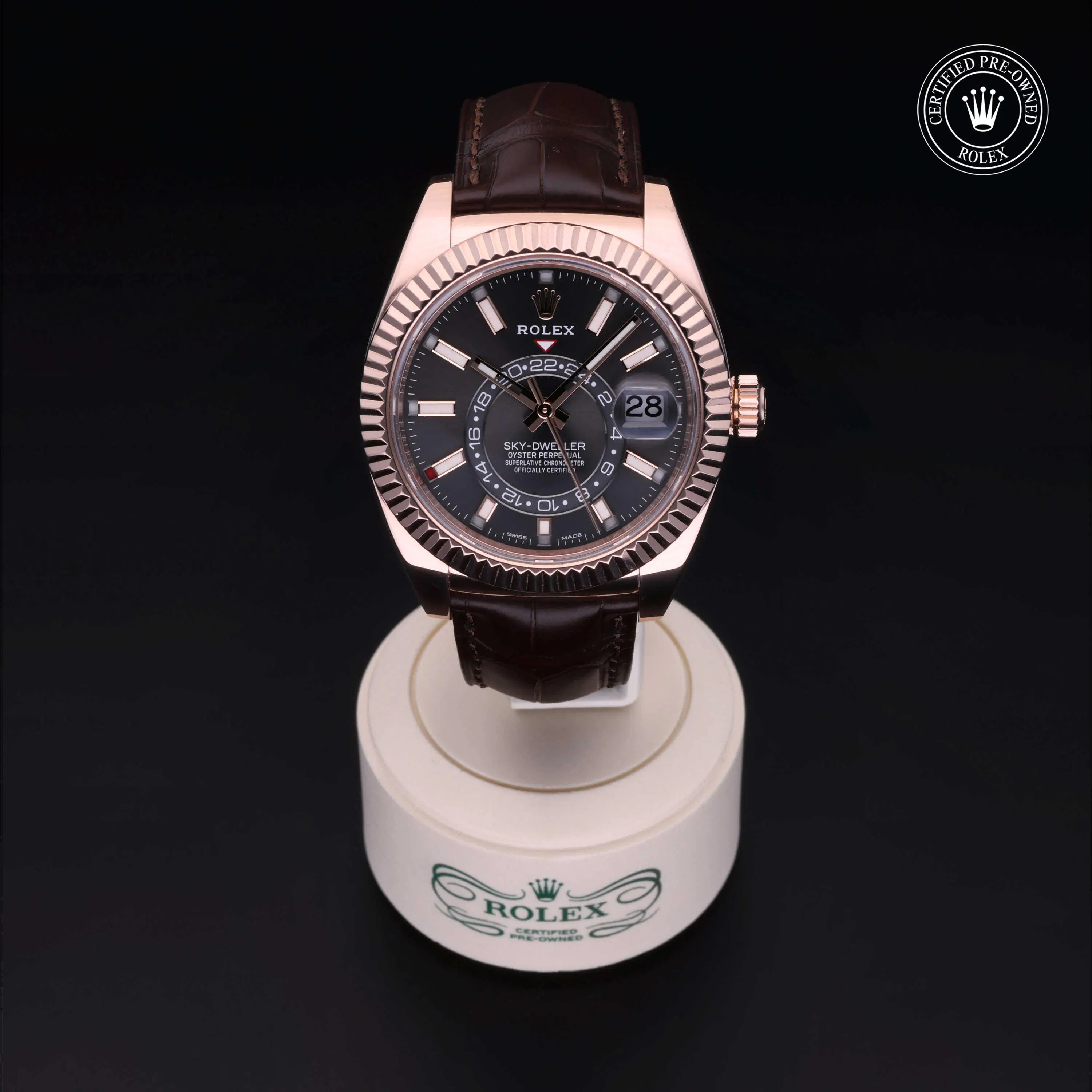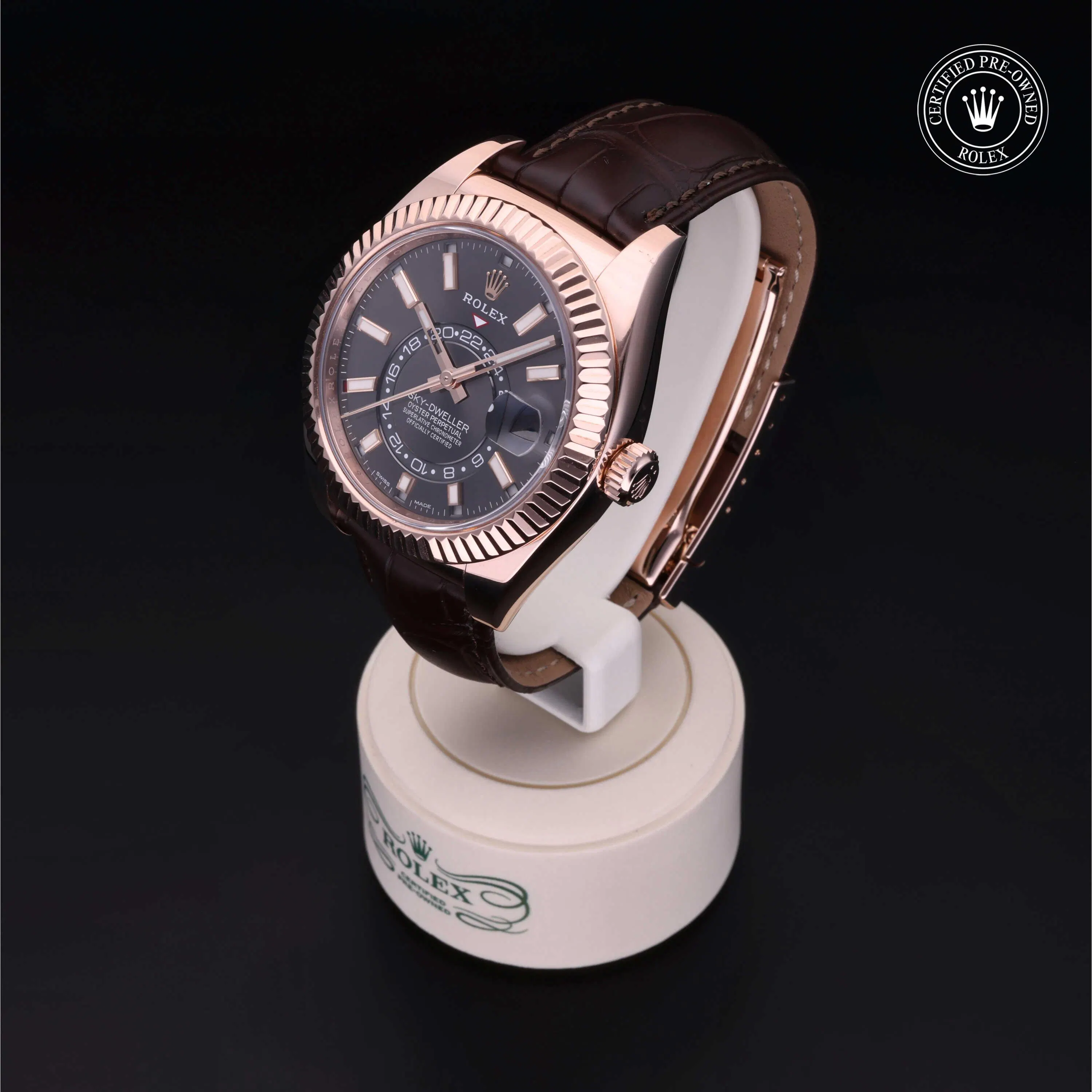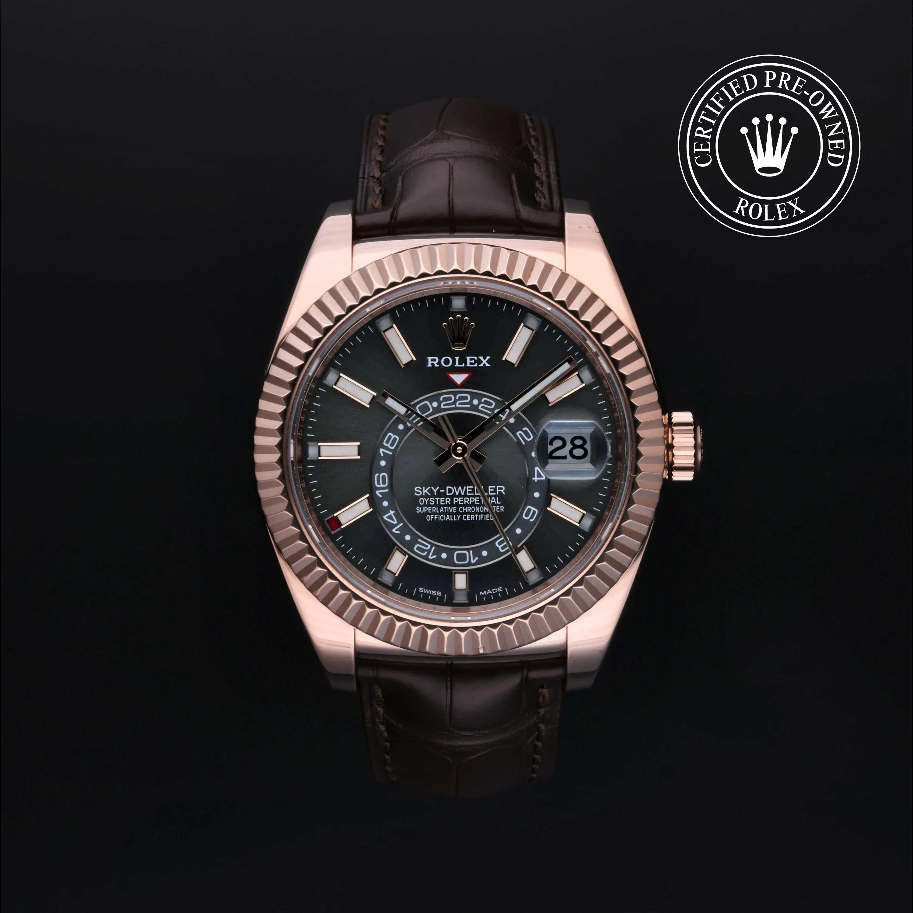 Rolex Certified Pre-Owned Sky-Dweller (326135) self - winding automatic watch, features a 42mm 18k rose gold case and fluted bezel surrounding a slate dial on a brown alligator strap with an 18k rose gold deployant buckle. Functions include hours, minutes and seconds. This watch has received Rolex-authorized service and certification. It comes with the original box and papers, and includes a custom Rolex Certified Pre-Owned hang tag, travel pouch and RCPO international warranty card.
